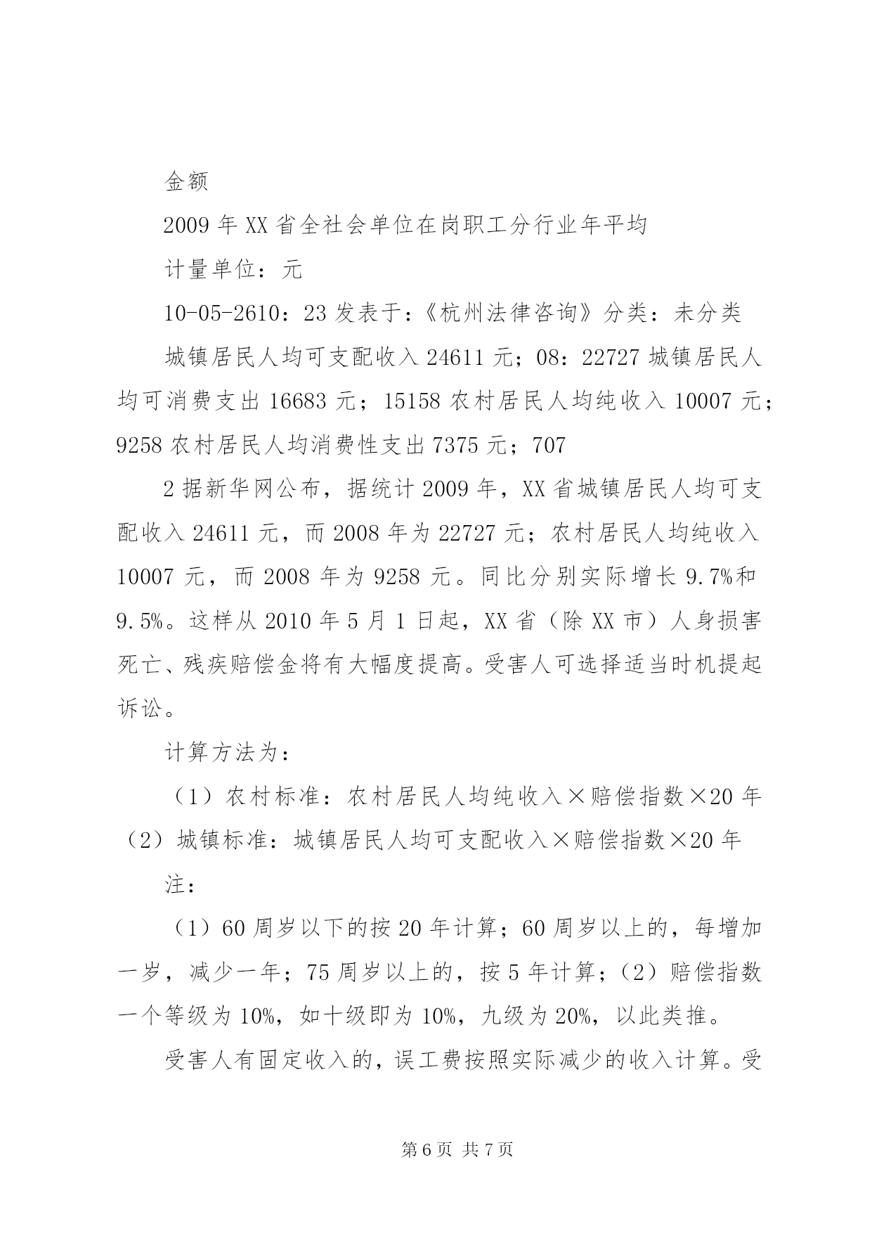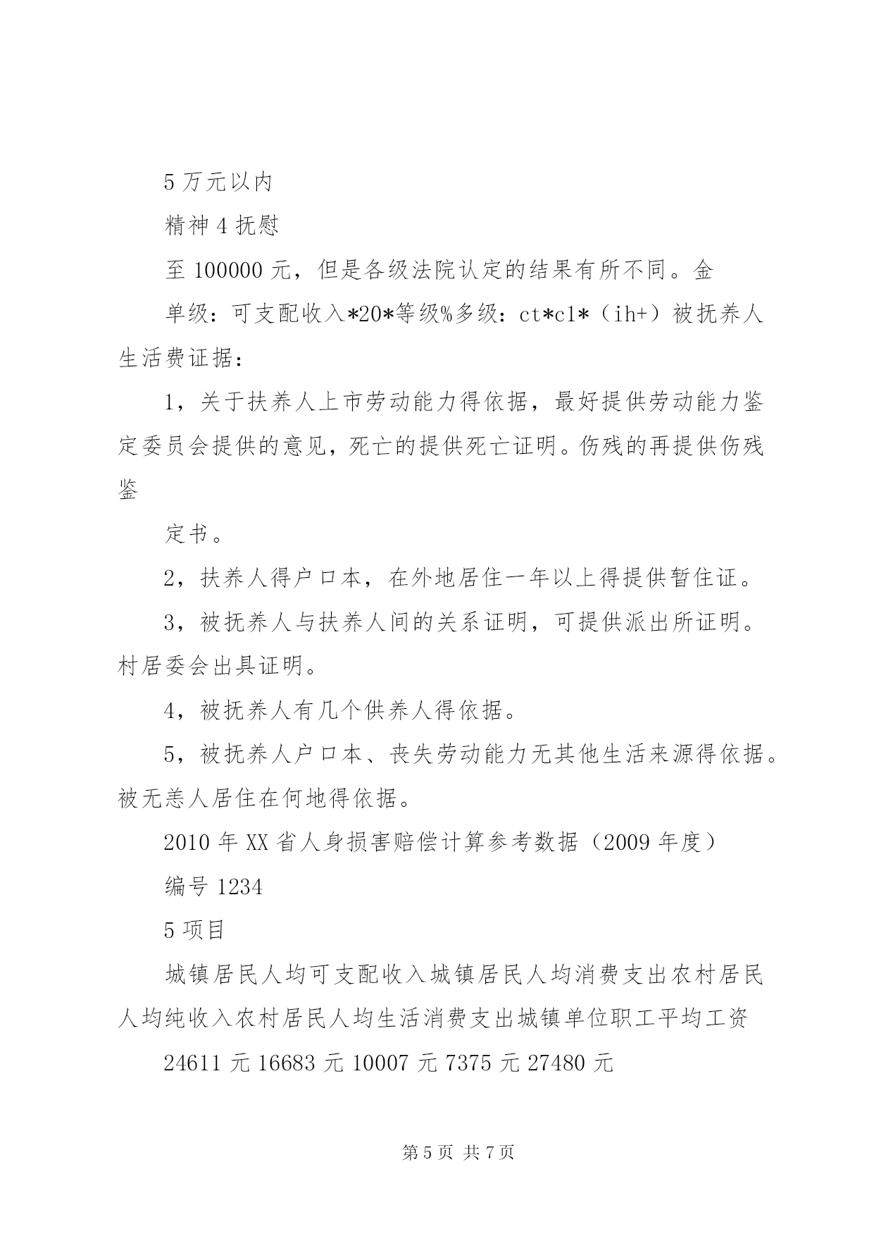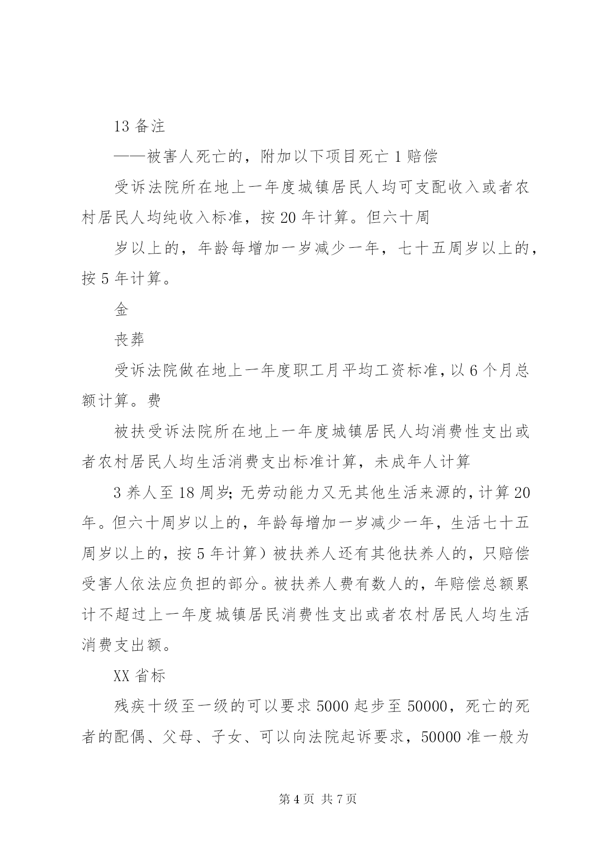 第PAGE\*Arabic\*MERGEFORMAT7页共NUMPAGES\*MERGEFORMAT7页XX省交通行业安全事故XX省交通事故赔偿标准交通事故赔偿清单编号赔偿项目证据要求赔偿条件赔偿金额事故发生后入住的医院出具的正式发票+病历卡,姓名自行从药店的支出一般得不到1医疗费要与事故认定书上一致,如果转院的要证明必要性或支持,交强险以外,根据事故责以就近就医原则。任分担。住院期间护理费一般按一人计算,但是重症病人要求住院期间没有证明也能得到支2护理费医院开证明由二人护理的可以认定,出院后需要继续持,出院后护理必须要有医院证护理的要求医院出具诊断证明。要求医院出具建休证明,如果安装内固定的,第一次3误工费手术后与第二次手术之间要有连续误工证明,如果出院时忘了要求医院开的,补开也可以认定,但举证时会被动些。要求时间上与事故时间相吻合,如果是包车费、长途4交通费明或护理鉴定。n天╳80元/天或按工资来算法律规定是因伤残持续误工的,可以计算至定残日前一天,必须见下要证明“持续”。汽车费,要求时间、地点与就医、被害人所在地、签主要是要证明合理性,必要性。2000定地点等相一致。要求参加处理交通事故的人住宿时姓名、时间、地点5住宿费与发生事故相吻合或与被害人住院抢救时间相吻合及要证明合理性、必要性。费用的合理性。6住院伙食补助依据国家公务人员出差伙食补助标准,一般情况只有费住院者本人享有。以住院时间为依据。n天╳30元/天法律没有规定营养费的标准,一般情况下参照医疗建7必要的营养费议,可要求医生在病例或诊断证明上注明需要加强营举证很难。养帮助恢复。(根据丧失劳动能力程度或伤残等级,按照受诉法院所在地上一年度城镇居民人均可支配收入或者农村居8残疾赔偿金民人均纯收入标准,自定残之日起按20年计算。但六十周岁以上的,年龄每增加一岁减少一年,七十五周岁以上的,按5年计算)要求合理性,主要有国产和进口之分,一般只支持国9残疾辅助器产的,但是如果能从技术上证明只能适用进口的,也可得到支持。城镇户口与农村户口差别很大,在司法实践中如果能证明在城市务工居住一年以上的可按城市户口认定。2000元要证明必要性、合理性可根据辅助器配制机构意见。10要看鉴定结果,依据不同的护理康复护理费要求做一个护理鉴定,一般做伤残鉴定的地方可以做。等级计算。一般情况下能与案子一并处理。11继续治疗费要求由医疗机构出具继续治疗建议及继续治疗费用,但是一方提出治疗费争议时,被也可做继续治疗鉴定。害方要举证。如果不能举证只能按实际发生之日另行处理。要求有法定的扶养义务并且被害人有部分丧失劳动能12被扶养人生活力。事实上的扶养费主要看受伤的部位是否直接影响正常劳动。13备注——被害人死亡的,附加以下项目死亡1赔偿受诉法院所在地上一年度城镇居民人均可支配收入或者农村居民人均纯收入标准,按20年计算。但六十周岁以上的,年龄每增加一岁减少一年,七十五周岁以上的,按5年计算。金丧葬受诉法院做在地上一年度职工月平均工资标准,以6个月总额计算。费被扶受诉法院所在地上一年度城镇居民人均消费性支出或者农村居民人均生活消费支出标准计算,未成年人计算3养人至18周岁;无劳动能力又无其他生活来源的,计算20年。但六十周岁以上的,年龄每增加一岁减少一年,生活七十五周岁以上的,按5年计算)被扶养人还有其他扶养人的,只赔偿受害人依法应负担的部分。被扶养人费有数人的,年赔偿总额累计不超过上一年度城镇居民消费性支出或者农村居民人均生活消费支出额。XX省标残疾十级至一级的可以要求5000起步至50000,死亡的死者的配偶、父母、子女、可以向法院起诉要求,50000准一般为5万元以内精神4抚慰至100000元,但是各级法院认定的结果有所不同。金单级:可支配收入*20*等级%多级:ct*c1*(ih+)被抚养人生活费证据:1,关于扶养人上市劳动能力得依据,最好提供劳动能力鉴定委员会提供的意见,死亡的提供死亡证明。伤残的再提供伤残鉴定书。2,扶养人得户口本,在外地居住一年以上得提供暂住证。3,被抚养人与扶养人间的关系证明,可提供派出所证明。村居委会出具证明。4,被抚养人有几个供养人得依据。5,被抚养人户口本、丧失劳动能力无其他生活来源得依据。被无恙人居住在何地得依据。2010年XX省人身损害赔偿计算参考数据(2009年度)编号12345项目城镇居民人均可支配收入城镇居民人均消费支出农村居民人均纯收入农村居民人均生活消费支出城镇单位职工平均工资24611元16683元10007元7375元27480元金额2009年XX省全社会单位在岗职工分行业年平均计量单位:元10-05-2610:23发表于:《杭州法律咨询》分类:未分类城镇居民人均可支配收入24611元;08:22727城镇居民人均可消费支