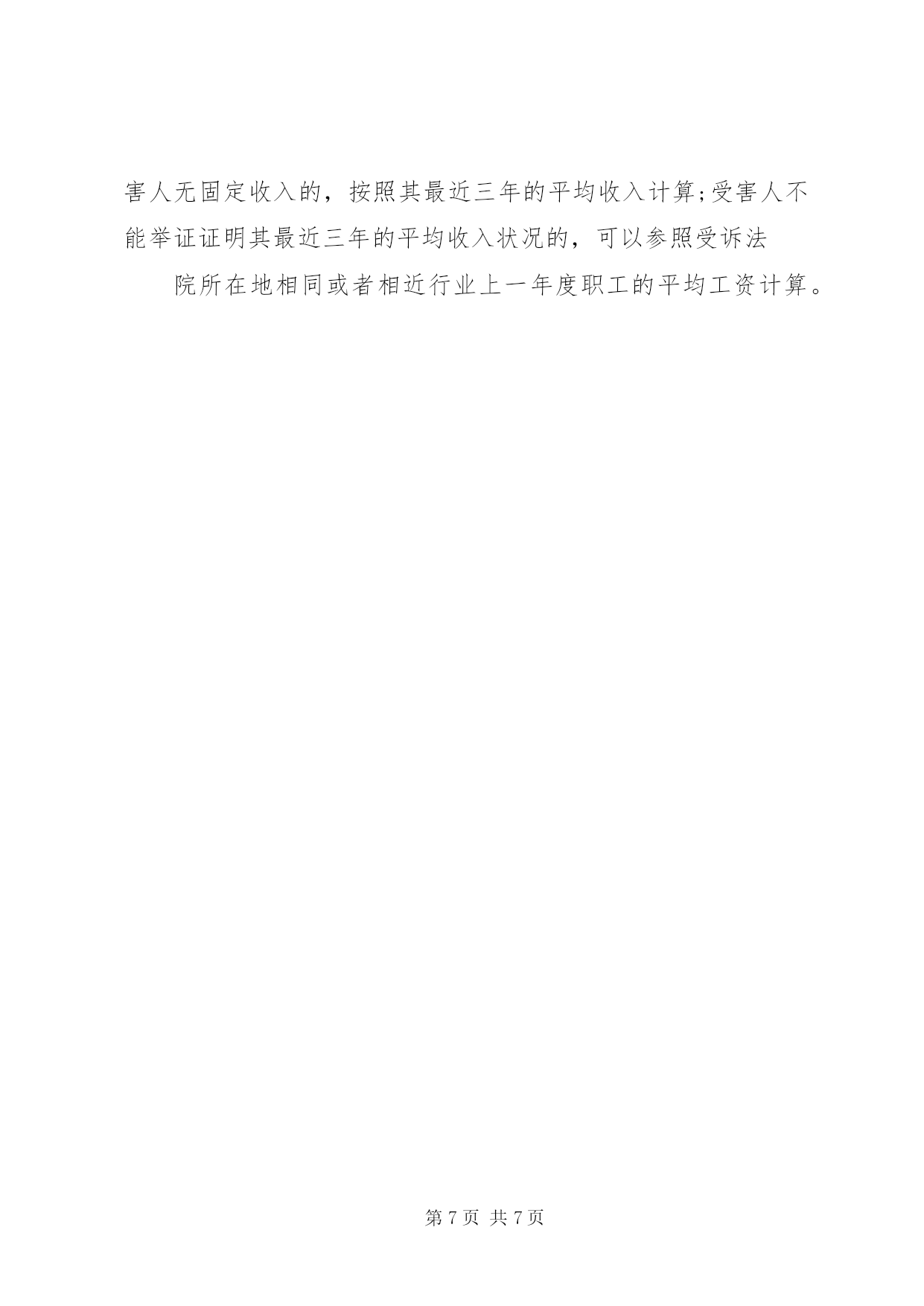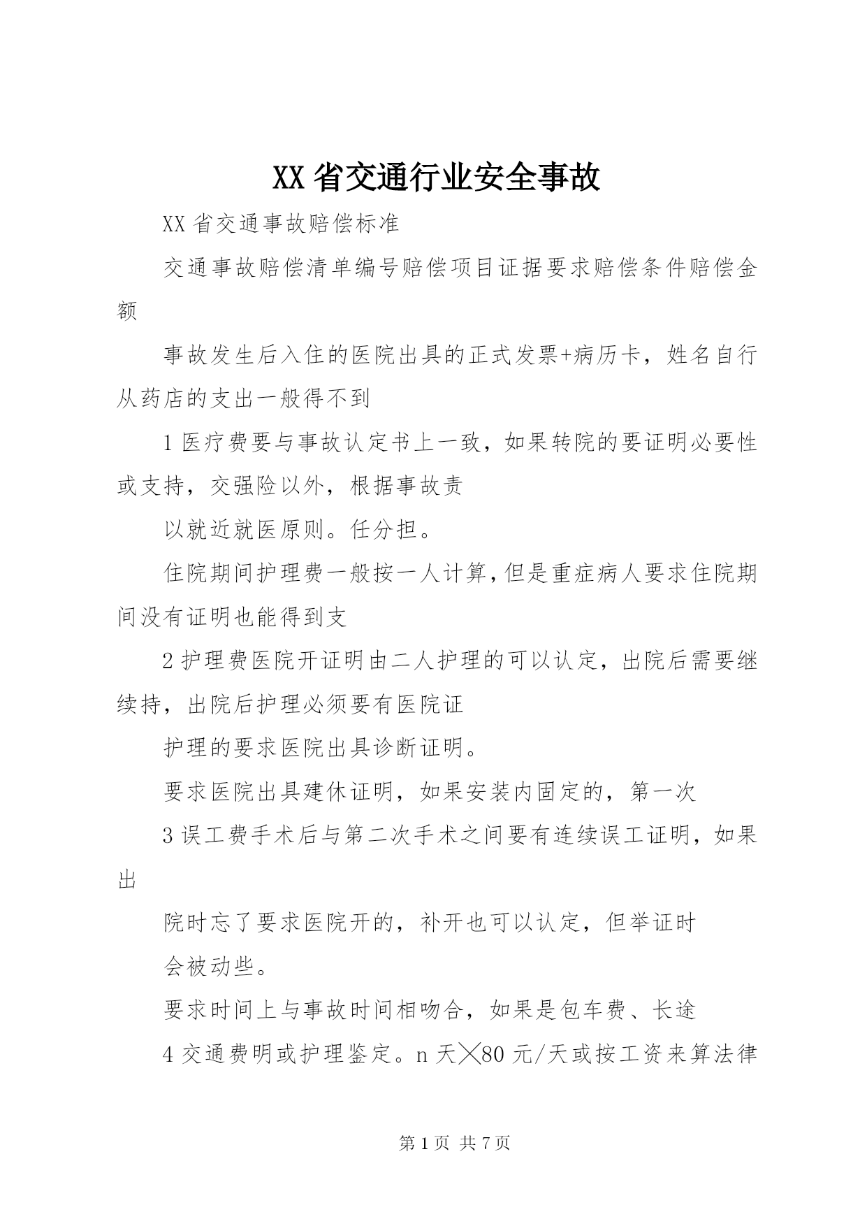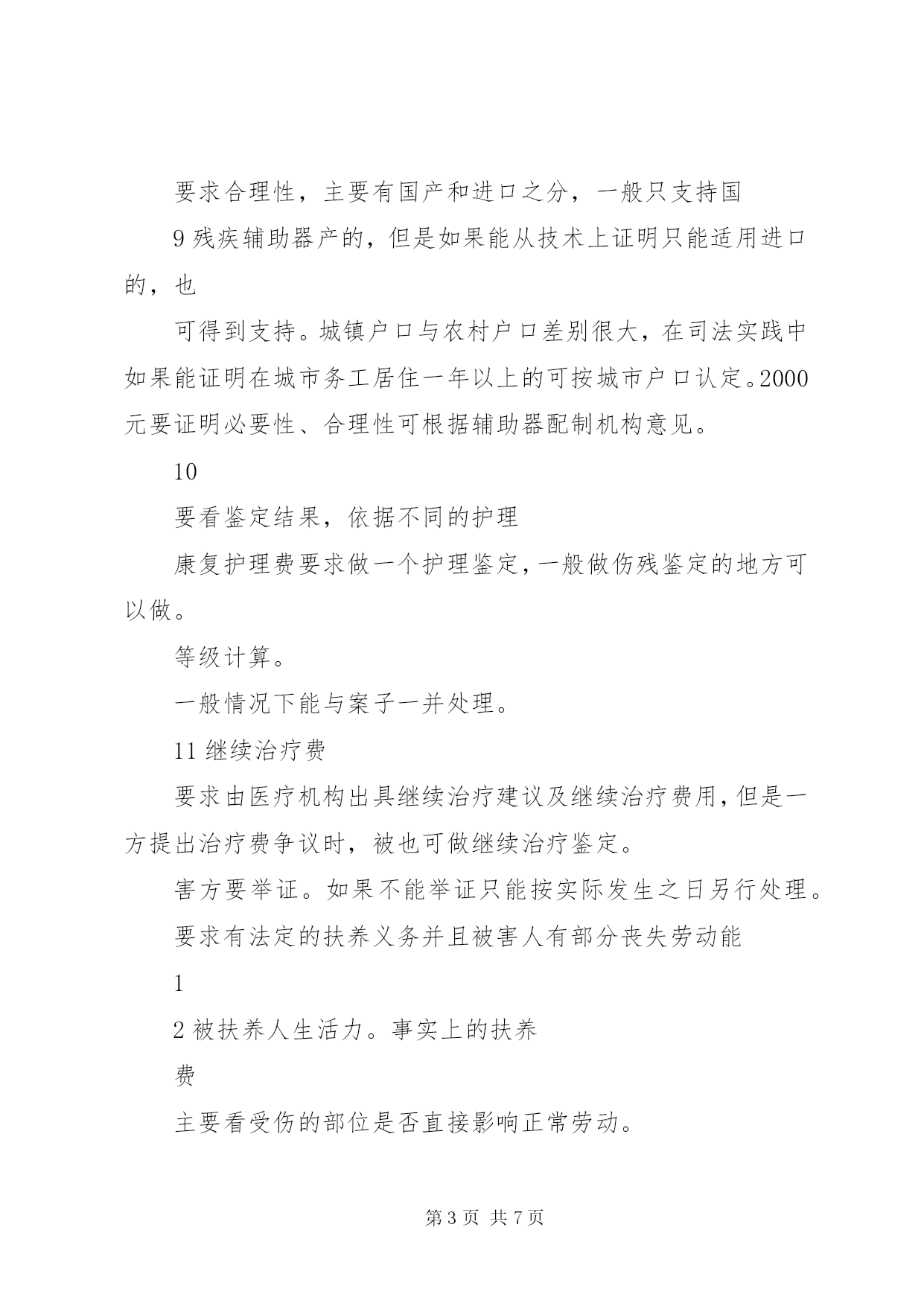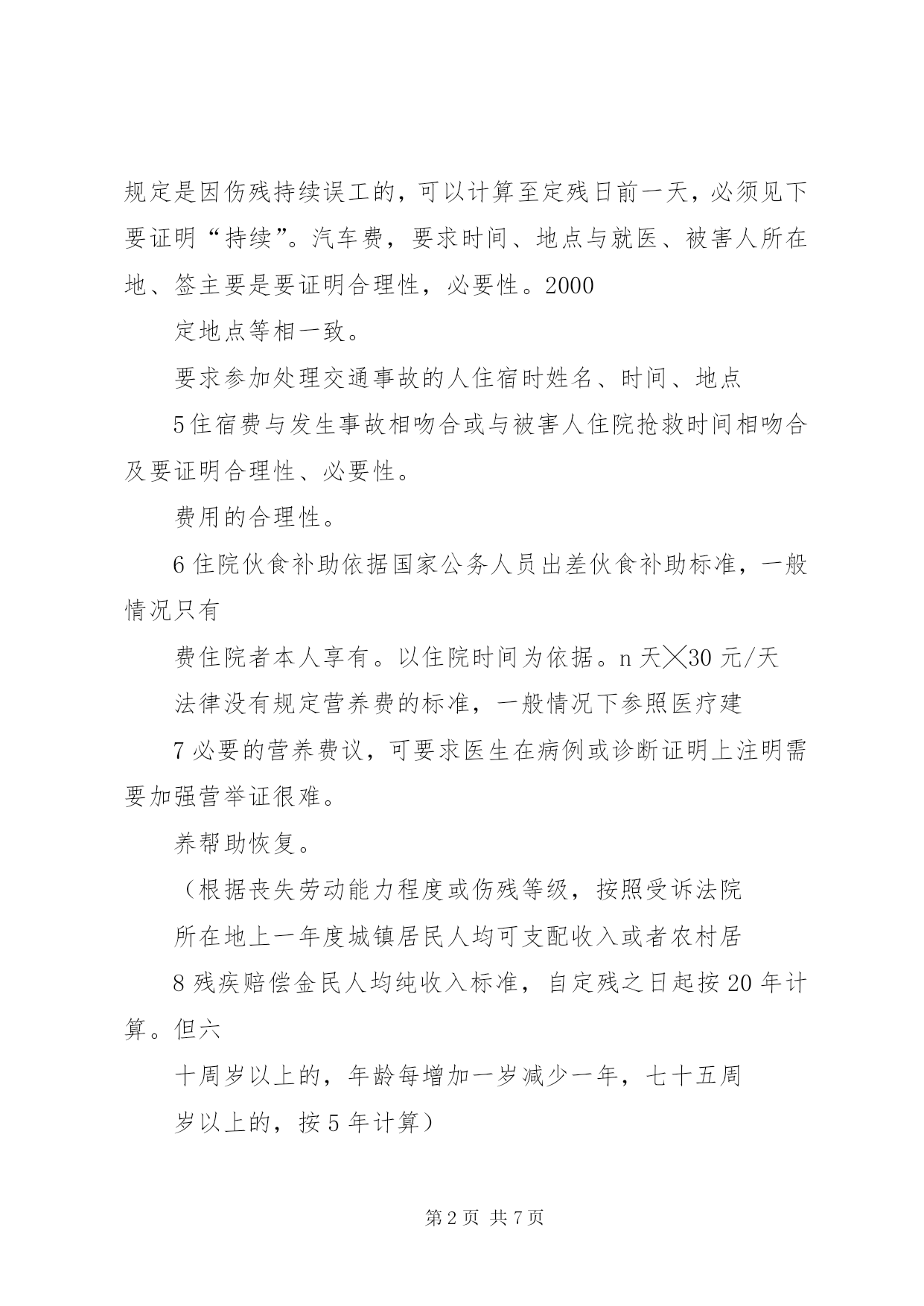 第PAGE\*Arabic\*MERGEFORMAT7页共NUMPAGES\*MERGEFORMAT7页XX省交通行业安全事故XX省交通事故赔偿标准交通事故赔偿清单编号赔偿项目证据要求赔偿条件赔偿金额事故发生后入住的医院出具的正式发票+病历卡,姓名自行从药店的支出一般得不到1医疗费要与事故认定书上一致,如果转院的要证明必要性或支持,交强险以外,根据事故责以就近就医原则。任分担。住院期间护理费一般按一人计算,但是重症病人要求住院期间没有证明也能得到支2护理费医院开证明由二人护理的可以认定,出院后需要继续持,出院后护理必须要有医院证护理的要求医院出具诊断证明。要求医院出具建休证明,如果安装内固定的,第一次3误工费手术后与第二次手术之间要有连续误工证明,如果出院时忘了要求医院开的,补开也可以认定,但举证时会被动些。要求时间上与事故时间相吻合,如果是包车费、长途4交通费明或护理鉴定。n天╳80元/天或按工资来算法律规定是因伤残持续误工的,可以计算至定残日前一天,必须见下要证明“持续”。汽车费,要求时间、地点与就医、被害人所在地、签主要是要证明合理性,必要性。2000定地点等相一致。要求参加处理交通事故的人住宿时姓名、时间、地点5住宿费与发生事故相吻合或与被害人住院抢救时间相吻合及要证明合理性、必要性。费用的合理性。6住院伙食补助依据国家公务人员出差伙食补助标准,一般情况只有费住院者本人享有。以住院时间为依据。n天╳30元/天法律没有规定营养费的标准,一般情况下参照医疗建7必要的营养费议,可要求医生在病例或诊断证明上注明需要加强营举证很难。养帮助恢复。(根据丧失劳动能力程度或伤残等级,按照受诉法院所在地上一年度城镇居民人均可支配收入或者农村居8残疾赔偿金民人均纯收入标准,自定残之日起按20年计算。但六十周岁以上的,年龄每增加一岁减少一年,七十五周岁以上的,按5年计算)要求合理性,主要有国产和进口之分,一般只支持国9残疾辅助器产的,但是如果能从技术上证明只能适用进口的,也可得到支持。城镇户口与农村户口差别很大,在司法实践中如果能证明在城市务工居住一年以上的可按城市户口认定。2000元要证明必要性、合理性可根据辅助器配制机构意见。10要看鉴定结果,依据不同的护理康复护理费要求做一个护理鉴定,一般做伤残鉴定的地方可以做。等级计算。一般情况下能与案子一并处理。11继续治疗费要求由医疗机构出具继续治疗建议及继续治疗费用,但是一方提出治疗费争议时,被也可做继续治疗鉴定。害方要举证。如果不能举证只能按实际发生之日另行处理。要求有法定的扶养义务并且被害人有部分丧失劳动能12被扶养人生活力。事实上的扶养费主要看受伤的部位是否直接影响正常劳动。13备注——被害人死亡的,附加以下项目死亡1赔偿受诉法院所在地上一年度城镇居民人均可支配收入或者农村居民人均纯收入标准,按20年计算。但六十周岁以上的,年龄每增加一岁减少一年,七十五周岁以上的,按5年计算。金丧葬受诉法院做在地上一年度职工月平均工资标准,以6个月总额计算。费被扶受诉法院所在地上一年度城镇居民人均消费性支出或者农村居民人均生活消费支出标准计算,未成年人计算3养人至18周岁;无劳动能力又无其他生活来源的,计算20年。但六十周岁以上的,年龄每增加一岁减少一年,生活七十五周岁以上的,按5年计算)被扶养人还有其他扶养人的,只赔偿受害人依法应负担的部分。被扶养人费有数人的,年赔偿总额累计不超过上一年度城镇居民消费性支出或者农村居民人均生活消费支出额。XX省标残疾十级至一级的可以要求5000起步至50000,死亡的死者的配偶、父母、子女、可以向法院起诉要求,50000准一般为5万元以内精神4抚慰至100000元,但是各级法院认定的结果有所不同。金单级:可支配收入*20*等级%多级:ct*c1*(ih+)被抚养人生活费证据:1,关于扶养人上市劳动能力得依据,最好提供劳动能力鉴定委员会提供的意见,死亡的提供死亡证明。伤残的再提供伤残鉴定书。2,扶养人得户口本,在外地居住一年以上得提供暂住证。3,被抚养人与扶养人间的关系证明,可提供派出所证明。村居委会出具证明。4,被抚养人有几个供养人得依据。5,被抚养人户口本、丧失劳动能力无其他生活来源得依据。被无恙人居住在何地得依据。2010年XX省人身损害赔偿计算参考数据(2009年度)编号12345项目城镇居民人均可支配收入城镇居民人均消费支出农村居民人均纯收入农村居民人均生活消费支出城镇单位职工平均工资24611元16683元10007元7375元27480元金额2009年XX省全社会单位在岗职工分行业年平均计量单位:元10-05-2610:23发表于:《杭州法律咨询》分类:未分类城镇居民人均可支配收入24611元;08:22727城镇居民人均可消费支