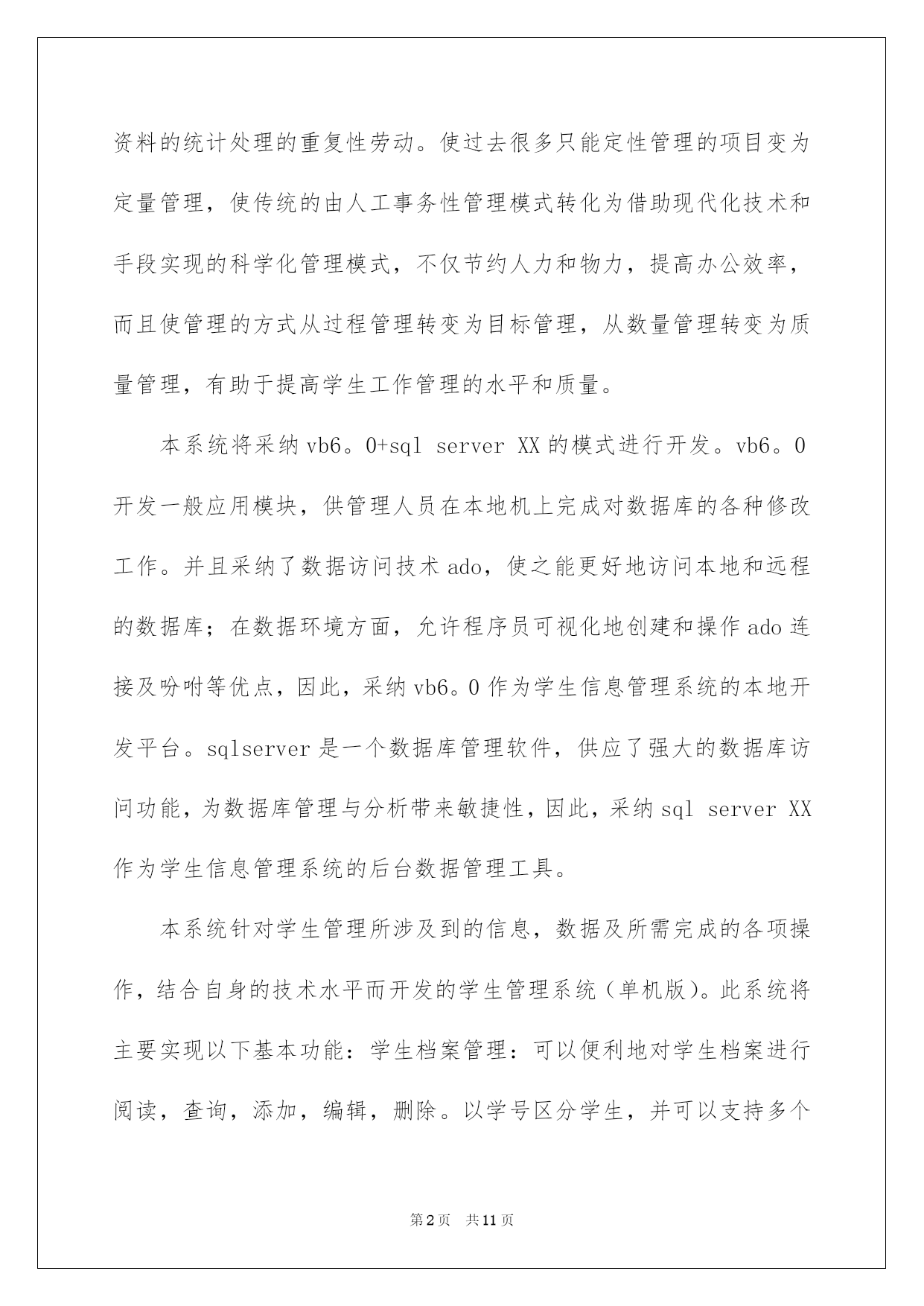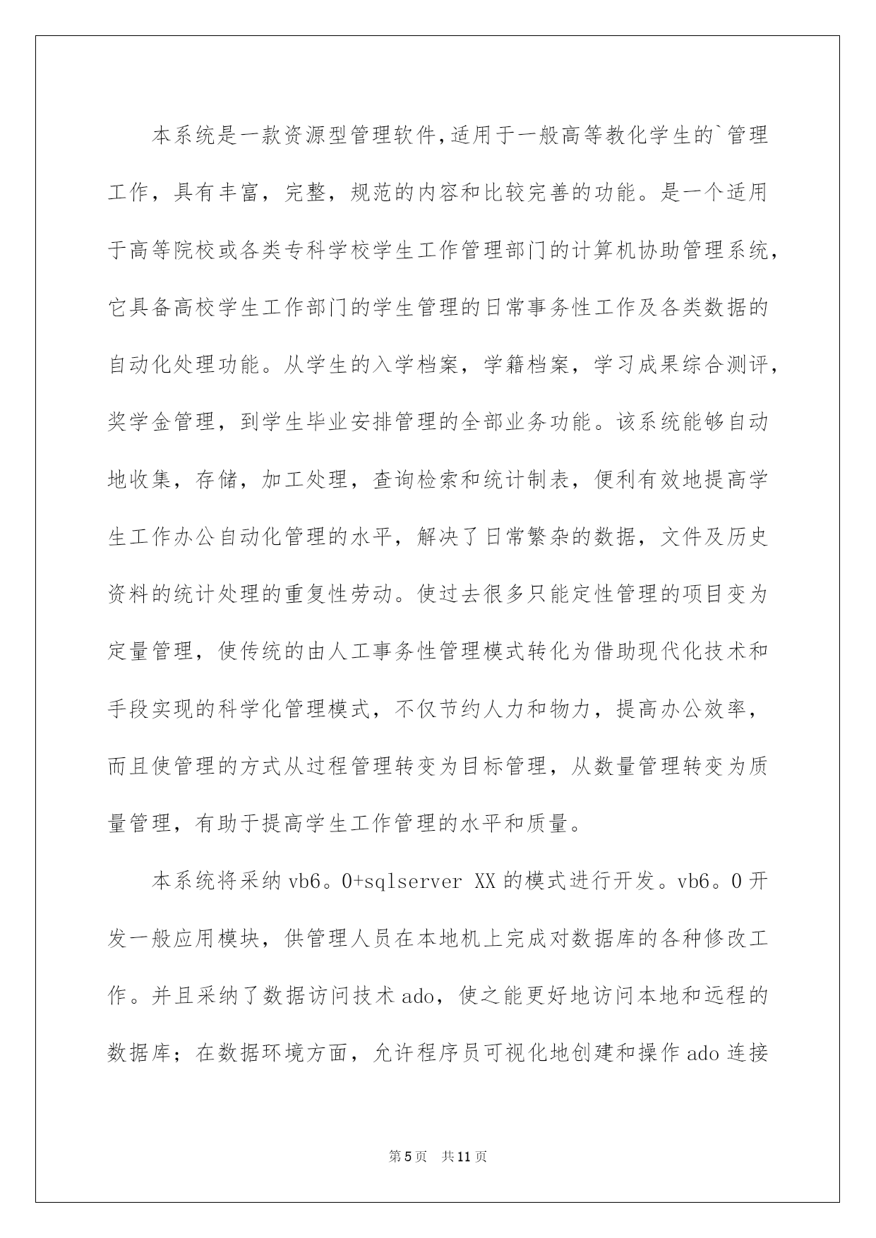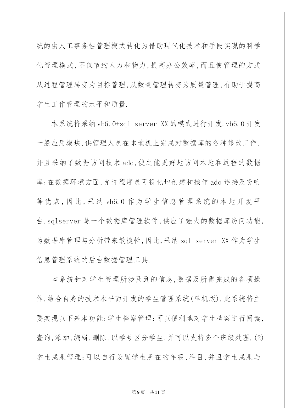 第PAGE\*Arabic\*MERGEFORMAT11页共NUMPAGES\*Arabic\*MERGEFORMAT11页第PAGE\*MERGEFORMAT11页共NUMPAGES\*MERGEFORMAT11页第PAGE\*MERGEFORMAT11页共NUMPAGES\*MERGEFORMAT11页第PAGE\*MERGEFORMAT11页共NUMPAGES\*MERGEFORMAT11页第PAGE\*MERGEFORMAT11页共NUMPAGES\*MERGEFORMAT11页第PAGE\*MERGEFORMAT11页共NUMPAGES\*MERGEFORMAT11页第PAGE\*MERGEFORMAT11页共NUMPAGES\*MERGEFORMAT11页第PAGE\*MERGEFORMAT11页共NUMPAGES\*MERGEFORMAT11页第PAGE\*MERGEFORMAT11页共NUMPAGES\*MERGEFORMAT11页第PAGE\*MERGEFORMAT11页共NUMPAGES\*MERGEFORMAT11页第PAGE\*MERGEFORMAT11页共NUMPAGES\*MERGEFORMAT11页2022学生信息管理系统设计开题报告学生信息管理系统设计开题报告在学习、工作或生活中,大家对书信都不生疏吧,书信是人们表达情感的一种特殊方式。信任写信是一个让很多人都头痛的问题,以下是我为大家整理的学生信息管理系统设计开题报告,欢迎阅读与保藏。学生信息管理系统设计开题报告11、开题报告的内容:本系统是一款资源型管理软件,适用于一般高等教化学生的管理工作,具有丰富,完整,规范的内容和比较完善的功能。是一个适用于高等院校或各类专科学校学生工作管理部门的计算机协助管理系统,它具备高校学生工作部门的学生管理的日常事务性工作及各类数据的自动化处理功能。从学生的入学档案,学籍档案,学习成果综合测评,奖学金管理,到学生毕业安排管理的全部业务功能。该系统能够自动地收集,存储,加工处理,查询检索和统计制表,便利有效地提高学生工作办公自动化管理的水平,解决了日常繁杂的数据,文件及历史资料的统计处理的重复性劳动。使过去很多只能定性管理的项目变为定量管理,使传统的由人工事务性管理模式转化为借助现代化技术和手段实现的科学化管理模式,不仅节约人力和物力,提高办公效率,而且使管理的方式从过程管理转变为目标管理,从数量管理转变为质量管理,有助于提高学生工作管理的水平和质量。本系统将采纳vb6。0+sqlserverXX的模式进行开发。vb6。0开发一般应用模块,供管理人员在本地机上完成对数据库的各种修改工作。并且采纳了数据访问技术ado,使之能更好地访问本地和远程的数据库;在数据环境方面,允许程序员可视化地创建和操作ado连接及吩咐等优点,因此,采纳vb6。0作为学生信息管理系统的本地开发平台。sqlserver是一个数据库管理软件,供应了强大的数据库访问功能,为数据库管理与分析带来敏捷性,因此,采纳sqlserverXX作为学生信息管理系统的后台数据管理工具。本系统针对学生管理所涉及到的信息,数据及所需完成的各项操作,结合自身的技术水平而开发的学生管理系统(单机版)。此系统将主要实现以下基本功能:学生档案管理:可以便利地对学生档案进行阅读,查询,添加,编辑,删除。以学号区分学生,并可以支持多个班级处理。(2)学生成果管理:可以自行设置学生所在的年级,科目,并且学生成果与档案以学号为关键字相关联,有力的保证了数据的完整性。(3)课程管理:可以自行设置课程信息,年级课程开放等状况。(4)班级管理:通过此模块用户可以系统性的设置,修改,删除该班级的基本信息(班级名称,班级人数,班主任),班委任职状况。(5)系统管理:此模块分系统用户管理,系统注册码管理,系统日志管理,用户密码管理以及系统数据库备份和系统数据库还原的功能。对于不同的用户供应了不同的用户操作权限(6)报表功能:依据学生成果自动生成成果报表打印此系统将具有:能供应的学生信息量大,用户界面友好,操作简便,快速等特点。本页应按开题报告(实施安排)的基本内容要求填写,填写不下可另附页。2、开题申请理由:21世纪全球信息电子化的潮流势不行挡,计算机渗入了社会生活中的各个领域,它的广泛应用给经济和社会生活带来深刻的变革。信息技术不仅变更了人们的工作和生活方式,也在变更教化和学习的方式。我国的教化事业蓬勃发展,升学率普遍提高,各类大专院校规模不断扩大,对于学生管理工作的高效性和规范化提出了更高的要求。作为学校管理工作的一个重要组成部分