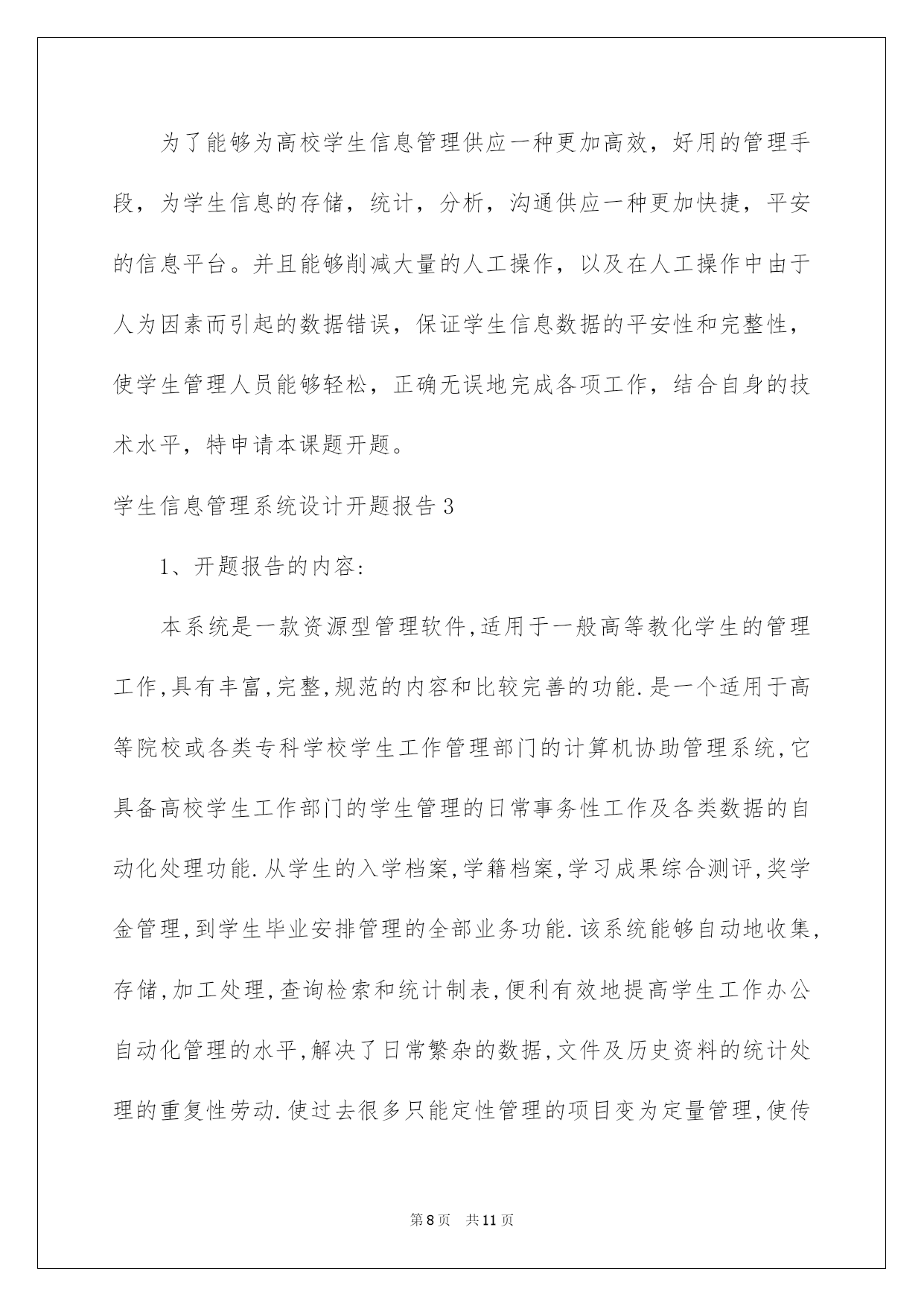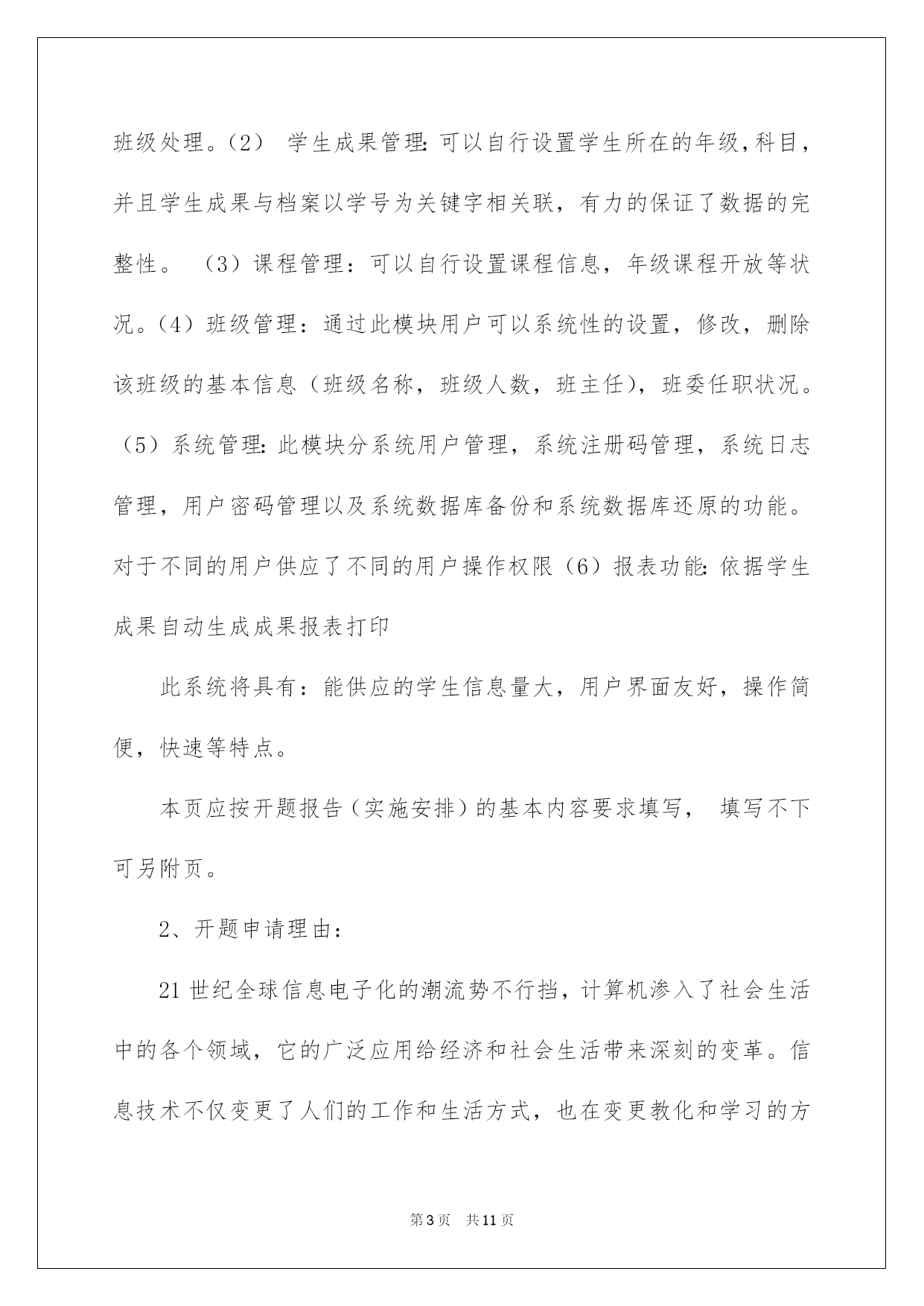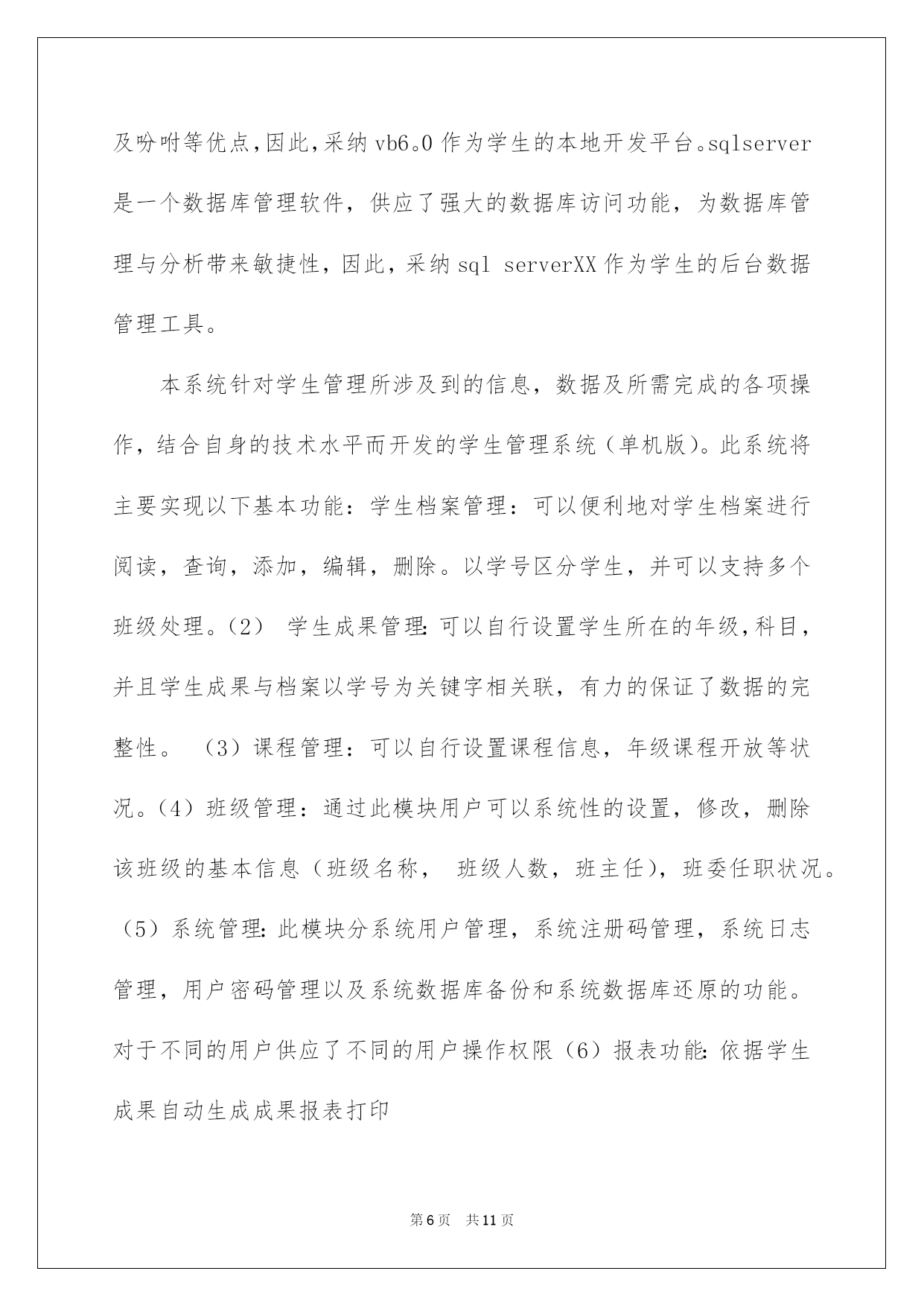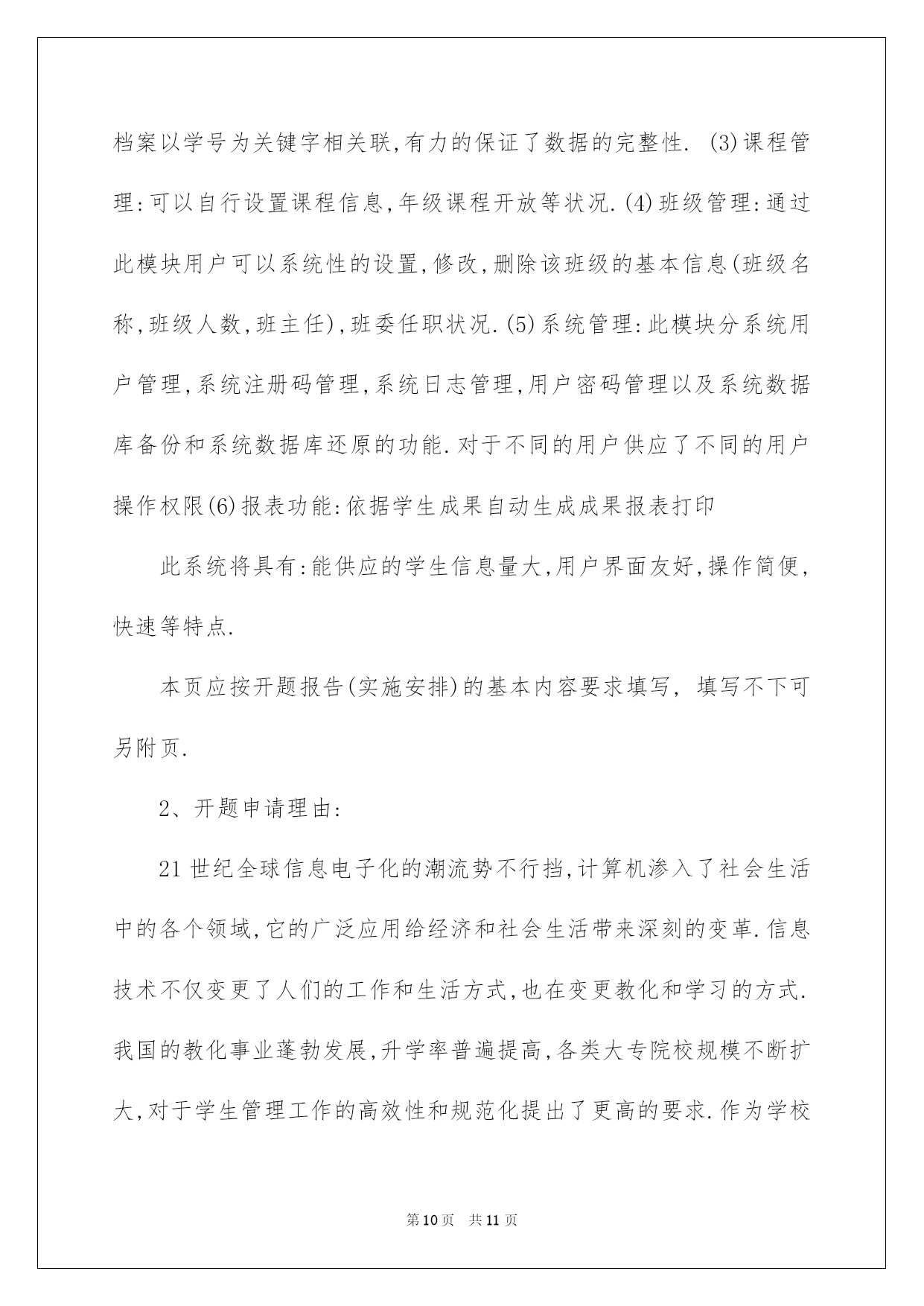第PAGE\*Arabic\*MERGEFORMAT11页共NUMPAGES\*Arabic\*MERGEFORMAT11页第PAGE\*MERGEFORMAT11页共NUMPAGES\*MERGEFORMAT11页第PAGE\*MERGEFORMAT11页共NUMPAGES\*MERGEFORMAT11页第PAGE\*MERGEFORMAT11页共NUMPAGES\*MERGEFORMAT11页第PAGE\*MERGEFORMAT11页共NUMPAGES\*MERGEFORMAT11页第PAGE\*MERGEFORMAT11页共NUMPAGES\*MERGEFORMAT11页第PAGE\*MERGEFORMAT11页共NUMPAGES\*MERGEFORMAT11页第PAGE\*MERGEFORMAT11页共NUMPAGES\*MERGEFORMAT11页第PAGE\*MERGEFORMAT11页共NUMPAGES\*MERGEFORMAT11页第PAGE\*MERGEFORMAT11页共NUMPAGES\*MERGEFORMAT11页第PAGE\*MERGEFORMAT11页共NUMPAGES\*MERGEFORMAT11页2022学生信息管理系统设计开题报告学生信息管理系统设计开题报告在学习、工作或生活中,大家对书信都不生疏吧,书信是人们表达情感的一种特殊方式。信任写信是一个让很多人都头痛的问题,以下是我为大家整理的学生信息管理系统设计开题报告,欢迎阅读与保藏。学生信息管理系统设计开题报告11、开题报告的内容:本系统是一款资源型管理软件,适用于一般高等教化学生的管理工作,具有丰富,完整,规范的内容和比较完善的功能。是一个适用于高等院校或各类专科学校学生工作管理部门的计算机协助管理系统,它具备高校学生工作部门的学生管理的日常事务性工作及各类数据的自动化处理功能。从学生的入学档案,学籍档案,学习成果综合测评,奖学金管理,到学生毕业安排管理的全部业务功能。该系统能够自动地收集,存储,加工处理,查询检索和统计制表,便利有效地提高学生工作办公自动化管理的水平,解决了日常繁杂的数据,文件及历史资料的统计处理的重复性劳动。使过去很多只能定性管理的项目变为定量管理,使传统的由人工事务性管理模式转化为借助现代化技术和手段实现的科学化管理模式,不仅节约人力和物力,提高办公效率,而且使管理的方式从过程管理转变为目标管理,从数量管理转变为质量管理,有助于提高学生工作管理的水平和质量。本系统将采纳vb6。0+sqlserverXX的模式进行开发。vb6。0开发一般应用模块,供管理人员在本地机上完成对数据库的各种修改工作。并且采纳了数据访问技术ado,使之能更好地访问本地和远程的数据库;在数据环境方面,允许程序员可视化地创建和操作ado连接及吩咐等优点,因此,采纳vb6。0作为学生信息管理系统的本地开发平台。sqlserver是一个数据库管理软件,供应了强大的数据库访问功能,为数据库管理与分析带来敏捷性,因此,采纳sqlserverXX作为学生信息管理系统的后台数据管理工具。本系统针对学生管理所涉及到的信息,数据及所需完成的各项操作,结合自身的技术水平而开发的学生管理系统(单机版)。此系统将主要实现以下基本功能:学生档案管理:可以便利地对学生档案进行阅读,查询,添加,编辑,删除。以学号区分学生,并可以支持多个班级处理。(2)学生成果管理:可以自行设置学生所在的年级,科目,并且学生成果与档案以学号为关键字相关联,有力的保证了数据的完整性。(3)课程管理:可以自行设置课程信息,年级课程开放等状况。(4)班级管理:通过此模块用户可以系统性的设置,修改,删除该班级的基本信息(班级名称,班级人数,班主任),班委任职状况。(5)系统管理:此模块分系统用户管理,系统注册码管理,系统日志管理,用户密码管理以及系统数据库备份和系统数据库还原的功能。对于不同的用户供应了不同的用户操作权限(6)报表功能:依据学生成果自动生成成果报表打印此系统将具有:能供应的学生信息量大,用户界面友好,操作简便,快速等特点。本页应按开题报告(实施安排)的基本内容要求填写,填写不下可另附页。2、开题申请理由:21世纪全球信息电子化的潮流势不行挡,计算机渗入了社会生活中的各个领域,它的广泛应用给经济和社会生活带来深刻的变革。信息技术不仅变更了人们的工作和生活方式,也在变更教化和学习的方式。我国的教化事业蓬勃发展,升学率普遍提高,各类大专院校规模不断扩大,对于学生管理工作的高效性和规范化提出了更高的要求。作为学校管理工作的一个重要组成部分