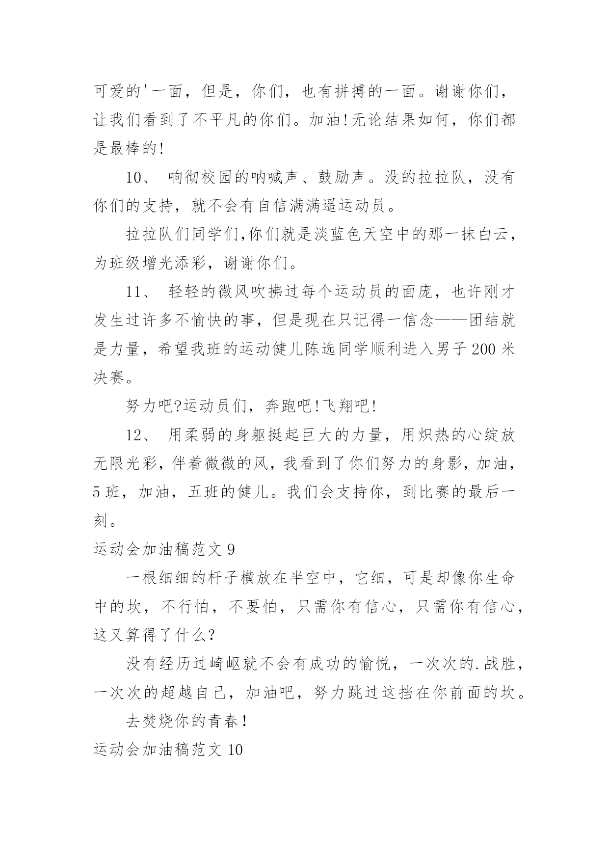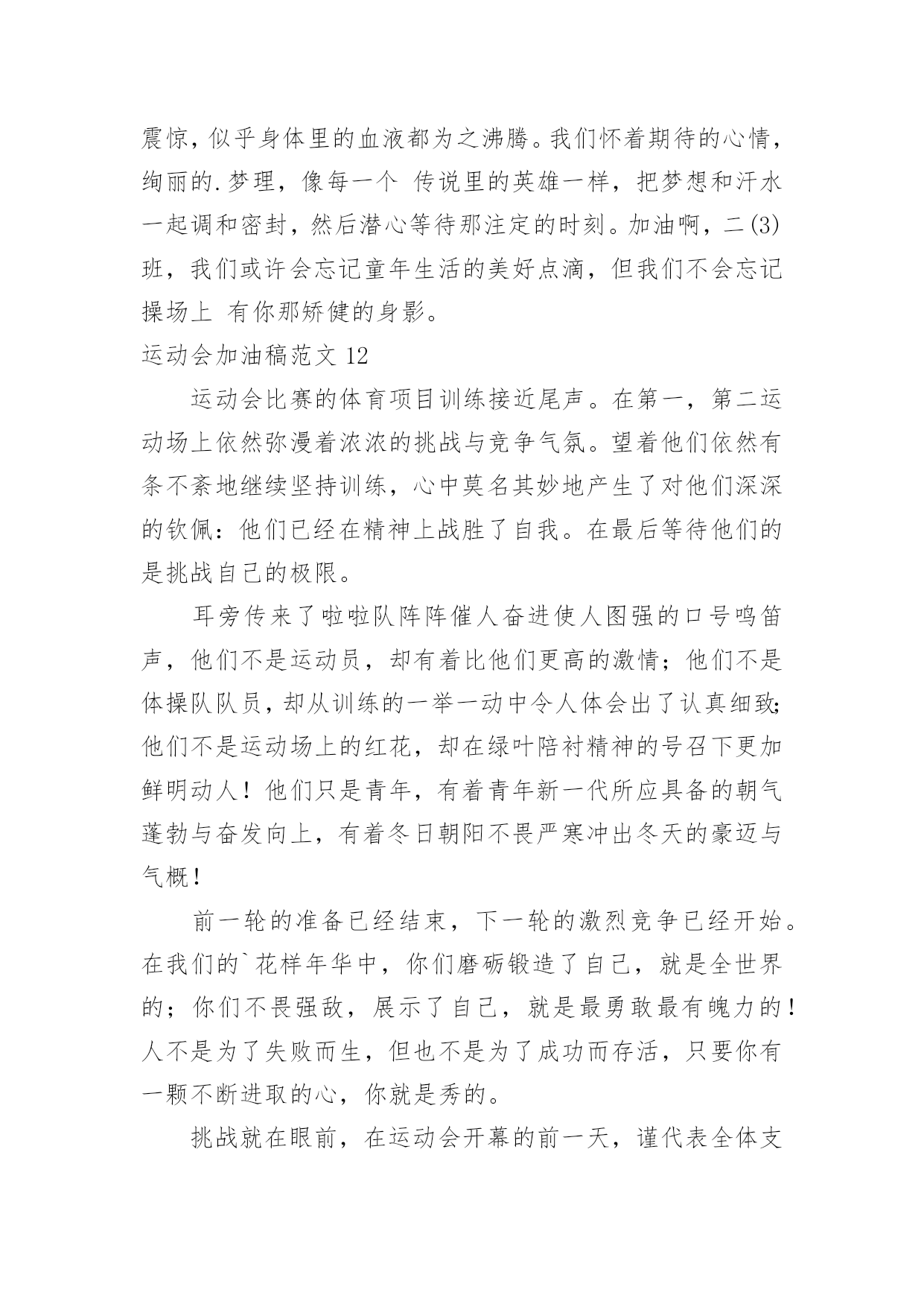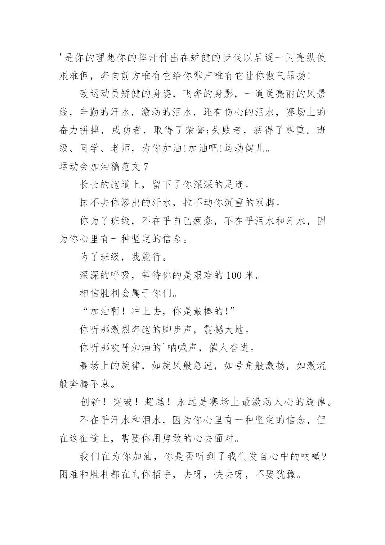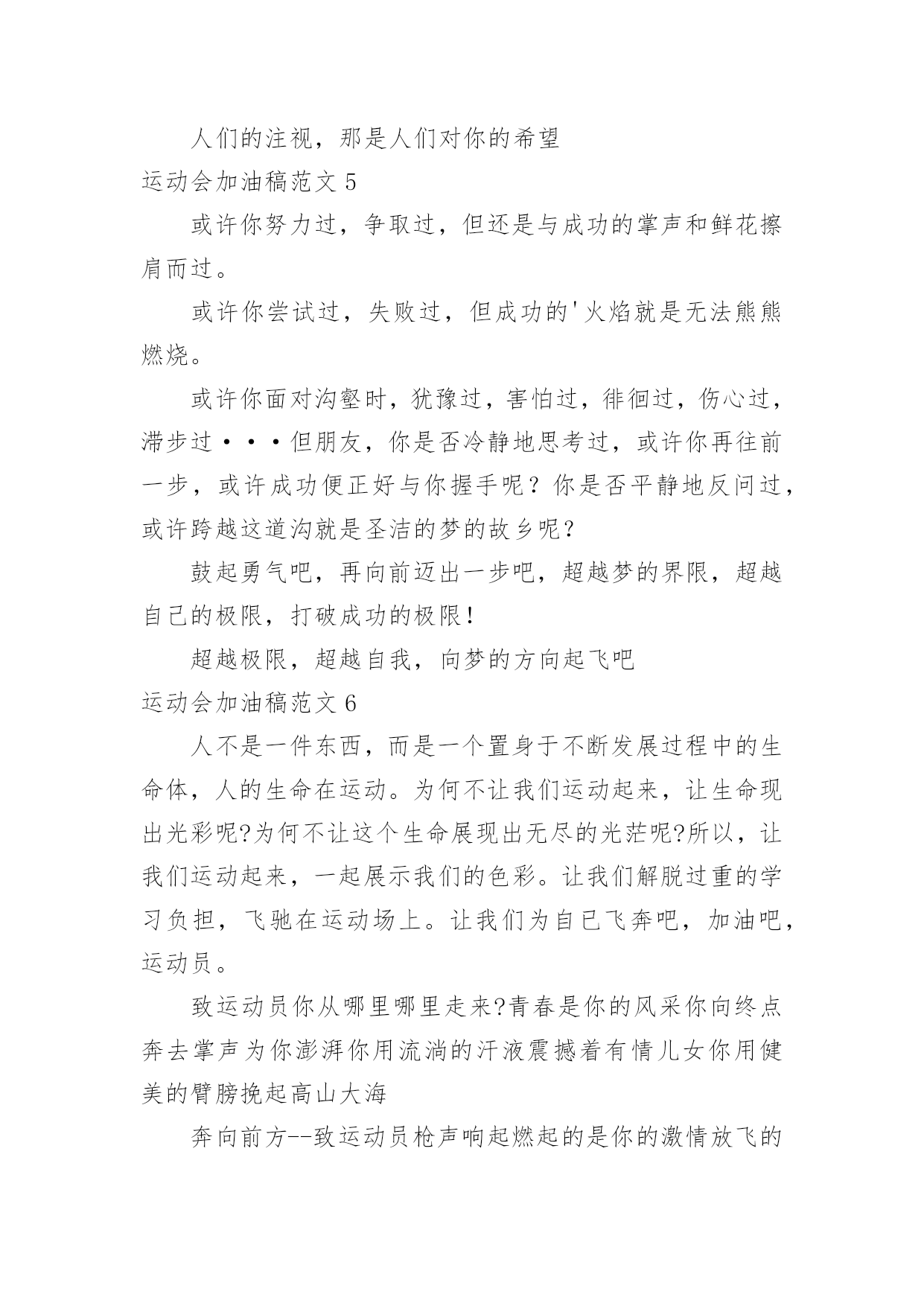 运动会加油稿运动会加油稿范文(精)在充满活力,日益开放的今天,我们很多时候都不得不用到加油稿,加油稿可以起到活跃气氛的作用。相信许多人会觉得加油稿很难写吧,以下是小编帮大家整理的运动会加油稿范文,仅供参考,大家一起来看看吧。运动会加油稿范文1还记得奥林匹克的口号吗?更高、更快、更强,正是因为有了动力,才让我们的运动变的精彩,变的绚丽,变的引人。大家记忆尤新的永远是最有风采的一面,乔丹的灌蓝,巴乔的射门。这所有的一切都让我们深深感受到一种精神的存在,那是勇攀高峰的精神,那是不断超越的'精神,更是人类挑战极限的精神。除了超越的精神外,还有一种风采感动着我们,那是运动最本质的品格,也是人类在竞争中的最真实,自然的情感流露。那是一种团结奋进的精神,它让本来残酷的竞争带上了人为的印记,捎上了一片真情。它让运动除了成绩外多了一种品质值得歌颂,相信那才是最感人的东西,它长存于我们运动史,深烙在我们思想中。运动会加油稿范文2成亦英雄,败亦英雄。你永远是我们心目中真正的英雄,第一个冲过终点的人当然是我们的偶像,而尚在跑道上为了奥林匹克精神奋力拼搏的,更值得我们敬崇、永不放弃,永不服输、终点并不是真正的`终点,体育必将冲破人类的极限。或许失败对于你来说是一种耻辱,是一种希望的破灭。几个月的艰辛训练和满怀的希望在一刹那间付诸东流,令你沮丧,令人悲伤,但看看你用尽全力奋力拼搏的一刹那。眼眶中含着泪水的我们不这么想,你是勇敢的,你是坚强的,你用你那顽强的意志完成了你的任务。看成败人生豪迈,我们应从头再来,为你感到了骄傲。运动会加油稿范文3那激烈的场面,令每一个人心动。你们拼尽每一份力,把手中的胜利传给下一个人;我们为你们加油,把心中的'希望传给你们。你撞线了,我们欢呼了。不仅仅是为了胜利,更重要的是,我们懂得了一种珍贵的精神,那就是——团结!运动会加油稿范文4蚂蚱似的起跳,空中的走步表演,引起阵阵惊叹,落地的瞬间,你触到了沙的柔软,不管怎样,荣誉永远属于你。致1500米运动员你是否感到,烈日的照射,那是烈日对你的你是否感到,彩旗的.摇摆,那是彩旗对你的呐喊人们的注视,那是人们对你的希望运动会加油稿范文5或许你努力过,争取过,但还是与成功的掌声和鲜花擦肩而过。或许你尝试过,失败过,但成功的'火焰就是无法熊熊燃烧。或许你面对沟壑时,犹豫过,害怕过,徘徊过,伤心过,滞步过···但朋友,你是否冷静地思考过,或许你再往前一步,或许成功便正好与你握手呢?你是否平静地反问过,或许跨越这道沟就是圣洁的梦的故乡呢?鼓起勇气吧,再向前迈出一步吧,超越梦的界限,超越自己的极限,打破成功的极限!超越极限,超越自我,向梦的方向起飞吧运动会加油稿范文6人不是一件东西,而是一个置身于不断发展过程中的生命体,人的生命在运动。为何不让我们运动起来,让生命现出光彩呢?为何不让这个生命展现出无尽的光茫呢?所以,让我们运动起来,一起展示我们的色彩。让我们解脱过重的学习负担,飞驰在运动场上。让我们为自已飞奔吧,加油吧,运动员。致运动员你从哪里哪里走来?青春是你的风采你向终点奔去掌声为你澎湃你用流淌的汗液震撼着有情儿女你用健美的臂膀挽起高山大海奔向前方--致运动员枪声响起燃起的是你的激情放飞的'是你的理想你的挥汗付出在矫健的步伐以后逐一闪亮纵使艰难但,奔向前方唯有它给你掌声唯有它让你傲气昂扬!致运动员矫健的身姿,飞奔的身影,一道道亮丽的风景线,辛勤的汗水,激动的泪水,还有伤心的泪水,赛场上的奋力拼搏,成功者,取得了荣誉;失败者,获得了尊重。班级、同学、老师,为你加油!加油吧!运动健儿。运动会加油稿范文7长长的跑道上,留下了你深深的足迹。抹不去你渗出的汗水,拉不动你沉重的双脚。你为了班级,不在乎自己疲惫,不在乎泪水和汗水,因为你心里有一种坚定的信念。为了班级,我能行。深深的呼吸,等待你的是艰难的100米。相信胜利会属于你们。“加油啊!冲上去,你是最棒的!”你听那激烈奔跑的脚步声,震撼大地。你听那欢呼加油的`呐喊声,催人奋进。赛场上的旋律,如旋风般急速,如号角般激扬,如激流般奔腾不息。创新!突破!超越!永远是赛场上最激动人心的旋律。不在乎汗水和泪水,因为你心里有一种坚定的信念,但在这征途上,需要你用勇敢的心去面对。我们在为你加油,你是否听到了我们发自心中的呐喊?困难和胜利都在向你招手,去呀,快去呀,不要犹豫。未来,进行到底。运动会加油稿范文81、xxx,不要哭了,摔倒了那是意外,我们都明白,你努力了,尽力了,虽然失败了,自千万不要气馁,还有两个比赛都在等着你,九班需要你,站起来,用一个微笑来淌除我们的担心,永远记住,你是最棒的!2、悠扬宛转的乐章已经奏起,七年(6)班的运动员在青春的跑道上创造佳绩。xxx同学在女子60米的预赛中取得了好成绩,xxx同学,愿你能够在决赛中,为七年(6)班增添一份光