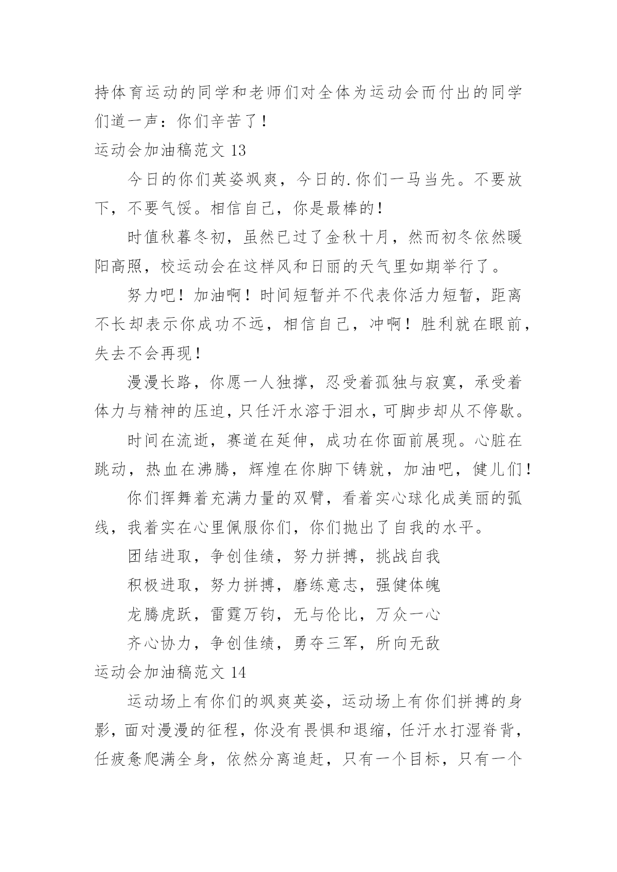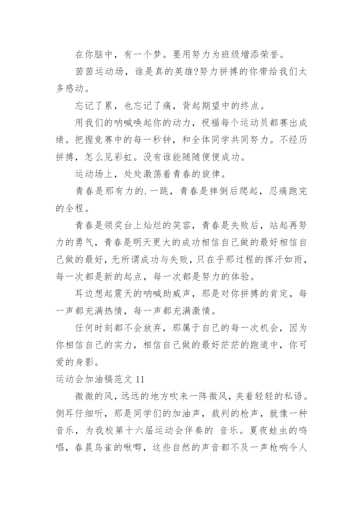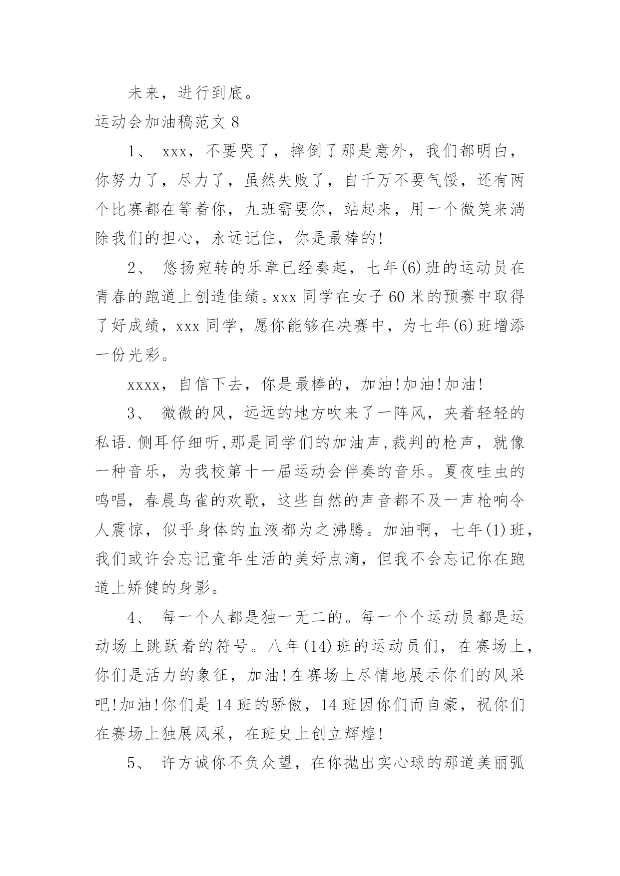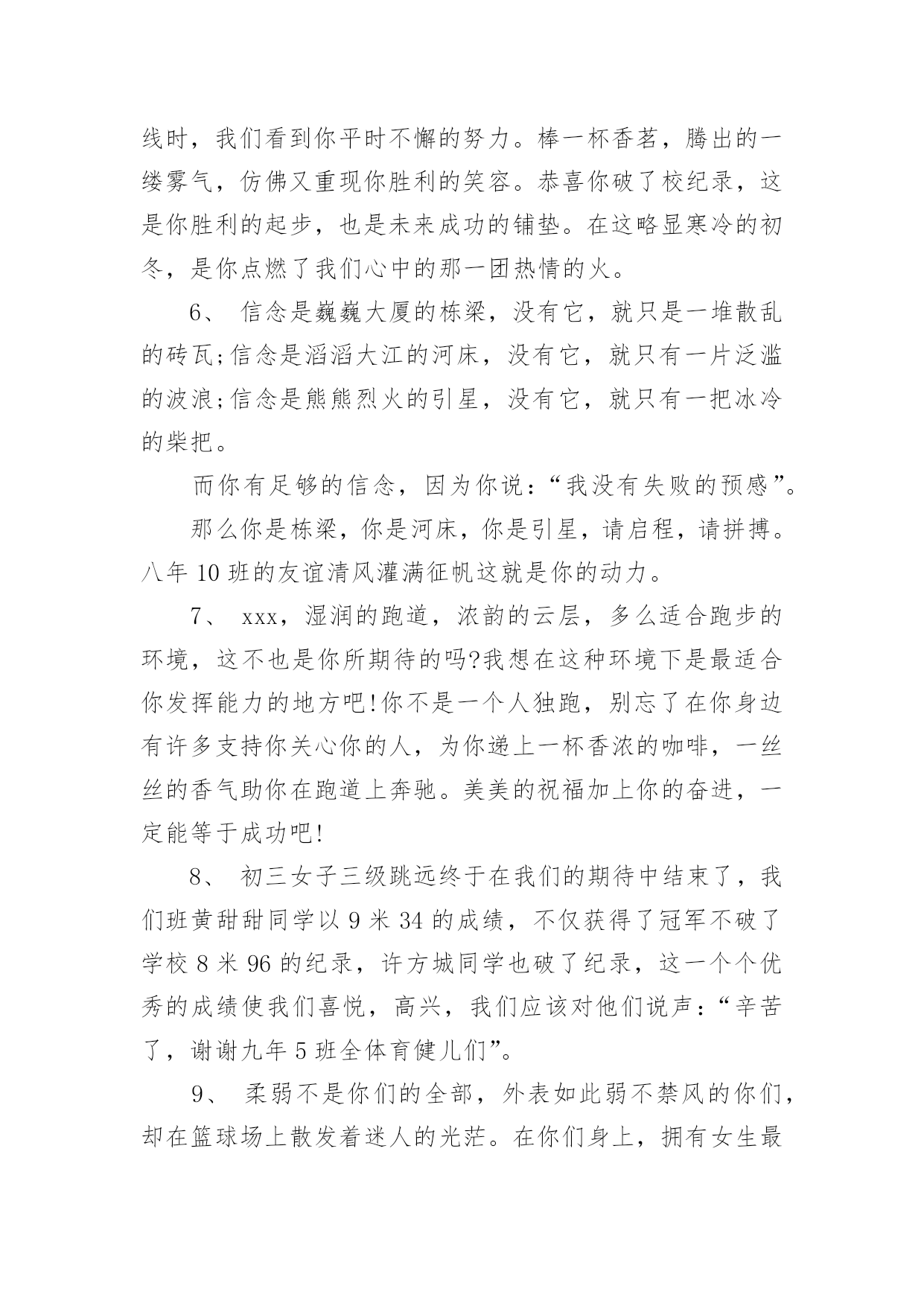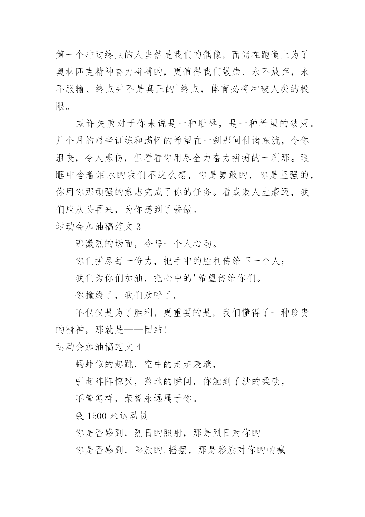 运动会加油稿运动会加油稿范文(精)在充满活力,日益开放的今天,我们很多时候都不得不用到加油稿,加油稿可以起到活跃气氛的作用。相信许多人会觉得加油稿很难写吧,以下是小编帮大家整理的运动会加油稿范文,仅供参考,大家一起来看看吧。运动会加油稿范文1还记得奥林匹克的口号吗?更高、更快、更强,正是因为有了动力,才让我们的运动变的精彩,变的绚丽,变的引人。大家记忆尤新的永远是最有风采的一面,乔丹的灌蓝,巴乔的射门。这所有的一切都让我们深深感受到一种精神的存在,那是勇攀高峰的精神,那是不断超越的'精神,更是人类挑战极限的精神。除了超越的精神外,还有一种风采感动着我们,那是运动最本质的品格,也是人类在竞争中的最真实,自然的情感流露。那是一种团结奋进的精神,它让本来残酷的竞争带上了人为的印记,捎上了一片真情。它让运动除了成绩外多了一种品质值得歌颂,相信那才是最感人的东西,它长存于我们运动史,深烙在我们思想中。运动会加油稿范文2成亦英雄,败亦英雄。你永远是我们心目中真正的英雄,第一个冲过终点的人当然是我们的偶像,而尚在跑道上为了奥林匹克精神奋力拼搏的,更值得我们敬崇、永不放弃,永不服输、终点并不是真正的`终点,体育必将冲破人类的极限。或许失败对于你来说是一种耻辱,是一种希望的破灭。几个月的艰辛训练和满怀的希望在一刹那间付诸东流,令你沮丧,令人悲伤,但看看你用尽全力奋力拼搏的一刹那。眼眶中含着泪水的我们不这么想,你是勇敢的,你是坚强的,你用你那顽强的意志完成了你的任务。看成败人生豪迈,我们应从头再来,为你感到了骄傲。运动会加油稿范文3那激烈的场面,令每一个人心动。你们拼尽每一份力,把手中的胜利传给下一个人;我们为你们加油,把心中的'希望传给你们。你撞线了,我们欢呼了。不仅仅是为了胜利,更重要的是,我们懂得了一种珍贵的精神,那就是——团结!运动会加油稿范文4蚂蚱似的起跳,空中的走步表演,引起阵阵惊叹,落地的瞬间,你触到了沙的柔软,不管怎样,荣誉永远属于你。致1500米运动员你是否感到,烈日的照射,那是烈日对你的你是否感到,彩旗的.摇摆,那是彩旗对你的呐喊人们的注视,那是人们对你的希望运动会加油稿范文5或许你努力过,争取过,但还是与成功的掌声和鲜花擦肩而过。或许你尝试过,失败过,但成功的'火焰就是无法熊熊燃烧。或许你面对沟壑时,犹豫过,害怕过,徘徊过,伤心过,滞步过···但朋友,你是否冷静地思考过,或许你再往前一步,或许成功便正好与你握手呢?你是否平静地反问过,或许跨越这道沟就是圣洁的梦的故乡呢?鼓起勇气吧,再向前迈出一步吧,超越梦的界限,超越自己的极限,打破成功的极限!超越极限,超越自我,向梦的方向起飞吧运动会加油稿范文6人不是一件东西,而是一个置身于不断发展过程中的生命体,人的生命在运动。为何不让我们运动起来,让生命现出光彩呢?为何不让这个生命展现出无尽的光茫呢?所以,让我们运动起来,一起展示我们的色彩。让我们解脱过重的学习负担,飞驰在运动场上。让我们为自已飞奔吧,加油吧,运动员。致运动员你从哪里哪里走来?青春是你的风采你向终点奔去掌声为你澎湃你用流淌的汗液震撼着有情儿女你用健美的臂膀挽起高山大海奔向前方--致运动员枪声响起燃起的是你的激情放飞的'是你的理想你的挥汗付出在矫健的步伐以后逐一闪亮纵使艰难但,奔向前方唯有它给你掌声唯有它让你傲气昂扬!致运动员矫健的身姿,飞奔的身影,一道道亮丽的风景线,辛勤的汗水,激动的泪水,还有伤心的泪水,赛场上的奋力拼搏,成功者,取得了荣誉;失败者,获得了尊重。班级、同学、老师,为你加油!加油吧!运动健儿。运动会加油稿范文7长长的跑道上,留下了你深深的足迹。抹不去你渗出的汗水,拉不动你沉重的双脚。你为了班级,不在乎自己疲惫,不在乎泪水和汗水,因为你心里有一种坚定的信念。为了班级,我能行。深深的呼吸,等待你的是艰难的100米。相信胜利会属于你们。“加油啊!冲上去,你是最棒的!”你听那激烈奔跑的脚步声,震撼大地。你听那欢呼加油的`呐喊声,催人奋进。赛场上的旋律,如旋风般急速,如号角般激扬,如激流般奔腾不息。创新!突破!超越!永远是赛场上最激动人心的旋律。不在乎汗水和泪水,因为你心里有一种坚定的信念,但在这征途上,需要你用勇敢的心去面对。我们在为你加油,你是否听到了我们发自心中的呐喊?困难和胜利都在向你招手,去呀,快去呀,不要犹豫。未来,进行到底。运动会加油稿范文81、xxx,不要哭了,摔倒了那是意外,我们都明白,你努力了,尽力了,虽然失败了,自千万不要气馁,还有两个比赛都在等着你,九班需要你,站起来,用一个微笑来淌除我们的担心,永远记住,你是最棒的!2、悠扬宛转的乐章已经奏起,七年(6)班的运动员在青春的跑道上创造佳绩。xxx同学在女子60米的预赛中取得了好成绩,xxx同学,愿你能够在决赛中,为七年(6)班增添一份光