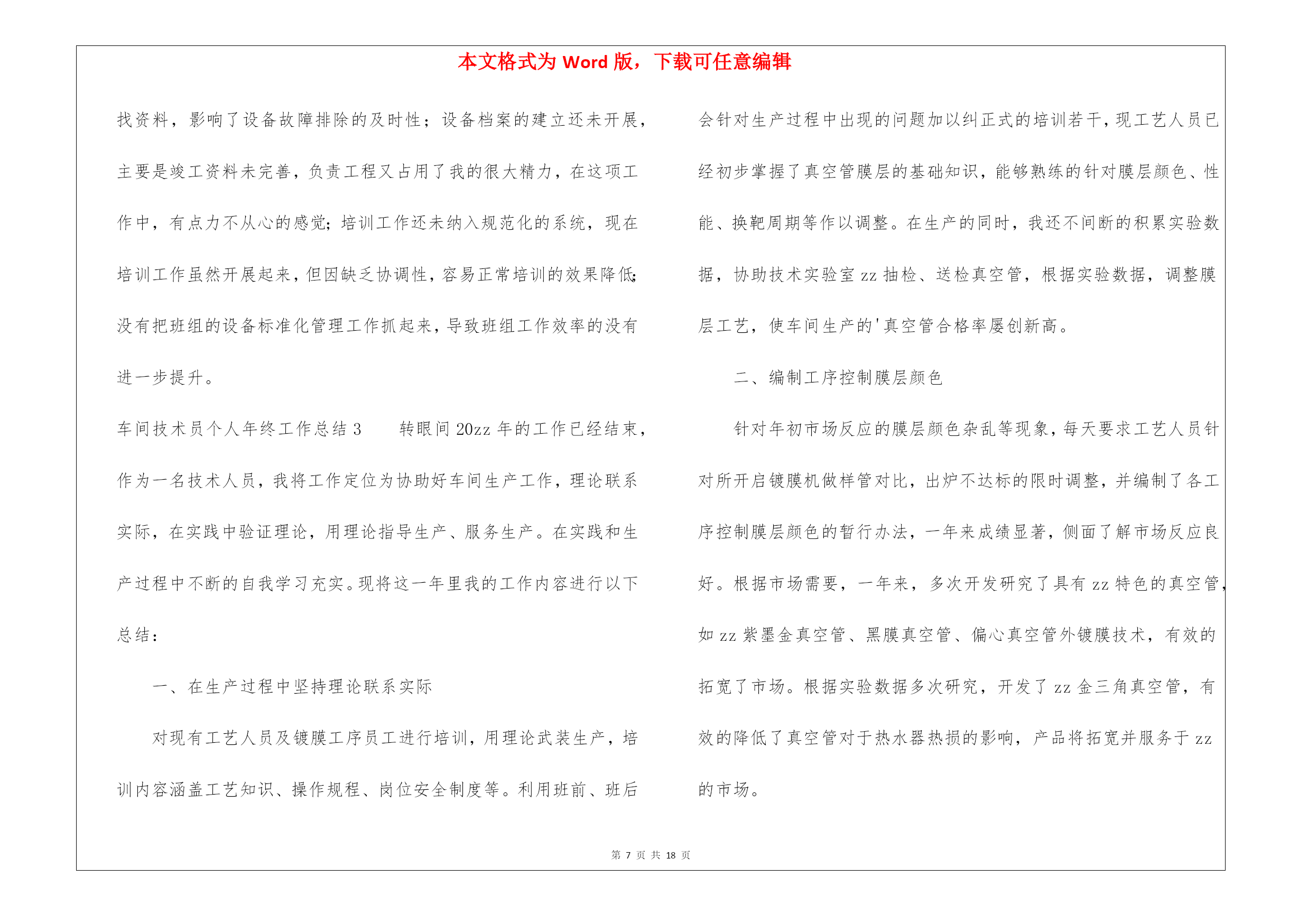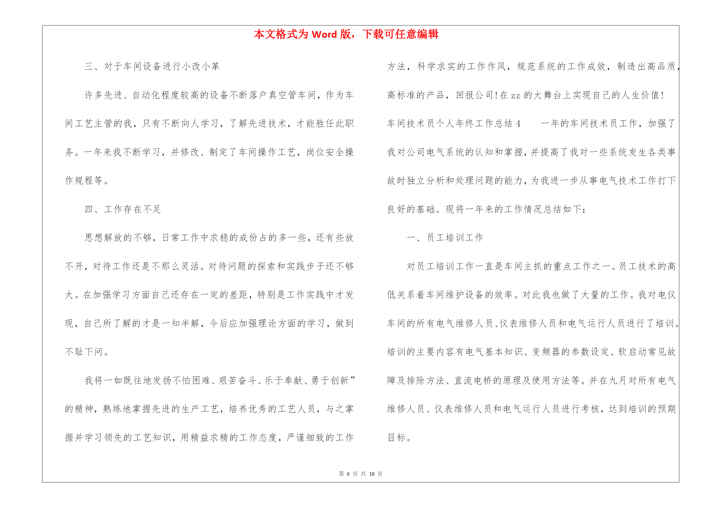 本文格式为Word版,下载可任意编辑第PAGE\*MERGEFORMAT18页共NUMPAGES\*MERGEFORMAT18页车间技术员个人年终工作总结(9篇)车间技术员个人年终工作总结(9篇)总结是事后对某一阶段的学习或工作情况作加以回顾检查并分析评价的书面材料,写总结有利于我们学习和工作能力的提高,让我们一起认真地写一份总结吧。那么如何把总结写出新花样呢?下面是我整理的车间技术员个人年终工作总结,希望对大家有所帮助。车间技术员个人年终工作总结1自20xx年x月我来到xx一园区工作现今,已有一年多的时间了。在这一年中,我一直在项目部工作,负责电气施工的现场管理及技术指导工作,凭借自己的努力和领导的提携,从一名普通的电气监理,进而又被提拔到兼任电仪车间技术员一职。在这期间,我除负责对南北厂区所属的车间进行电气施工监理的工作之外,还承担电仪车间技术员应尽的职责。虽然工作量比以前要繁重的多,但给我提供了一个全面了解公司整个电气系统的机会,加强了我对公司电气系统的认知和掌握,并提高了我对一些系统发生各类事故时独立分析和处理问题的能力,为我进一步从事电气技术工作打下良好的基矗。下面我对20xx年承担车间技术员工作进行总结。一、日常工作内容(1)、xxx口服无菌车间离心机,在料满的情况下,无法启动。我去检查后,发现离心机在启动前,负载太重。变频器送出功率无法克服此扭矩,造成离心机无法启动。了解工作原因以后,我对变频器的启动扭矩重新设置并投入直流制动电阻,延长了启动时间,保证了该离心机的正常使用。(2)、锅炉车间1#引风机变频器在正常停车时,总报“停车时过电流”,经我分析,发现停车时,操作人员停车太快,没有在逐步减小频率的情况下,就迅速停车。为彻底解决本问题,我为该变频器安装了直流电抗器,并设置直流电抗器的投用参数,从技术层面解决了此问题。另外为保证设备的正常运行,我还给锅炉车间的操作工讲解了设备正常的启动程序和注意事项。(3)、xxx提炼一车间薄膜蒸发器,在使用过程中,压力一直处于高位,无法保证生产的正常运行,对此我与xx协商后,建议使用变频控制方式。用人为方式控制设备的压力,确保生产的稳定性。最终,我们为8台薄膜蒸发器安装了变频器,通过一个时期的运行,确定效果达到预期要求。(4)、xxx发酵一车间3#反渗透高压泵,在试用行时,变频器无法正常工作,我检查后,发现变频器的参数人为改动过,造成变频器运行参数冲突。为解决本问题,我重新设定参数,确保了该设备的正式使用。(5)、污水站脱水机房离心机,在运行中,报过电流故障,我在现场检查后,确认该变频器所带电机有问题。经进一步检查电机,发现电机匝间短路。对电机维修后,设备恢复正常。(6)、锅炉车间主热水电磁阀,电路板经常被击穿,我分析认为系工作电源受变频器及其它直流电气设备的污染,导致电压叠加,形成高电压,造成工作电路板击穿。所以我建议车间安装稳压器,单独为仪表类设备供电,以保证仪表设备的使用安全和运行稳定。这些只是我日常工作的很小一部分,这样的突发事故常有发生,当需要我去处理是我总会第一个来到现场,尽自己所能尽快为车间排除故障,恢复设备的正常运行。二、技术改造(1)、七月对xxx发酵304#大罐变频控制柜主回路进行技术改造,由4#变压器负载回路变更为1#变压器负载回路。减少4#变压器所带负荷。4#变压器在未进行改造前,负荷最高时可到达4000a以上,高出变压器额定电流的15%以上,严重威胁4#变压器的安全运行,给车间的正常生产留下重大隐患。对此,我们在车间的统一领导下,提出方案,并进行可行性论证后,进行了上述改造。通过改造,使4#变压器的负荷在生产高分期都能维持在3200a已下,确保了设备的安全,达到改造的预期效果。(2)、八月份对锅炉车间14#炉的鼓、引风电气控制回路进行连锁改造。锅炉车间14#炉为大药拆过来的旧设备。旧鼓引风电气未有电气控制连锁,在生产中,引风机因突发事故停车,鼓风机在继续运行,就可造成锅炉回火现象,从而可能导致设备和人员的伤害。对此,在没有图纸的情况下,我对锅炉车间的鼓、引风电机控制变频柜的电气回路进行实测,并最终找到连锁控制的方式,在电气维修一组的配合下,完成了此项改造,达到改造目的。(3)、10月份对xxx发酵一车间反渗透的电仪连锁控制方式进行改造。以前该系统只对高压和高温进行速断保护,对压力低未进行停车保护,这就容易造成高压泵的烧毁,但我在回复低压保护的过程中,又出现了清洗泵在低压状态下无法启车的故障。经过与车间的沟通,发现原厂家图纸设计存在缺陷,我在对图纸进行改变后,按新方式,接连锁线后,设备恢复正常。(4)、在工程施工过程中,因为设计和新旧设备衔接等方面原因,导致部分车间的回路未安装计量表,对此我在车间的安排下,为这部分回路安装了电度表。具体