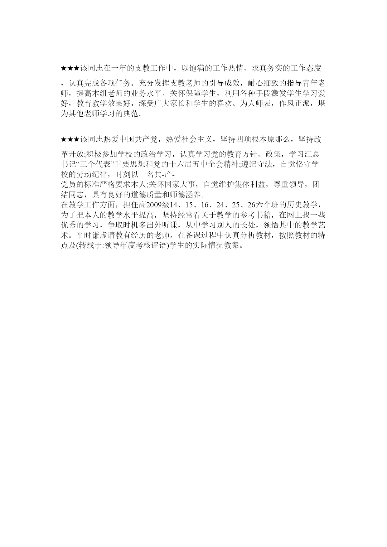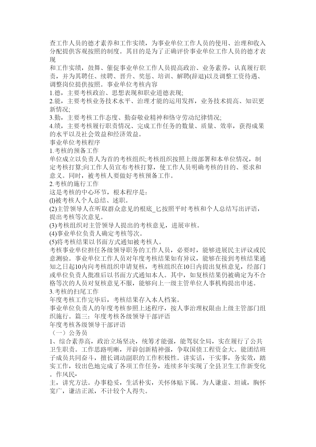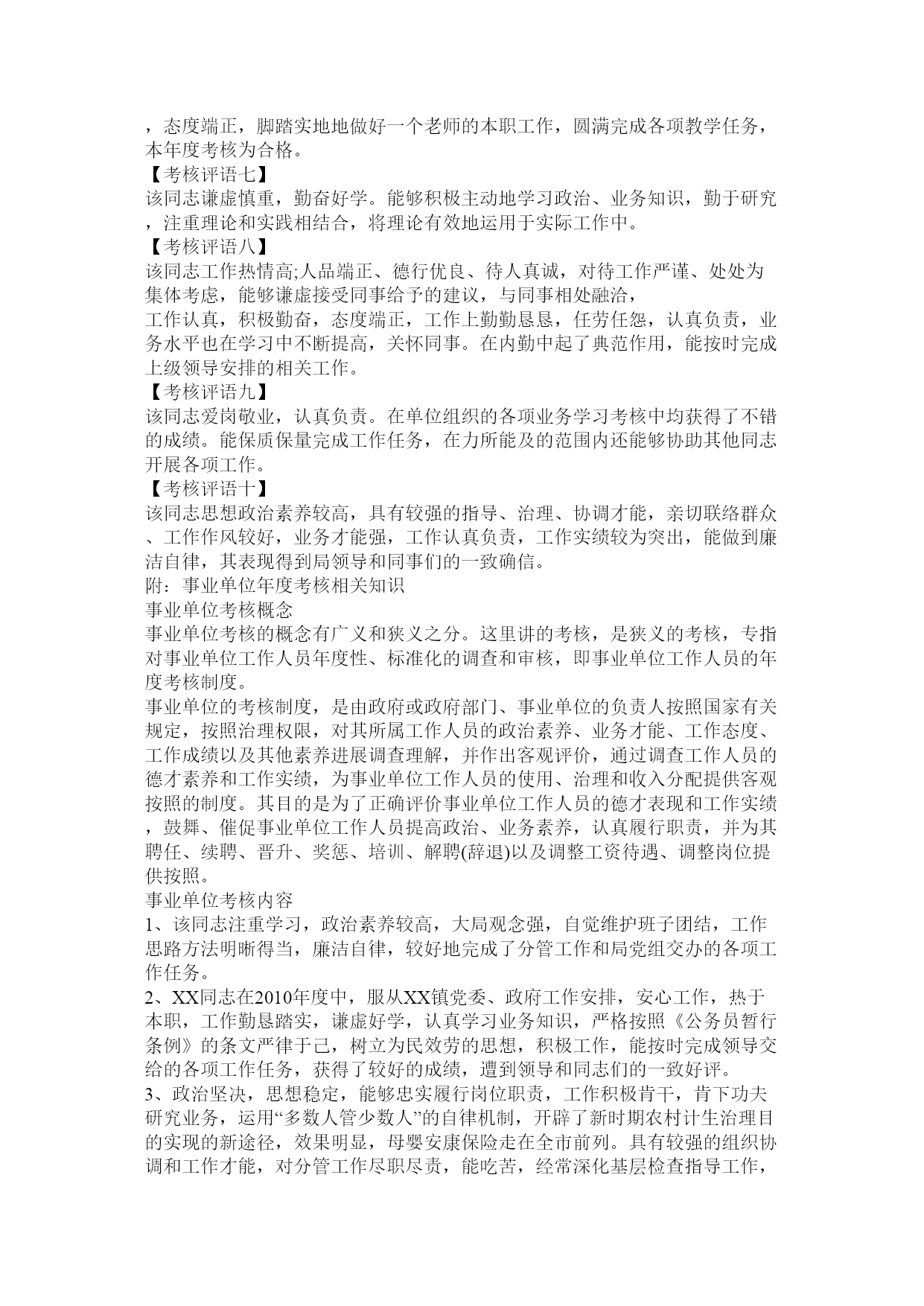 公务员个人单位考核评语(最新)篇一:公务员试用期满转正领导评鉴意见评语(公务员试用期满转正,领导评鉴意见,谨供参考)该同志有良好的道德涵养,思想积极进步,政治觉悟较高,热爱祖国、热爱人民,坚持四项根本原那么,坚决拥护中国共产党的领导。积极向党组织靠拢,政治立场坚决,对党的事业充满决心。工作上服从上级安排,热于本职工作,勤奋肯干,谦虚好学。学习才能强,能主动学习和研究业务知识,较好地掌握了岗位所需的知识和技能。爱岗敬业,认真负责,能按时完成领导交给的各项工作任务,具有较强的工作才能,能胜任本职工作。生活中待人诚恳,尊重领导,团结同事。为人正直,谦虚慎重,严格恪守各项规章制度和工作纪律。生活朴素,作风严谨踏实。在过去的一年中,该同志认真履行公务员应尽的义务,圆满完成各项工作任务。本人认为其具备一名合格公务员所应具备的主要条件,同意其按期转正。篇二:事业单位年度考核评语事业单位年度考核评语【考核评语一】该同志思想政治素养较高,具有较强的指导、治理、协调才能,亲切联络群众、工作作风较好,业务才能强,工作认真负责,工作实绩较为突出,能做到廉洁自律,建议年度考核评为优秀。【考核评语二】该同志有良好的道德涵养,坚决的政治方向。在单位组织的各项政治学习活动中能认真学习,认真分析总结本身情况,积极改良,将理论应用到实践中。在平时工作生活中,严格恪守单位的各项规章制度。能和同事们以诚相待,和睦相处,互相协助。【考核评语三】该同志综合素养好,业务才能强,学习才能强。能比拟全面地掌握xx-xx知识和我单位主要职能和重点工作,有较强的沟通才能,能够胜任本身的本职工作。【考核评语四】该同志工作认真负责,积极主动,业务知识扎实,业务水平优秀,胜任岗位工作,对待所负责工作进展有效指导,并提出建立性意见,有一定的领导才能,人品端正、做事踏实、行为标准、与其他同事相处融洽,工作认真刻苦,工作积极,热情周到,专业技能业务水平优秀,爱岗敬业、乐于助人,与同事相处融洽,服从整体安排,对本职工作兢兢业业,锐意进取,起典范作用,为我们xx树立良好形象。【考核评语五】该同志一年来工作认真负责,恪守学校各项规章制度,认真学习党的教育方针政策,在教育中勇于创新,学生德育思想教育到位,课堂治理完善,服从领导安排,圆满完成各项教学任务,本年度考核为合格。【考核评语六】该同志热爱教育事业,拥护党的教育方针政策,自觉维护集体利益,尊重领导,团结同志,具有良好的道德质量和师德涵养,恪守劳动纪律,工作认真负责,态度端正,脚踏实地地做好一个老师的本职工作,圆满完成各项教学任务,本年度考核为合格。【考核评语七】该同志谦虚慎重,勤奋好学。能够积极主动地学习政治、业务知识,勤于研究,注重理论和实践相结合,将理论有效地运用于实际工作中。【考核评语八】该同志工作热情高;人品端正、德行优良、待人真诚,对待工作严谨、处处为集体考虑,能够谦虚接受同事给予的建议,与同事相处融洽,工作认真,积极勤奋,态度端正,工作上勤勤恳恳,任劳任怨,认真负责,业务水平也在学习中不断提高,关怀同事。在内勤中起了典范作用,能按时完成上级领导安排的相关工作。【考核评语九】该同志爱岗敬业,认真负责。在单位组织的各项业务学习考核中均获得了不错的成绩。能保质保量完成工作任务,在力所能及的范围内还能够协助其他同志开展各项工作。【考核评语十】该同志思想政治素养较高,具有较强的指导、治理、协调才能,亲切联络群众、工作作风较好,业务才能强,工作认真负责,工作实绩较为突出,能做到廉洁自律,其表现得到局领导和同事们的一致确信。附:事业单位年度考核相关知识事业单位考核概念事业单位考核的概念有广义和狭义之分。这里讲的考核,是狭义的考核,专指对事业单位工作人员年度性、标准化的调查和审核,即事业单位工作人员的年度考核制度。事业单位的考核制度,是由政府或政府部门、事业单位的负责人按照国家有关规定,按照治理权限,对其所属工作人员的政治素养、业务才能、工作态度、工作成绩以及其他素养进展调查理解,并作出客观评价,通过调查工作人员的德才素养和工作实绩,为事业单位工作人员的使用、治理和收入分配提供客观按照的制度。其目的是为了正确评价事业单位工作人员的德才表现和工作实绩,鼓舞、催促事业单位工作人员提高政治、业务素养,认真履行职责,并为其聘任、续聘、晋升、奖惩、培训、解聘(辞退)以及调整工资待遇、调整岗位提供按照。事业单位考核内容1、该同志注重学习,政治素养较高,大局观念强,自觉维护班子团结,工作思路方法明晰得当,廉洁自律,较好地完成了分管工作和局党组交办的各项工作任务。2、XX同志在2010年度中,服从XX镇党委、政府工作安排,安心工作,热于本职,工作勤恳踏实,谦虚好学,认真学习业务知识,严格按照《公务