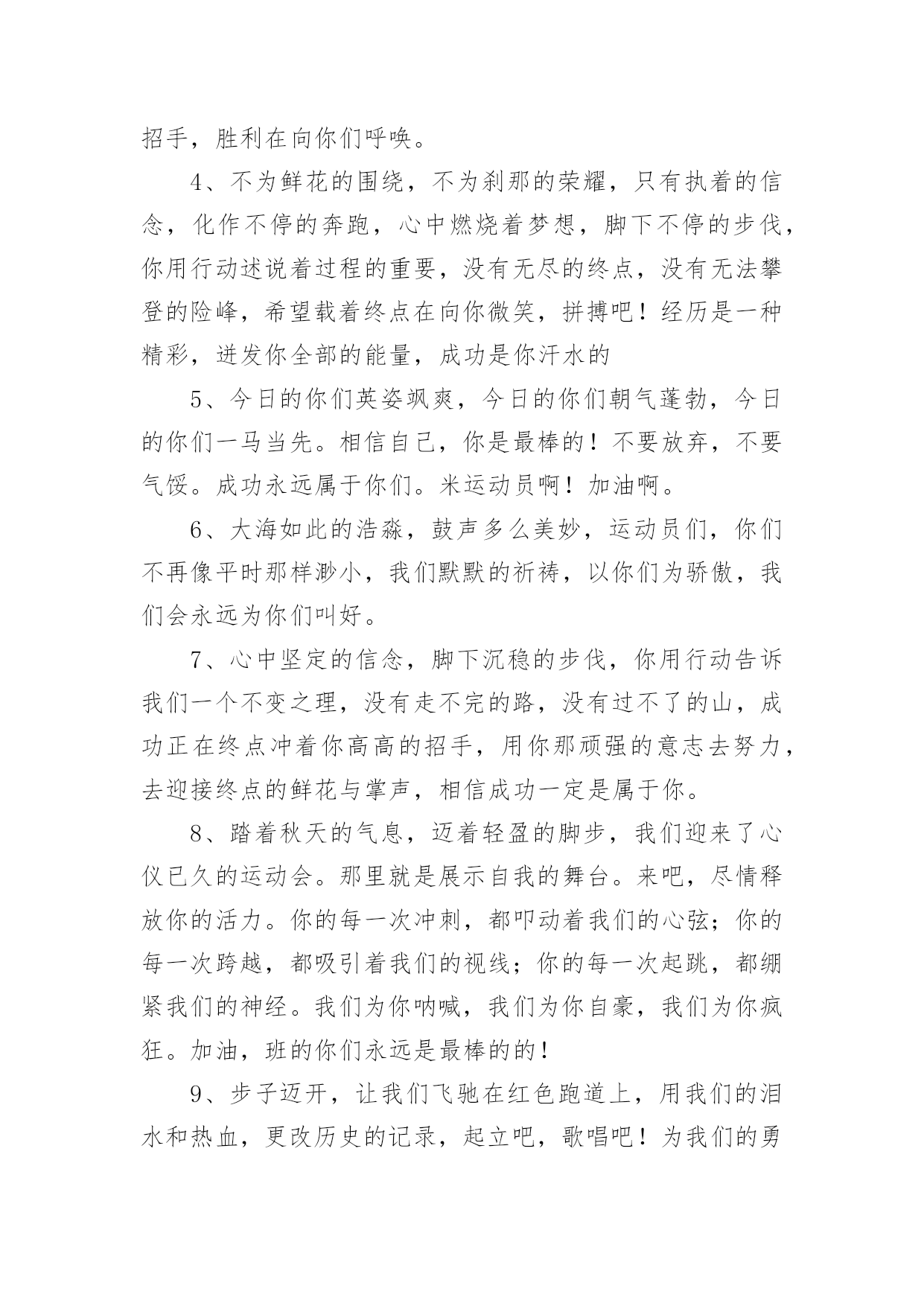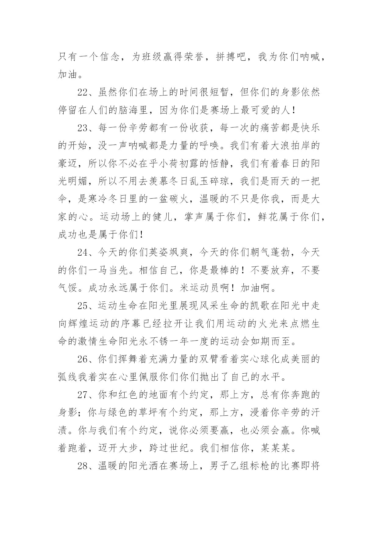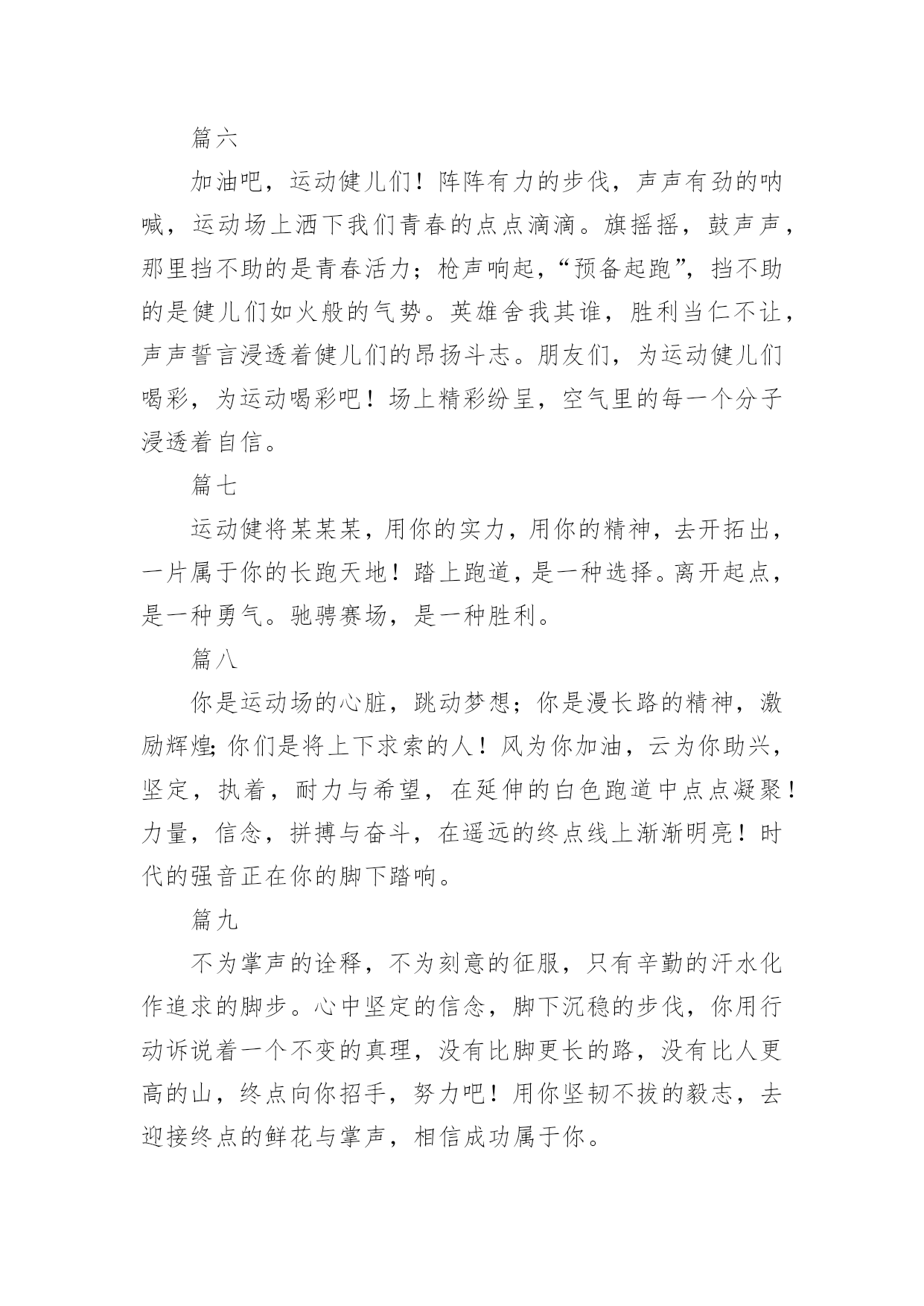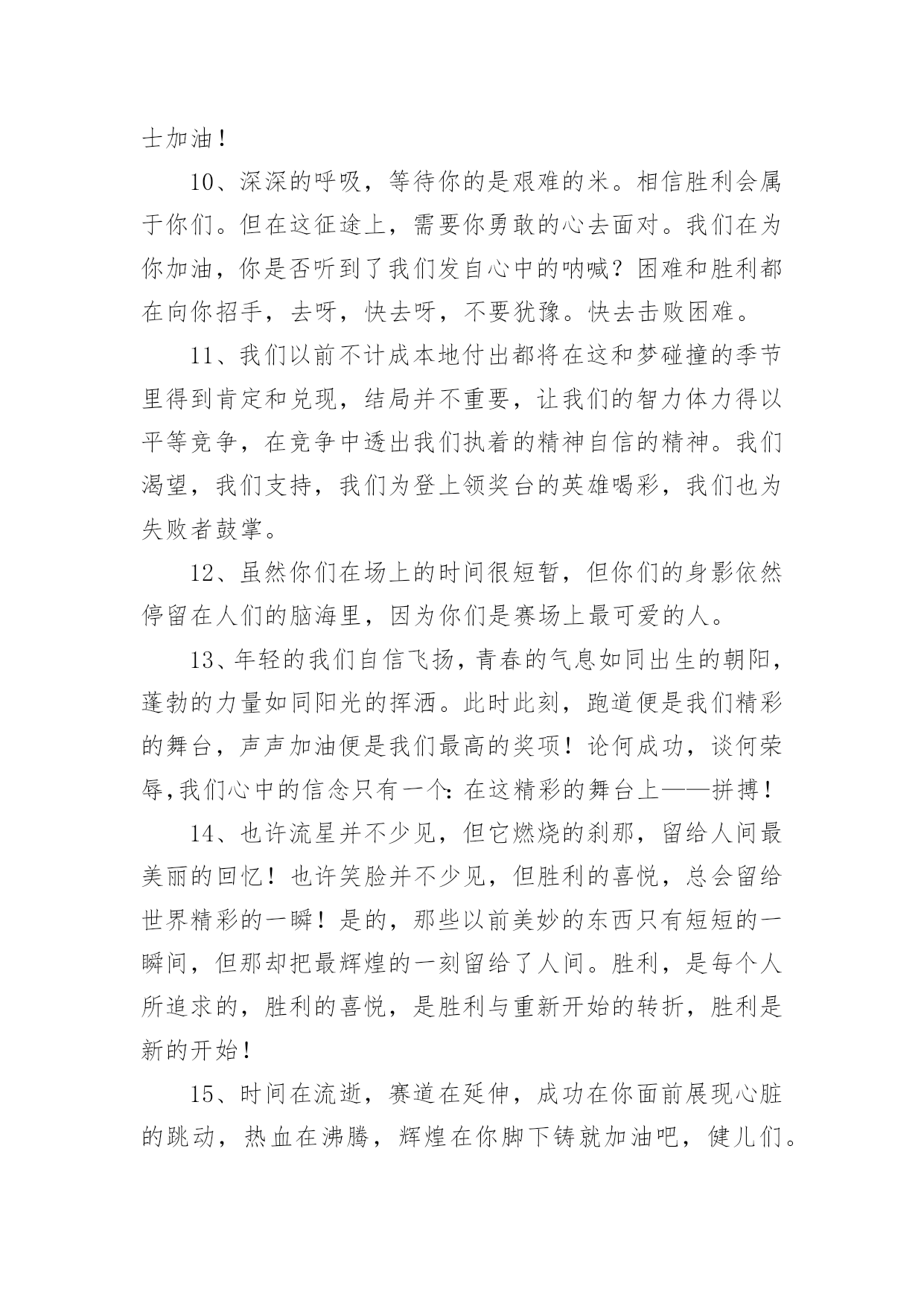 运动会加油稿(必备)运动会加油稿15篇在我们平凡的日常里,我们使用上加油稿的情况与日俱增,借助加油稿可以表达对对方的鼓励和支持。相信写加油稿是一个让许多人都头痛的问题,下面是小编精心整理的运动会加油稿,欢迎阅读,希望大家能够喜欢。运动会加油稿1夏日的操场,竟是如此美丽,美丽的`几乎令人绝望。你蹲在起跑线上,每一块肌肉都固执得顶起,像一尊雕像。慢慢地、慢慢地、你抬起了头,坚毅的目光中透出了贪婪,汗湿的发丝终于飞了起来。冲吧!冲吧!化作勇敢的苍鹰,去寻找心中的太阳。运动会加油稿2篇一超越对手,超越自我,是我们的目标,我们的信念,在清凉的初秋,在喧嚣的田径场上,你们点燃了似火的热情,无论成败,我们都为你们感到自豪,你们永远是我们的骄傲!篇二看!运动场上那一幕幕,无论是哭是笑,是喜是悲,其中都融入了他们的汗水辛劳。他们是真正的矫健者,是运动场上的骄儿,更是我们心中的英雄。加油吧!英雄们!每一份辛劳都有一份收获,每一次的痛苦都是快乐的开始,每一声呐喊都是力量的呼唤。运动场上的健儿,掌声属于你们,鲜花属于你们,成功也是属于你们!篇三踏着秋天的气息,迈着轻盈的脚步,我们迎来了心仪已久的运动会。那里就是展示自我的舞台。来吧,尽情释放你的活力。你的每一次冲刺,都叩动着我们的心弦;你的每一次跨越,都吸引着我们的视线;你的每一次起跳,都绷紧我们的神经。我们为你呐喊,我们为你自豪,我们为你疯狂。加油,x班的你们永远是最棒的的!篇四你赢得十分精彩,无需掩饰你的微笑,流露在你脸上。但我相信,你心中十分明白,征途刚刚开始,漫漫长路刚刚开头。加油啊,朋友,只有不断的拼搏,才能够不断战胜自己,战胜一切!向前向前向前!百米跑道虽不长,运动健儿志高扬。磨拳擦掌跃欲试,分秒必争勇夺魁。巾帼岂将须眉让。古有木兰冲杀场,今有跑百米。立志创新校记录,勇夺信管第一金。篇五你是否感到,烈日的照射那是烈日对你的祝福;你是否感到,彩旗的摇摆那是彩旗对你的呐喊人们的注视那是人们对你的.希望,祝福在你身边呐喊在你耳边希望在你心中。的健儿,愿你们一展雄风,勇夺桂冠!篇六加油吧,运动健儿们!阵阵有力的步伐,声声有劲的呐喊,运动场上洒下我们青春的点点滴滴。旗摇摇,鼓声声,那里挡不助的是青春活力;枪声响起,“预备起跑”,挡不助的是健儿们如火般的气势。英雄舍我其谁,胜利当仁不让,声声誓言浸透着健儿们的昂扬斗志。朋友们,为运动健儿们喝彩,为运动喝彩吧!场上精彩纷呈,空气里的每一个分子浸透着自信。篇七运动健将某某某,用你的实力,用你的精神,去开拓出,一片属于你的长跑天地!踏上跑道,是一种选择。离开起点,是一种勇气。驰骋赛场,是一种胜利。篇八你是运动场的心脏,跳动梦想;你是漫长路的精神,激励辉煌;你们是将上下求索的人!风为你加油,云为你助兴,坚定,执着,耐力与希望,在延伸的白色跑道中点点凝聚!力量,信念,拼搏与奋斗,在遥远的终点线上渐渐明亮!时代的强音正在你的脚下踏响。篇九不为掌声的诠释,不为刻意的征服,只有辛勤的汗水化作追求的脚步。心中坚定的信念,脚下沉稳的步伐,你用行动诉说着一个不变的真理,没有比脚更长的路,没有比人更高的山,终点向你招手,努力吧!用你坚韧不拔的毅志,去迎接终点的鲜花与掌声,相信成功属于你。篇十有多少次挥汗如雨,伤痛曾添满记忆,只因为始终相信,去拼搏才能胜利。总在鼓舞自己,要成功就得努力。热血在赛场沸腾,巨人在赛场升起。相信自己,你将赢得胜利,创造奇迹;相信自己,梦想在你手中,这是你的天地。当一切过去,你们将是第一。相信自己,你们将超越极限,超越自己!相信自己,加油吧,健儿们,相信你自己。运动会加油稿3有多少次你流汗,痛苦填满了你的记忆,也只有因为你始终相信,努力拼搏才能胜利?总是鼓励自己,你必须努力工作才能成功。血在竞技场沸腾,巨人在竞技场崛起。相信自己,你会赢,会创造奇迹。相信自己,梦想在手中,这是你的世界。当一切结束,你将是第一个。相信自己,你会超越自己的.极限,超越自己!相信自己,加油,运动员,相信自己。运动会加油稿41、谁能在这场激烈的竞争中获胜?让我们拭目以待,让我们为他们呐喊助威吧!只有将力量与技巧合二为一的人,才能获得胜利的桂冠!2、心中坚定的信念,脚下沉稳的步伐,你用行动告诉我们一个不变之理,没有走不完的路,没有过不了的山,成功正在终点冲着你高高的招手,用你那顽强的意志去努力,去迎接终点的鲜花与掌声,相信成功必须是属于你。3、这是意志的拼搏。这是速度的挑战。胜利在向你们招手,胜利在向你们呼唤。4、不为鲜花的围绕,不为刹那的荣耀,只有执着的信念,化作不停的奔跑,心中燃烧着梦想,脚下不停的步伐,你用行动述说着过程的重要,没有无尽的终点,没有无法攀登的险峰,希望载着终点在向你微笑,拼搏吧!经历是一种精彩,迸发你全部的能量,成功是你汗水的5、今日的你们英姿飒爽,今日
