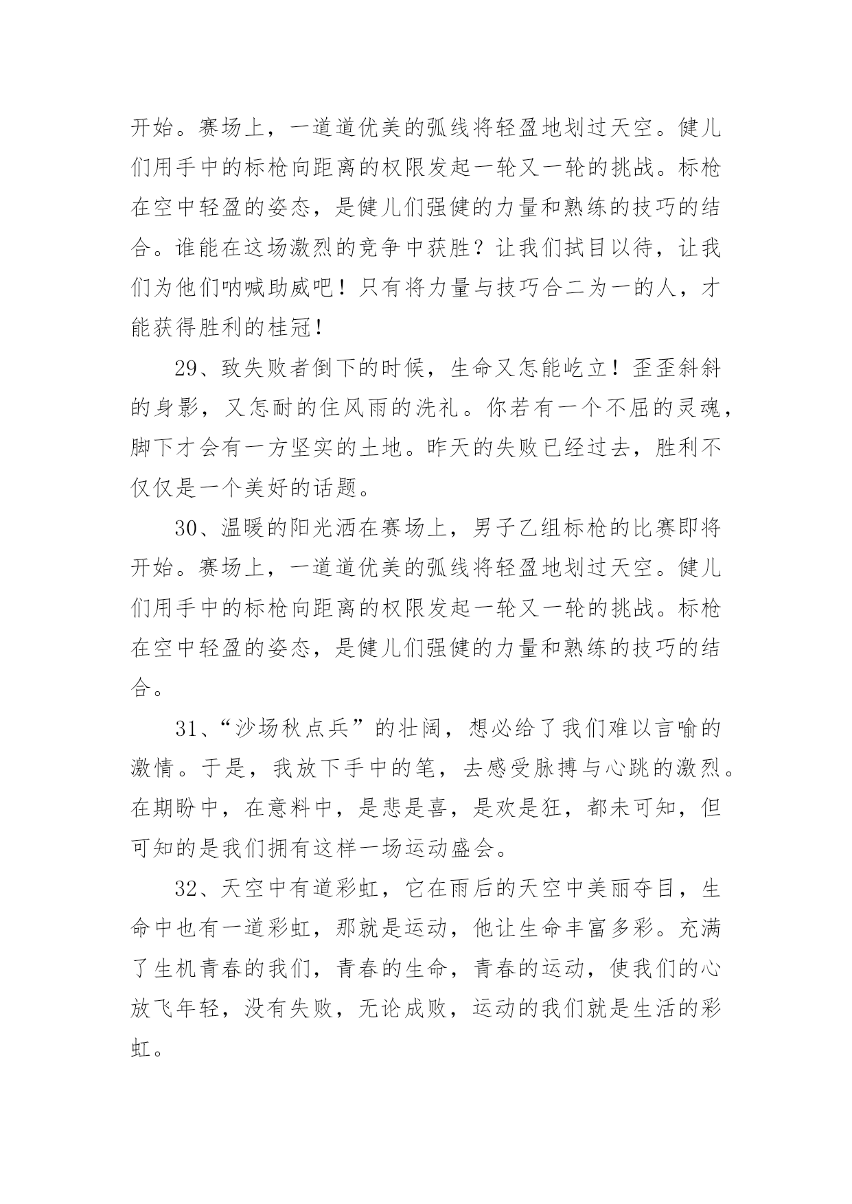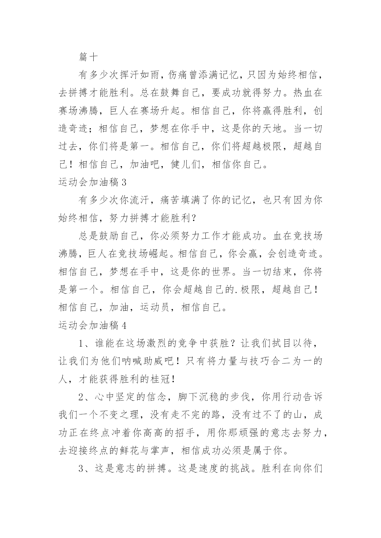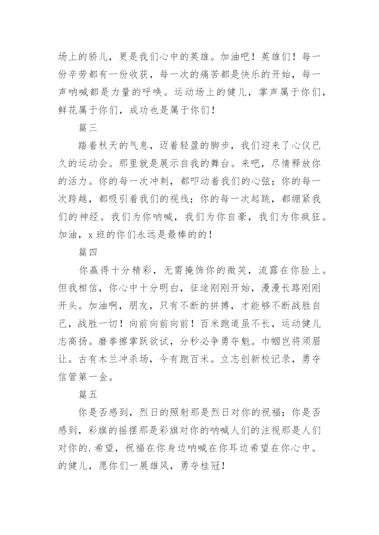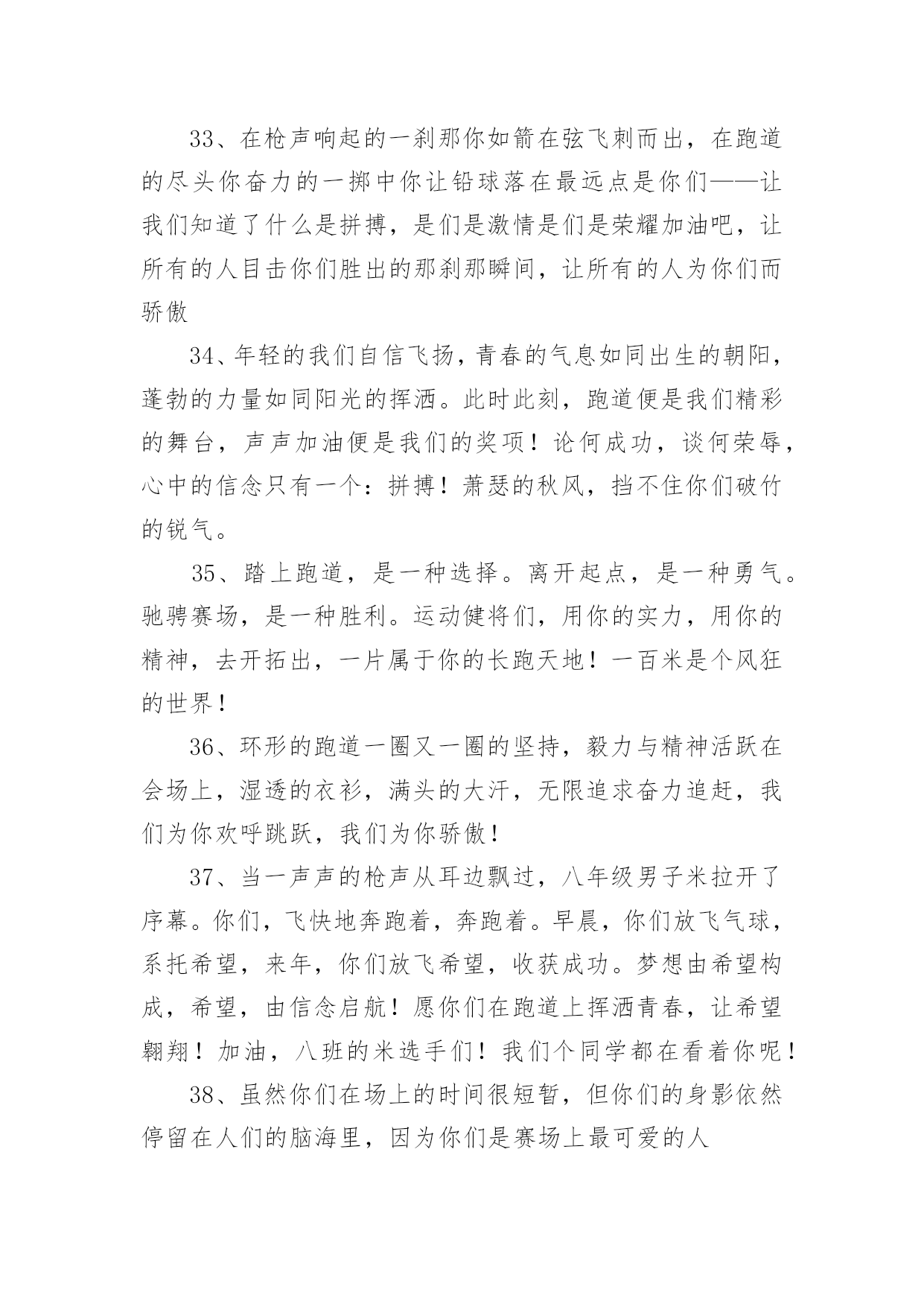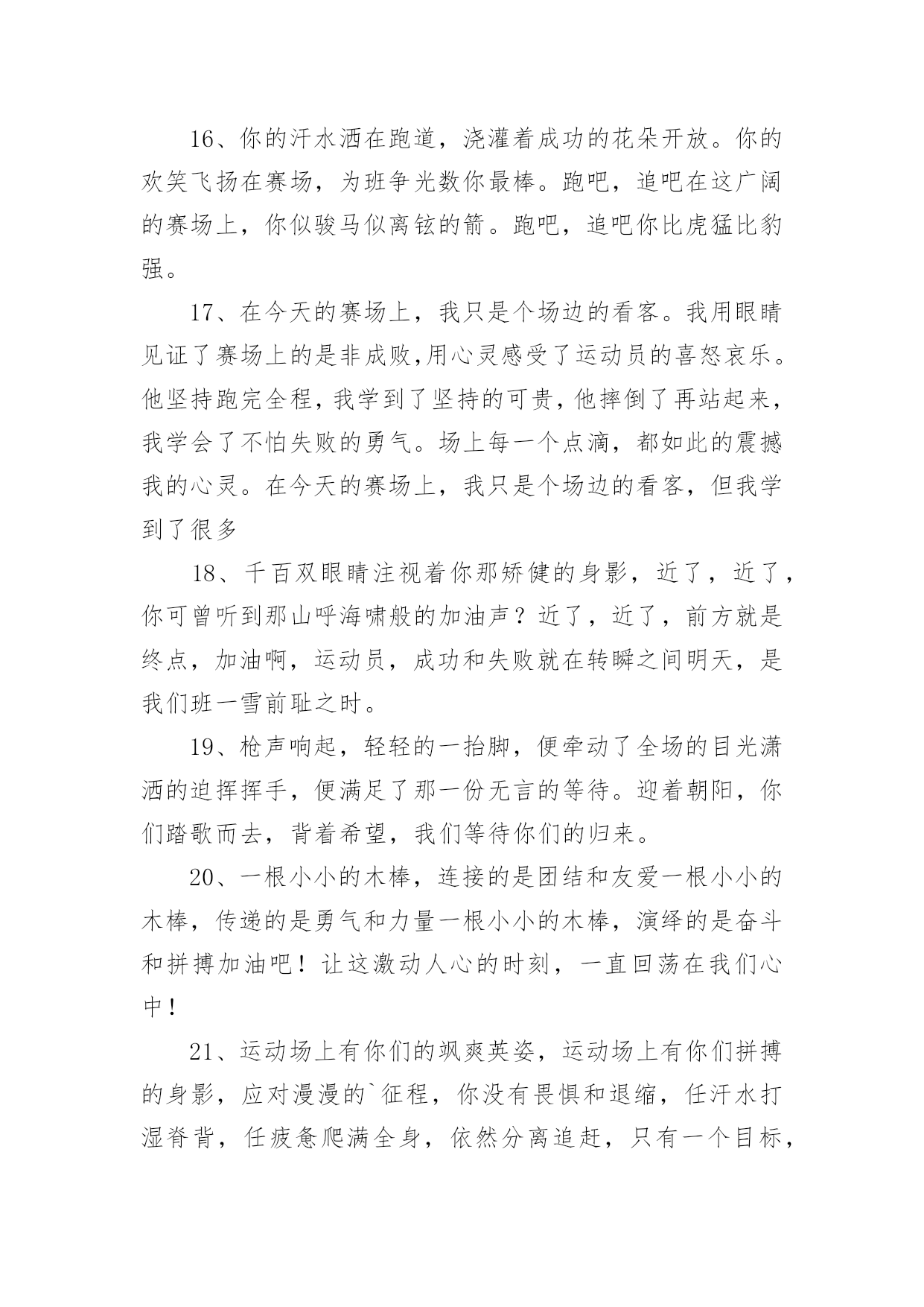 运动会加油稿(必备)运动会加油稿15篇在我们平凡的日常里,我们使用上加油稿的情况与日俱增,借助加油稿可以表达对对方的鼓励和支持。相信写加油稿是一个让许多人都头痛的问题,下面是小编精心整理的运动会加油稿,欢迎阅读,希望大家能够喜欢。运动会加油稿1夏日的操场,竟是如此美丽,美丽的`几乎令人绝望。你蹲在起跑线上,每一块肌肉都固执得顶起,像一尊雕像。慢慢地、慢慢地、你抬起了头,坚毅的目光中透出了贪婪,汗湿的发丝终于飞了起来。冲吧!冲吧!化作勇敢的苍鹰,去寻找心中的太阳。运动会加油稿2篇一超越对手,超越自我,是我们的目标,我们的信念,在清凉的初秋,在喧嚣的田径场上,你们点燃了似火的热情,无论成败,我们都为你们感到自豪,你们永远是我们的骄傲!篇二看!运动场上那一幕幕,无论是哭是笑,是喜是悲,其中都融入了他们的汗水辛劳。他们是真正的矫健者,是运动场上的骄儿,更是我们心中的英雄。加油吧!英雄们!每一份辛劳都有一份收获,每一次的痛苦都是快乐的开始,每一声呐喊都是力量的呼唤。运动场上的健儿,掌声属于你们,鲜花属于你们,成功也是属于你们!篇三踏着秋天的气息,迈着轻盈的脚步,我们迎来了心仪已久的运动会。那里就是展示自我的舞台。来吧,尽情释放你的活力。你的每一次冲刺,都叩动着我们的心弦;你的每一次跨越,都吸引着我们的视线;你的每一次起跳,都绷紧我们的神经。我们为你呐喊,我们为你自豪,我们为你疯狂。加油,x班的你们永远是最棒的的!篇四你赢得十分精彩,无需掩饰你的微笑,流露在你脸上。但我相信,你心中十分明白,征途刚刚开始,漫漫长路刚刚开头。加油啊,朋友,只有不断的拼搏,才能够不断战胜自己,战胜一切!向前向前向前!百米跑道虽不长,运动健儿志高扬。磨拳擦掌跃欲试,分秒必争勇夺魁。巾帼岂将须眉让。古有木兰冲杀场,今有跑百米。立志创新校记录,勇夺信管第一金。篇五你是否感到,烈日的照射那是烈日对你的祝福;你是否感到,彩旗的摇摆那是彩旗对你的呐喊人们的注视那是人们对你的.希望,祝福在你身边呐喊在你耳边希望在你心中。的健儿,愿你们一展雄风,勇夺桂冠!篇六加油吧,运动健儿们!阵阵有力的步伐,声声有劲的呐喊,运动场上洒下我们青春的点点滴滴。旗摇摇,鼓声声,那里挡不助的是青春活力;枪声响起,“预备起跑”,挡不助的是健儿们如火般的气势。英雄舍我其谁,胜利当仁不让,声声誓言浸透着健儿们的昂扬斗志。朋友们,为运动健儿们喝彩,为运动喝彩吧!场上精彩纷呈,空气里的每一个分子浸透着自信。篇七运动健将某某某,用你的实力,用你的精神,去开拓出,一片属于你的长跑天地!踏上跑道,是一种选择。离开起点,是一种勇气。驰骋赛场,是一种胜利。篇八你是运动场的心脏,跳动梦想;你是漫长路的精神,激励辉煌;你们是将上下求索的人!风为你加油,云为你助兴,坚定,执着,耐力与希望,在延伸的白色跑道中点点凝聚!力量,信念,拼搏与奋斗,在遥远的终点线上渐渐明亮!时代的强音正在你的脚下踏响。篇九不为掌声的诠释,不为刻意的征服,只有辛勤的汗水化作追求的脚步。心中坚定的信念,脚下沉稳的步伐,你用行动诉说着一个不变的真理,没有比脚更长的路,没有比人更高的山,终点向你招手,努力吧!用你坚韧不拔的毅志,去迎接终点的鲜花与掌声,相信成功属于你。篇十有多少次挥汗如雨,伤痛曾添满记忆,只因为始终相信,去拼搏才能胜利。总在鼓舞自己,要成功就得努力。热血在赛场沸腾,巨人在赛场升起。相信自己,你将赢得胜利,创造奇迹;相信自己,梦想在你手中,这是你的天地。当一切过去,你们将是第一。相信自己,你们将超越极限,超越自己!相信自己,加油吧,健儿们,相信你自己。运动会加油稿3有多少次你流汗,痛苦填满了你的记忆,也只有因为你始终相信,努力拼搏才能胜利?总是鼓励自己,你必须努力工作才能成功。血在竞技场沸腾,巨人在竞技场崛起。相信自己,你会赢,会创造奇迹。相信自己,梦想在手中,这是你的世界。当一切结束,你将是第一个。相信自己,你会超越自己的.极限,超越自己!相信自己,加油,运动员,相信自己。运动会加油稿41、谁能在这场激烈的竞争中获胜?让我们拭目以待,让我们为他们呐喊助威吧!只有将力量与技巧合二为一的人,才能获得胜利的桂冠!2、心中坚定的信念,脚下沉稳的步伐,你用行动告诉我们一个不变之理,没有走不完的路,没有过不了的山,成功正在终点冲着你高高的招手,用你那顽强的意志去努力,去迎接终点的鲜花与掌声,相信成功必须是属于你。3、这是意志的拼搏。这是速度的挑战。胜利在向你们招手,胜利在向你们呼唤。4、不为鲜花的围绕,不为刹那的荣耀,只有执着的信念,化作不停的奔跑,心中燃烧着梦想,脚下不停的步伐,你用行动述说着过程的重要,没有无尽的终点,没有无法攀登的险峰,希望载着终点在向你微笑,拼搏吧!经历是一种精彩,迸发你全部的能量,成功是你汗水的5、今日的你们英姿飒爽,今日