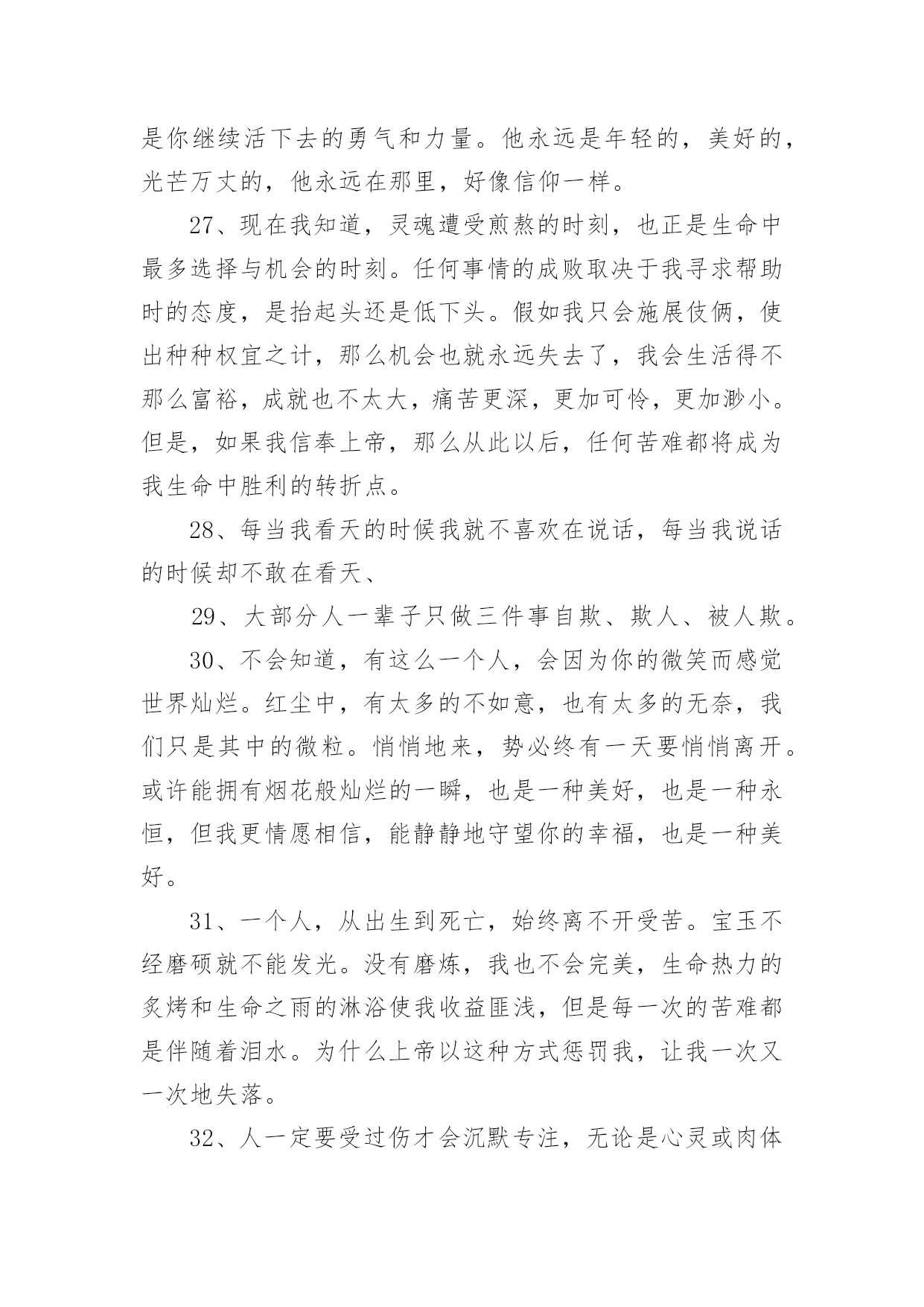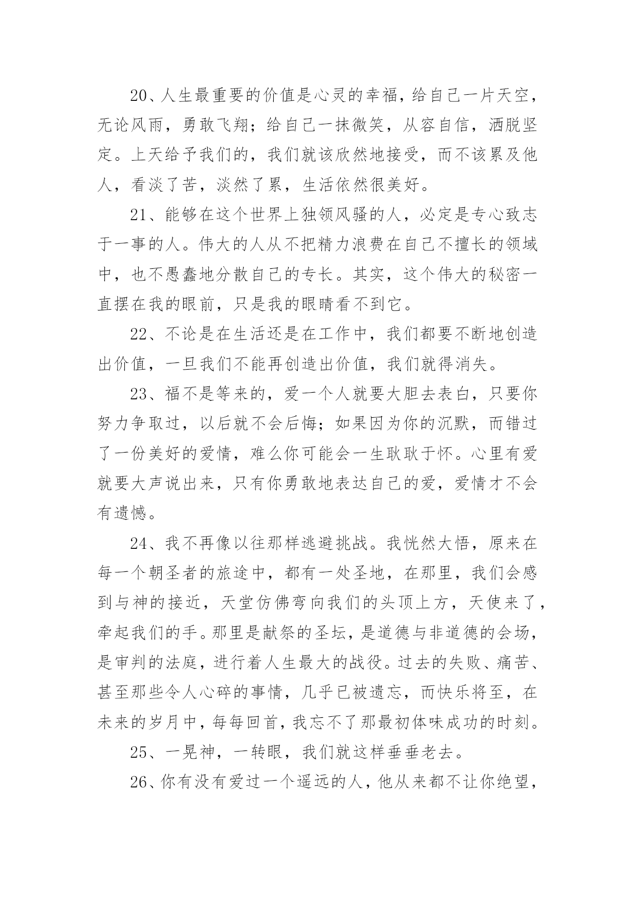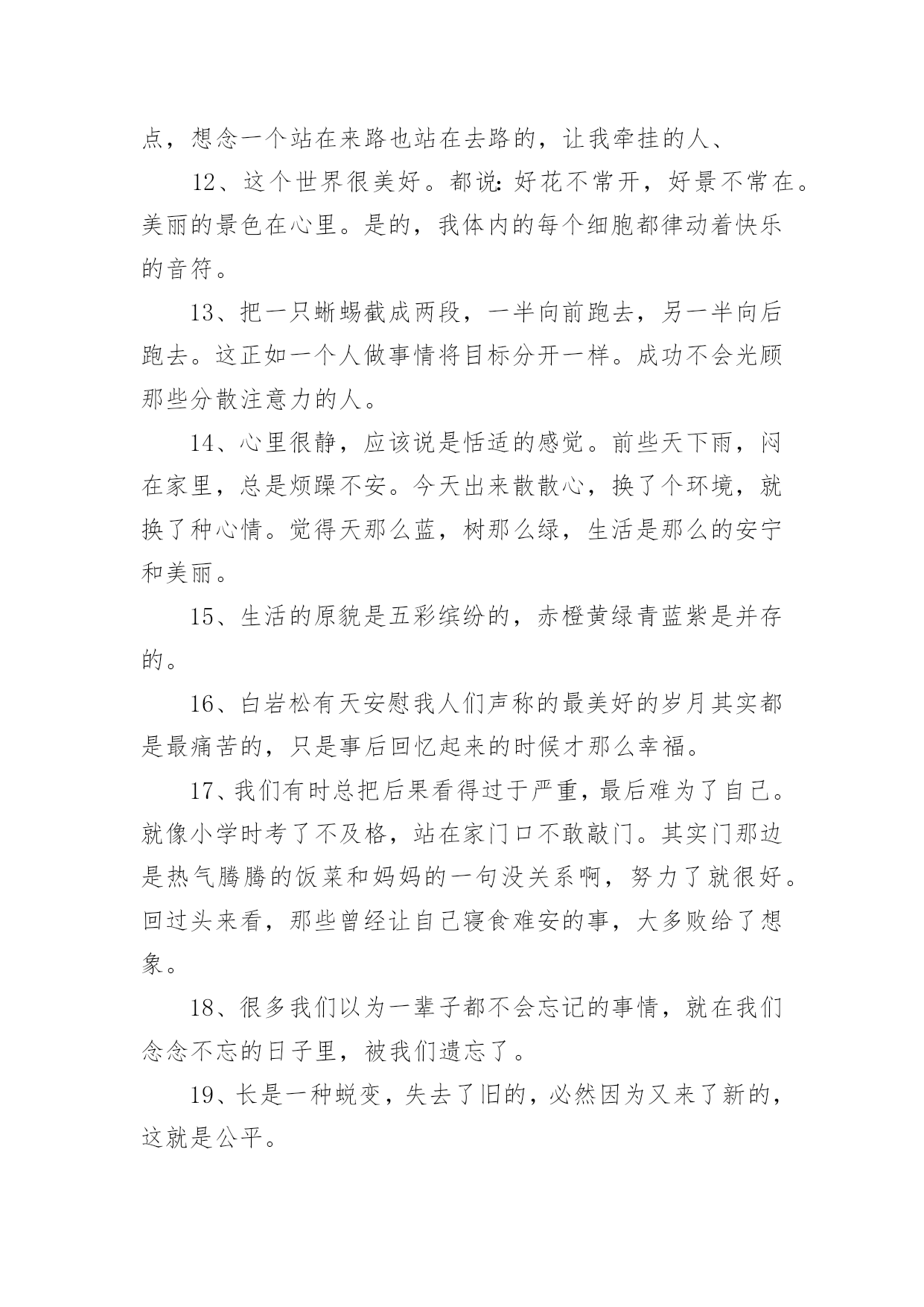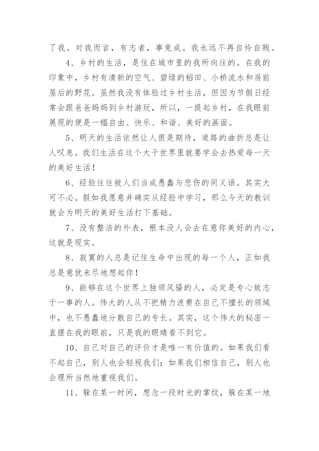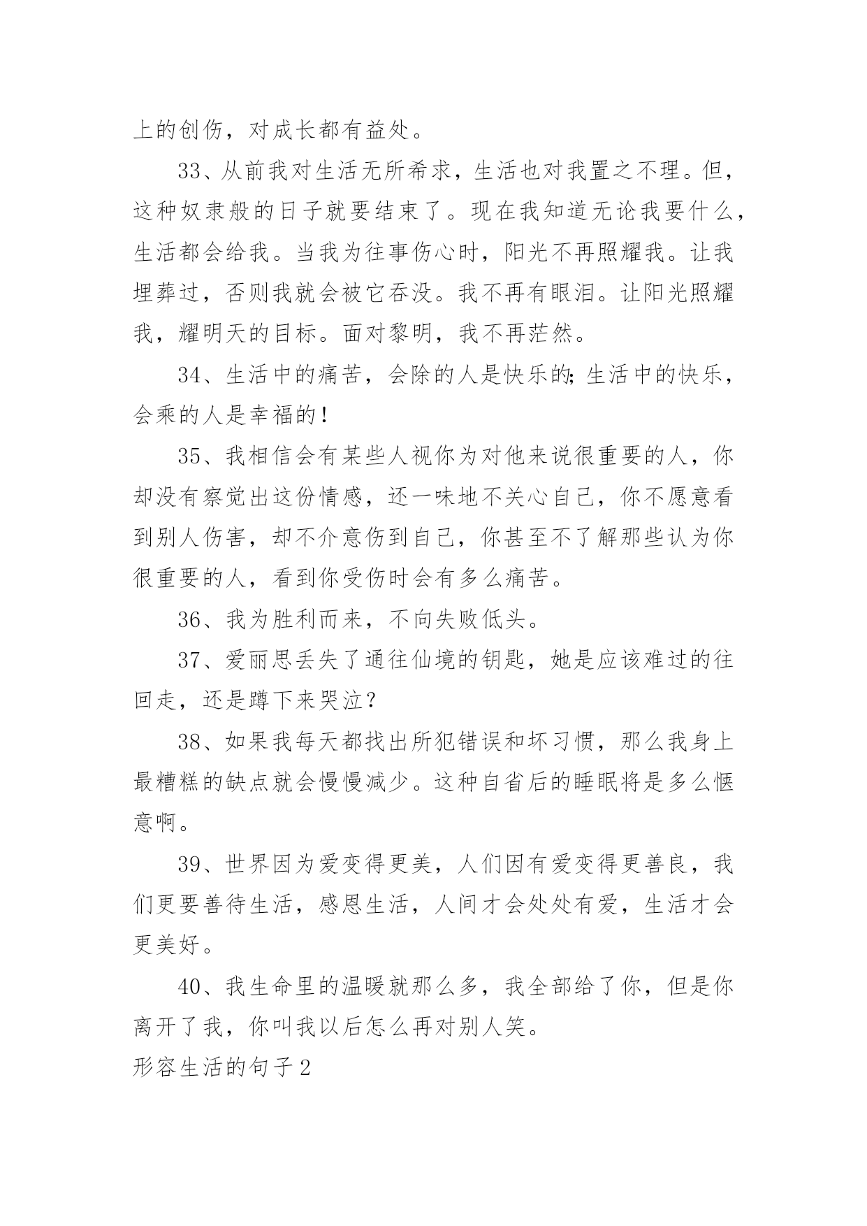 形容生活的句子形容生活的句子在日常的学习、工作、生活中,大家最不陌生的就是句子了吧,句子能表达一个完整的意思,如告诉别人一件事情,提出一个问题,表示要求或者制止,表示某种感慨,表示对一段话的延续或省略。那么什么样的句子才是好的句子呢?下面是小编为大家收集的形容生活的句子,仅供参考,希望能够帮助到大家。形容生活的句子11、爱,在人与人的问候与帮助中。有句话说”赠人玫瑰,手留余香“,有时在对别人进行帮助中,无形地向别人献出了自已的爱心。这个帮助可能是一句话,可能是一笔捐款,可能一个动作。这是一件很简单的事情,献血、捐款、资助贫困与孤寡老人等等。也许你觉得这并没有什么,但对于那个被帮助的人来说,却体会到了你及至整个社会对他的一种关心与爱护,一种特殊的关爱。2、时间就是生命。时光不会倒流,珍惜现在,奋斗未来吧。3、我终于认识到,生命最低落的时候,转机也就要来了。我不再悲痛地追忆过去,过去的不会再来。在这些羊皮卷的启示下,我把握现在,努力向前,去邂逅神奇的未来,没有恐惧,没有疑虑,没有失望。上帝按照自己的形象造就了我。对我而言,有志者,事竟成。我永远不再自怜自贱。4、乡村的生活,是住在城市里的我所向往的。在我的印象中,乡村有清新的空气、碧绿的稻田、小桥流水和房前屋后的野花。虽然我没有体验过乡村生活,但因为节假日经常会跟爸爸妈妈到乡村游玩,所以,一提起乡村,在我眼前展现的便是一幅自由、快乐、和谐、美好的画面。5、明天的生活依然让人很是期待,道路的曲折总是让人叹息。我们生活在这个大千世界里就要学会去热爱每一天的美好生活!6、经验往往被人们当成愚蠢与悲伤的同义语。其实大可不必。假如我愿意井确实从经验中学习,那么今天的教训就会为明天的美好生活打下基础。7、没有整洁的外表,根本没人会去在意你美好的内心,这就是现实。8、寂寞的人总是记住生命中出现的每一个人,正如我总是意犹未尽地想起你!9、能够在这个世界上独领风骚的人,必定是专心致志于一事的人。伟大的人从不把精力浪费在自己不擅长的领域中,也不愚蠢地分散自己的专长。其实,这个伟大的秘密一直摆在我的眼前,只是我的眼睛看不到它。10、自己对自己的评价才是唯一有价值的。如果我们看不起自己,别人也会轻视我们;如果我们相信自己,别人也会理所当然地重视我们。11、躲在某一时间,想念一段时光的掌纹,躲在某一地点,想念一个站在来路也站在去路的,让我牵挂的人、12、这个世界很美好。都说:好花不常开,好景不常在。美丽的景色在心里。是的,我体内的每个细胞都律动着快乐的音符。13、把一只蜥蜴截成两段,一半向前跑去,另一半向后跑去。这正如一个人做事情将目标分开一样。成功不会光顾那些分散注意力的人。14、心里很静,应该说是恬适的感觉。前些天下雨,闷在家里,总是烦躁不安。今天出来散散心,换了个环境,就换了种心情。觉得天那么蓝,树那么绿,生活是那么的安宁和美丽。15、生活的原貌是五彩缤纷的,赤橙黄绿青蓝紫是并存的。16、白岩松有天安慰我人们声称的最美好的岁月其实都是最痛苦的,只是事后回忆起来的时候才那么幸福。17、我们有时总把后果看得过于严重,最后难为了自己。就像小学时考了不及格,站在家门口不敢敲门。其实门那边是热气腾腾的饭菜和妈妈的一句没关系啊,努力了就很好。回过头来看,那些曾经让自己寝食难安的事,大多败给了想象。18、很多我们以为一辈子都不会忘记的事情,就在我们念念不忘的日子里,被我们遗忘了。19、长是一种蜕变,失去了旧的,必然因为又来了新的,这就是公平。20、人生最重要的价值是心灵的幸福,给自己一片天空,无论风雨,勇敢飞翔;给自己一抹微笑,从容自信,洒脱坚定。上天给予我们的,我们就该欣然地接受,而不该累及他人,看淡了苦,淡然了累,生活依然很美好。21、能够在这个世界上独领风骚的人,必定是专心致志于一事的人。伟大的人从不把精力浪费在自己不擅长的领域中,也不愚蠢地分散自己的专长。其实,这个伟大的秘密一直摆在我的眼前,只是我的眼睛看不到它。22、不论是在生活还是在工作中,我们都要不断地创造出价值,一旦我们不能再创造出价值,我们就得消失。23、福不是等来的,爱一个人就要大胆去表白,只要你努力争取过,以后就不会后悔;如果因为你的沉默,而错过了一份美好的爱情,难么你可能会一生耿耿于怀。心里有爱就要大声说出来,只有你勇敢地表达自己的爱,爱情才不会有遗憾。24、我不再像以往那样逃避挑战。我恍然大悟,原来在每一个朝圣者的旅途中,都有一处圣地,在那里,我们会感到与神的接近,天堂仿佛弯向我们的头顶上方,天使来了,牵起我们的手。那里是献祭的圣坛,是道德与非道德的会场,是审判的法庭,进行着人生最大的战役。过去的失败、痛苦、甚至那些令人心碎的事情,几乎已被遗忘,而快乐将至,在未来的岁月中,每每回首,我忘不了那最初体味成功的时刻。25、一晃神,一转眼,