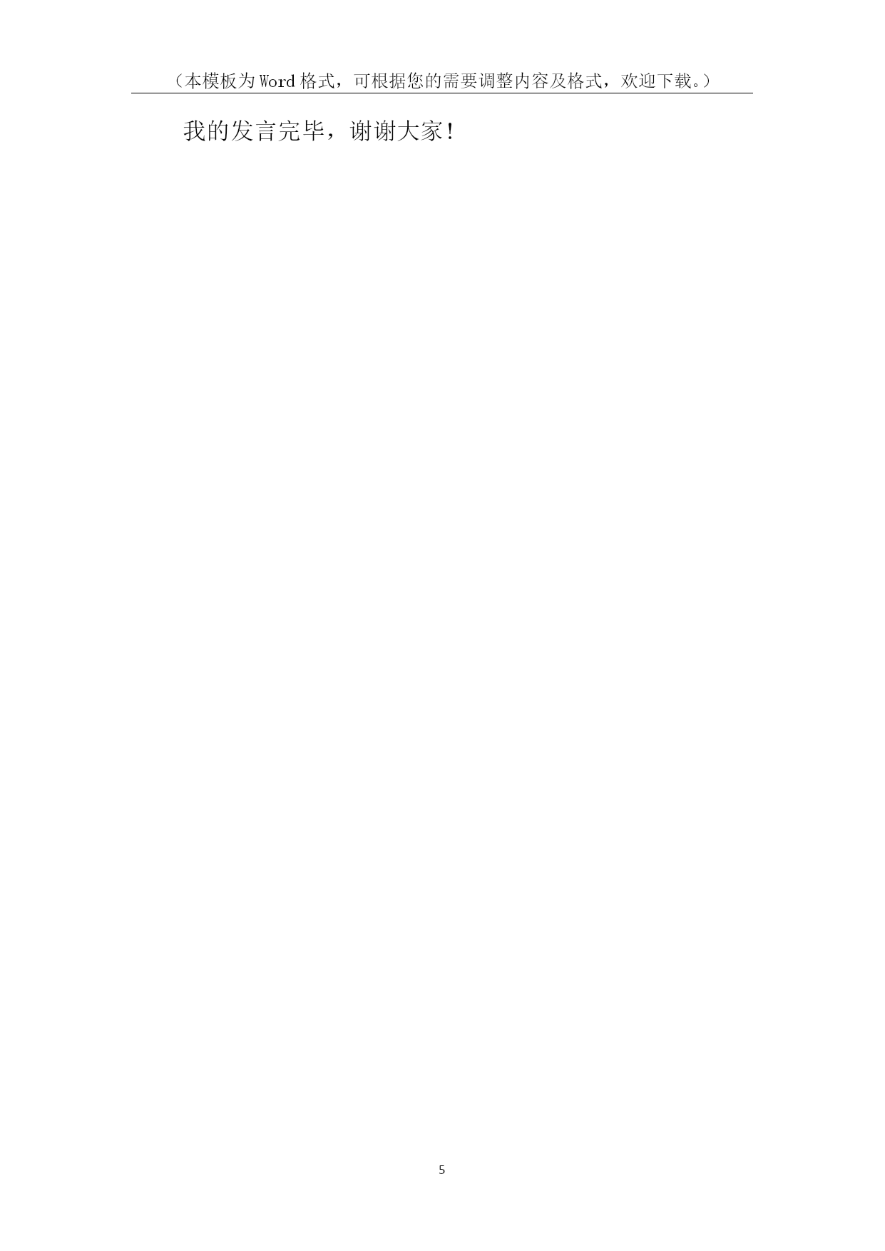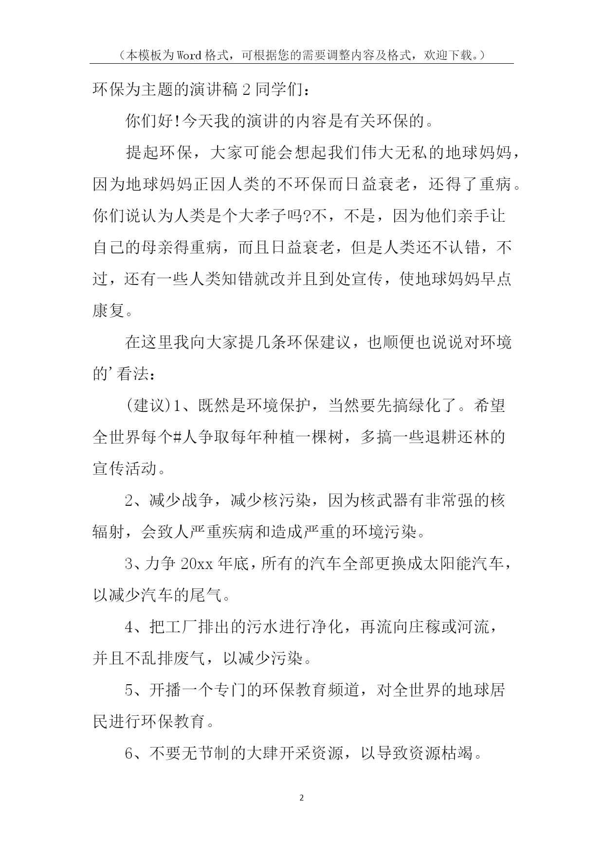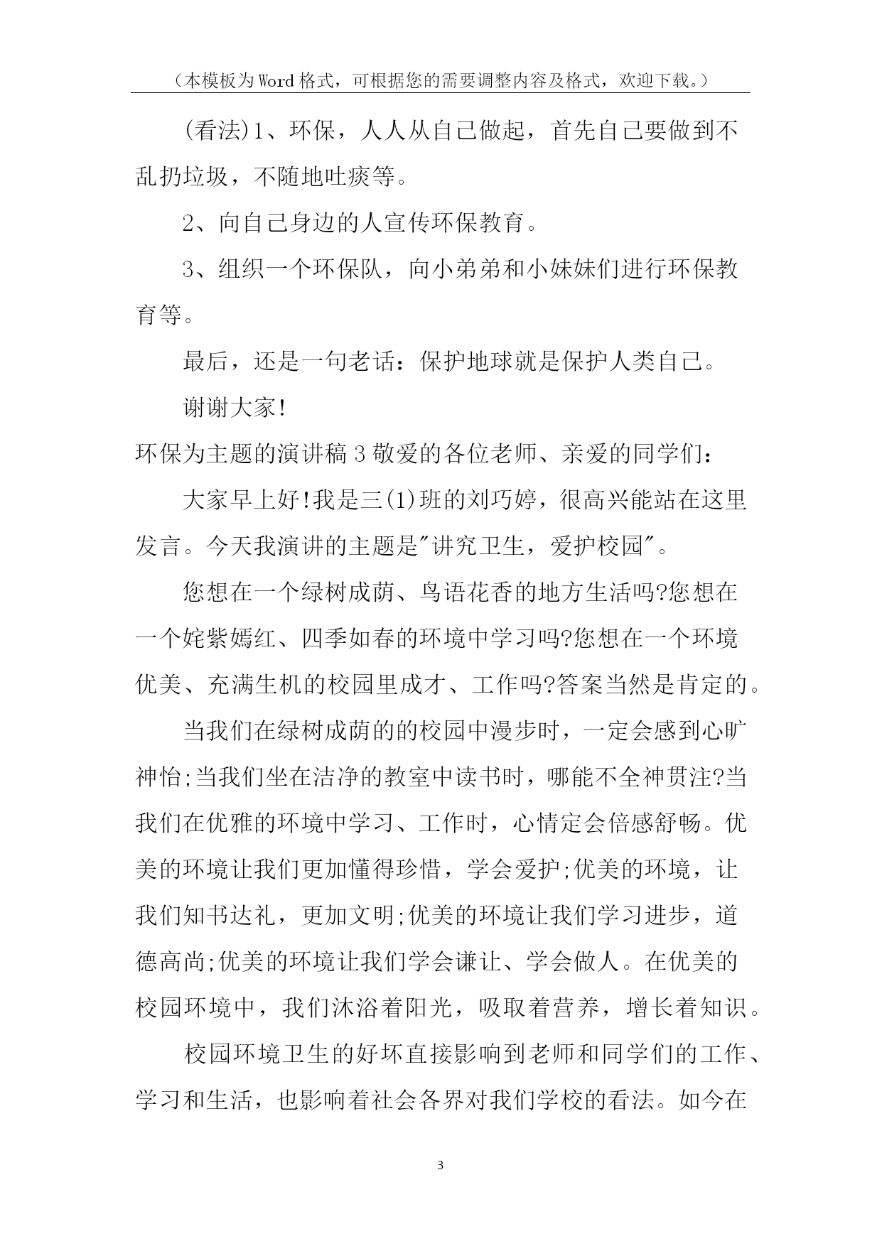 (本模板为Word格式,可根据您的需要调整内容及格式,欢迎下载。)PAGE\*MERGEFORMAT5环保为主题的演讲稿环保为主题的演讲稿1同学们:你们一定都看过这样一则公益广告:电视画面上有一个水龙头,正在艰难的往外滴着水,滴水的速度越来越慢,最后水就枯竭了。然后画面上出现了一双眼睛,从眼中流出了一滴泪水。随之出现的是这样一句话:"如果人类不珍惜水,那么我们能看到的最后一滴水将是我们自己的眼泪。"全世界的水百分之九十三是咸水,不能喝。淡水只占有百分之七,而能喝的水只有百分之零点八。全世界五十亿人口,就靠饮用这只占百分之零点八的淡水,水多可贵呀!但随着工业的发展,水污染也成了一个严重的问题。人可以几天不吃饭,但几天不喝水却不行。对于节约用水,同学们总觉得并不那么重要,水声哗哗,一点也不心疼。同学们,你们知道水有多少用处吗?请看一笔帐:一吨水大约可供炼钢150千克,发电每小时一千度,生产化肥500千克,织布220米,磨面粉34袋。"滴水成河",如果人人节约用水,积累起来,就可以派上很多的用处啊!同学们,我们是国家的小主人,从小就要养成节约用水的好习惯。我们要以实际行动做一个节约用水的好孩子。环保为主题的演讲稿2同学们:你们好!今天我的演讲的内容是有关环保的。提起环保,大家可能会想起我们伟大无私的地球妈妈,因为地球妈妈正因人类的不环保而日益衰老,还得了重病。你们说认为人类是个大孝子吗?不,不是,因为他们亲手让自己的母亲得重病,而且日益衰老,但是人类还不认错,不过,还有一些人类知错就改并且到处宣传,使地球妈妈早点康复。在这里我向大家提几条环保建议,也顺便也说说对环境的'看法:(建议)1、既然是环境保护,当然要先搞绿化了。希望全世界每个#人争取每年种植一棵树,多搞一些退耕还林的宣传活动。2、减少战争,减少核污染,因为核武器有非常强的核辐射,会致人严重疾病和造成严重的环境污染。3、力争20xx年底,所有的汽车全部更换成太阳能汽车,以减少汽车的尾气。4、把工厂排出的污水进行净化,再流向庄稼或河流,并且不乱排废气,以减少污染。5、开播一个专门的环保教育频道,对全世界的地球居民进行环保教育。6、不要无节制的大肆开采资源,以导致资源枯竭。(看法)1、环保,人人从自己做起,首先自己要做到不乱扔垃圾,不随地吐痰等。2、向自己身边的人宣传环保教育。3、组织一个环保队,向小弟弟和小妹妹们进行环保教育等。最后,还是一句老话:保护地球就是保护人类自己。谢谢大家!环保为主题的演讲稿3敬爱的各位老师、亲爱的同学们:大家早上好!我是三(1)班的刘巧婷,很高兴能站在这里发言。今天我演讲的主题是"讲究卫生,爱护校园"。您想在一个绿树成荫、鸟语花香的地方生活吗?您想在一个姹紫嫣红、四季如春的环境中学习吗?您想在一个环境优美、充满生机的校园里成才、工作吗?答案当然是肯定的。当我们在绿树成荫的的校园中漫步时,一定会感到心旷神怡;当我们坐在洁净的教室中读书时,哪能不全神贯注?当我们在优雅的环境中学习、工作时,心情定会倍感舒畅。优美的环境让我们更加懂得珍惜,学会爱护;优美的环境,让我们知书达礼,更加文明;优美的环境让我们学习进步,道德高尚;优美的环境让我们学会谦让、学会做人。在优美的校园环境中,我们沐浴着阳光,吸取着营养,增长着知识。校园环境卫生的好坏直接影响到老师和同学们的工作、学习和生活,也影响着社会各界对我们学校的看法。如今在我们的校园里,还有散落着同学们随意乱扔的瓜子壳、果皮、纸屑、塑料瓶、零食袋等。每当风一吹起,这些垃圾就在我们的校园里"翩翩起舞",所有这一切,都跟我们的文明校园极不相称。"学校是我家,清洁靠大家",我相信,没有哪一位老师、同学希望在一个垃圾遍地,尘土飞扬的环境中学习、生活、工作。爱美、审美、创造美是我们人类的天赋。老师们,同学们,为了营造校园良好的学习、生活与工作环境,所以,我代表三(1)班全体同学面向全体老师和同学发出如下倡议:1.请不要乱扔垃圾,并提醒乱扔垃圾的人。2.以爱护校园环境为己任,自觉维护校园的清洁卫生。3.看到地上有纸屑、塑料袋等杂物,主动捡起来,及时顺手清理到垃圾桶内;树立人过地洁之风尚,做一个文明的人。4.不再把食物带进教室内,同时主动清理抽屉里的垃圾;做一个讲卫生的人。5.养成勤俭节约的美德,减少浪费,就是减少垃圾;做一个节约的人。为创建文明和谐的校园,让我们每位同学立即行动起来吧!自觉增强保护校园环境的意识,做保护校园环境卫生的"绿色卫士",做文明的小学生!为了学习、生活在一个优美的校园环境中,让我们全校师生共同努力吧!我的发言完毕,谢谢大家!