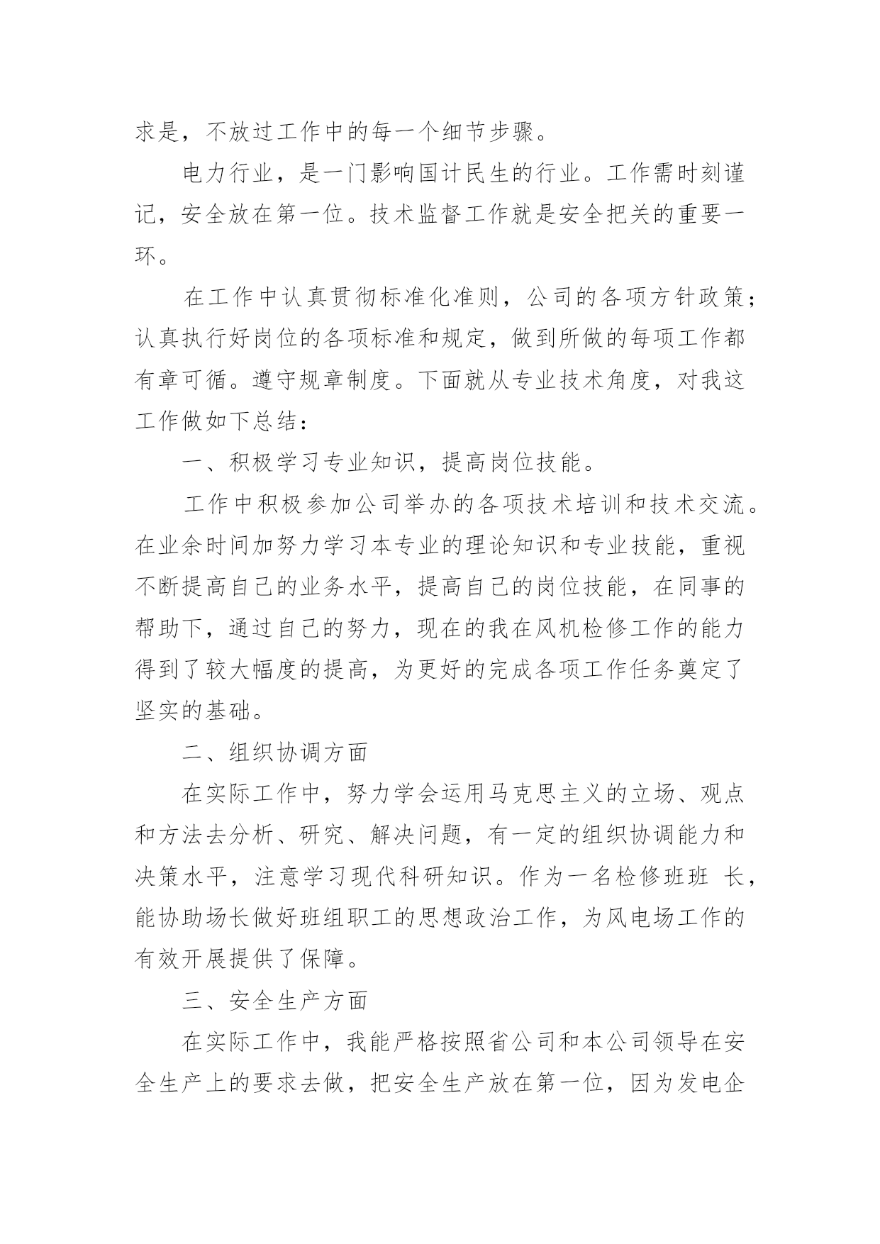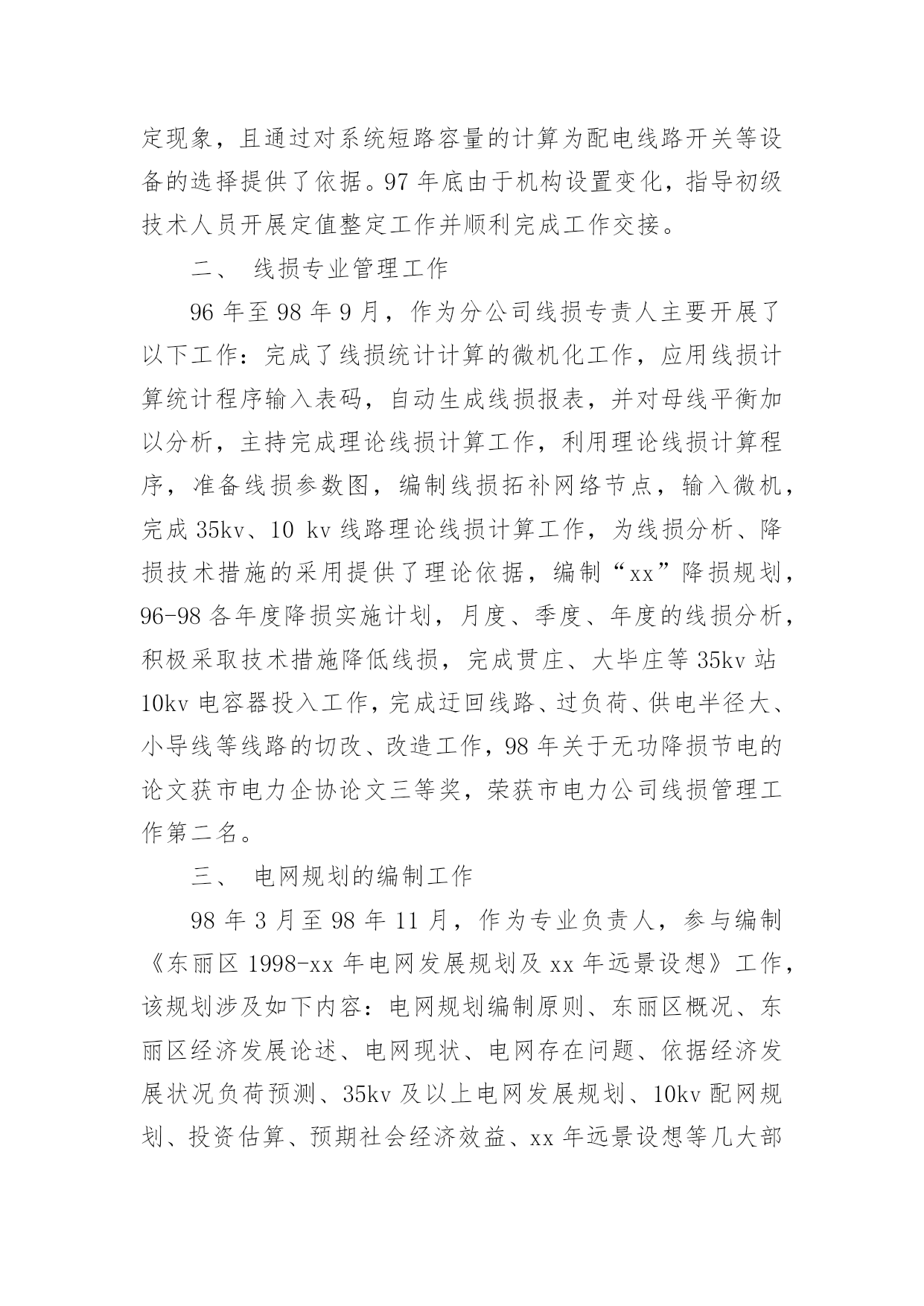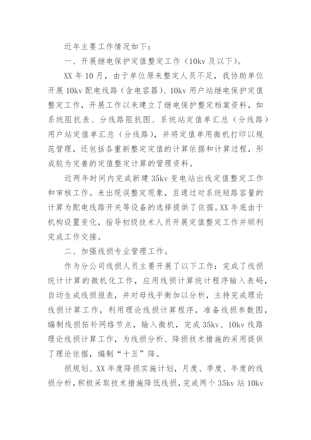 电力专业技术个人工作总结电力专业技术个人工作总结(15篇)总结是事后对某一阶段的学习或工作情况作加以回顾检查并分析评价的书面材料,它能帮我们理顺知识结构,突出重点,突破难点,不如立即行动起来写一份总结吧。总结一般是怎么写的呢?下面是小编帮大家整理的电力专业技术个人工作总结,欢迎阅读,希望大家能够喜欢。电力专业技术个人工作总结1在实际工作中,我能严格按照省公司和本公司领导在安全生产上的要求去做,把安全生产放在第一位,因为发电企业安全是最主要的,在公司举行的培训与考试中都能较好的完成,认真履行工作职责,严格执行相关安全规定,在14年的工作中,从未出现过安全事故,为分公司的安全生产做出了自己的贡献。本人于20xx年6月毕业于东北电力大学计算机与应用专业。20xx年8月进入大唐吉林风力发电股份有限公司工作,就职于运行班组。从20xx年10月至现在,就职于检修班组。参加工作以来,遵守公司的各项规章制度,积极服从领导的工作安排,圆满完成工作任务。维护集体荣誉,思想上要求进步,积极响应号召,认真贯彻执行文件及会议精神。工作积极努力,任劳任怨,认真学习相关业务知识,不断充实完善自己,做到思想行动统一。做到工作认真严谨、实事求是,不放过工作中的每一个细节步骤。电力行业,是一门影响国计民生的行业。工作需时刻谨记,安全放在第一位。技术监督工作就是安全把关的重要一环。在工作中认真贯彻标准化准则,公司的各项方针政策;认真执行好岗位的各项标准和规定,做到所做的每项工作都有章可循。遵守规章制度。下面就从专业技术角度,对我这工作做如下总结:一、积极学习专业知识,提高岗位技能。工作中积极参加公司举办的各项技术培训和技术交流。在业余时间加努力学习本专业的理论知识和专业技能,重视不断提高自己的业务水平,提高自己的岗位技能,在同事的帮助下,通过自己的努力,现在的我在风机检修工作的能力得到了较大幅度的提高,为更好的完成各项工作任务奠定了坚实的基础。二、组织协调方面在实际工作中,努力学会运用马克思主义的立场、观点和方法去分析、研究、解决问题,有一定的组织协调能力和决策水平,注意学习现代科研知识。作为一名检修班班长,能协助场长做好班组职工的思想政治工作,为风电场工作的有效开展提供了保障。三、安全生产方面在实际工作中,我能严格按照省公司和本公司领导在安全生产上的要求去做,把安全生产放在第一位,因为发电企业安全是最主要的,在公司举行的培训与考试中都能较好的完成,认真履行工作职责,严格执行相关安全规定,在14年的工作中,从未出现过安全事故,为分公司的安全生产做出了自己的贡献。四、存在的问题在工作期间,觉得自己的专业知识还是不够扎实,开拓创新不够,在学习上投入不够,管理的决策能力和水平有待提高,重大成果较少等.在今后的工作中,我一定更加努力学习,运用所学知识,不断改进工作方法,提高工作效率,踏踏实实,任劳任怨,勤奋工作,成为一名合格的发电企业专业技术人员。电力专业技术个人工作总结2本人95年7月毕业于*****,所学专业为电力系统及自动化。后分配至文秘部落,96年8月取得助理工程师资格。几年来在身边师傅同事及领导的帮助下做了一些专业技术工作,请看下文电力专业技术个人年终工作总结。一、继电保护定值整定工作(10kv及以下)96年9月至97年担负分公司10kv配电线路(含电容器)、10kv用户站继电保护定值整定工作,由于分公司原来没有整定人员,但自从开展工作以来建立了继电保护整定档案资料,如系统阻抗表、分线路阻抗图、系统站定值单汇总(分线路)用户站定值单汇总(分线路),并将定值单用微机打印以规范管理,还包括各重新整定定值的计算依据和计算过程,形成较为完善的定值整定计算的管理资料。未出现误整定现象,且通过对系统短路容量的计算为配电线路开关等设备的选择提供了依据。97年底由于机构设置变化,指导初级技术人员开展定值整定工作并顺利完成工作交接。二、线损专业管理工作96年至98年9月,作为分公司线损专责人主要开展了以下工作:完成了线损统计计算的微机化工作,应用线损计算统计程序输入表码,自动生成线损报表,并对母线平衡加以分析,主持完成理论线损计算工作,利用理论线损计算程序,准备线损参数图,编制线损拓补网络节点,输入微机,完成35kv、10kv线路理论线损计算工作,为线损分析、降损技术措施的采用提供了理论依据,编制“xx”降损规划,96-98各年度降损实施计划,月度、季度、年度的线损分析,积极采取技术措施降低线损,完成贯庄、大毕庄等35kv站10kv电容器投入工作,完成迂回线路、过负荷、供电半径大、小导线等线路的切改、改造工作,98年关于无功降损节电的论文获市电力企协论文三等奖,荣获市电力公司线损管理工作第二名。三、电网规划的编制工作98年3月至98年11月,作为专业负责人,参与编制《东丽区1