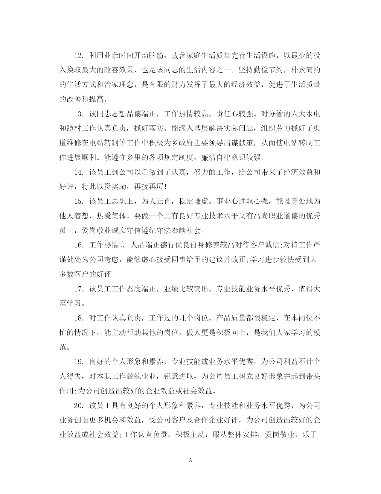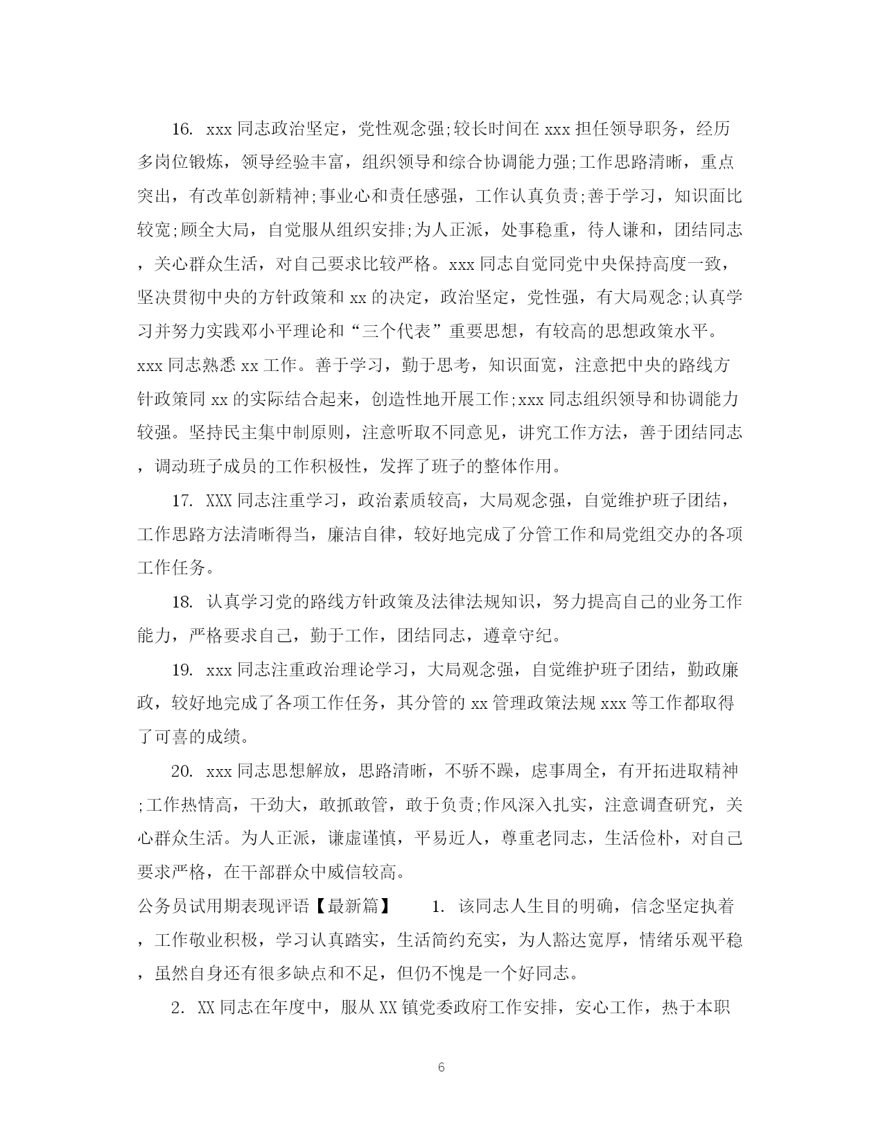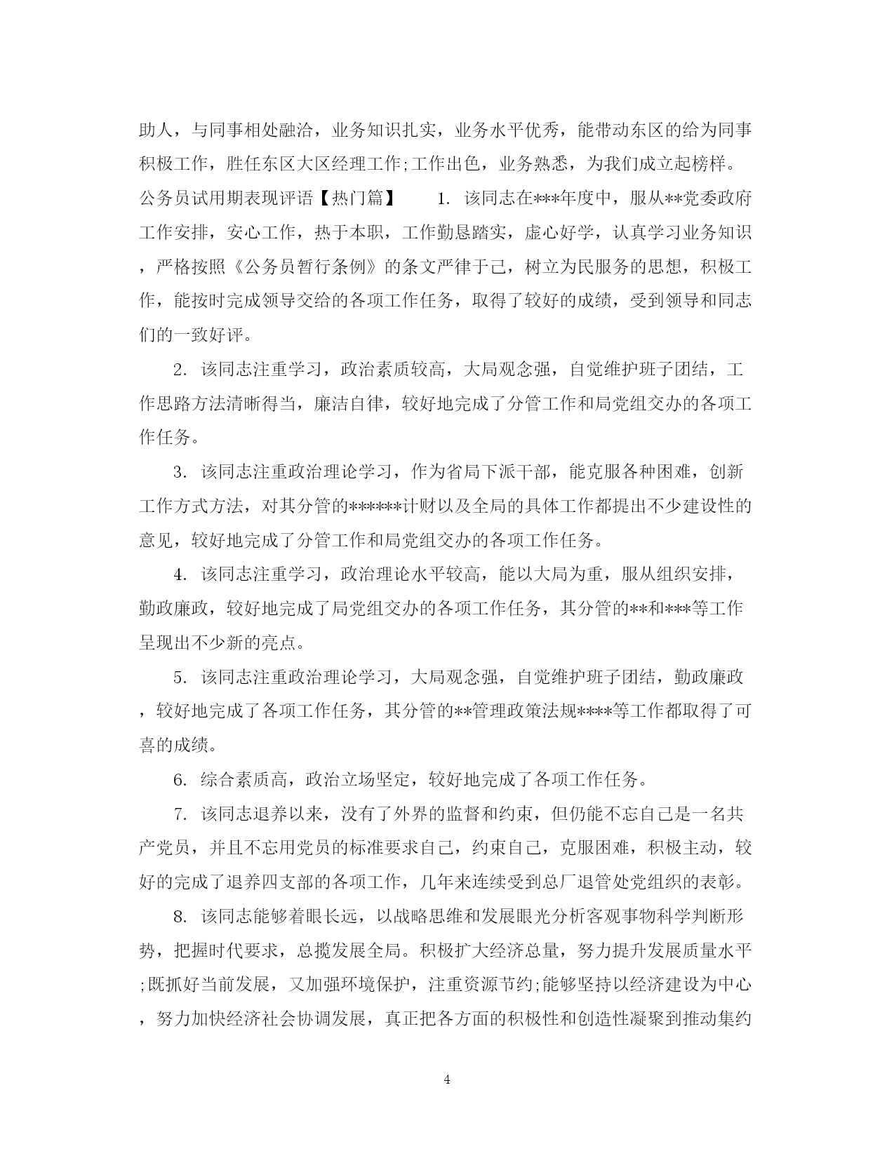 此资料由网络收集而来,如有侵权请告知上传者立即删除。资料共分享,我们负责传递知识。PAGEPAGE8公务员试用期表现评语公务员考核是正确评价公务员德才表现和工作实绩,促进勤政廉政,提高工作效能,建设高素质公务员队伍的重要方法。你想知道公务员试用期表现评语怎么写吗?接下来就一起分享范文网小编为大家整理的公务员试用期表现评语吧!公务员试用期表现评语【优秀篇】1.认真学习党的路方政策及法律法规知识,努力提高自己的业务工作能力,严格要求自己,勤于工作,团结同志,遵章守纪。2.抓好共青团工作。以党建带动团建,促进农村基层团组织建设,做好团员推优入党工作,组织镇属部门进进学校宣传法律法反毒反xx知识,六一节慰问品学兼优的贫困小学生。3.在投递刊物的工作中,诚信敬业,主动热情的为雇主负责,为用户服务,精心细致,科学筹划,从而保证每期刊物都能及时准确的送达到用户的手中,由于讲究信誉,认真踏实,严格履行协议,受到了雇主和用户的信任尊重和好评。4.综合素质高,政治立场坚定,统筹能力强,能驾驭全局,切实履行了公共卫生职责。工作思路清晰,开拓创新精神强,争取国债项目资金大。能团结班子成员共同奋斗,善于调动副职的工作积极性。讲实话,干实事,求实效,踏实工作,较出色地完成了各项工作任务,连续多年实现了全县卫生工作新变化。作风民-主,讲究方法。办事稳妥,生活朴实,关心体贴下属。为人谦虚坦诚,胸怀宽广,谦洁正派,不计较个人得失。5.政治坚定,思想稳定,能够忠实履行岗位职责,工作积极肯干,肯下功夫钻研业务,运用“多数人管少数人”的自律机制,开辟了新时期农村计生管理目标实现的新途径,效果明显,母婴安康保险走在全市前列。具有较强的组织协调和工作能力,对分管工作尽职尽责,能吃苦,经常深入基层检查指导工作,正确处理了工作和家庭关系。遵纪守法,尊敬领导,团结同志,为人正直,作风正派,清正廉洁,不计较个人得失。不足:创新意识要进一步加强。6.能认真履行岗位职责,服从组织安排,积极支持配合一把手做好招商引资和纪检监察工作。在开展招商引次工作中能吃苦耐劳,任劳任怨,主动到沿海等地开展招商活动,积极邀请客商来县考察。认真做好引资企业的服务工作,帮助外资企业解决一些实际问题在招商引资上取得了成效。为人正直,待人热情,作风正派,廉洁自律。希望做好招商引资工作的跟踪问效服务。7.作风严谨,从各方面严格要求自己。生活上不骄不躁,作风严谨,遵章守纪,廉洁自律,不侵占公家一分一厘,不行贿受贿。为人谦虚谨慎,善于听取他人意见,博采众长,不断完善自己。严以律己,宽以待人,尊重领导,团结同志。8.政治素养高。该同志担任办公室副主任之后,作为班子成员,准确定位讲团结,干好本职重大局,没有放松政治学习,相反以更高的标准严格要求自己,主动学习刻苦积累,具备了担任现职的必备的政治素养。9.该同志人生目的明确,信念坚定执着,工作敬业积极,学习认真踏实,生活简约充实,为人豁达宽厚,情绪乐观平稳,虽然自身还有很多缺点和不足,但仍不愧是一个好同志。10.业务能力强。该同志分管调研工作,能够大胆管理不断创新,有效组织文秘人员围绕县委中心工作开展调研,具备了担任现职所需驾驭文字的能力。该同志联系党建工业经济政法群团工作,在服务部门上,定位准,从不吃拿卡要,坚持了低调做人热心做事的原则,基本上做到了零差错,具备了担任现职所需的综合协调服务能力。11.该同志政治坚定,思想稳定,能够忠实履行岗位职责,工作积极肯干,肯下功夫钻研业务,运用“多数人管少数人”的自律机制,开辟了新时期农村计生管理目标实现的新途径,效果明显,母婴安康保险走在全市前列。具有较强的组织协调和工作能力,对分管工作尽职尽责,能吃苦,经常深入基层检查指导工作,正确处理了工作和家庭关系。遵纪守法,尊敬领导,团结同志,为人正直,作风正派,清正廉洁,不计较个人得失。不足:创新意识要进一步加强。12.利用业余时间开动脑筋,改善家庭生活质量完善生活设施,以最少的投入换取最大的改善效果,也是该同志的生活内容之一。坚持勤俭节约,朴素简约的生活方式和治家理念,是有限的财力发挥了最大的经济效益,促进了生活质量的改善和提高。13.该同志思想品德端正,工作热情较高,责任心较强。对分管的人大水电和蹲村工作认真负责,抓好落实。能深入基层解决实际问题,组织劳力抓好了渠道维修在电站转制等工作中积极为乡政府主要领导出谋献策,从而使电站转制工作进展顺利。能遵守乡里的各项规定制度,廉洁自律意识较强。14.该员工到公司以后做到了认真,努力的工作,给公司带来了经济效益和好评,特此以资奖励,再接再厉!15.该员工思想上,为人正直,稳定谦虚。事业心进取心强,能设身处地为他人着想,热爱集体。要做一个具有良好专业技术水平又有高尚职业道德的优秀员工,爱