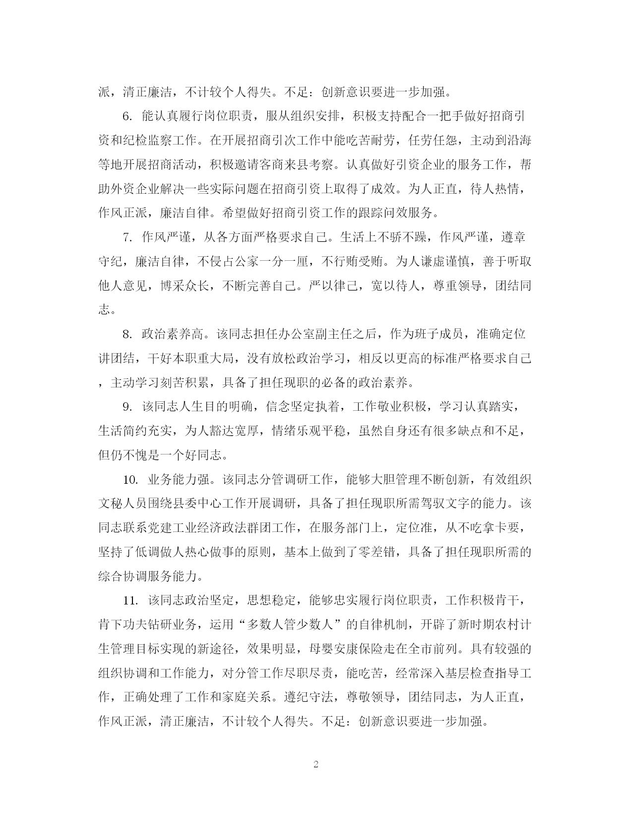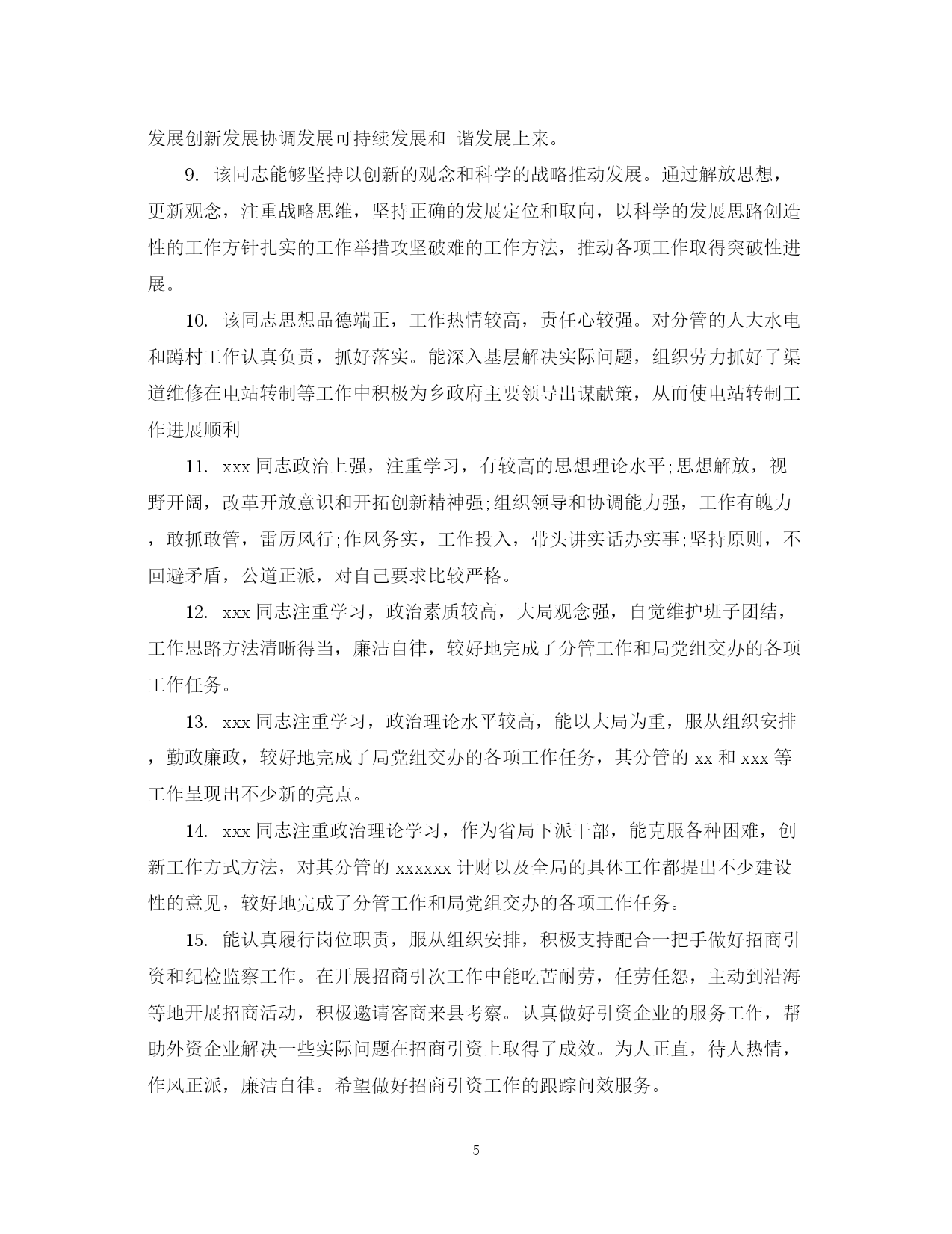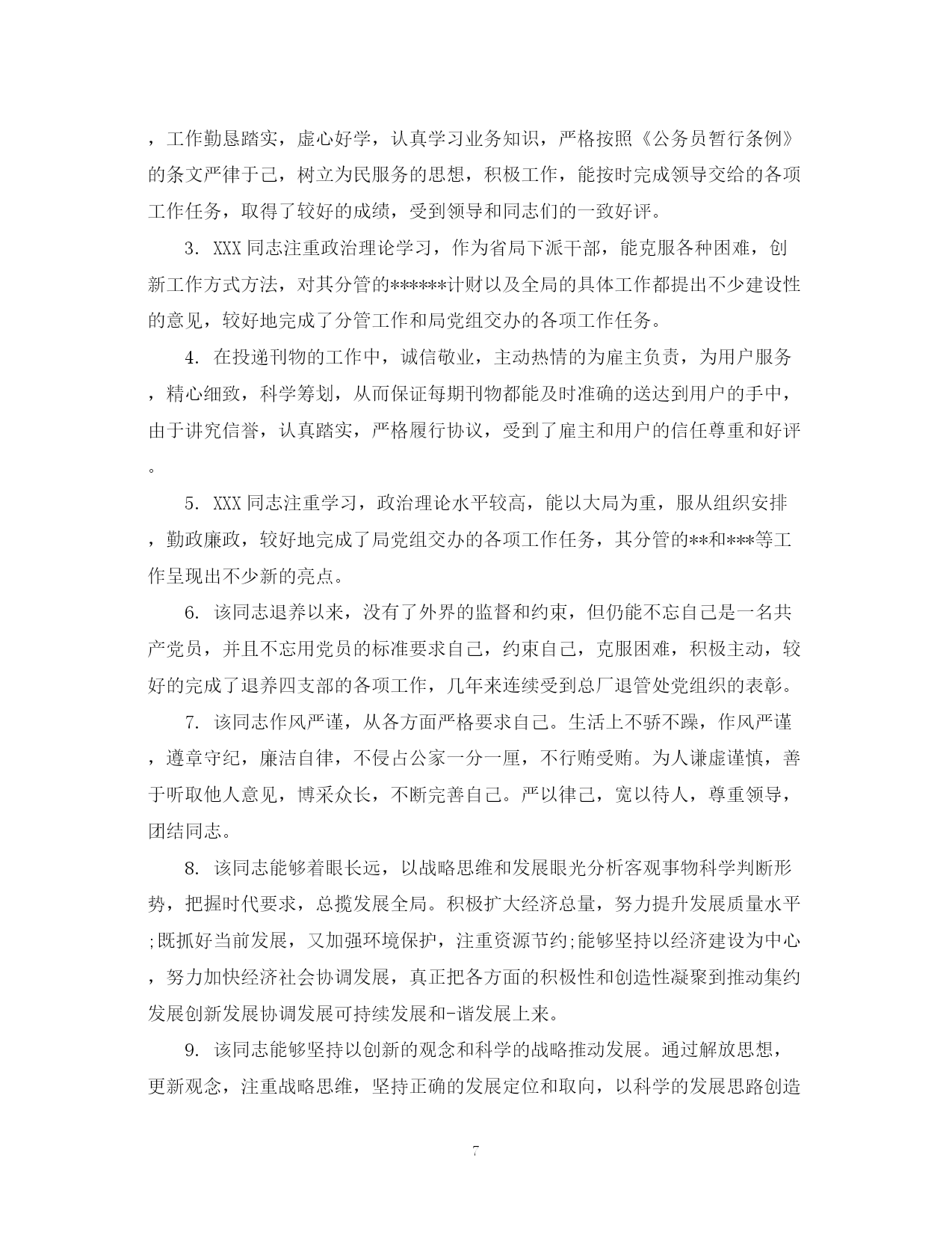 此资料由网络收集而来,如有侵权请告知上传者立即删除。资料共分享,我们负责传递知识。PAGEPAGE8公务员试用期表现评语公务员考核是正确评价公务员德才表现和工作实绩,促进勤政廉政,提高工作效能,建设高素质公务员队伍的重要方法。你想知道公务员试用期表现评语怎么写吗?接下来就一起分享范文网小编为大家整理的公务员试用期表现评语吧!公务员试用期表现评语【优秀篇】1.认真学习党的路方政策及法律法规知识,努力提高自己的业务工作能力,严格要求自己,勤于工作,团结同志,遵章守纪。2.抓好共青团工作。以党建带动团建,促进农村基层团组织建设,做好团员推优入党工作,组织镇属部门进进学校宣传法律法反毒反xx知识,六一节慰问品学兼优的贫困小学生。3.在投递刊物的工作中,诚信敬业,主动热情的为雇主负责,为用户服务,精心细致,科学筹划,从而保证每期刊物都能及时准确的送达到用户的手中,由于讲究信誉,认真踏实,严格履行协议,受到了雇主和用户的信任尊重和好评。4.综合素质高,政治立场坚定,统筹能力强,能驾驭全局,切实履行了公共卫生职责。工作思路清晰,开拓创新精神强,争取国债项目资金大。能团结班子成员共同奋斗,善于调动副职的工作积极性。讲实话,干实事,求实效,踏实工作,较出色地完成了各项工作任务,连续多年实现了全县卫生工作新变化。作风民-主,讲究方法。办事稳妥,生活朴实,关心体贴下属。为人谦虚坦诚,胸怀宽广,谦洁正派,不计较个人得失。5.政治坚定,思想稳定,能够忠实履行岗位职责,工作积极肯干,肯下功夫钻研业务,运用“多数人管少数人”的自律机制,开辟了新时期农村计生管理目标实现的新途径,效果明显,母婴安康保险走在全市前列。具有较强的组织协调和工作能力,对分管工作尽职尽责,能吃苦,经常深入基层检查指导工作,正确处理了工作和家庭关系。遵纪守法,尊敬领导,团结同志,为人正直,作风正派,清正廉洁,不计较个人得失。不足:创新意识要进一步加强。6.能认真履行岗位职责,服从组织安排,积极支持配合一把手做好招商引资和纪检监察工作。在开展招商引次工作中能吃苦耐劳,任劳任怨,主动到沿海等地开展招商活动,积极邀请客商来县考察。认真做好引资企业的服务工作,帮助外资企业解决一些实际问题在招商引资上取得了成效。为人正直,待人热情,作风正派,廉洁自律。希望做好招商引资工作的跟踪问效服务。7.作风严谨,从各方面严格要求自己。生活上不骄不躁,作风严谨,遵章守纪,廉洁自律,不侵占公家一分一厘,不行贿受贿。为人谦虚谨慎,善于听取他人意见,博采众长,不断完善自己。严以律己,宽以待人,尊重领导,团结同志。8.政治素养高。该同志担任办公室副主任之后,作为班子成员,准确定位讲团结,干好本职重大局,没有放松政治学习,相反以更高的标准严格要求自己,主动学习刻苦积累,具备了担任现职的必备的政治素养。9.该同志人生目的明确,信念坚定执着,工作敬业积极,学习认真踏实,生活简约充实,为人豁达宽厚,情绪乐观平稳,虽然自身还有很多缺点和不足,但仍不愧是一个好同志。10.业务能力强。该同志分管调研工作,能够大胆管理不断创新,有效组织文秘人员围绕县委中心工作开展调研,具备了担任现职所需驾驭文字的能力。该同志联系党建工业经济政法群团工作,在服务部门上,定位准,从不吃拿卡要,坚持了低调做人热心做事的原则,基本上做到了零差错,具备了担任现职所需的综合协调服务能力。11.该同志政治坚定,思想稳定,能够忠实履行岗位职责,工作积极肯干,肯下功夫钻研业务,运用“多数人管少数人”的自律机制,开辟了新时期农村计生管理目标实现的新途径,效果明显,母婴安康保险走在全市前列。具有较强的组织协调和工作能力,对分管工作尽职尽责,能吃苦,经常深入基层检查指导工作,正确处理了工作和家庭关系。遵纪守法,尊敬领导,团结同志,为人正直,作风正派,清正廉洁,不计较个人得失。不足:创新意识要进一步加强。12.利用业余时间开动脑筋,改善家庭生活质量完善生活设施,以最少的投入换取最大的改善效果,也是该同志的生活内容之一。坚持勤俭节约,朴素简约的生活方式和治家理念,是有限的财力发挥了最大的经济效益,促进了生活质量的改善和提高。13.该同志思想品德端正,工作热情较高,责任心较强。对分管的人大水电和蹲村工作认真负责,抓好落实。能深入基层解决实际问题,组织劳力抓好了渠道维修在电站转制等工作中积极为乡政府主要领导出谋献策,从而使电站转制工作进展顺利。能遵守乡里的各项规定制度,廉洁自律意识较强。14.该员工到公司以后做到了认真,努力的工作,给公司带来了经济效益和好评,特此以资奖励,再接再厉!15.该员工思想上,为人正直,稳定谦虚。事业心进取心强,能设身处地为他人着想,热爱集体。要做一个具有良好专业技术水平又有高尚职业道德的优秀员工,爱