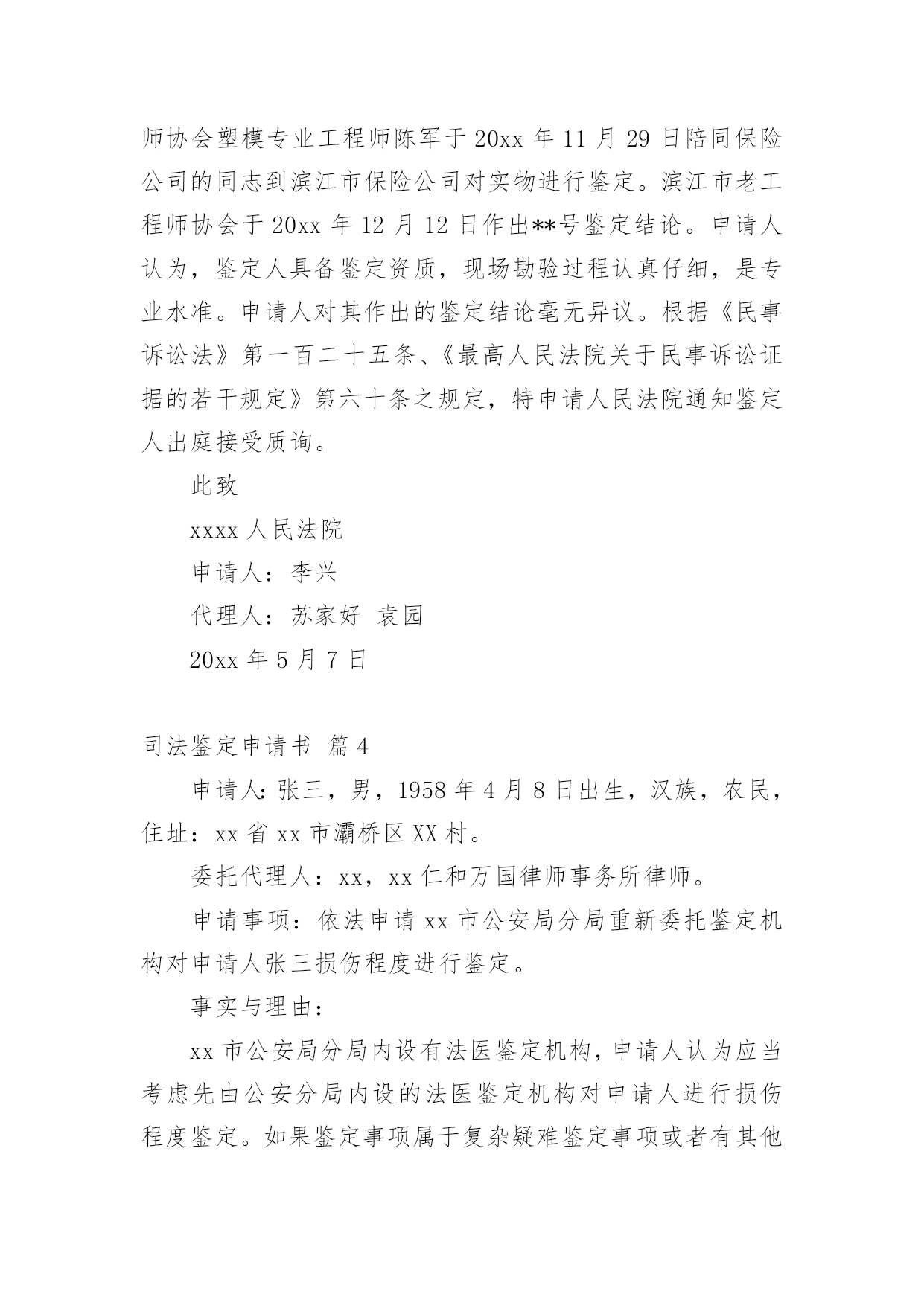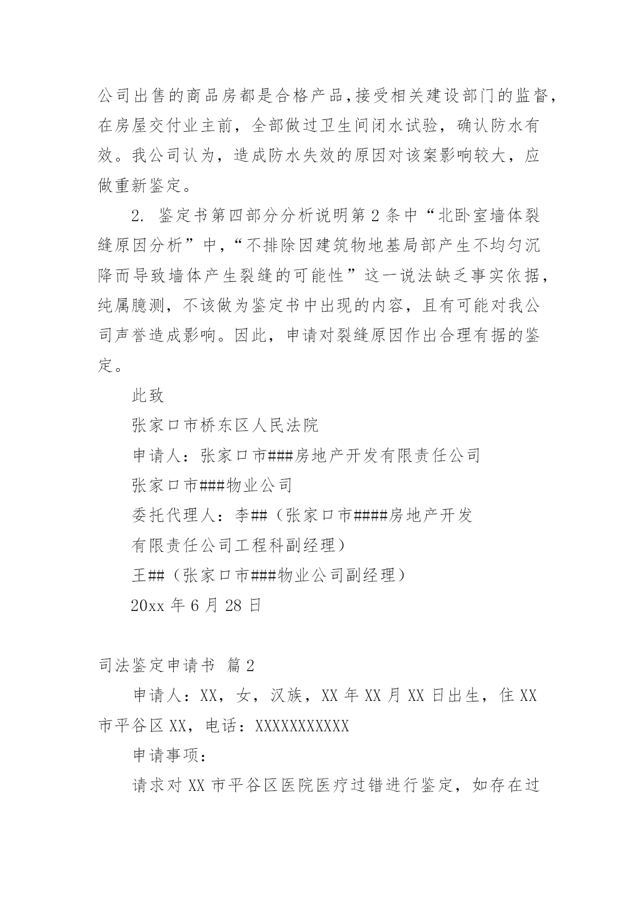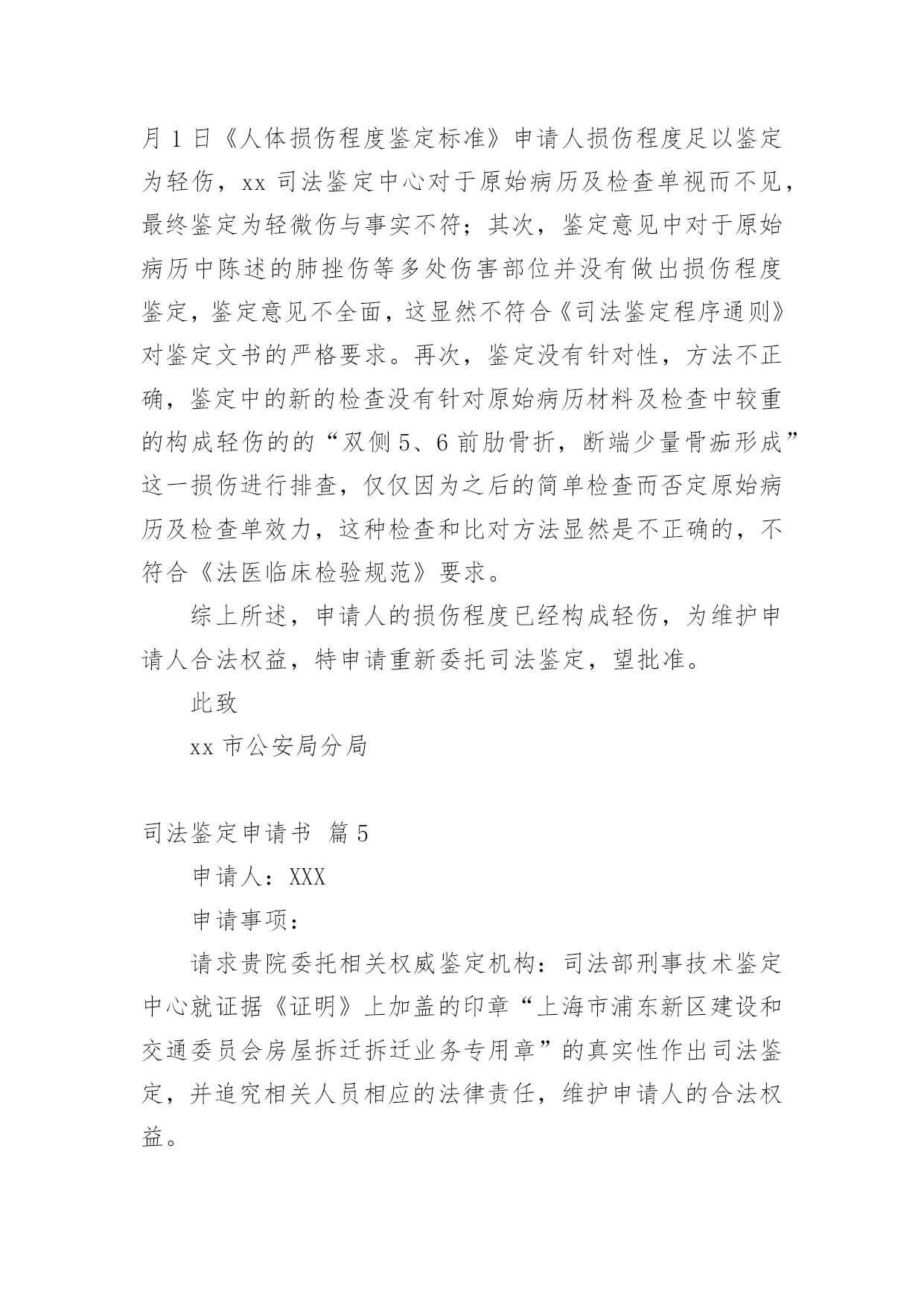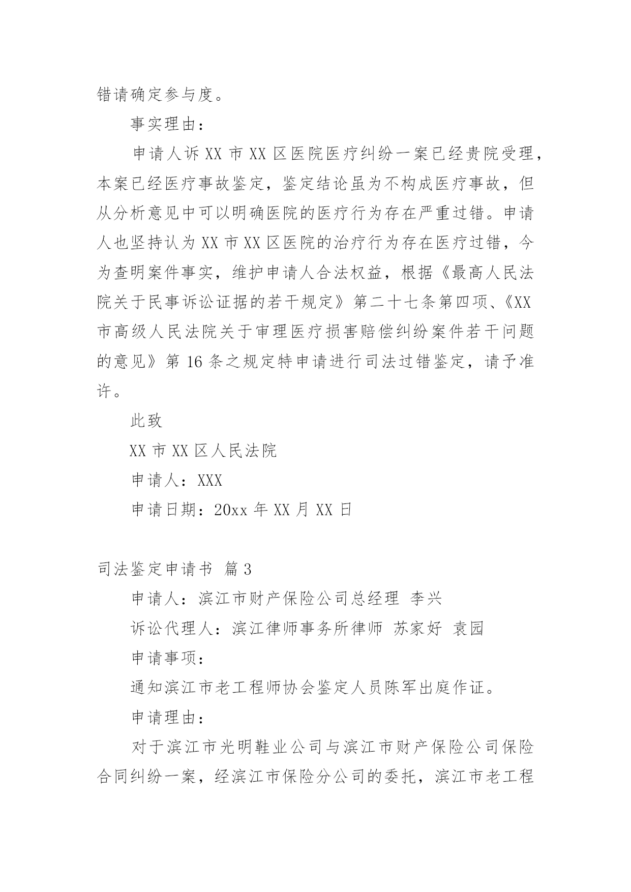 司法鉴定申请书司法鉴定申请书模板集锦七篇在现在的社会生活中申请书与我们不再陌生,写申请书的时候要注意内容的完整。大家知道申请书的格式吗?以下是小编精心整理的司法鉴定申请书7篇,希望能够帮助到大家。司法鉴定申请书篇1申请人:张家口市###房地产开发有限责任公司张家口市###物业公司委托代理人:李##(张家口市###房地产开发有限责任公司工程科副经理)王##(张家口市###物业公司副经理)牛#住房卫生间漏水诉###房地产开发有限责任公司一案,你院委托张家口市科技事务司法鉴定中心对牛##房屋卫生间漏水原因、房屋裂缝原因及解决方案所作出的《司法鉴定意见书》(以下简称鉴定书),申请人认为该鉴定书认定的部分原因与事实的发生不存在直接联系;且部分鉴定结论不负责任,,采用“不排除”之类文字,妄加做出结论,故此特申请重新进行鉴定。要求重新鉴定的理由如下:1.鉴定书第四部分分析说明中第1条“卫生间顶板渗漏原因分析”中的第三条“下水管道周边楼板上部防水层局部失效”,该鉴定书并未对防水层为何失效做出结论。而我公司出售的商品房都是合格产品,接受相关建设部门的监督,在房屋交付业主前,全部做过卫生间闭水试验,确认防水有效。我公司认为,造成防水失效的原因对该案影响较大,应做重新鉴定。2.鉴定书第四部分分析说明第2条中“北卧室墙体裂缝原因分析”中,“不排除因建筑物地基局部产生不均匀沉降而导致墙体产生裂缝的可能性”这一说法缺乏事实依据,纯属臆测,不该做为鉴定书中出现的内容,且有可能对我公司声誉造成影响。因此,申请对裂缝原因作出合理有据的鉴定。此致张家口市桥东区人民法院申请人:张家口市###房地产开发有限责任公司张家口市###物业公司委托代理人:李##(张家口市####房地产开发有限责任公司工程科副经理)王##(张家口市###物业公司副经理)20xx年6月28日司法鉴定申请书篇2申请人:XX,女,汉族,XX年XX月XX日出生,住XX市平谷区XX,电话:XXXXXXXXXXX申请事项:请求对XX市平谷区医院医疗过错进行鉴定,如存在过错请确定参与度。事实理由:申请人诉XX市XX区医院医疗纠纷一案已经贵院受理,本案已经医疗事故鉴定,鉴定结论虽为不构成医疗事故,但从分析意见中可以明确医院的医疗行为存在严重过错。申请人也坚持认为XX市XX区医院的治疗行为存在医疗过错,今为查明案件事实,维护申请人合法权益,根据《最高人民法院关于民事诉讼证据的若干规定》第二十七条第四项、《XX市高级人民法院关于审理医疗损害赔偿纠纷案件若干问题的意见》第16条之规定特申请进行司法过错鉴定,请予准许。此致XX市XX区人民法院申请人:XXX申请日期:20xx年XX月XX日司法鉴定申请书篇3申请人:滨江市财产保险公司总经理李兴诉讼代理人:滨江律师事务所律师苏家好袁园申请事项:通知滨江市老工程师协会鉴定人员陈军出庭作证。申请理由:对于滨江市光明鞋业公司与滨江市财产保险公司保险合同纠纷一案,经滨江市保险分公司的委托,滨江市老工程师协会塑模专业工程师陈军于20xx年11月29日陪同保险公司的同志到滨江市保险公司对实物进行鉴定。滨江市老工程师协会于20xx年12月12日作出**号鉴定结论。申请人认为,鉴定人具备鉴定资质,现场勘验过程认真仔细,是专业水准。申请人对其作出的鉴定结论毫无异议。根据《民事诉讼法》第一百二十五条、《最高人民法院关于民事诉讼证据的若干规定》第六十条之规定,特申请人民法院通知鉴定人出庭接受质询。此致xxxx人民法院申请人:李兴代理人:苏家好袁园20xx年5月7日司法鉴定申请书篇4申请人:张三,男,1958年4月8日出生,汉族,农民,住址:xx省xx市灞桥区XX村。委托代理人:xx,xx仁和万国律师事务所律师。申请事项:依法申请xx市公安局分局重新委托鉴定机构对申请人张三损伤程度进行鉴定。事实与理由:xx市公安局分局内设有法医鉴定机构,申请人认为应当考虑先由公安分局内设的法医鉴定机构对申请人进行损伤程度鉴定。如果鉴定事项属于复杂疑难鉴定事项或者有其他特殊情况,才有必要考虑对外委托。申请人的伤情并非复杂疑难问题,不需要对外委托鉴定。如果确有必要对外委托xx市公安局分局也应该委托具有良好声誉的权威鉴定机构来鉴定,而xx司法鉴定中心并不具有胜任的资格。申请人接受鉴定事后得知,xx司法鉴定中心并未入选xx市中级人民法院法医学、文检鉴定机构入册机构名册内,该鉴定机构无论在声誉还是在鉴定水平的权威性方面都是不入流的鉴定机构,其不正规的做事风格一度受到业界诟病,其权威性并未得到司法机关、保险公司、律师事务所、受害人等广泛认可。申请人认为鉴定涉及刑事责任追究,xx市公安局灞桥分局委托xx司法鉴定中心对鉴定申请人损伤程度鉴定考虑不周,应重新委托鉴定机构鉴定。xx司法鉴定中心向申请人收取司法鉴定费用1000