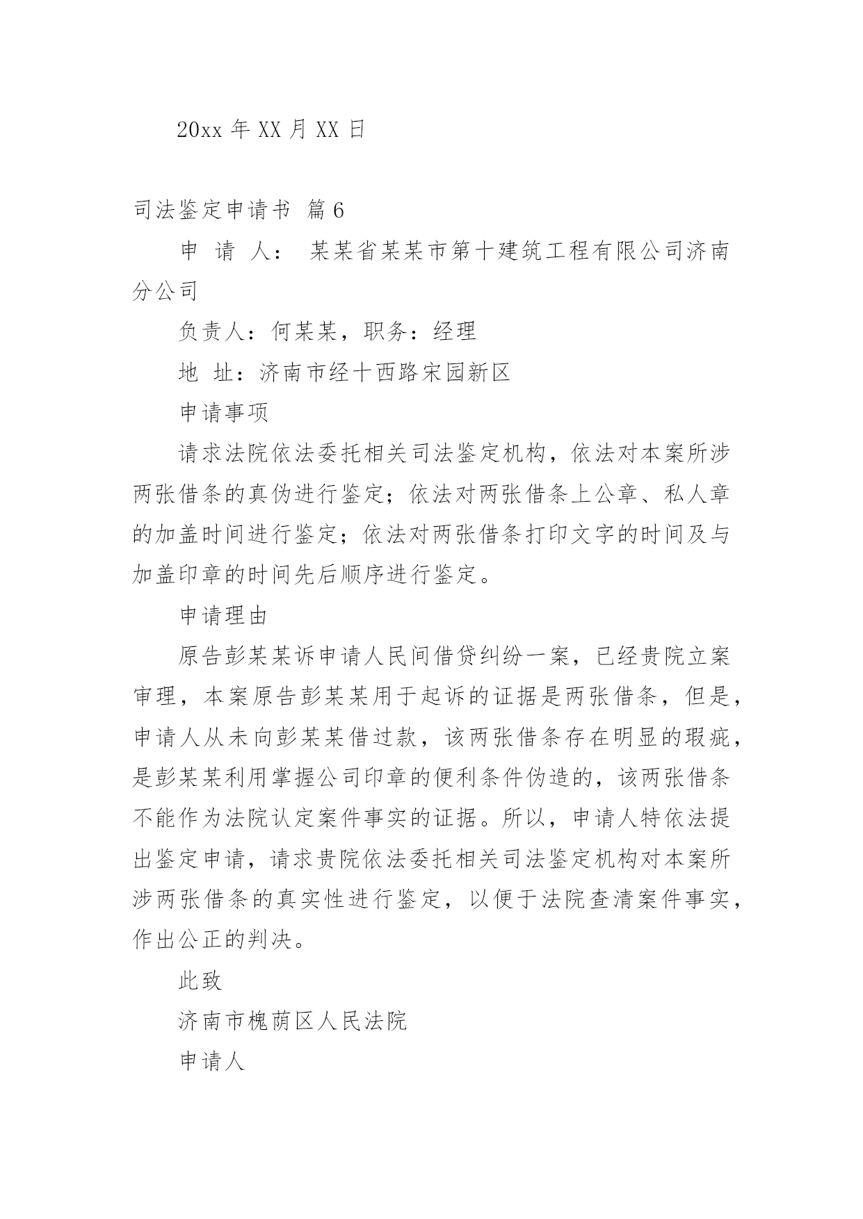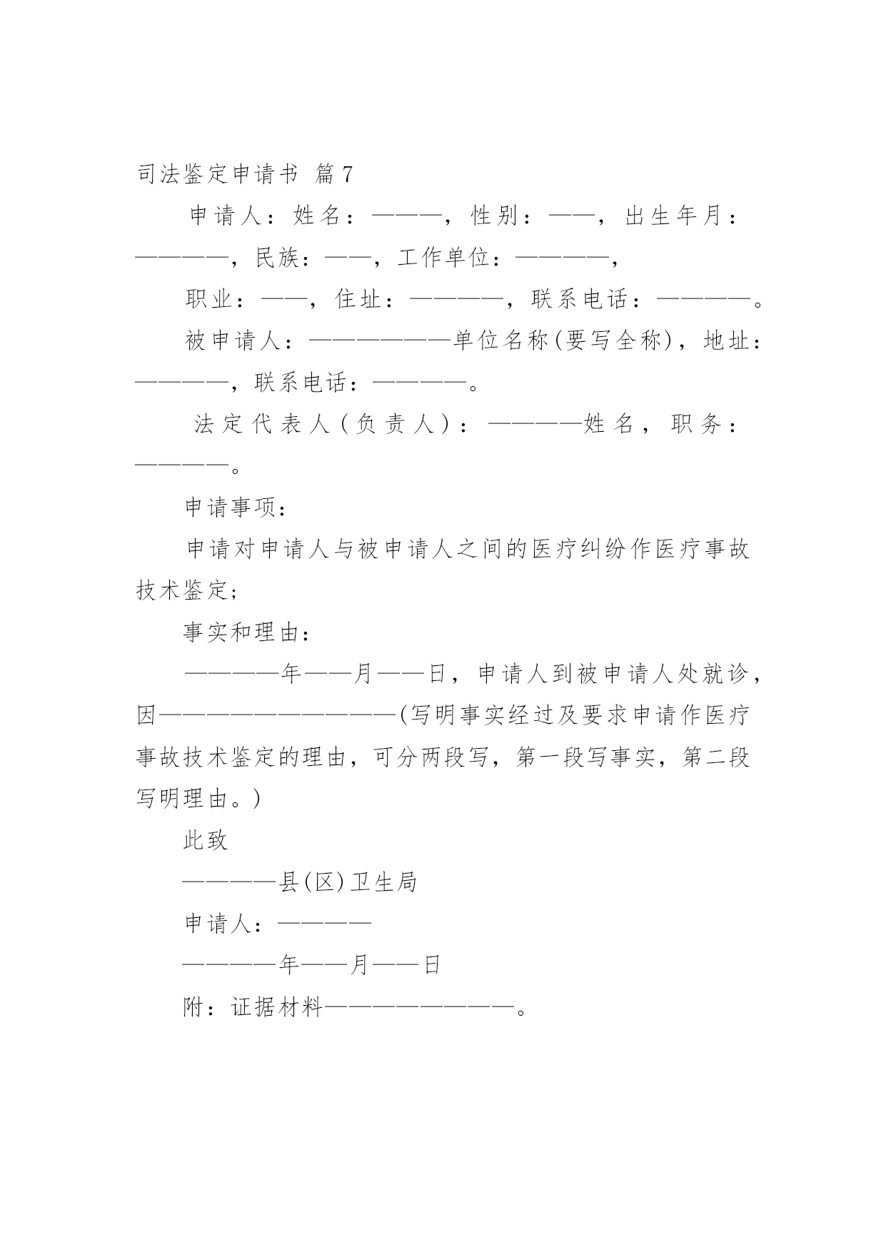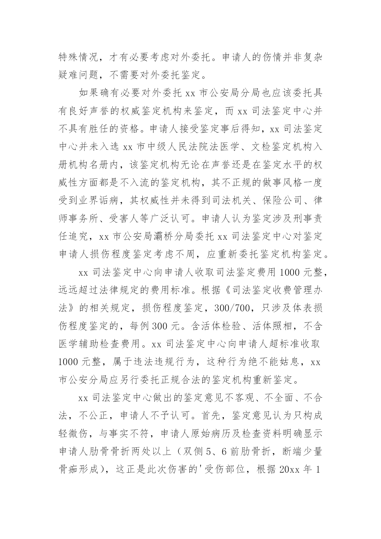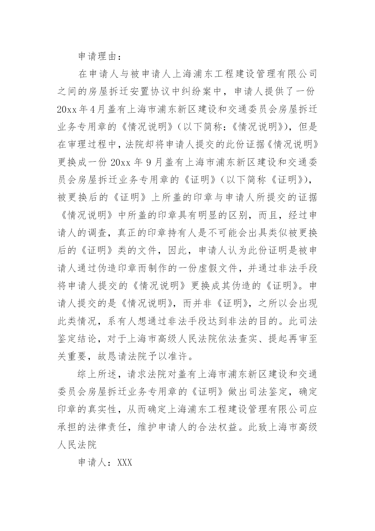 司法鉴定申请书司法鉴定申请书模板集锦七篇在现在的社会生活中申请书与我们不再陌生,写申请书的时候要注意内容的完整。大家知道申请书的格式吗?以下是小编精心整理的司法鉴定申请书7篇,希望能够帮助到大家。司法鉴定申请书篇1申请人:张家口市###房地产开发有限责任公司张家口市###物业公司委托代理人:李##(张家口市###房地产开发有限责任公司工程科副经理)王##(张家口市###物业公司副经理)牛#住房卫生间漏水诉###房地产开发有限责任公司一案,你院委托张家口市科技事务司法鉴定中心对牛##房屋卫生间漏水原因、房屋裂缝原因及解决方案所作出的《司法鉴定意见书》(以下简称鉴定书),申请人认为该鉴定书认定的部分原因与事实的发生不存在直接联系;且部分鉴定结论不负责任,,采用“不排除”之类文字,妄加做出结论,故此特申请重新进行鉴定。要求重新鉴定的理由如下:1.鉴定书第四部分分析说明中第1条“卫生间顶板渗漏原因分析”中的第三条“下水管道周边楼板上部防水层局部失效”,该鉴定书并未对防水层为何失效做出结论。而我公司出售的商品房都是合格产品,接受相关建设部门的监督,在房屋交付业主前,全部做过卫生间闭水试验,确认防水有效。我公司认为,造成防水失效的原因对该案影响较大,应做重新鉴定。2.鉴定书第四部分分析说明第2条中“北卧室墙体裂缝原因分析”中,“不排除因建筑物地基局部产生不均匀沉降而导致墙体产生裂缝的可能性”这一说法缺乏事实依据,纯属臆测,不该做为鉴定书中出现的内容,且有可能对我公司声誉造成影响。因此,申请对裂缝原因作出合理有据的鉴定。此致张家口市桥东区人民法院申请人:张家口市###房地产开发有限责任公司张家口市###物业公司委托代理人:李##(张家口市####房地产开发有限责任公司工程科副经理)王##(张家口市###物业公司副经理)20xx年6月28日司法鉴定申请书篇2申请人:XX,女,汉族,XX年XX月XX日出生,住XX市平谷区XX,电话:XXXXXXXXXXX申请事项:请求对XX市平谷区医院医疗过错进行鉴定,如存在过错请确定参与度。事实理由:申请人诉XX市XX区医院医疗纠纷一案已经贵院受理,本案已经医疗事故鉴定,鉴定结论虽为不构成医疗事故,但从分析意见中可以明确医院的医疗行为存在严重过错。申请人也坚持认为XX市XX区医院的治疗行为存在医疗过错,今为查明案件事实,维护申请人合法权益,根据《最高人民法院关于民事诉讼证据的若干规定》第二十七条第四项、《XX市高级人民法院关于审理医疗损害赔偿纠纷案件若干问题的意见》第16条之规定特申请进行司法过错鉴定,请予准许。此致XX市XX区人民法院申请人:XXX申请日期:20xx年XX月XX日司法鉴定申请书篇3申请人:滨江市财产保险公司总经理李兴诉讼代理人:滨江律师事务所律师苏家好袁园申请事项:通知滨江市老工程师协会鉴定人员陈军出庭作证。申请理由:对于滨江市光明鞋业公司与滨江市财产保险公司保险合同纠纷一案,经滨江市保险分公司的委托,滨江市老工程师协会塑模专业工程师陈军于20xx年11月29日陪同保险公司的同志到滨江市保险公司对实物进行鉴定。滨江市老工程师协会于20xx年12月12日作出**号鉴定结论。申请人认为,鉴定人具备鉴定资质,现场勘验过程认真仔细,是专业水准。申请人对其作出的鉴定结论毫无异议。根据《民事诉讼法》第一百二十五条、《最高人民法院关于民事诉讼证据的若干规定》第六十条之规定,特申请人民法院通知鉴定人出庭接受质询。此致xxxx人民法院申请人:李兴代理人:苏家好袁园20xx年5月7日司法鉴定申请书篇4申请人:张三,男,1958年4月8日出生,汉族,农民,住址:xx省xx市灞桥区XX村。委托代理人:xx,xx仁和万国律师事务所律师。申请事项:依法申请xx市公安局分局重新委托鉴定机构对申请人张三损伤程度进行鉴定。事实与理由:xx市公安局分局内设有法医鉴定机构,申请人认为应当考虑先由公安分局内设的法医鉴定机构对申请人进行损伤程度鉴定。如果鉴定事项属于复杂疑难鉴定事项或者有其他特殊情况,才有必要考虑对外委托。申请人的伤情并非复杂疑难问题,不需要对外委托鉴定。如果确有必要对外委托xx市公安局分局也应该委托具有良好声誉的权威鉴定机构来鉴定,而xx司法鉴定中心并不具有胜任的资格。申请人接受鉴定事后得知,xx司法鉴定中心并未入选xx市中级人民法院法医学、文检鉴定机构入册机构名册内,该鉴定机构无论在声誉还是在鉴定水平的权威性方面都是不入流的鉴定机构,其不正规的做事风格一度受到业界诟病,其权威性并未得到司法机关、保险公司、律师事务所、受害人等广泛认可。申请人认为鉴定涉及刑事责任追究,xx市公安局灞桥分局委托xx司法鉴定中心对鉴定申请人损伤程度鉴定考虑不周,应重新委托鉴定机构鉴定。xx司法鉴定中心向申请人收取司法鉴定费用1000