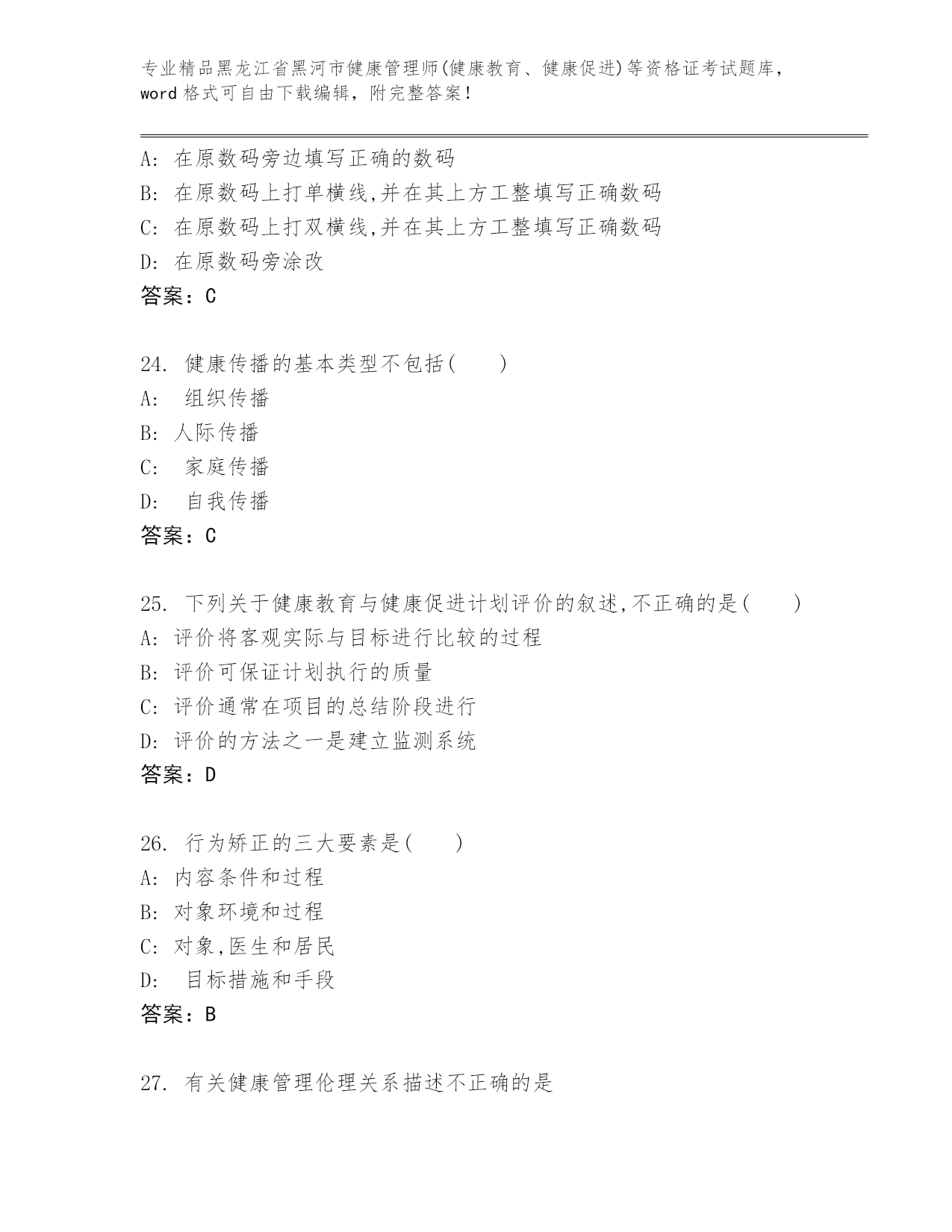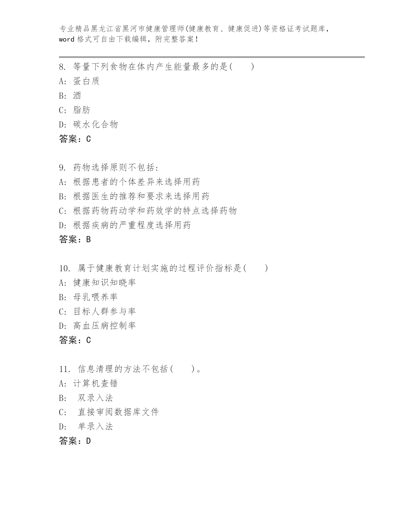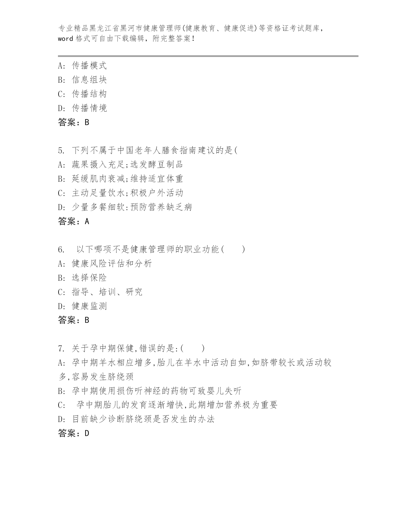 2024年黑龙江省黑河市健康管理师(健康教育、健康促进)等资格证考试(夺冠)