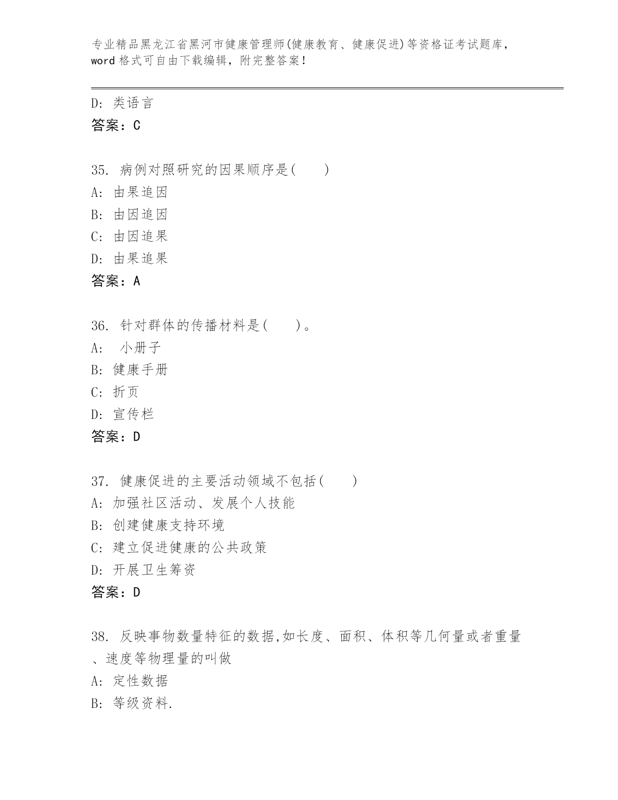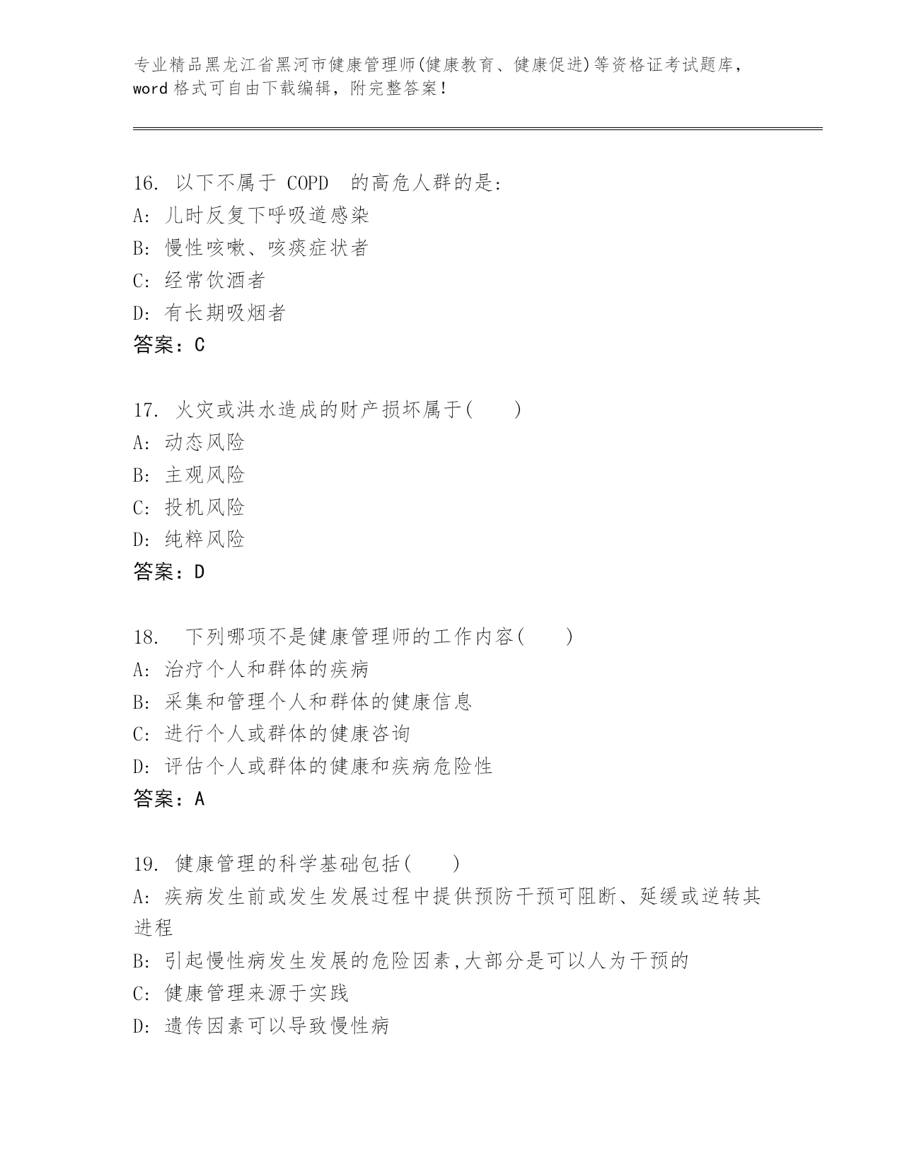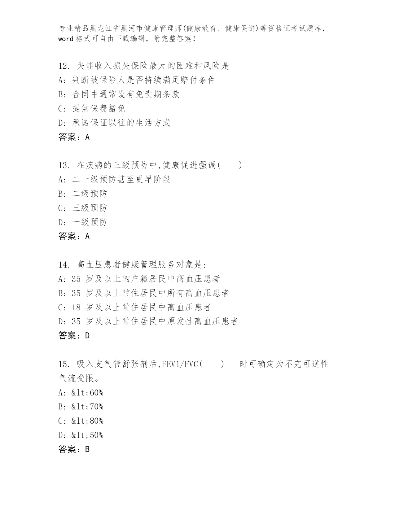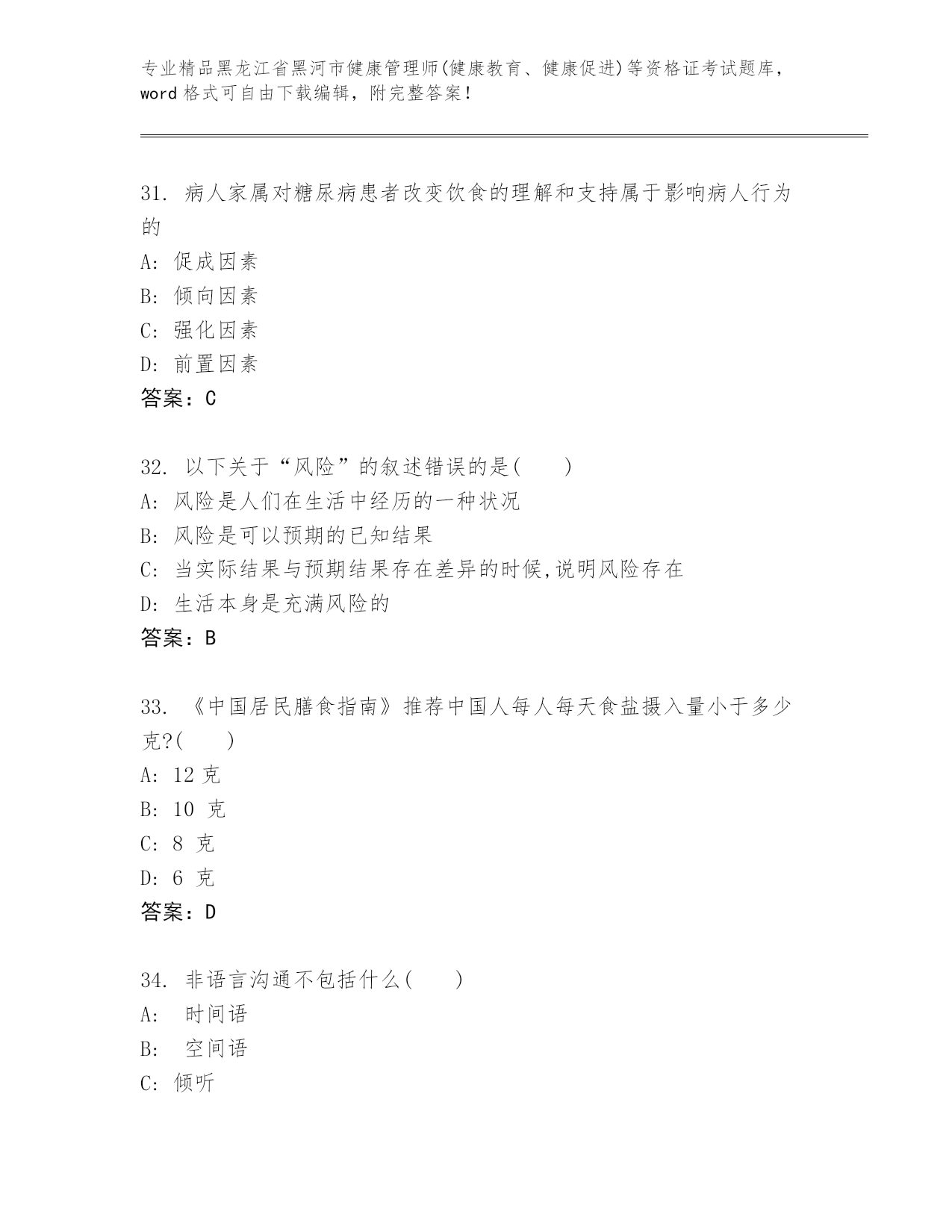 2024年黑龙江省黑河市健康管理师(健康教育、健康促进)等资格证考试(夺冠)