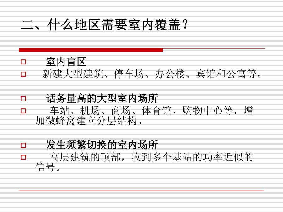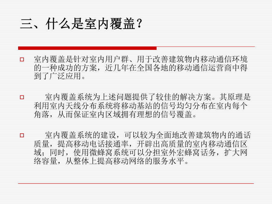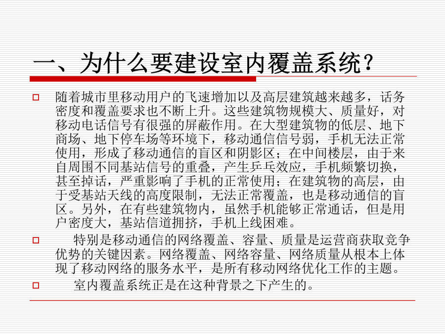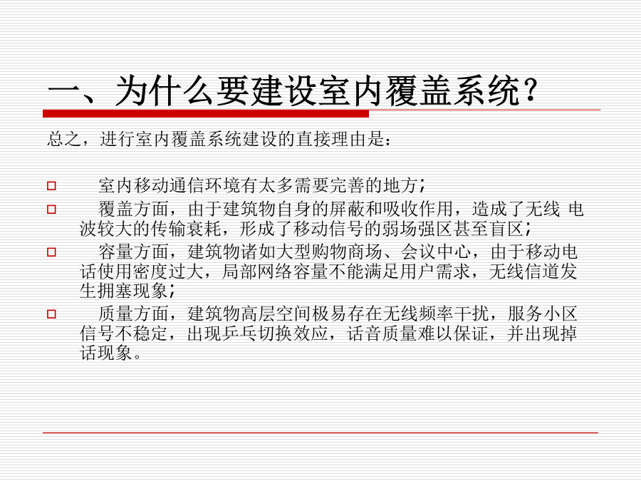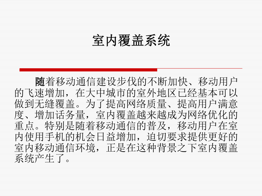 室内覆盖系统一、为什么要建设室内覆盖系统?一、为什么要建设室内覆盖系统?二、什么地区需要室内覆盖?三、什么是室内覆盖?三、什么是室内覆盖?四、实现室内覆盖的方法四、实现室内覆盖的方法四、实现室内覆盖的方法四、实现室内覆盖的方法四、实现室内覆盖的方法五、室内覆盖系统的组成六、信号源提取的几种方法六、信号源提取的方法六、信号源提取的方法六、信号源提取的方法六、信号源提取的方法七、信号分布的基本方式七、信号分布的基本方式七、信号分布的基本方式七、信号分布的基本方式七、信号分布的基本方式七、信号分布的基本方式八、室内覆盖系统的工程建设八、室内覆盖系统的工程建设八、室内覆盖系统的工程建设八、室内覆盖系统的工程建设八、室内覆盖系统的工程建设八、室内覆盖系统的工程建设八、室内覆盖系统的工程建设八、室内覆盖系统的工程建设八、室内覆盖系统的工程建设八、室内覆盖系统的工程建设八、室内覆盖系统的工程建设九、如何评价一个好的室内覆盖系统九、如何评价一个好的室内覆盖系统十、室内分布系统计算时常用的计算公式十、室内分布系统计算时常用的计算公式十、室内分布系统计算时常用的计算公式十一、仪表使用十一、仪表使用十一、仪表使用十一、仪表使用十二、耦合器与功分器的作用和区别十三、名词解释十四、计算题十四、计算题十五、网络知识十五、网络知识