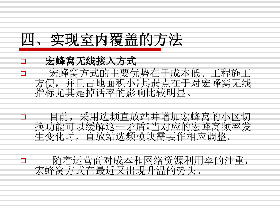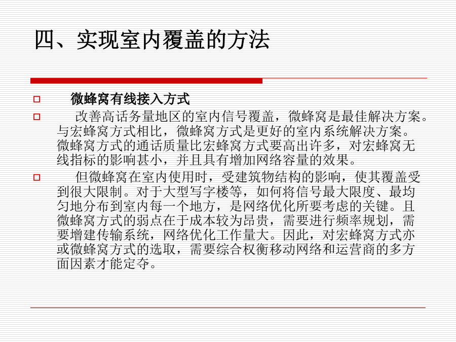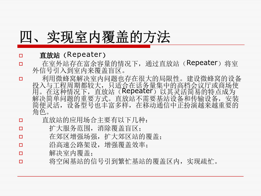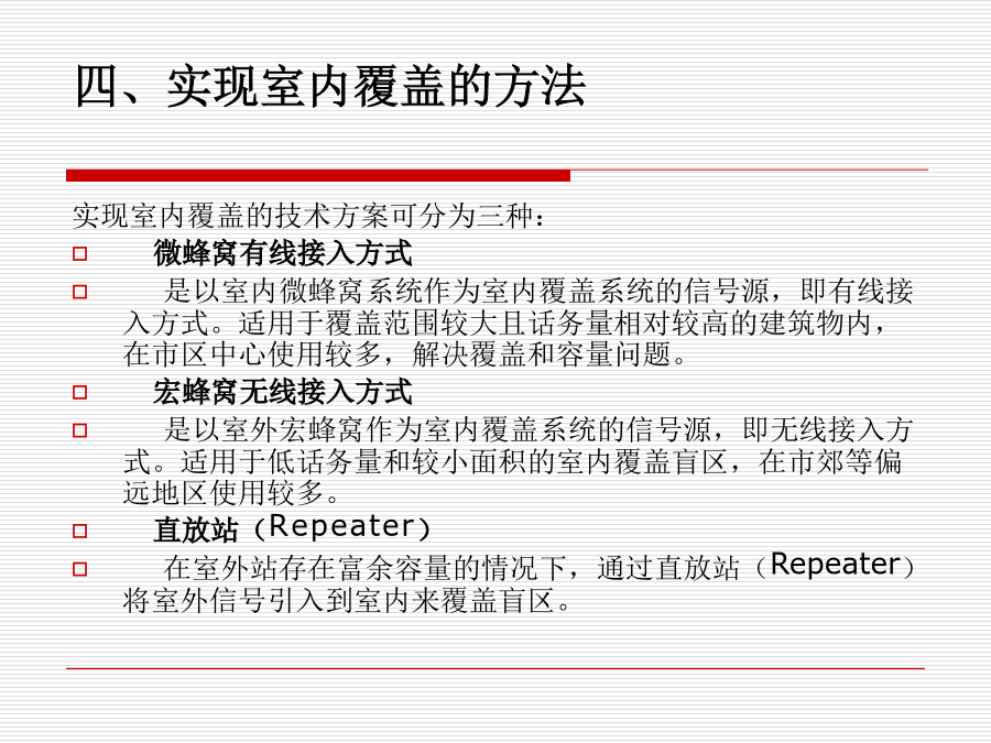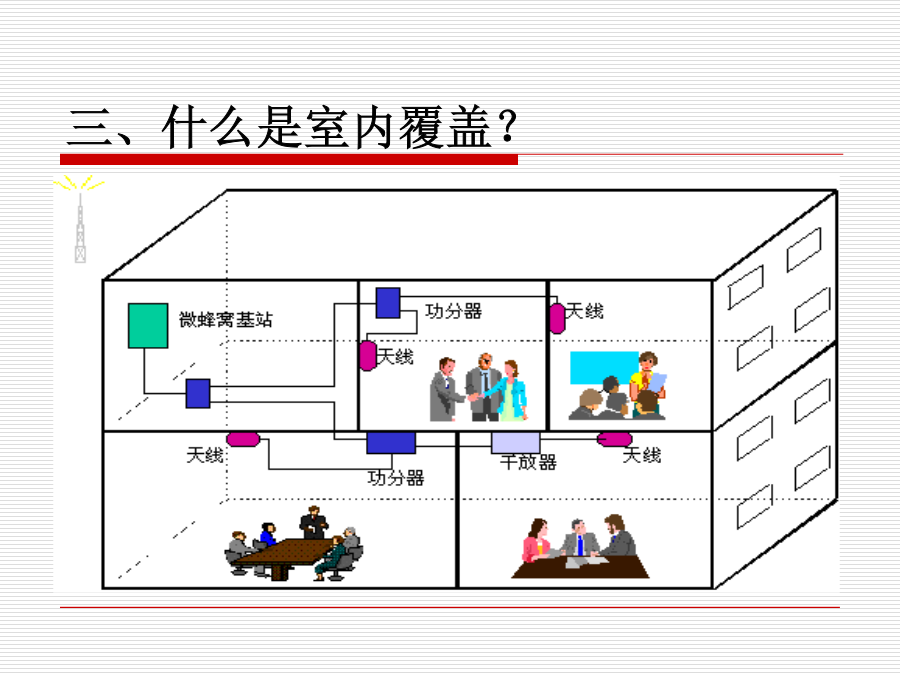 室内覆盖系统一、为什么要建设室内覆盖系统?一、为什么要建设室内覆盖系统?二、什么地区需要室内覆盖?三、什么是室内覆盖?三、什么是室内覆盖?四、实现室内覆盖的方法四、实现室内覆盖的方法四、实现室内覆盖的方法四、实现室内覆盖的方法四、实现室内覆盖的方法五、室内覆盖系统的组成六、信号源提取的几种方法六、信号源提取的方法六、信号源提取的方法六、信号源提取的方法六、信号源提取的方法七、信号分布的基本方式七、信号分布的基本方式七、信号分布的基本方式七、信号分布的基本方式七、信号分布的基本方式七、信号分布的基本方式八、室内覆盖系统的工程建设八、室内覆盖系统的工程建设八、室内覆盖系统的工程建设八、室内覆盖系统的工程建设八、室内覆盖系统的工程建设八、室内覆盖系统的工程建设八、室内覆盖系统的工程建设八、室内覆盖系统的工程建设八、室内覆盖系统的工程建设八、室内覆盖系统的工程建设八、室内覆盖系统的工程建设九、如何评价一个好的室内覆盖系统九、如何评价一个好的室内覆盖系统十、室内分布系统计算时常用的计算公式十、室内分布系统计算时常用的计算公式十、室内分布系统计算时常用的计算公式十一、仪表使用十一、仪表使用十一、仪表使用十一、仪表使用十二、耦合器与功分器的作用和区别十三、名词解释十四、计算题十四、计算题十五、网络知识十五、网络知识