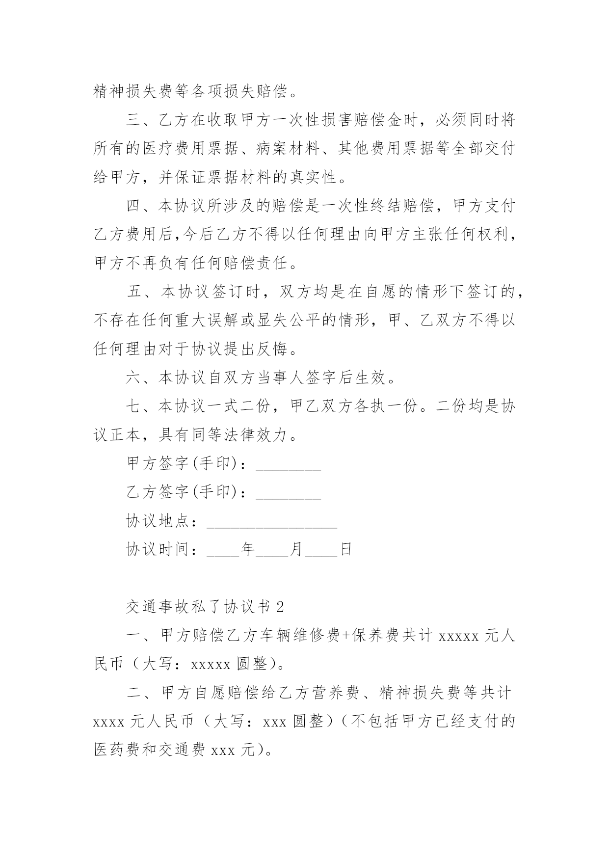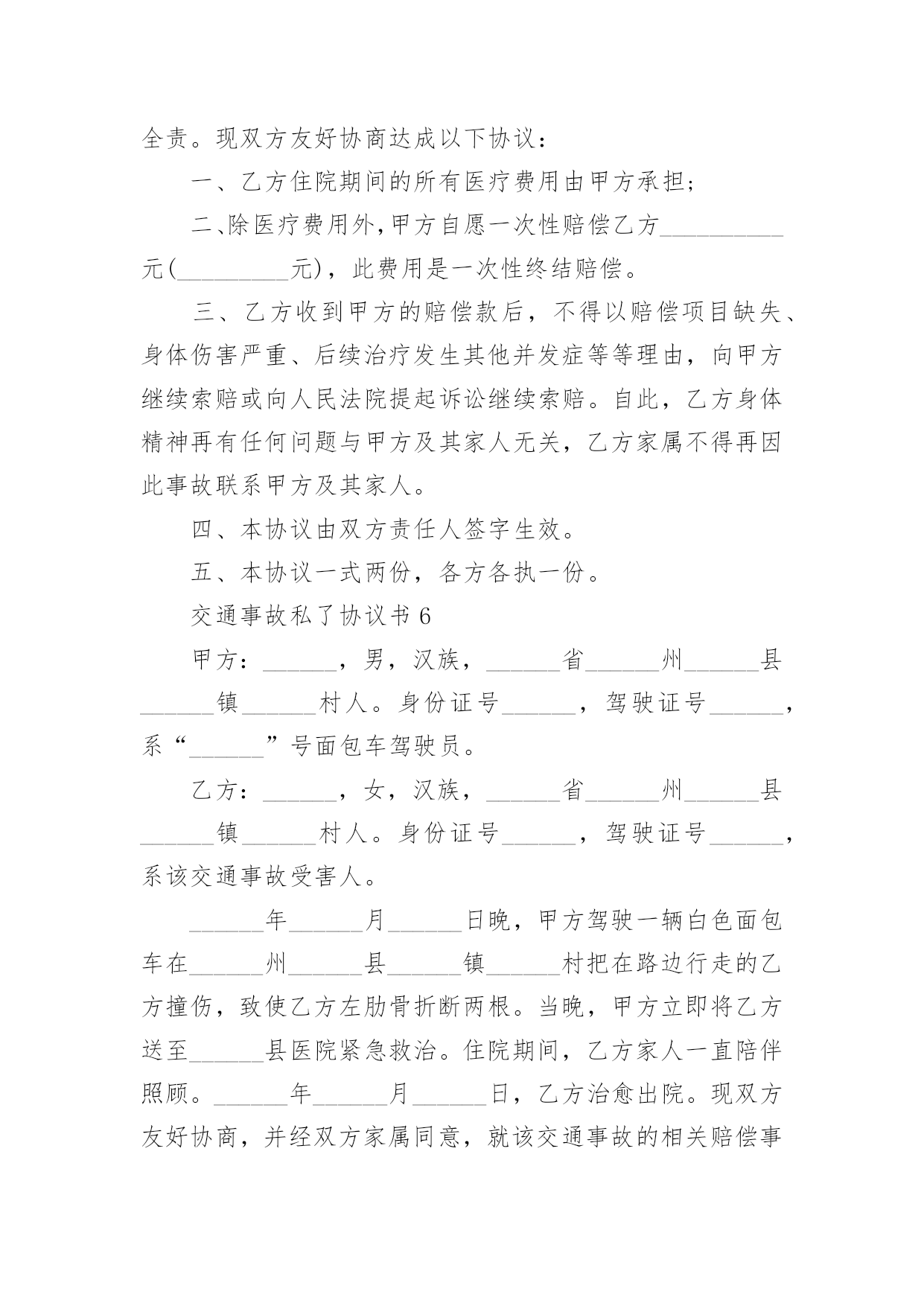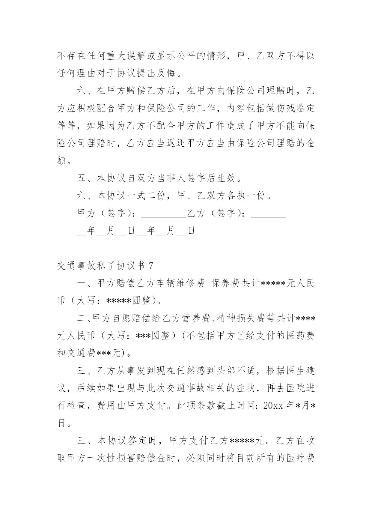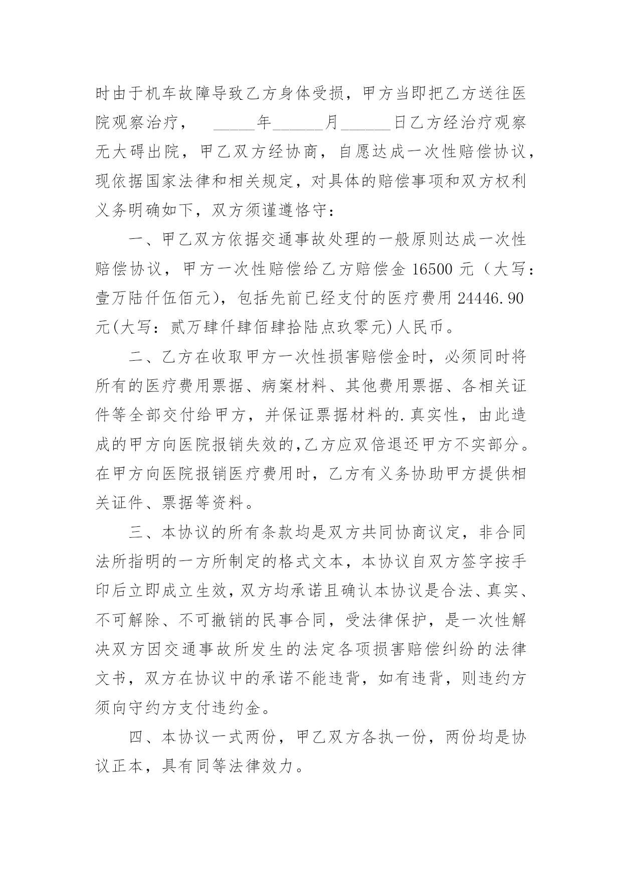 交通事故私了协议书(精)交通事故私了协议书随着社会不断地进步,男女老少都可能需要用到协议,签订签订协议是最有效的法律依据之一。协议到底怎么写才合适呢?以下是小编收集整理的交通事故私了协议书,欢迎大家借鉴与参考,希望对大家有所帮助。交通事故私了协议书1甲方:________身份证号:____________乙方:________身份证号:____________20____年____月____日____时左右,甲方驾驶摩托车在佛山大道与人民路交叉路段与乙方发生刮碰,事发之后,甲方及时将乙方送到____市____医院进行了CT和B超检查,经医院医师诊断为软组织损伤,没有造成器官的损伤及其他身体部位伤害。甲、乙双方经平等友好协商,就乙方遭受的损失自愿达成一次性赔偿协议,现依据国家有关法律、法规,对具体的赔偿事宜和双方权利义务明确如下:一、甲方自本协议签订后5日内向乙方支付一次性损害赔偿金共计10000元人民币(大写:壹万圆整)(不包括已经支付的医药费,交通费等20xx元)。二、第一条的`一次性损害赔偿金包含乙方因此次事故所需的交通费、护理费、误工费、伙食住宿费、后续治疗费、精神损失费等各项损失赔偿。三、乙方在收取甲方一次性损害赔偿金时,必须同时将所有的医疗费用票据、病案材料、其他费用票据等全部交付给甲方,并保证票据材料的真实性。四、本协议所涉及的赔偿是一次性终结赔偿,甲方支付乙方费用后,今后乙方不得以任何理由向甲方主张任何权利,甲方不再负有任何赔偿责任。五、本协议签订时,双方均是在自愿的情形下签订的,不存在任何重大误解或显失公平的情形,甲、乙双方不得以任何理由对于协议提出反悔。六、本协议自双方当事人签字后生效。七、本协议一式二份,甲乙双方各执一份。二份均是协议正本,具有同等法律效力。甲方签字(手印):________乙方签字(手印):________协议地点:________________协议时间:____年____月____日交通事故私了协议书2一、甲方赔偿乙方车辆维修费+保养费共计xxxxx元人民币(大写:xxxxx圆整)。二、甲方自愿赔偿给乙方营养费、精神损失费等共计xxxx元人民币(大写:xxx圆整)(不包括甲方已经支付的医药费和交通费xxx元)。三、乙方从事发到现在任然感到头部不适,根据,后续如果出现与此次相关的症状,再去医院进行检查,费用由甲方支付。此项条款截止时间:20xx年xx月xx日。三、本协议签定时,甲方支付乙方xxxxx元。乙方在收取甲方一次性损害赔偿金时,必须同时将目前所有的医疗费用票据、病案材料、其他费用票据等全部交付给乙方,并保证票据材料的真实性。四、本协议所涉及的赔偿是一次性终结赔偿(除本协议第三条外),甲方支付乙方费用后,今后乙方不得以任何理由向甲方主张任何权利,甲方不再负有任何赔偿责任。五、本协议签订时,双方均是在自愿的情形下签订的`,不存在任何重大误解或显示公平的情形,甲、乙双方不得以任何理由对于协议提出反悔。六、本协议自双方当事人签字后生效。七、本协议一式二份,甲乙双方各执一份。二份均是协议正本,具有同等法律效力。甲方签字(手印):乙方签字(手印):甲方委托代理人:乙方委托代理人:交通事故私了协议书3赔偿人:_______,男,______岁,______族,车主,现住乡村,身份证号码:______被赔偿人:______,男,______岁,______族,农民,现住市县村,身份证号码:____________年______月______日,______在公路上骑摩托车正常行驶的过程中,由于骑着自行车看牛导致岔道,和______驾驶的摩托车相撞,致使受伤。被撞伤后立即被______送到医院住院治疗,经检查,是大腿骨处骨折受伤,住院天后于______年______月______日好转出院。经双方进行友好协商,达成一致,自愿达成以下赔偿协议:一、由赔偿各项医疗费(不包含前期住院已经支付给的医疗费)、残疾赔偿金、误工费、住院伙食补助费、护理费、营养费、精神抚慰金、二次手术费、残疾辅助器具费、被扶养人生活费、鉴定费、自行车修理费、交通费等共计(总数额—已经支付的.医疗费元)=现在还需给付的金额元;二、以上款项一次性支付,支付后双方均不得反悔,不得再追究______的任何责任;三、双方再无其他争议;四、本协议一式两份,双方各执一份,自签字之日起生效。赔偿人:(签名)被赔偿人:(签名)交通事故私了协议书4甲方:_____乙方:_____事故原因:_____年______月______日甲方驾驶客三轮摩托车载客时由于机车故障导致乙方身体受损,甲方当即把乙方送往医院观察治疗,_____年______月______日乙方经治疗观察无大碍出院,甲乙双方经协商,自愿达成一次性赔偿协议,现依据国家法律和相关规定,