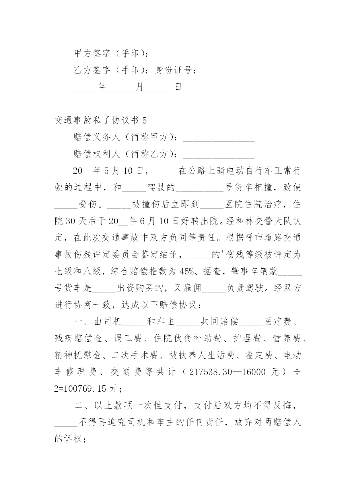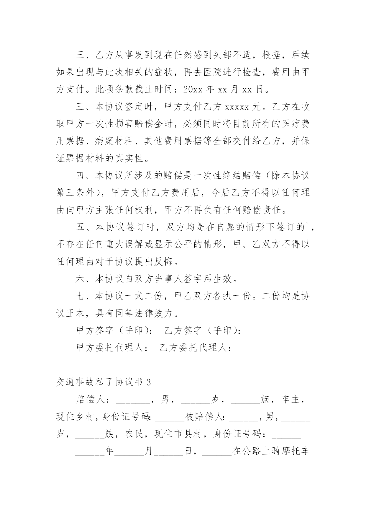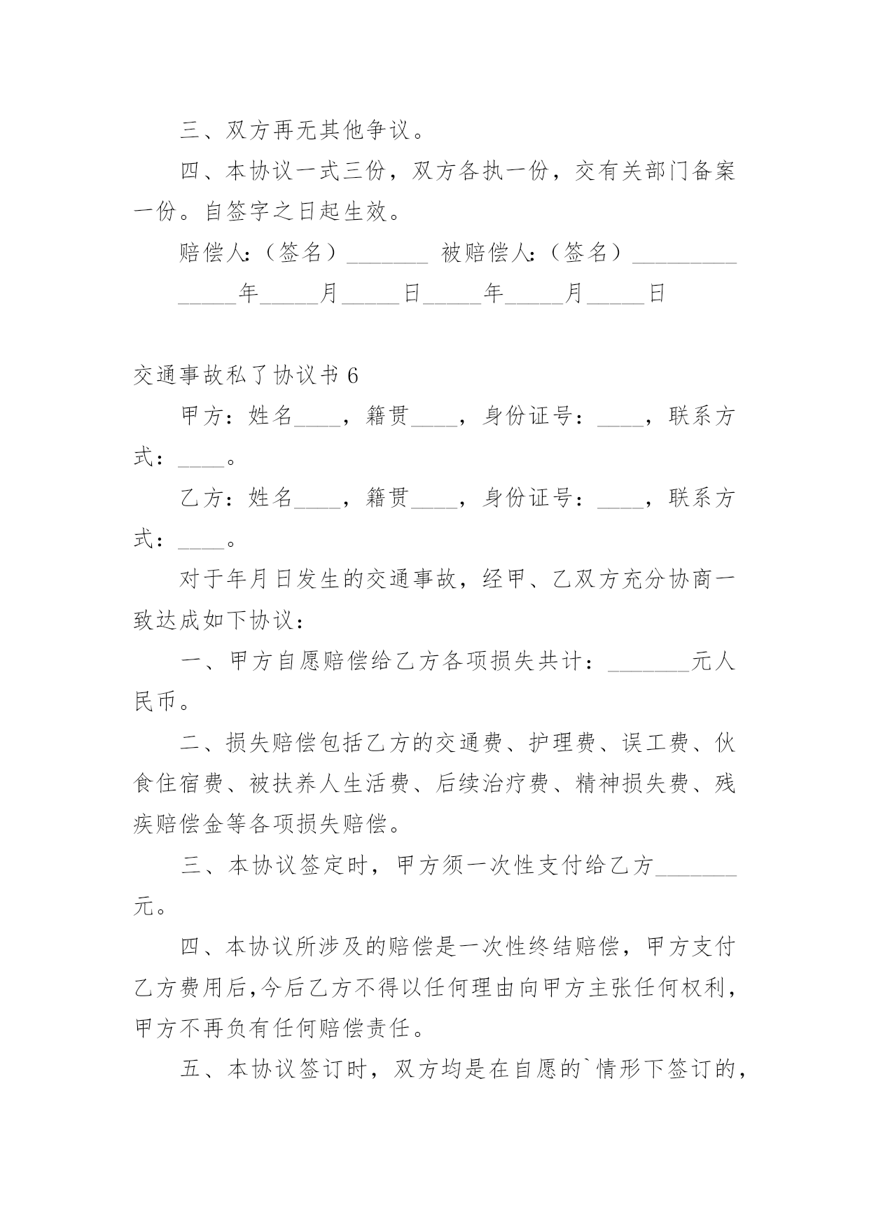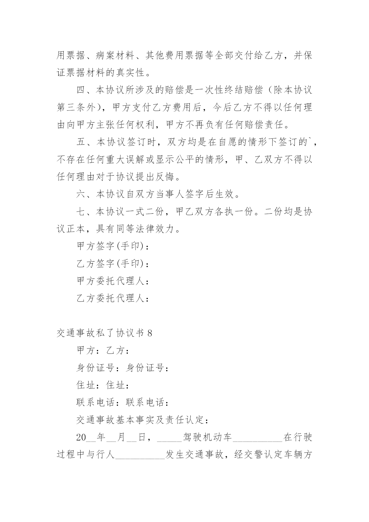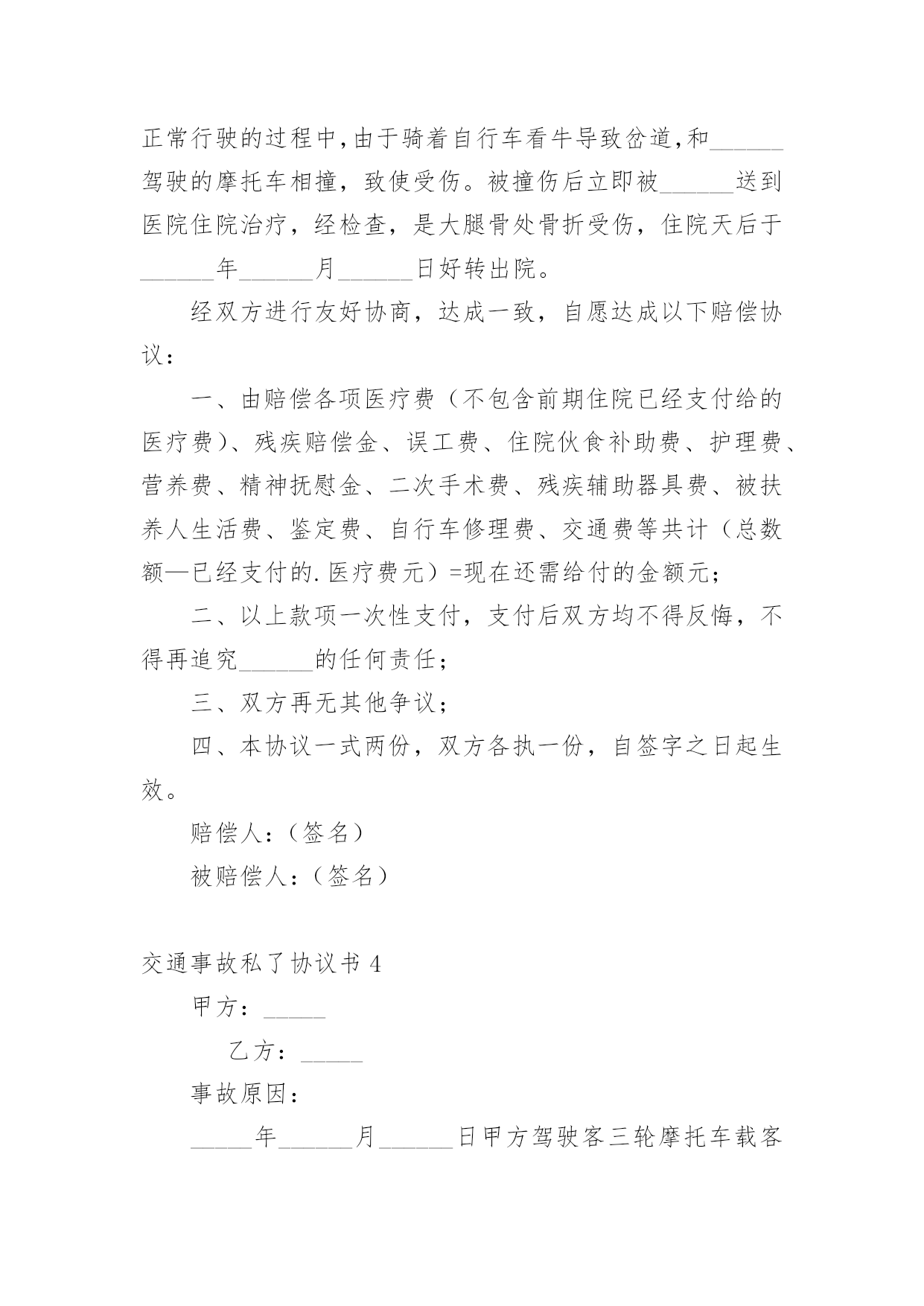 交通事故私了协议书(精)交通事故私了协议书随着社会不断地进步,男女老少都可能需要用到协议,签订签订协议是最有效的法律依据之一。协议到底怎么写才合适呢?以下是小编收集整理的交通事故私了协议书,欢迎大家借鉴与参考,希望对大家有所帮助。交通事故私了协议书1甲方:________身份证号:____________乙方:________身份证号:____________20____年____月____日____时左右,甲方驾驶摩托车在佛山大道与人民路交叉路段与乙方发生刮碰,事发之后,甲方及时将乙方送到____市____医院进行了CT和B超检查,经医院医师诊断为软组织损伤,没有造成器官的损伤及其他身体部位伤害。甲、乙双方经平等友好协商,就乙方遭受的损失自愿达成一次性赔偿协议,现依据国家有关法律、法规,对具体的赔偿事宜和双方权利义务明确如下:一、甲方自本协议签订后5日内向乙方支付一次性损害赔偿金共计10000元人民币(大写:壹万圆整)(不包括已经支付的医药费,交通费等20xx元)。二、第一条的`一次性损害赔偿金包含乙方因此次事故所需的交通费、护理费、误工费、伙食住宿费、后续治疗费、精神损失费等各项损失赔偿。三、乙方在收取甲方一次性损害赔偿金时,必须同时将所有的医疗费用票据、病案材料、其他费用票据等全部交付给甲方,并保证票据材料的真实性。四、本协议所涉及的赔偿是一次性终结赔偿,甲方支付乙方费用后,今后乙方不得以任何理由向甲方主张任何权利,甲方不再负有任何赔偿责任。五、本协议签订时,双方均是在自愿的情形下签订的,不存在任何重大误解或显失公平的情形,甲、乙双方不得以任何理由对于协议提出反悔。六、本协议自双方当事人签字后生效。七、本协议一式二份,甲乙双方各执一份。二份均是协议正本,具有同等法律效力。甲方签字(手印):________乙方签字(手印):________协议地点:________________协议时间:____年____月____日交通事故私了协议书2一、甲方赔偿乙方车辆维修费+保养费共计xxxxx元人民币(大写:xxxxx圆整)。二、甲方自愿赔偿给乙方营养费、精神损失费等共计xxxx元人民币(大写:xxx圆整)(不包括甲方已经支付的医药费和交通费xxx元)。三、乙方从事发到现在任然感到头部不适,根据,后续如果出现与此次相关的症状,再去医院进行检查,费用由甲方支付。此项条款截止时间:20xx年xx月xx日。三、本协议签定时,甲方支付乙方xxxxx元。乙方在收取甲方一次性损害赔偿金时,必须同时将目前所有的医疗费用票据、病案材料、其他费用票据等全部交付给乙方,并保证票据材料的真实性。四、本协议所涉及的赔偿是一次性终结赔偿(除本协议第三条外),甲方支付乙方费用后,今后乙方不得以任何理由向甲方主张任何权利,甲方不再负有任何赔偿责任。五、本协议签订时,双方均是在自愿的情形下签订的`,不存在任何重大误解或显示公平的情形,甲、乙双方不得以任何理由对于协议提出反悔。六、本协议自双方当事人签字后生效。七、本协议一式二份,甲乙双方各执一份。二份均是协议正本,具有同等法律效力。甲方签字(手印):乙方签字(手印):甲方委托代理人:乙方委托代理人:交通事故私了协议书3赔偿人:_______,男,______岁,______族,车主,现住乡村,身份证号码:______被赔偿人:______,男,______岁,______族,农民,现住市县村,身份证号码:____________年______月______日,______在公路上骑摩托车正常行驶的过程中,由于骑着自行车看牛导致岔道,和______驾驶的摩托车相撞,致使受伤。被撞伤后立即被______送到医院住院治疗,经检查,是大腿骨处骨折受伤,住院天后于______年______月______日好转出院。经双方进行友好协商,达成一致,自愿达成以下赔偿协议:一、由赔偿各项医疗费(不包含前期住院已经支付给的医疗费)、残疾赔偿金、误工费、住院伙食补助费、护理费、营养费、精神抚慰金、二次手术费、残疾辅助器具费、被扶养人生活费、鉴定费、自行车修理费、交通费等共计(总数额—已经支付的.医疗费元)=现在还需给付的金额元;二、以上款项一次性支付,支付后双方均不得反悔,不得再追究______的任何责任;三、双方再无其他争议;四、本协议一式两份,双方各执一份,自签字之日起生效。赔偿人:(签名)被赔偿人:(签名)交通事故私了协议书4甲方:_____乙方:_____事故原因:_____年______月______日甲方驾驶客三轮摩托车载客时由于机车故障导致乙方身体受损,甲方当即把乙方送往医院观察治疗,_____年______月______日乙方经治疗观察无大碍出院,甲乙双方经协商,自愿达成一次性赔偿协议,现依据国家法律和相关规定,