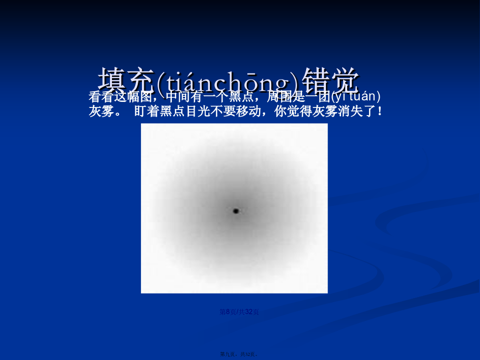 会计学金字塔之谜回环诗图缪勒--莱耶错觉(cuòjué)考试(kǎoshì)作弊——搞错帐目(zhànɡmù)——填充(tiánchōng)错觉同样的你试试下边(xiàbian)的那幅,这次灰雾不会消失了。这是怎么回事?为什么灰雾有时消失有时又不消失?大小恒常性错觉//在这个楼梯中,你能分清(fēnqīng)哪一个是最高或最低的楼梯吗?当你沿顺时针走的时候,会发生什么呢?如果是逆时针,情况会怎么样呢?消失(xiāoshī)的柱子二重奏不可能(kěnéng)的三角形//“一笔画(bǐhuà)”的规律图1两种参考答案:用12根火柴杆,组成4个连靠在一起的单位正方形,如下(rúxià)图。游戏要求:(1)试试看,移动3根火柴杆,把它变成3个不相连靠的正方形。再试试看,移动(yídòng)4根火柴杆,把它变成3个不相连靠的正方形.烤面包的时间(shíjiān)答案用3分钟的时间烤完3片面包而且是两面都烤,是一件简单的事。我们把3片面包叫做A、B、C。每片面包的两面分别用数字l、2代表。烤面包的程序是:第一分钟:烤A1面和B1面。取出面包片,把B翻个面放回烤面包器。把A放在一旁而把C放入烤面包器。第二(dìèr)分钟:烤B2面和C1面。取出面包片,把C翻个面放回烤面包器。把B放在一旁(现在它两面都烤好了)而把A放回烤面包器。第三分钟:烤A2和C2面。至此,3片面包的每一面都烤好了。农夫过河有一个农夫,带了一包米,一只鸡和一只狗准备要过河。当农夫不在时,鸡会吃米,狗会吃鸡,河边有一艘船,农夫在船上一次只能带一样东西(dōngxī),请问农夫该怎么过河?“传教士与野人(yěrén)过河”问题过河方法(fāngfǎ)