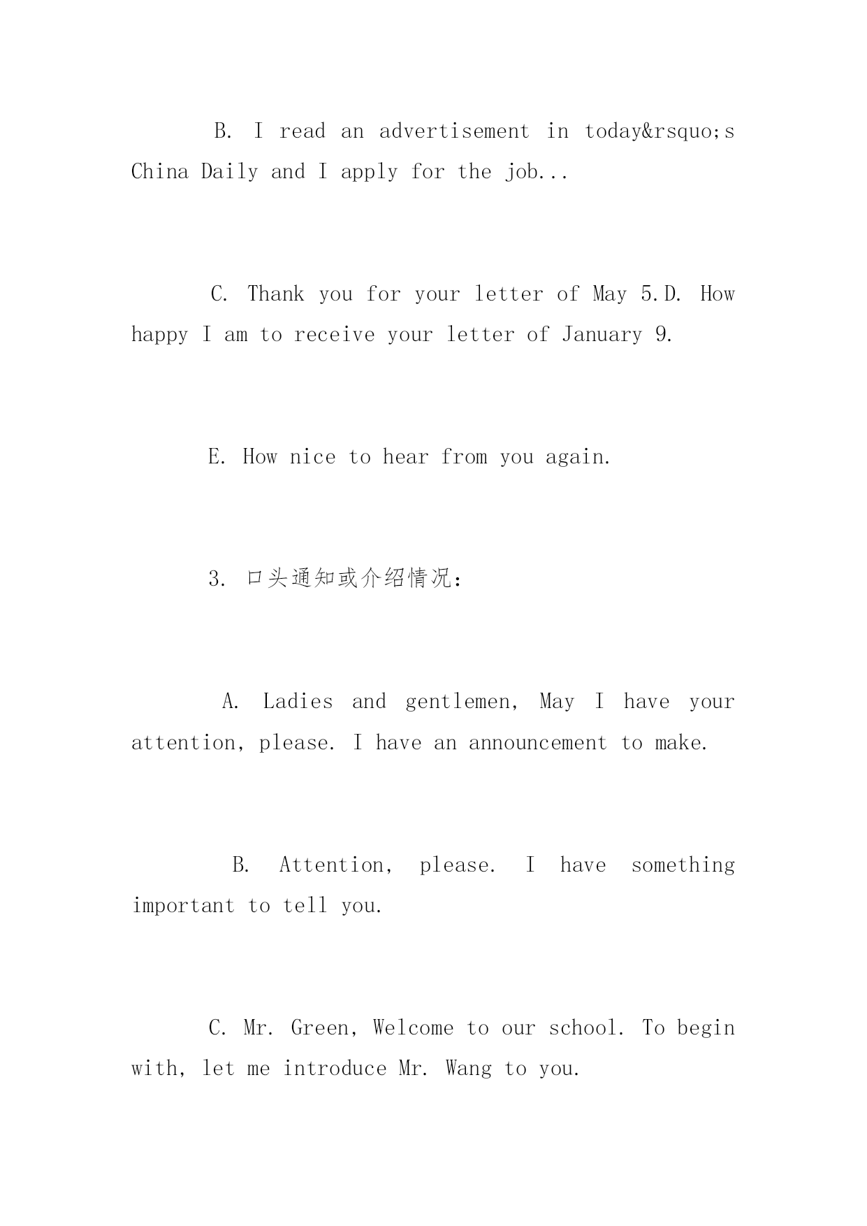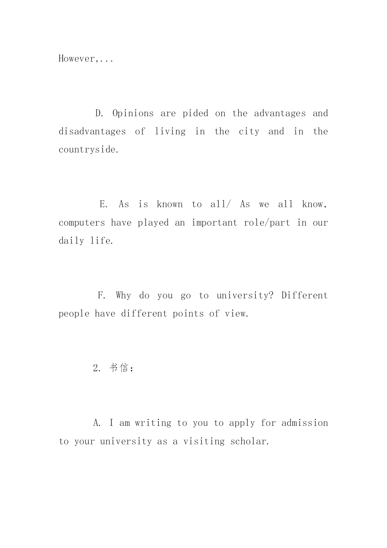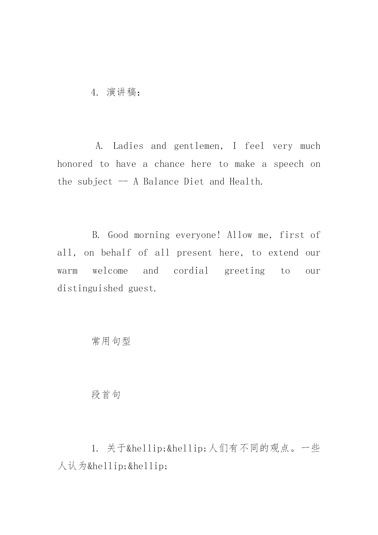高考英语作文常用句式高考英语作文常用句式推荐高考正在紧张的复习中,下面是小编精心为大家整理的高考英语作文写作句型,希望你喜欢。写作类型有:1.议论论文:A.Justaseverycoinhastwosides,carshavebothadvantagesanddisadvantages.B.Comparedto/Incomparisonwithletters,e-mailsaremoreconvenient.C.Whenitcomestocomputers,somepeoplethinktheyhavebroughtusalotofconvenience.However,...D.Opinionsarepidedontheadvantagesanddisadvantagesoflivinginthecityandinthecountryside.E.Asisknowntoall/Asweallknow,computershaveplayedanimportantrole/partinourdailylife.F.Whydoyougotouniversity?Differentpeoplehavedifferentpointsofview.2.书信:A.Iamwritingtoyoutoapplyforadmissiontoyouruniversityasavisitingscholar.B.Ireadanadvertisementintoday’sChinaDailyandIapplyforthejob...C.ThankyouforyourletterofMay5.D.HowhappyIamtoreceiveyourletterofJanuary9.E.Hownicetohearfromyouagain.3.口头通知或介绍情况:A.Ladiesandgentlemen,MayIhaveyourattention,please.Ihaveanannouncementtomake.B.Attention,please.Ihavesomethingimportanttotellyou.C.Mr.Green,Welcometoourschool.Tobeginwith,letmeintroduceMr.Wangtoyou.4.演讲稿:A.Ladiesandgentlemen,Ifeelverymuchhonoredtohaveachanceheretomakeaspeechonthesubject--ABalanceDietandHealth.B.Goodmorningeveryone!Allowme,firstofall,onbehalfofallpresenthere,toextendourwarmwelcomeandcordialgreetingtoourdistinguishedguest.常用句型段首句1.关于……人们有不同的观点。一些人认为……Therearedifferentopinionsamongpeopleasto……Somepeoplesuggestthat……2.俗话说(常言道)……,它是我们前辈的经历,但是,即使在今天,它在许多场合仍然适用。Thereisanoldsaying……It'stheexperienceofourforefathers,however,itiscorrectinmanycaseseventoday.3.现在,……,它们给我们的日常生活带来了许多危害。首先,……;其次,……。更为糟糕的是……。Today,……whichhavebroughtalotofharmsinourdailylife.First,……Second,……Whatmakesthingsworseisthat…….4.现在,……很普遍,许多人喜欢……,因为……,另外(而且)……。Nowadays,itiscommonto…….Manypeoplelike……because&hell