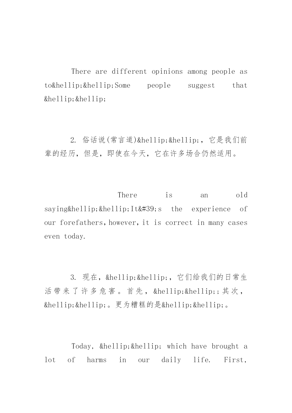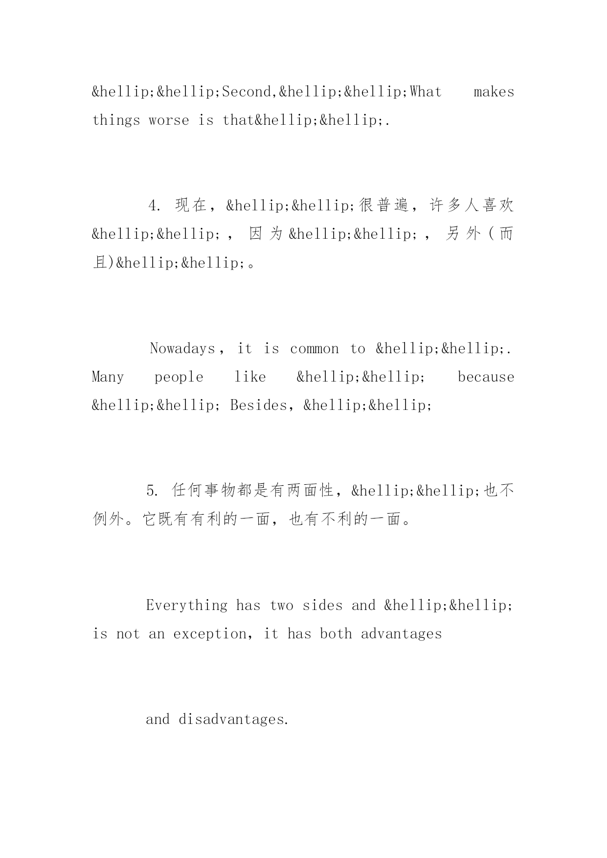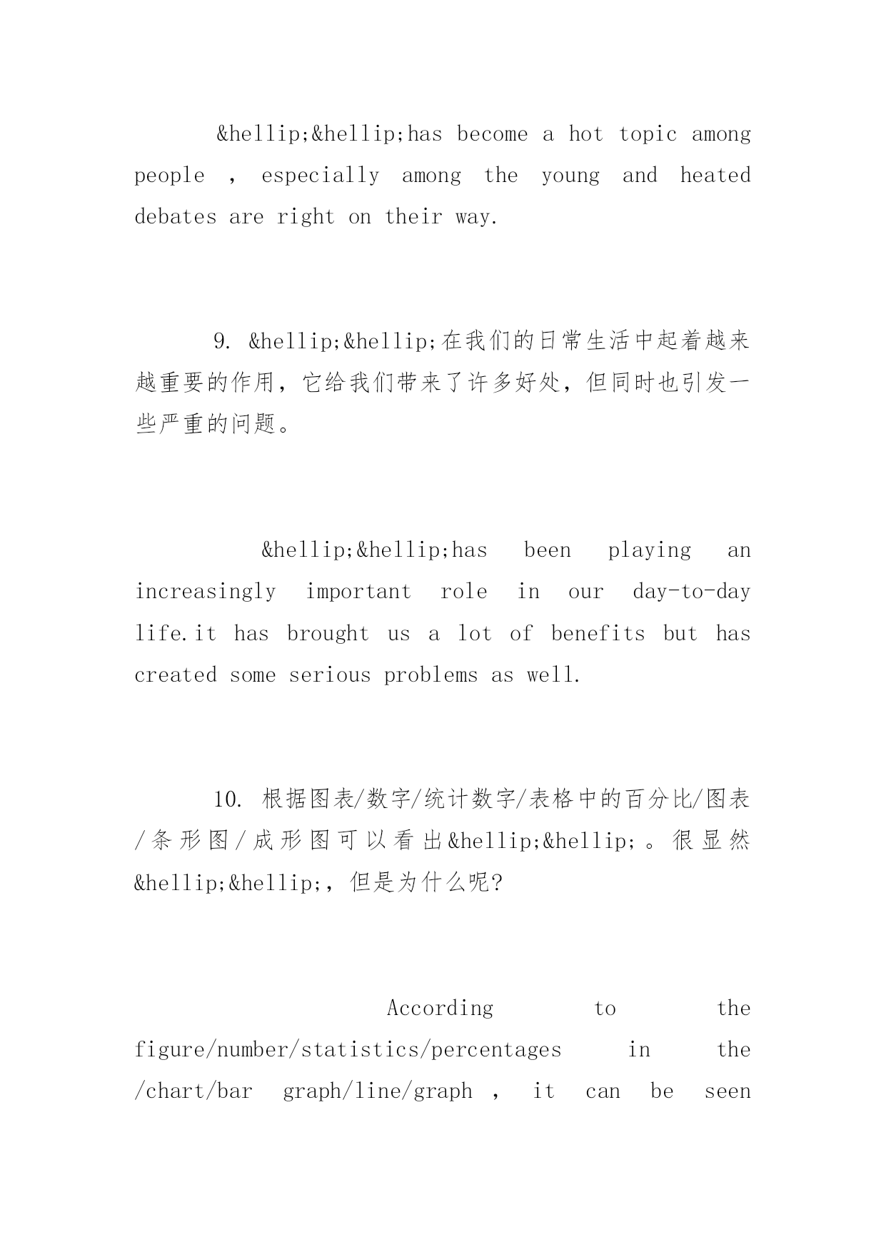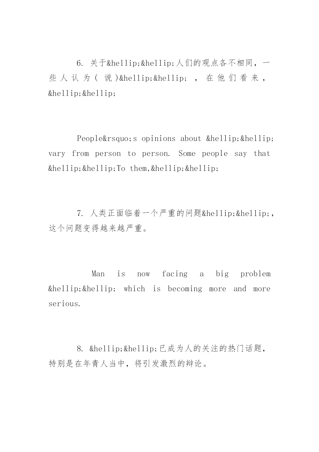 高考英语作文常用句式高考英语作文常用句式推荐高考正在紧张的复习中,下面是小编精心为大家整理的高考英语作文写作句型,希望你喜欢。写作类型有:1.议论论文:A.Justaseverycoinhastwosides,carshavebothadvantagesanddisadvantages.B.Comparedto/Incomparisonwithletters,e-mailsaremoreconvenient.C.Whenitcomestocomputers,somepeoplethinktheyhavebroughtusalotofconvenience.However,...D.Opinionsarepidedontheadvantagesanddisadvantagesoflivinginthecityandinthecountryside.E.Asisknowntoall/Asweallknow,computershaveplayedanimportantrole/partinourdailylife.F.Whydoyougotouniversity?Differentpeoplehavedifferentpointsofview.2.书信:A.Iamwritingtoyoutoapplyforadmissiontoyouruniversityasavisitingscholar.B.Ireadanadvertisementintoday’sChinaDailyandIapplyforthejob...C.ThankyouforyourletterofMay5.D.HowhappyIamtoreceiveyourletterofJanuary9.E.Hownicetohearfromyouagain.3.口头通知或介绍情况:A.Ladiesandgentlemen,MayIhaveyourattention,please.Ihaveanannouncementtomake.B.Attention,please.Ihavesomethingimportanttotellyou.C.Mr.Green,Welcometoourschool.Tobeginwith,letmeintroduceMr.Wangtoyou.4.演讲稿:A.Ladiesandgentlemen,Ifeelverymuchhonoredtohaveachanceheretomakeaspeechonthesubject--ABalanceDietandHealth.B.Goodmorningeveryone!Allowme,firstofall,onbehalfofallpresenthere,toextendourwarmwelcomeandcordialgreetingtoourdistinguishedguest.常用句型段首句1.关于……人们有不同的观点。一些人认为……Therearedifferentopinionsamongpeopleasto……Somepeoplesuggestthat……2.俗话说(常言道)……,它是我们前辈的经历,但是,即使在今天,它在许多场合仍然适用。Thereisanoldsaying……It'stheexperienceofourforefathers,however,itiscorrectinmanycaseseventoday.3.现在,……,它们给我们的日常生活带来了许多危害。首先,……;其次,……。更为糟糕的是……。Today,……whichhavebroughtalotofharmsinourdailylife.First,……Second,……Whatmakesthingsworseisthat…….4.现在,……很普遍,许多人喜欢……,因为……,另外(而且)……。Nowadays,itiscommonto…….Manypeoplelike……because&hell