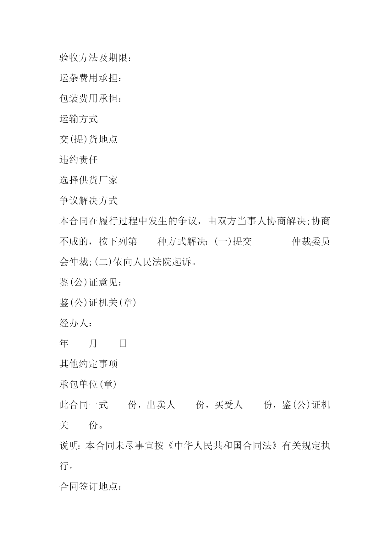 编号:山西省煤矿机电产品买卖合同甲方乙方签订日期年月日(本合同为Word格式,下载后可根据您的需要调整内容及格式,欢迎下载。)买受人编号:________________合同编号:________________设备(配件)名称计量单位数量要求交货期合同单价(万元)单价:合同交货期总价:主辅机型号规格:买受人出卖人订货单位供货单位单项工程通讯地址帐号质量标准:质量保证期:防爆检验合格证号:验收方法及期限:运杂费用承担:包装费用承担:运输方式交(提)货地点违约责任选择供货厂家争议解决方式本合同在履行过程中发生的争议,由双方当事人协商解决;协商不成的,按下列第种方式解决:(一)提交仲裁委员会仲裁;(二)依向人民法院起诉。鉴(公)证意见:鉴(公)证机关(章)经办人:年月日其他约定事项承包单位(章)此合同一式份,出卖人份,买受人份,鉴(公)证机关份。说明:本合同未尽事宜按《中华人民共和国合同法》有关规定执行。合同签订地点:_____________________合同签订时间:______年_____月____日监制部门:_________________________印制单位:_________________________