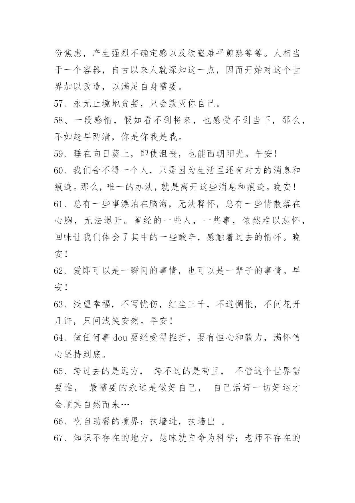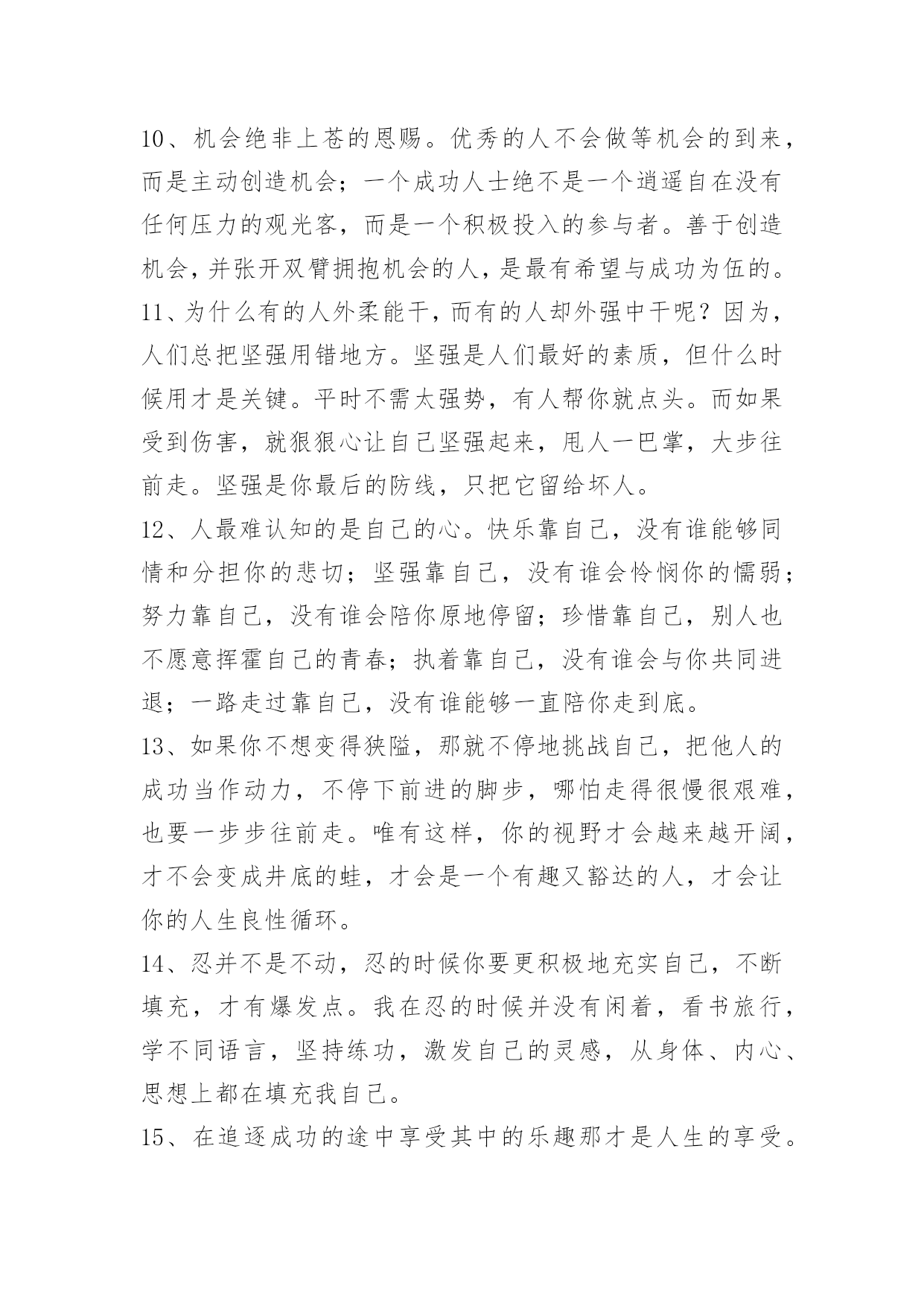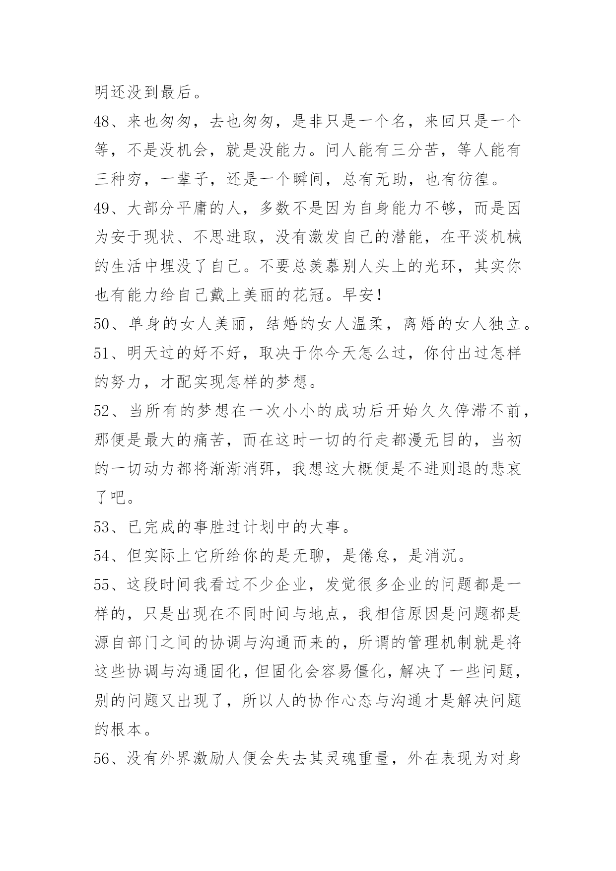 工作励志语录69条【热门】工作励志语录合集69条世上没有一件工作不辛苦,没有一处人事不复杂。即使你再排斥现在的不愉快,光阴也不会过得慢点。下面是小编给各位读者分享的工作励志语录69条,供各位参考。1、第一,你能尊重多少人,就有多少人尊重你;第二,你能信任多少人,就有多少人信任你;第三,你能跟多少人协作,就有多少人跟你协作;第四,你能让多少人成功,就有多少人帮助你成功。2、别人说你是成功的,它一定是过去时,一定是昨天的,今天要做的是追求比昨天更高的目标。当一个人站上冠军领奖台上的一瞬间,他已经不再是冠军,而是必须要为下一个冠军而努力。——张瑞敏(海尔集团首席执行官)3、无数事实告诉我们,不少人成就了一番事业,他们的成功就在于他们及时的行动。准备好了,请赶紧行动没准备好,也请不要耽搁.不再等待,前行前行!4、志当存高远一个人追求的目标越高,他的才能就发展得越快,对社会就越有益,我确信这也是一个真理。高尔基目的是引导万物前进之母立志是一件很重要的事情。工作随着志向走,成功随着工作来,这是一定的规律。立志,工作,成功是人类活动的三大要素。立志是事业的大门,工作是登堂入室的旅程。这旅程的尽头就有成功在等待着,来庆祝你的努力结果。5、曾经,我认为,我们这一生很长很长,总会爱很多很多人。后来我才发现,不管时间如何张牙舞爪,光阴如何死去活来,最后你记忆里所能铭记的爱人其实只有两个,一个他爱你,一个你爱他。6、早期教育是必要的,但不要变成早期摧残,要做童年的捍卫者。无为乃大为。也就是说,要以平常心对待孩子,越是焦虑越不利于孩子的心理健康。孩子有许多敏感期或关键期,都需要适时给以指导和帮助,给他成功体验的机会,但一切都要用尊重的方式来进行。7、罗斯福家失盗后对朋友说:亲爱的朋友,谢谢你来信安慰我,我现在很平安。感谢上帝:因为第一,贼偷去的是我的东西,而没有伤害我的生命;第二,贼只偷去我部分东西,而不是全部;第三,最值得庆幸的是,做贼的是他,而不是我。失盗本是件不幸的事,而罗斯福却找出了感恩的理由。8、别人再好,关我什么事。我再不好,关别人什么事。我可以笑着给你讲道理,也可以翻脸告诉你什么叫规矩。我就是我,至于你怎么看我,既不需要,也没必要。9、弯得下腰,才抬得起头。在人生路上,不是所有的门都很宽阔,有的门需要你弯腰侧身才进得去。所以,必要时要能够弯得下自己的腰,才可能在人生路上畅通无阻。抬头需要底气,弯腰需要勇气。每个人的生存空间都是有限的.,一味高昂着头,必然要碰得头破血流。能够适时地弯下腰,才是人生大智慧。10、机会绝非上苍的恩赐。优秀的人不会做等机会的到来,而是主动创造机会;一个成功人士绝不是一个逍遥自在没有任何压力的观光客,而是一个积极投入的参与者。善于创造机会,并张开双臂拥抱机会的人,是最有希望与成功为伍的。11、为什么有的人外柔能干,而有的人却外强中干呢?因为,人们总把坚强用错地方。坚强是人们最好的素质,但什么时候用才是关键。平时不需太强势,有人帮你就点头。而如果受到伤害,就狠狠心让自己坚强起来,甩人一巴掌,大步往前走。坚强是你最后的防线,只把它留给坏人。12、人最难认知的是自己的心。快乐靠自己,没有谁能够同情和分担你的悲切;坚强靠自己,没有谁会怜悯你的懦弱;努力靠自己,没有谁会陪你原地停留;珍惜靠自己,别人也不愿意挥霍自己的青春;执着靠自己,没有谁会与你共同进退;一路走过靠自己,没有谁能够一直陪你走到底。13、如果你不想变得狭隘,那就不停地挑战自己,把他人的成功当作动力,不停下前进的脚步,哪怕走得很慢很艰难,也要一步步往前走。唯有这样,你的视野才会越来越开阔,才不会变成井底的蛙,才会是一个有趣又豁达的人,才会让你的人生良性循环。14、忍并不是不动,忍的时候你要更积极地充实自己,不断填充,才有爆发点。我在忍的时候并没有闲着,看书旅行,学不同语言,坚持练功,激发自己的灵感,从身体、内心、思想上都在填充我自己。15、在追逐成功的途中享受其中的乐趣那才是人生的享受。16、"耐烦"是一种韧劲,一种谋略。"耐烦"也是一种本事。个人不能"耐烦",光有智慧和经验还不能成就大事。17、我可能什么都想要:那每回无限旋落的黑暗以及每一个步伐升盈令人战栗的光辉。18、心里一撮小火,身体离地半尺,不做蝼蚁,不做神,做个写字的人。19、痛苦就是财富,这句话就是扯淡,认真的思考痛苦才是财富。当一个人给你的除了痛苦还是痛苦你就该考虑,你的坚持是不是正确的。20、风风雨雨弘法,平平常常念佛;安安静静往生,自自然然成佛。21、人生最重要的价值是心灵的幸福,而不是任何身外之物;谈谈个人修养22、物质是生活的食粮,精神是幸福的食粮。23、亲友之间大多只能同患难,却不能共享福。老板和员工之间,则大多只能同享福,却不能共患难。24、给冬天换一种心情是暖和的,给雨天换一种心