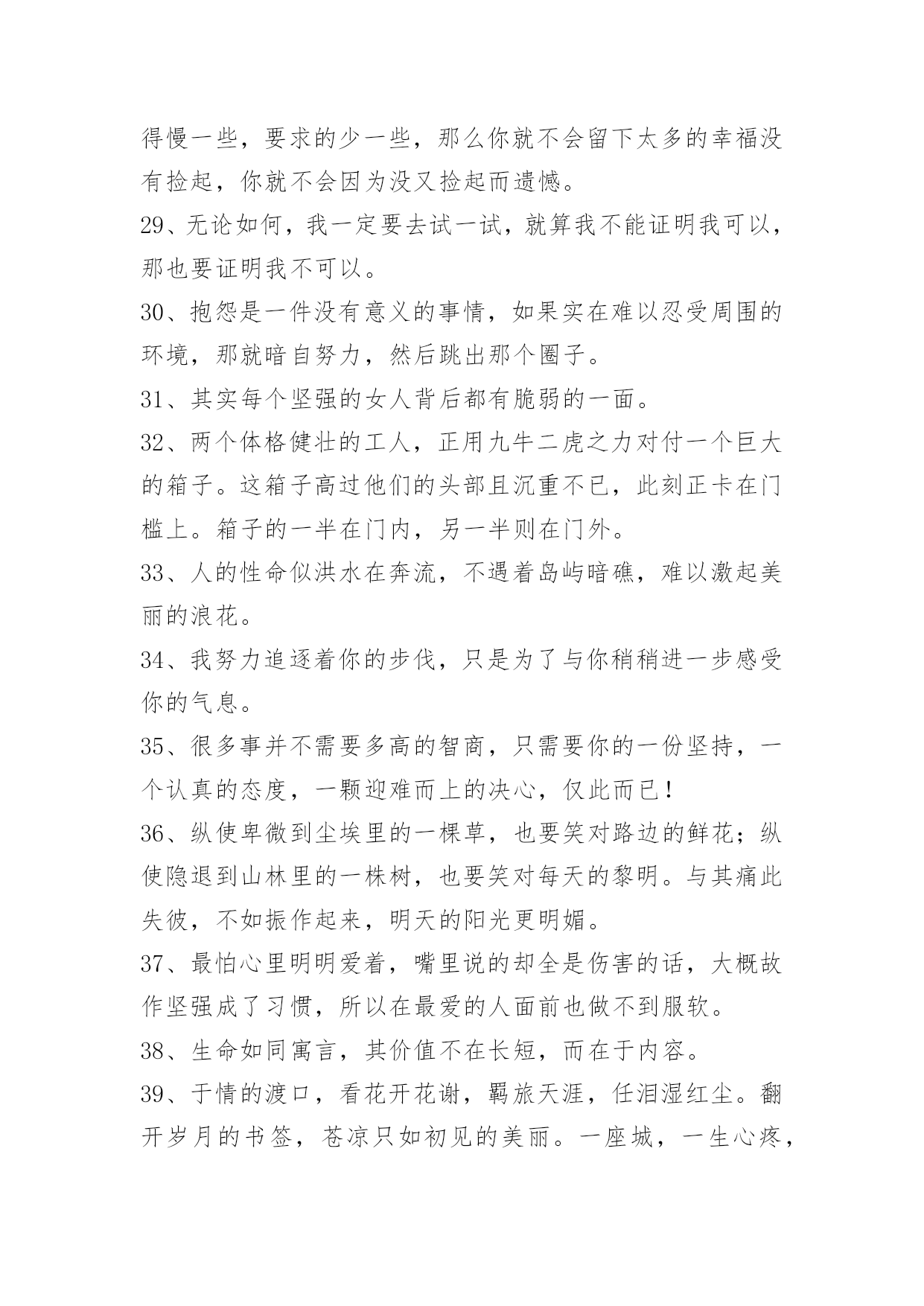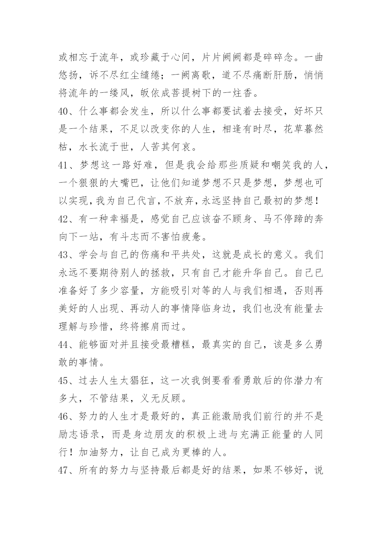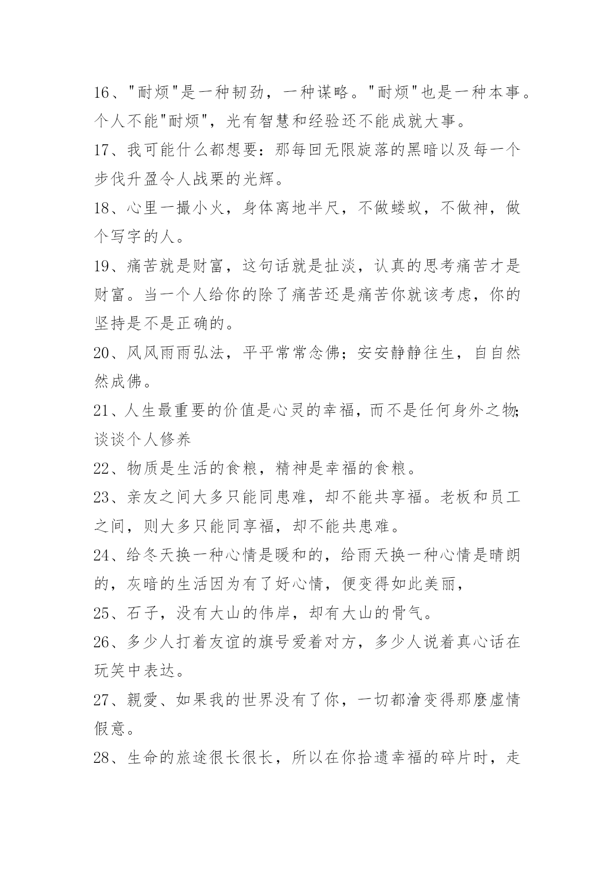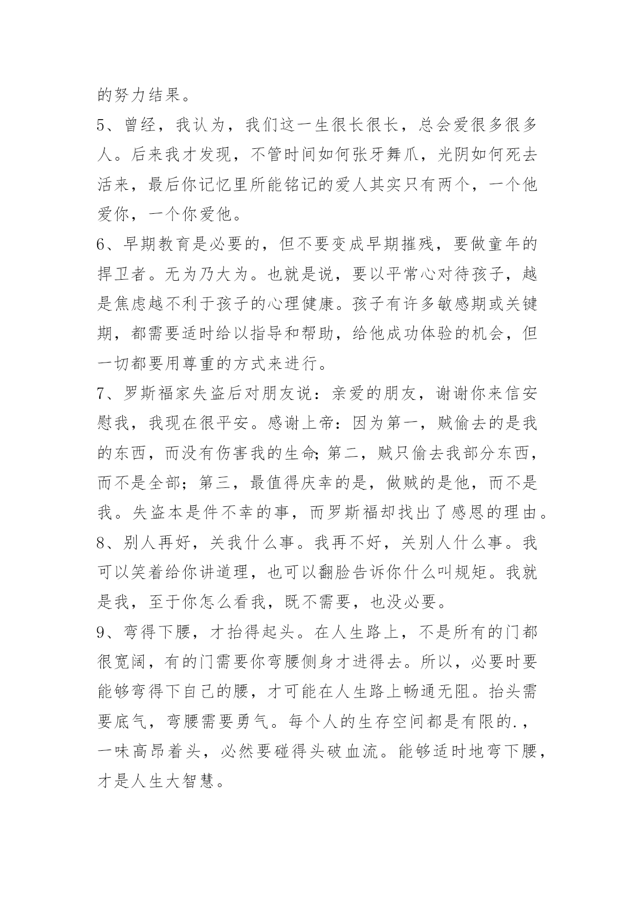 工作励志语录69条【热门】工作励志语录合集69条世上没有一件工作不辛苦,没有一处人事不复杂。即使你再排斥现在的不愉快,光阴也不会过得慢点。下面是小编给各位读者分享的工作励志语录69条,供各位参考。1、第一,你能尊重多少人,就有多少人尊重你;第二,你能信任多少人,就有多少人信任你;第三,你能跟多少人协作,就有多少人跟你协作;第四,你能让多少人成功,就有多少人帮助你成功。2、别人说你是成功的,它一定是过去时,一定是昨天的,今天要做的是追求比昨天更高的目标。当一个人站上冠军领奖台上的一瞬间,他已经不再是冠军,而是必须要为下一个冠军而努力。——张瑞敏(海尔集团首席执行官)3、无数事实告诉我们,不少人成就了一番事业,他们的成功就在于他们及时的行动。准备好了,请赶紧行动没准备好,也请不要耽搁.不再等待,前行前行!4、志当存高远一个人追求的目标越高,他的才能就发展得越快,对社会就越有益,我确信这也是一个真理。高尔基目的是引导万物前进之母立志是一件很重要的事情。工作随着志向走,成功随着工作来,这是一定的规律。立志,工作,成功是人类活动的三大要素。立志是事业的大门,工作是登堂入室的旅程。这旅程的尽头就有成功在等待着,来庆祝你的努力结果。5、曾经,我认为,我们这一生很长很长,总会爱很多很多人。后来我才发现,不管时间如何张牙舞爪,光阴如何死去活来,最后你记忆里所能铭记的爱人其实只有两个,一个他爱你,一个你爱他。6、早期教育是必要的,但不要变成早期摧残,要做童年的捍卫者。无为乃大为。也就是说,要以平常心对待孩子,越是焦虑越不利于孩子的心理健康。孩子有许多敏感期或关键期,都需要适时给以指导和帮助,给他成功体验的机会,但一切都要用尊重的方式来进行。7、罗斯福家失盗后对朋友说:亲爱的朋友,谢谢你来信安慰我,我现在很平安。感谢上帝:因为第一,贼偷去的是我的东西,而没有伤害我的生命;第二,贼只偷去我部分东西,而不是全部;第三,最值得庆幸的是,做贼的是他,而不是我。失盗本是件不幸的事,而罗斯福却找出了感恩的理由。8、别人再好,关我什么事。我再不好,关别人什么事。我可以笑着给你讲道理,也可以翻脸告诉你什么叫规矩。我就是我,至于你怎么看我,既不需要,也没必要。9、弯得下腰,才抬得起头。在人生路上,不是所有的门都很宽阔,有的门需要你弯腰侧身才进得去。所以,必要时要能够弯得下自己的腰,才可能在人生路上畅通无阻。抬头需要底气,弯腰需要勇气。每个人的生存空间都是有限的.,一味高昂着头,必然要碰得头破血流。能够适时地弯下腰,才是人生大智慧。10、机会绝非上苍的恩赐。优秀的人不会做等机会的到来,而是主动创造机会;一个成功人士绝不是一个逍遥自在没有任何压力的观光客,而是一个积极投入的参与者。善于创造机会,并张开双臂拥抱机会的人,是最有希望与成功为伍的。11、为什么有的人外柔能干,而有的人却外强中干呢?因为,人们总把坚强用错地方。坚强是人们最好的素质,但什么时候用才是关键。平时不需太强势,有人帮你就点头。而如果受到伤害,就狠狠心让自己坚强起来,甩人一巴掌,大步往前走。坚强是你最后的防线,只把它留给坏人。12、人最难认知的是自己的心。快乐靠自己,没有谁能够同情和分担你的悲切;坚强靠自己,没有谁会怜悯你的懦弱;努力靠自己,没有谁会陪你原地停留;珍惜靠自己,别人也不愿意挥霍自己的青春;执着靠自己,没有谁会与你共同进退;一路走过靠自己,没有谁能够一直陪你走到底。13、如果你不想变得狭隘,那就不停地挑战自己,把他人的成功当作动力,不停下前进的脚步,哪怕走得很慢很艰难,也要一步步往前走。唯有这样,你的视野才会越来越开阔,才不会变成井底的蛙,才会是一个有趣又豁达的人,才会让你的人生良性循环。14、忍并不是不动,忍的时候你要更积极地充实自己,不断填充,才有爆发点。我在忍的时候并没有闲着,看书旅行,学不同语言,坚持练功,激发自己的灵感,从身体、内心、思想上都在填充我自己。15、在追逐成功的途中享受其中的乐趣那才是人生的享受。16、"耐烦"是一种韧劲,一种谋略。"耐烦"也是一种本事。个人不能"耐烦",光有智慧和经验还不能成就大事。17、我可能什么都想要:那每回无限旋落的黑暗以及每一个步伐升盈令人战栗的光辉。18、心里一撮小火,身体离地半尺,不做蝼蚁,不做神,做个写字的人。19、痛苦就是财富,这句话就是扯淡,认真的思考痛苦才是财富。当一个人给你的除了痛苦还是痛苦你就该考虑,你的坚持是不是正确的。20、风风雨雨弘法,平平常常念佛;安安静静往生,自自然然成佛。21、人生最重要的价值是心灵的幸福,而不是任何身外之物;谈谈个人修养22、物质是生活的食粮,精神是幸福的食粮。23、亲友之间大多只能同患难,却不能共享福。老板和员工之间,则大多只能同享福,却不能共患难。24、给冬天换一种心情是暖和的,给雨天换一种心