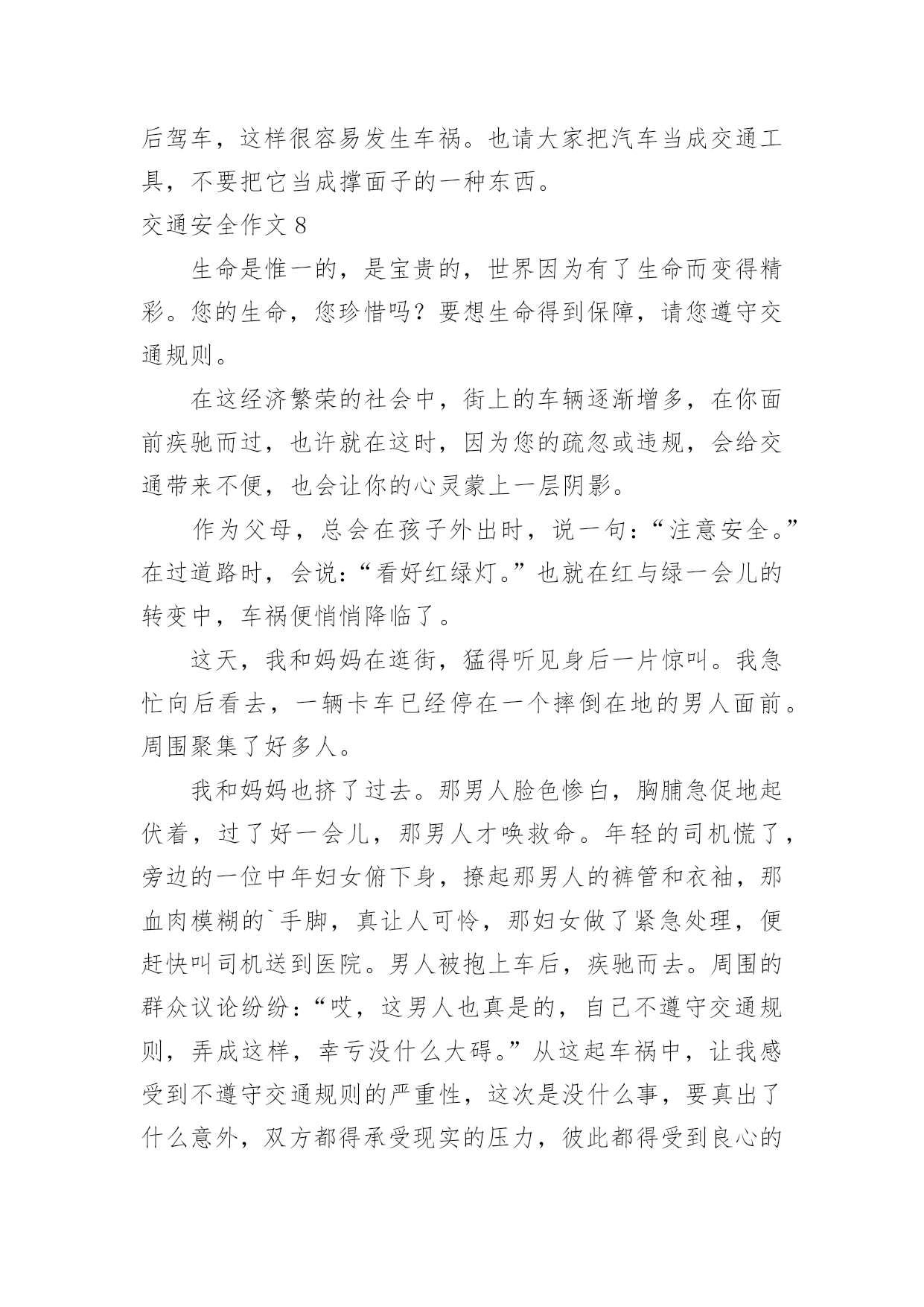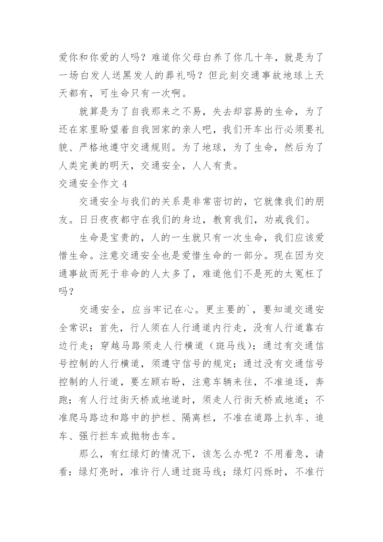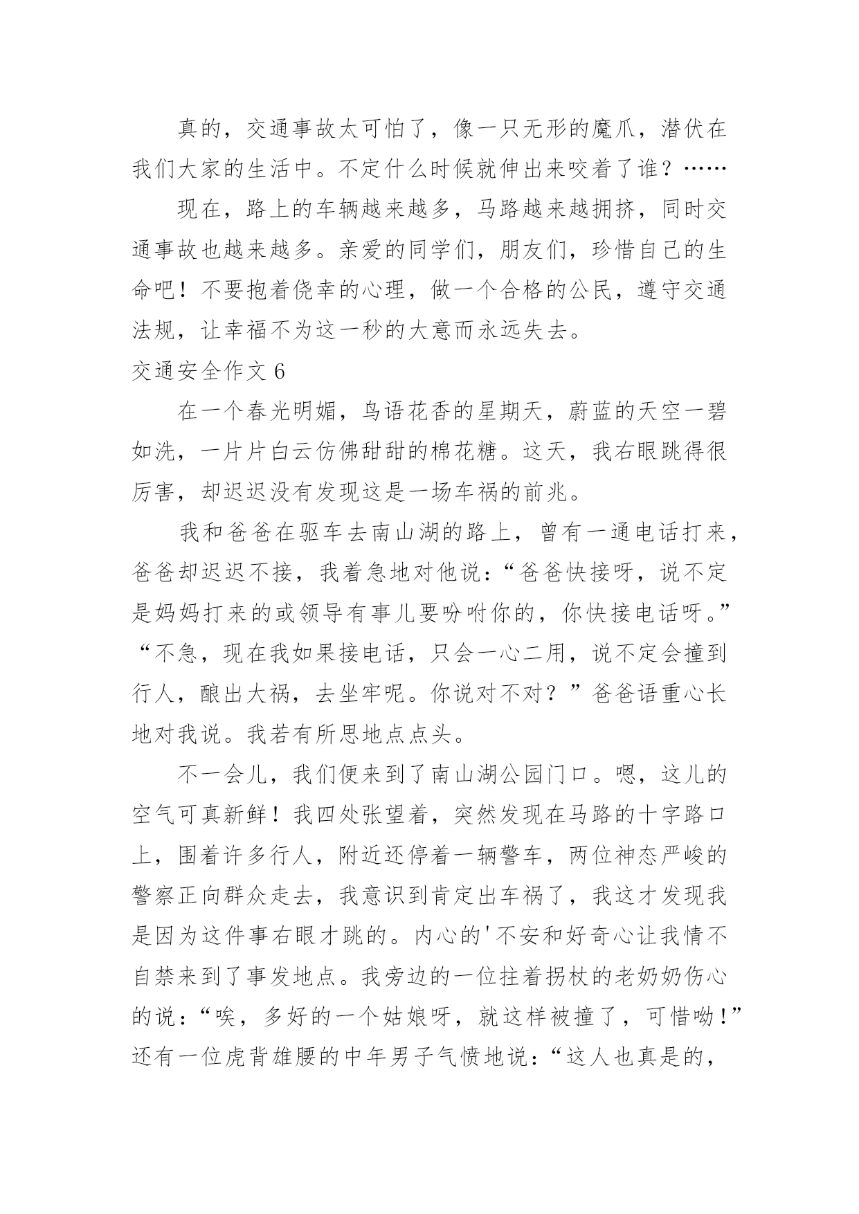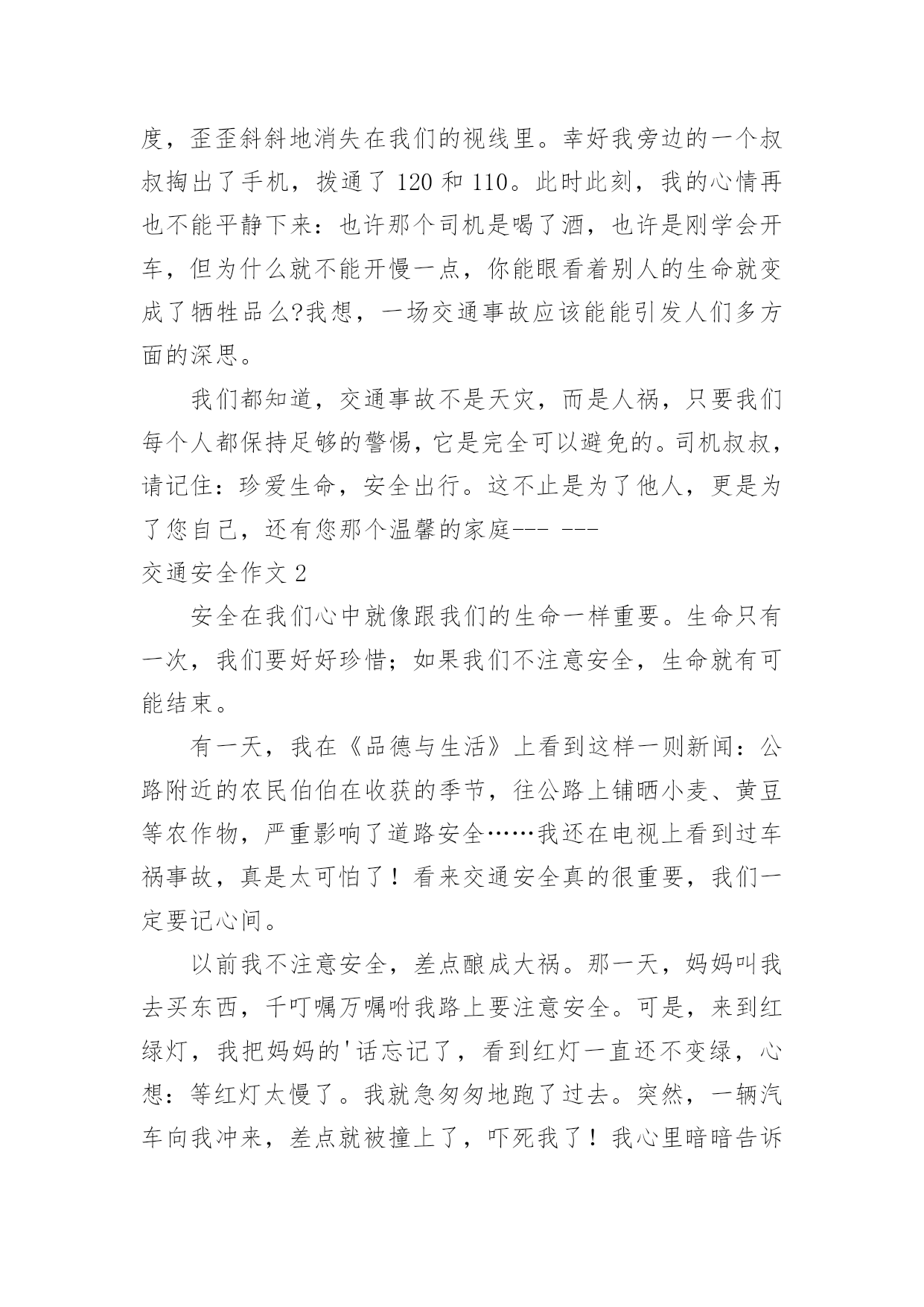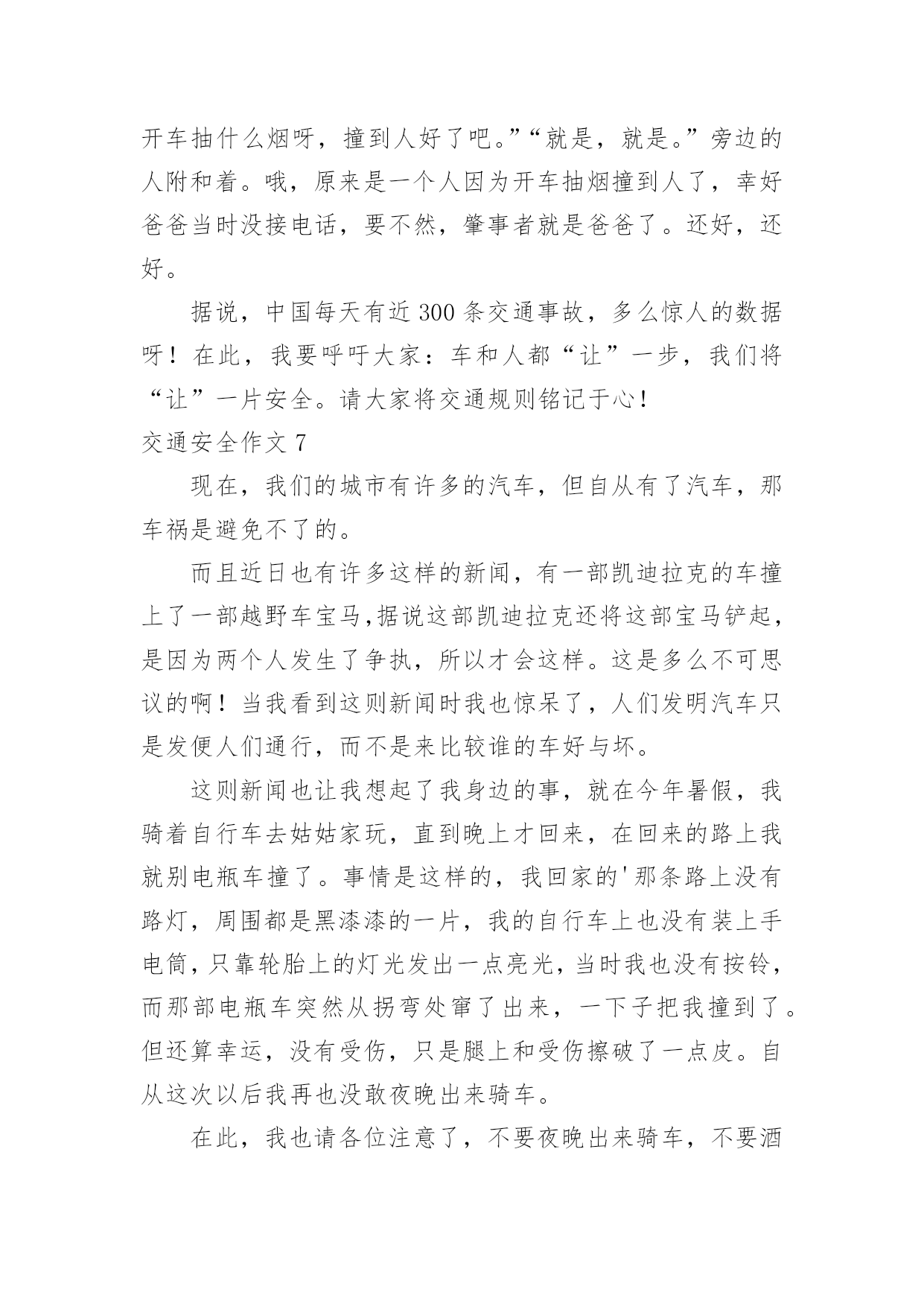 交通安全作文交通安全作文在学习、工作、生活中,大家对作文都再熟悉不过了吧,作文可分为小学作文、中学作文、大学作文(论文)。还是对作文一筹莫展吗?下面是小编为大家整理的交通安全作文,仅供参考,希望能够帮助到大家。交通安全作文1我国每天都会因为交通事故而造成人员伤亡,这带给我们鲜血般的教训实在是太多了。尽管这警钟时时刻刻都在人们的耳边回响,但还是有很多人没有引以为戒。上个星期我就亲眼目睹了一起交通事故,那惨不忍睹的场面至今还清晰地呈现在我的眼前。那天是又休日,难得又休闲一天,我和小伙伴们兴高采烈地在宽广的大路边玩,还不时地对我们这个小镇的秀美景色发出赞叹。我们的心情都好极了,不料悲剧就在这个时候发生了。只听“嗖”的一声,一辆黑色的小汽车从我们身边飞驰而过。我急忙闪到一边。我虽然躲过了,可在我前面不远的一位头发苍白的老奶奶由于躲避不及,应声倒在了血泊之中,生命垂垂可危。面对这突如其来的`一切,我惊讶得合不拢嘴。这时,我以为那肇事者会停下来,马上送老奶奶去医院,但这个丧心病狂的司机并没有及时停下来,反而更加快了速度,歪歪斜斜地消失在我们的视线里。幸好我旁边的一个叔叔掏出了手机,拨通了120和110。此时此刻,我的心情再也不能平静下来:也许那个司机是喝了酒,也许是刚学会开车,但为什么就不能开慢一点,你能眼看着别人的生命就变成了牺牲品么?我想,一场交通事故应该能能引发人们多方面的深思。我们都知道,交通事故不是天灾,而是人祸,只要我们每个人都保持足够的警惕,它是完全可以避免的。司机叔叔,请记住:珍爱生命,安全出行。这不止是为了他人,更是为了您自己,还有您那个温馨的家庭------交通安全作文2安全在我们心中就像跟我们的生命一样重要。生命只有一次,我们要好好珍惜;如果我们不注意安全,生命就有可能结束。有一天,我在《品德与生活》上看到这样一则新闻:公路附近的农民伯伯在收获的季节,往公路上铺晒小麦、黄豆等农作物,严重影响了道路安全……我还在电视上看到过车祸事故,真是太可怕了!看来交通安全真的很重要,我们一定要记心间。以前我不注意安全,差点酿成大祸。那一天,妈妈叫我去买东西,千叮嘱万嘱咐我路上要注意安全。可是,来到红绿灯,我把妈妈的'话忘记了,看到红灯一直还不变绿,心想:等红灯太慢了。我就急匆匆地跑了过去。突然,一辆汽车向我冲来,差点就被撞上了,吓死我了!我心里暗暗告诉自己以后要小心,不能像今天这样。我也要提醒开车的大人们,开车不玩手机,不打电话;喝酒不开车;红灯停,绿灯行,黄灯到了停一停。还有小朋友们不在马路上奔跑,过马路要走斑马线,要左右两边看。“生命诚可贵,交通安全记心间。”大家都知道要注意安全,但不要只是把“安全”挂在嘴边,而是付诸于行动上。交通安全作文3这个词,相信你有我这么大都就应听说过的了,这个词,从改革开放以来就被电视台新闻播音员说过千百遍了,可我这天还是要说。交通不安全意味着什么吗?意味着人们将会像第二次世界大战中的老百姓一样悲惨地失去生命。生命,你明白个词有多重要吗?然后这是用金子也买不来的,你担当得起吗?此刻世界真是发展得越来越快了,人类还早在几百年前发明了能使世界各地变“小”的机械交通工具,像飞机此刻都超音速了呢。先不说大的,在我们生活的城市,到处都飞驰着一辆辆帅气的小汽车,为主人们服务。聪明的人们明白科技是一把“双刃剑”,然后为了让小汽车们懂得互相谦让,还同时发明了交通规则。但是有的小汽车为贪一时的.痛快而去冒险,去违反保护自我生命的交通规则,我还是宁愿没有汽车、飞机还好呢。如果是对交通规则有推荐,能够提出,而不要用行动来把警察吸引过来教育你,这样做不仅仅危险,可能还会把命搭上,你也不想想这样做值吗?人能够救车、救钱,可就是救不了人啊,先不说你自我,你想想你对得起爱你和你爱的人吗?难道你父母白养了你几十年,就是为了一场白发人送黑发人的葬礼吗?但此刻交通事故地球上天天都有,可生命只有一次啊。就算是为了自我那来之不易,失去却容易的生命,为了还在家里盼望着自我回家的亲人吧,我们开车出行必须要礼貌、严格地遵守交通规则。为了地球,为了生命,然后为了人类完美的明天,交通安全,人人有责。交通安全作文4交通安全与我们的关系是非常密切的,它就像我们的朋友。日日夜夜都守在我们的身边,教育我们,劝戒我们。生命是宝贵的,人的一生就只有一次生命,我们应该爱惜生命。注意交通安全也是爱惜生命的一部分。现在因为交通事故而死于非命的人太多了,难道他们不是死的太冤枉了吗?交通安全,应当牢记在心。更主要的`,要知道交通安全常识:首先,行人须在人行通道内行走,没有人行道靠右边行走;穿越马路须走人行横道(斑马线);通过有交通信号控制的人行横道,须遵守信号的规定;通过没有交通信号控制的人行道,要左顾右盼,注意车辆来往,不准追逐,奔跑;有人行过街天桥或地道时,须走