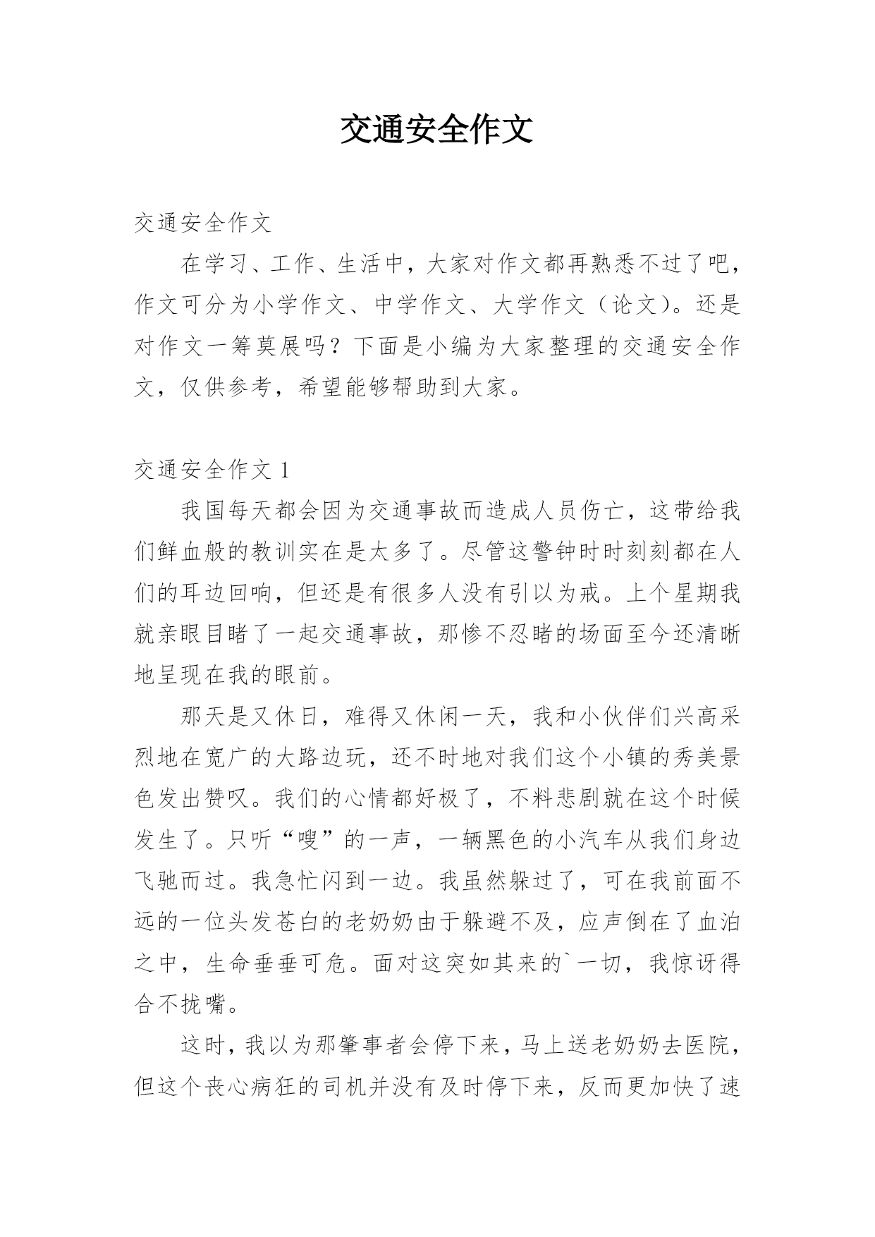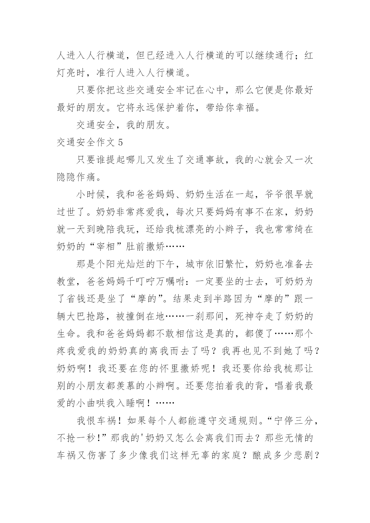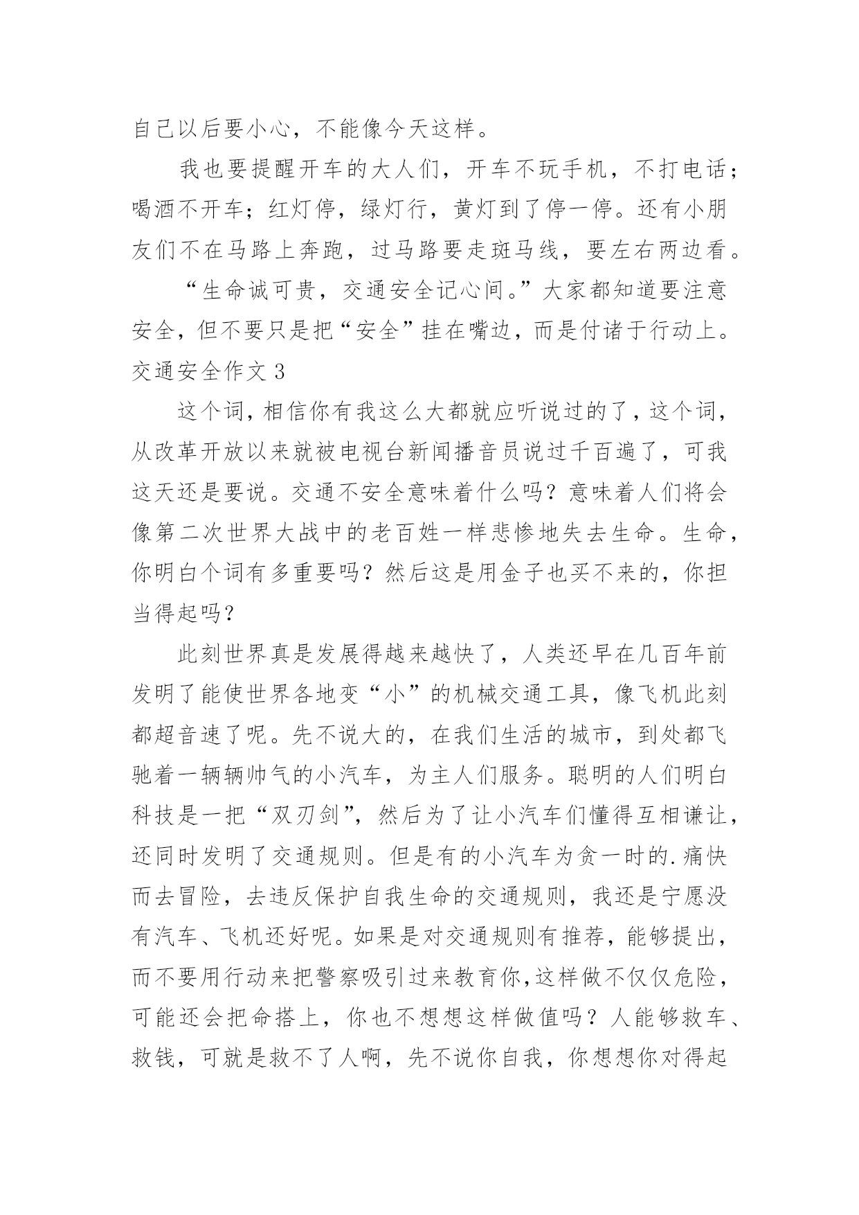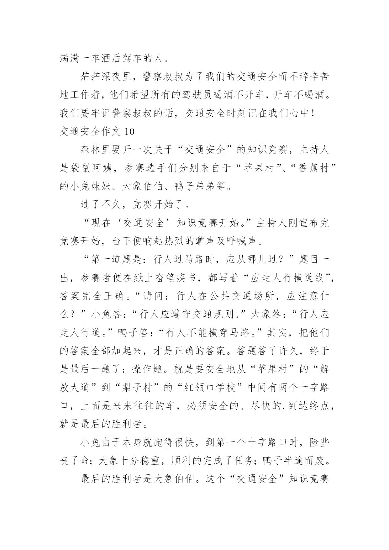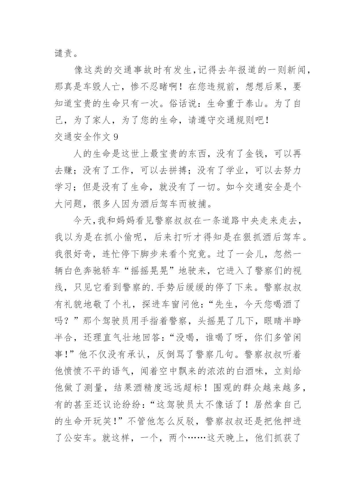 交通安全作文交通安全作文在学习、工作、生活中,大家对作文都再熟悉不过了吧,作文可分为小学作文、中学作文、大学作文(论文)。还是对作文一筹莫展吗?下面是小编为大家整理的交通安全作文,仅供参考,希望能够帮助到大家。交通安全作文1我国每天都会因为交通事故而造成人员伤亡,这带给我们鲜血般的教训实在是太多了。尽管这警钟时时刻刻都在人们的耳边回响,但还是有很多人没有引以为戒。上个星期我就亲眼目睹了一起交通事故,那惨不忍睹的场面至今还清晰地呈现在我的眼前。那天是又休日,难得又休闲一天,我和小伙伴们兴高采烈地在宽广的大路边玩,还不时地对我们这个小镇的秀美景色发出赞叹。我们的心情都好极了,不料悲剧就在这个时候发生了。只听“嗖”的一声,一辆黑色的小汽车从我们身边飞驰而过。我急忙闪到一边。我虽然躲过了,可在我前面不远的一位头发苍白的老奶奶由于躲避不及,应声倒在了血泊之中,生命垂垂可危。面对这突如其来的`一切,我惊讶得合不拢嘴。这时,我以为那肇事者会停下来,马上送老奶奶去医院,但这个丧心病狂的司机并没有及时停下来,反而更加快了速度,歪歪斜斜地消失在我们的视线里。幸好我旁边的一个叔叔掏出了手机,拨通了120和110。此时此刻,我的心情再也不能平静下来:也许那个司机是喝了酒,也许是刚学会开车,但为什么就不能开慢一点,你能眼看着别人的生命就变成了牺牲品么?我想,一场交通事故应该能能引发人们多方面的深思。我们都知道,交通事故不是天灾,而是人祸,只要我们每个人都保持足够的警惕,它是完全可以避免的。司机叔叔,请记住:珍爱生命,安全出行。这不止是为了他人,更是为了您自己,还有您那个温馨的家庭------交通安全作文2安全在我们心中就像跟我们的生命一样重要。生命只有一次,我们要好好珍惜;如果我们不注意安全,生命就有可能结束。有一天,我在《品德与生活》上看到这样一则新闻:公路附近的农民伯伯在收获的季节,往公路上铺晒小麦、黄豆等农作物,严重影响了道路安全……我还在电视上看到过车祸事故,真是太可怕了!看来交通安全真的很重要,我们一定要记心间。以前我不注意安全,差点酿成大祸。那一天,妈妈叫我去买东西,千叮嘱万嘱咐我路上要注意安全。可是,来到红绿灯,我把妈妈的'话忘记了,看到红灯一直还不变绿,心想:等红灯太慢了。我就急匆匆地跑了过去。突然,一辆汽车向我冲来,差点就被撞上了,吓死我了!我心里暗暗告诉自己以后要小心,不能像今天这样。我也要提醒开车的大人们,开车不玩手机,不打电话;喝酒不开车;红灯停,绿灯行,黄灯到了停一停。还有小朋友们不在马路上奔跑,过马路要走斑马线,要左右两边看。“生命诚可贵,交通安全记心间。”大家都知道要注意安全,但不要只是把“安全”挂在嘴边,而是付诸于行动上。交通安全作文3这个词,相信你有我这么大都就应听说过的了,这个词,从改革开放以来就被电视台新闻播音员说过千百遍了,可我这天还是要说。交通不安全意味着什么吗?意味着人们将会像第二次世界大战中的老百姓一样悲惨地失去生命。生命,你明白个词有多重要吗?然后这是用金子也买不来的,你担当得起吗?此刻世界真是发展得越来越快了,人类还早在几百年前发明了能使世界各地变“小”的机械交通工具,像飞机此刻都超音速了呢。先不说大的,在我们生活的城市,到处都飞驰着一辆辆帅气的小汽车,为主人们服务。聪明的人们明白科技是一把“双刃剑”,然后为了让小汽车们懂得互相谦让,还同时发明了交通规则。但是有的小汽车为贪一时的.痛快而去冒险,去违反保护自我生命的交通规则,我还是宁愿没有汽车、飞机还好呢。如果是对交通规则有推荐,能够提出,而不要用行动来把警察吸引过来教育你,这样做不仅仅危险,可能还会把命搭上,你也不想想这样做值吗?人能够救车、救钱,可就是救不了人啊,先不说你自我,你想想你对得起爱你和你爱的人吗?难道你父母白养了你几十年,就是为了一场白发人送黑发人的葬礼吗?但此刻交通事故地球上天天都有,可生命只有一次啊。就算是为了自我那来之不易,失去却容易的生命,为了还在家里盼望着自我回家的亲人吧,我们开车出行必须要礼貌、严格地遵守交通规则。为了地球,为了生命,然后为了人类完美的明天,交通安全,人人有责。交通安全作文4交通安全与我们的关系是非常密切的,它就像我们的朋友。日日夜夜都守在我们的身边,教育我们,劝戒我们。生命是宝贵的,人的一生就只有一次生命,我们应该爱惜生命。注意交通安全也是爱惜生命的一部分。现在因为交通事故而死于非命的人太多了,难道他们不是死的太冤枉了吗?交通安全,应当牢记在心。更主要的`,要知道交通安全常识:首先,行人须在人行通道内行走,没有人行道靠右边行走;穿越马路须走人行横道(斑马线);通过有交通信号控制的人行横道,须遵守信号的规定;通过没有交通信号控制的人行道,要左顾右盼,注意车辆来往,不准追逐,奔跑;有人行过街天桥或地道时,须走