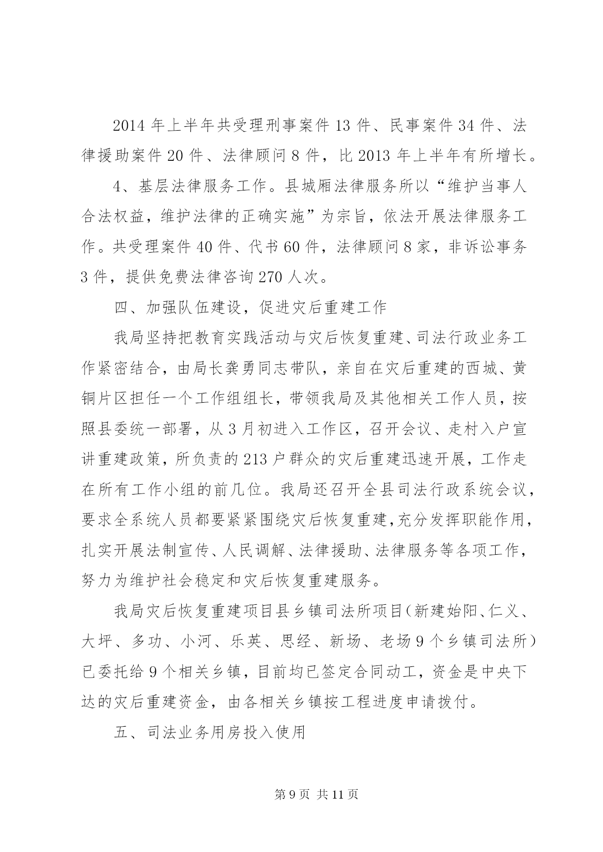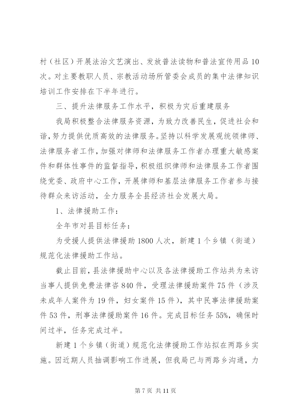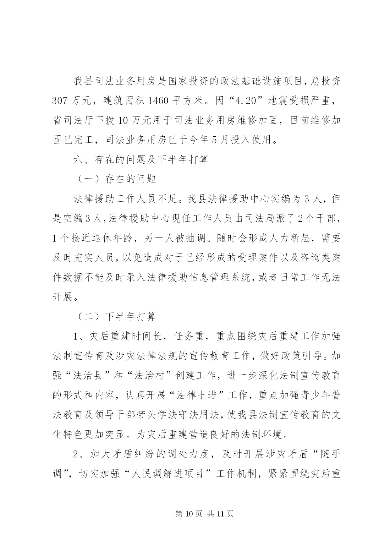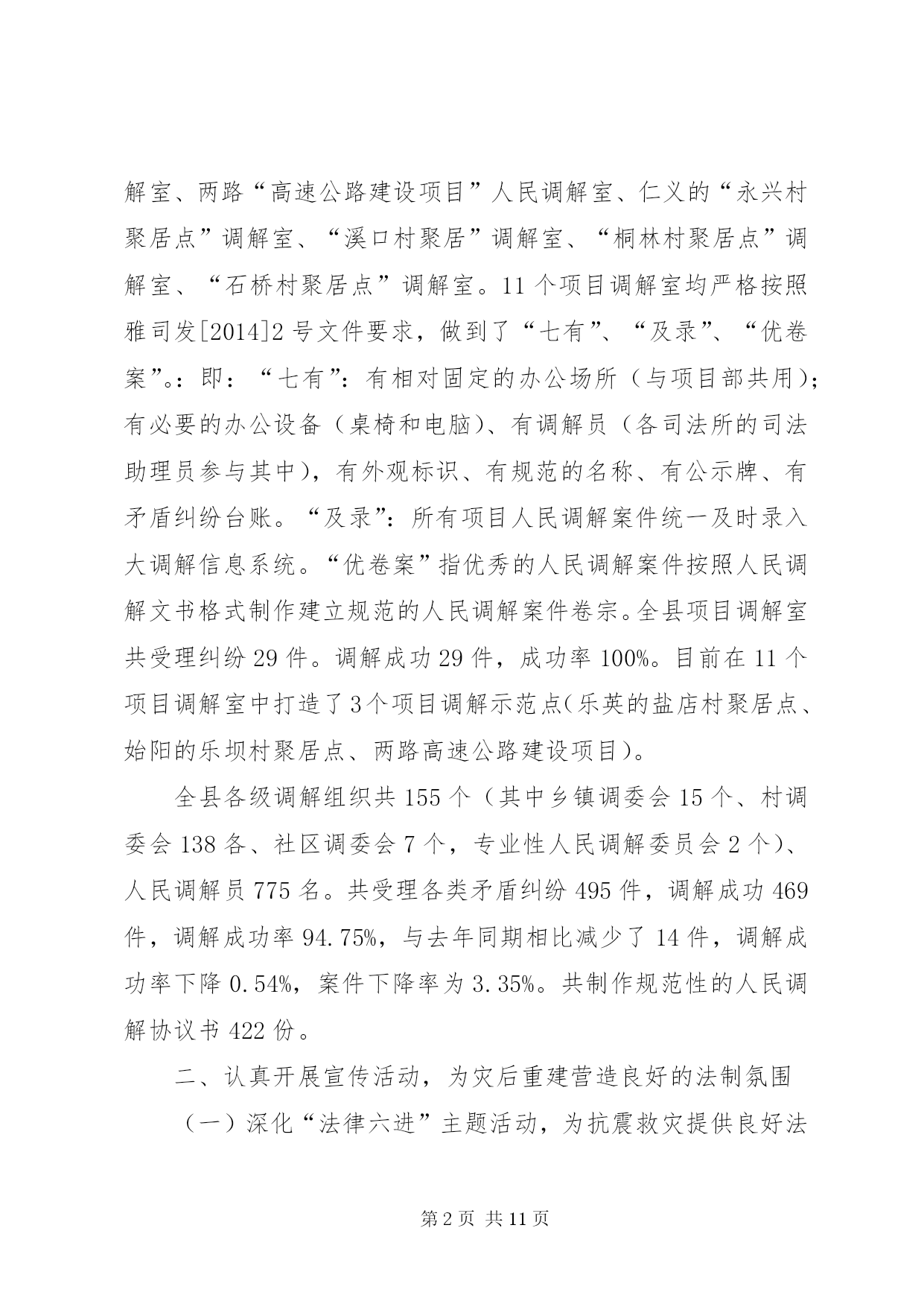 第PAGE\*Arabic\*MERGEFORMAT11页共NUMPAGES\*MERGEFORMAT11页司法局灾后重建工作总结按照重建办《关于灾后恢复重建一周年工作总结的通知》要求,现将涉及我局灾后重建工作情况总结如下:一、扎实推进人民调解进项目工作(一)加强人民调解队伍建设,营造调解职能大提升大发展的良好氛围。各乡镇确保落实1名副科级乡(镇)领导任人民调解委员会主任,落实3-5人组成调委会专、兼职人员,确保人民调解工作有人抓、有人管、有办公场所、有工作人员办事,为大调解工作的扎实有效开展奠定坚实基础。其次健全教育培训制度。发挥县人民调解指导中心的作用,县培训乡、乡培训村和重大纠纷经验交流的形式强化调解队伍的培训,提高调解人员的政策法律水平,从而提高依法调解矛盾纠纷和民事案件的能力。各乡镇充分发挥人民调解维稳“第一道防线”作用,加大矛盾纠纷排查力度,真正做到横到边、纵到底,实现“小纠纷不出村(社区)、大纠纷不出乡镇、疑难纠纷不出县”。做到层层有人抓,事事有人管,确保全县的社会稳定。(二)围绕市依法治市工作方案,全面推进人民调解进项目工作。全县15个乡镇目前建立项目的人民调解室有:多功的“蓝天新村”项目调解室、始阳的“乐坝村聚居点”人民调解室、“光荣村聚居点”人民调解室、乐英的“盐店村聚居点”人民调解室、大坪的“毛山村聚居点”人民调解室、“大坪村聚居点”人民调解室、两路“高速公路建设项目”人民调解室、仁义的“永兴村聚居点”调解室、“溪口村聚居”调解室、“桐林村聚居点”调解室、“石桥村聚居点”调解室。11个项目调解室均严格按照雅司发[2014]2号文件要求,做到了“七有”、“及录”、“优卷案”。:即:“七有”:有相对固定的办公场所(与项目部共用);有必要的办公设备(桌椅和电脑)、有调解员(各司法所的司法助理员参与其中),有外观标识、有规范的名称、有公示牌、有矛盾纠纷台账。“及录”:所有项目人民调解案件统一及时录入大调解信息系统。“优卷案”指优秀的人民调解案件按照人民调解文书格式制作建立规范的人民调解案件卷宗。全县项目调解室共受理纠纷29件。调解成功29件,成功率100%。目前在11个项目调解室中打造了3个项目调解示范点(乐英的盐店村聚居点、始阳的乐坝村聚居点、两路高速公路建设项目)。全县各级调解组织共155个(其中乡镇调委会15个、村调委会138各、社区调委会7个,专业性人民调解委员会2个)、人民调解员775名。共受理各类矛盾纠纷495件,调解成功469件,调解成功率94.75%,与去年同期相比减少了14件,调解成功率下降0.54%,案件下降率为3.35%。共制作规范性的人民调解协议书422份。二、认真开展宣传活动,为灾后重建营造良好的法制氛围(一)深化“法律六进”主题活动,为抗震救灾提供良好法治环境和有效的法治保障。1、进一步深化“法律进机关、进乡村、进社区、进学校、进企业、进单位”主题活动,广泛开展适合不同对象、不同层次的法制宣传教育活动,推动“法律六进”活动持续深入全面开展。重点在领导干部带头学法守法用法,不断提高依法决策、依法行政的意识和能力。在学校开展法制宣传讲座,全县法制副校长坚持在学校讲法制课,共讲课266课时,受到教育的青少年学生和部分家长27000人次,形成了良好的法制副校长讲授法制课制度。2、加强抗震救灾期间法制宣传工作。芦山“4.20”地震发生后,法制宣传教育工作成为抗震救灾工作的重点之一,我县成立了抗震救灾宣传队,深入各乡镇,进村入户,开展灾情调查、统计,宣传党和政府的抗震救灾方针政策,涉灾的政策随时以最快的宣传形式(手机短信)发送到群众中。各乡镇共发放宣传资料30万份,做到一户一册,一人一份。法制宣传栏天天更新,10000幅法制宣传标语在各街道、救灾点、公路边悬挂,形成了抗震救灾宣传的良好氛围。(二)认真组织开展法制宣传活动。今年三月,按照我县三月法制宣传月工作要求,组织律师、法律工作者等人员到仁义乡积极开展法制宣传活动和送法下乡活动。与县妇联、县人民医院、县疾病控制中心等在城厢镇十里村村委会会议室开展了送法下乡,三月妇女维权活动。活动中市律师协会刘律师在村委会会议室就妇女维权和抗震救灾的法律知识进行了培训。培训农村妇女100多人,在村委会园坝开展了免费法律咨询,医院医生对妇女进行了体检,咨询、体检30人,受到广大村民的欢迎。在第27个“6.26”国际禁毒日来临之际,县司法局与相关部门在县城茶马广场开展了大型禁毒宣传活动,以“禁绝毒品人人有责”为主题,工作人员和禁毒志愿者们通过发放宣传资料、接受群众咨询等形式,讲解有关毒品预防的基本知识及毒品对个人、家庭、社会的危害,教育广大市民要有“珍爱生命、拒绝毒品”的意识,为“法治县”创建形成良好氛围。此次禁毒宣传活动,接受咨询200余