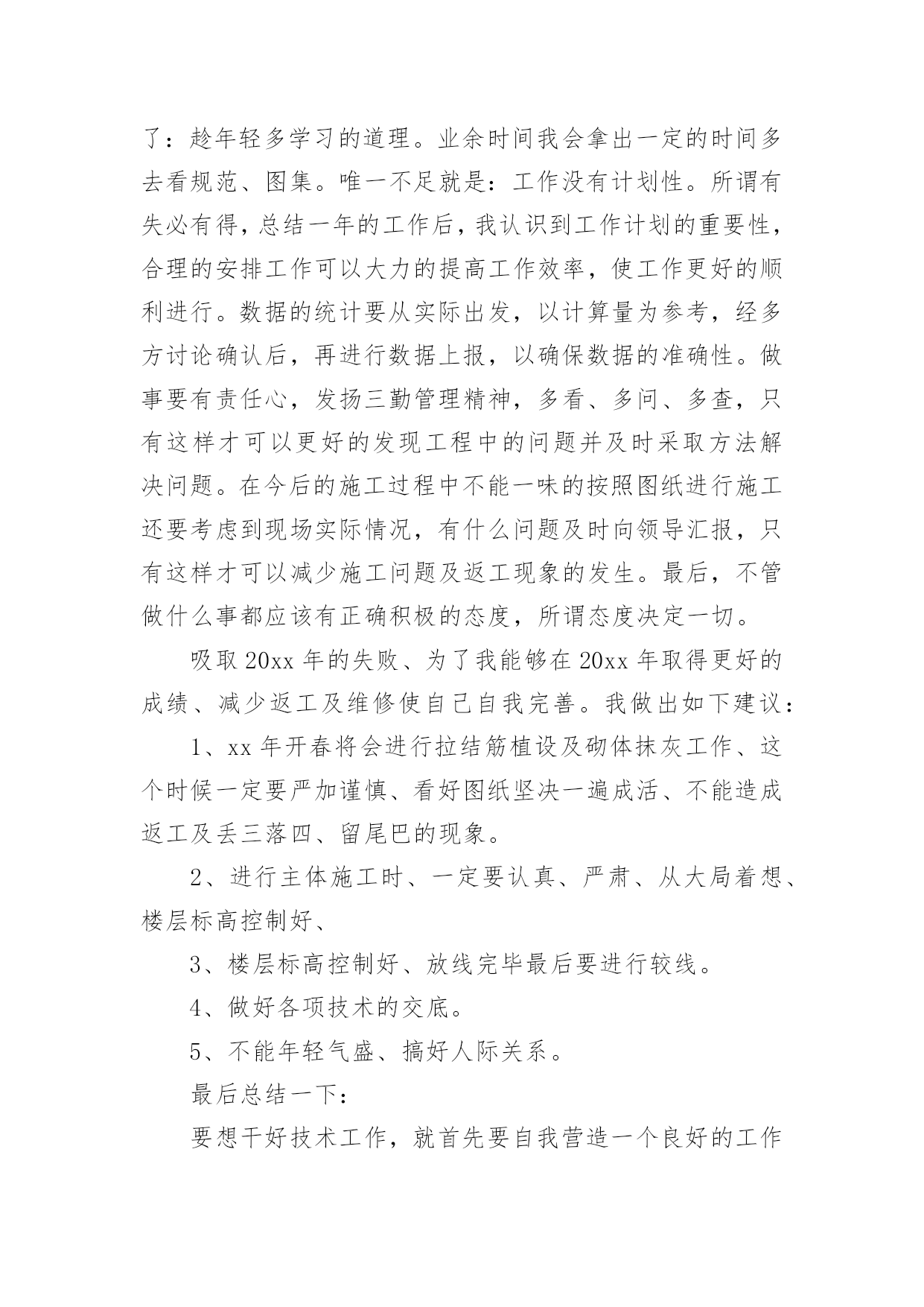技术员年度工作总结总结就是把一个时间段取得的成绩、存在的问题及得到的经验和教训进行一次全面系统的总结的书面材料,它能够给人努力工作的动力,让我们好好写一份总结吧。那么总结应该包括什么内容呢?下面是小编帮大家整理的技术员年度工作总结,欢迎阅读与收藏。技术员年度工作总结1我是一名机电技术员,于20xx年7月毕业于太原理工大学机械制造程及其自动化专业,20xx年7月到xx矿掘进队参加工作,20xx年11月被聘为助理工程师。在机电科的工作中我主要负责全队工作面的设备布置及设备维修和综采设备的维修。在此期间本人尽职尽责、严格按照要求顺利完成了在生产过程中的各项工作任务。现将我任职期间的具体工作总结如下。一、积极参与各项技术创新工作创新是民族进步的灵魂,是我矿安全生产的不竭动力。对于煤矿企业来说,更是需要不断进行技术改革,积极探索煤矿新技术,源源不断的为煤矿生产注入新的动力。因此本人多次参与了本单位的技术创新工作,在本矿要求少投入、多产出的原则下取得了一定的成效,并多项技术创新获奖。二、完成全矿工掘工作面的设备布置掘进和回采是煤矿生产的重要环节,采掘并重、掘进先行。煤矿的快速掘进是煤矿高效稳定的关键技术措施,采掘设备水平直接关系道煤矿的生产能力和安全。高效机械化掘进技术与支护技术是保证矿井实现高产高效的必要条件,随着综采工作面的年产越高,巷道掘进是煤矿高效集约化生产的关键技术。我根据地质条件、巷道断面、采区布置办式以及采区运输系统等进行掘进设备的布置。三、工掘的进度情况跟踪。本人每天都会询问机掘队组、工程队组和外委队组每日的工程进尺,及其每天二班的检修情况,并认真记录了解详细情况,遇到问题时及时和区队员工交流,第一时间将问题解决。在月底,我会把机掘队组的日检、班检、旬检、值班记录本和五检记录本认真收起统计并且详细分类,在统计的过程中,从中本人认为收益颇多,也学习到了不少技术知识,能够很好的将理论与实践结合,提高自身的专业素养。总之,在做好本单位相关的技术工作之外,仍加强本单位机电方面的有关工作。如要求本部门在机电设备的检修和保养方面制定相应规定,制作对应的检修图表,要求检修人员负责专属机电设备的运行情况。本人要加强专业知识和机电的专业理论,定期深入现场学习,从而提高自己的专业素养和在技术领域的造诣,全身心投入本矿技术工作的创新和改革,通过自己与部门之间的合作,为本矿提高煤炭产量,加强安全防护,使全体员工放心安心工作,营造全矿上下良好的工作氛围。技术员年度工作总结2转眼间,辞旧迎新、平凡而又不太忙碌的一年已到尽头,不知不觉时间过的真快,悄然无息、20xx年的日历即将翻过去。伴随着时代前进的步伐、回首自己一年来经历的风雨路程、对自己工作中的不足、我做出如下工作总结:一、务实工作、自我加压、认真工作、有得有失20xx年、值得一庆,(xx楼)自己着手参加的第一个住宅工程已经竣工,我们主抓质量、进度使规定期间内竣工。同时也让我学会了一些施工工序、包括图纸的一些细部构造、及公司规定的一些细部做法、及技术资料的整理等。包括为人处事都有很大的改进,也为自己积累了一定的经验。主体施工完毕后、主要参与砌体的放线、拉结筋的植设、及最后砌体的验收等。后期主要和甲方人员及监理人员做分户验收、及室外污水管道的标高抄测。泛泛的工作岗位维护的是一团氛围。做为一名新手、同样也出现了很多的错误、(楼层外飘窗的砌筑)造成返工、但我会汲取教训、认真熟读图纸、问题考虑全面。坚决不会在让同样的问题出现。20xx年、新的工程开工、位于威海市高技区、楼座为三栋小高层axx、三栋多层xx及一个大车库总面积由于xxm2由于开始技术人员人手紧张、相当忙碌、虽说忙碌、但很快乐、对自己有很大的信心。因为这是我第一个从基础来挖到最后封顶的工程、所以我很期待。二、工作要有责任心,合理安排工作在这里更让巩固加深了20xx年所学到的知识。更明白了:趁年轻多学习的道理。业余时间我会拿出一定的时间多去看规范、图集。唯一不足就是:工作没有计划性。所谓有失必有得,总结一年的工作后,我认识到工作计划的重要性,合理的安排工作可以大力的提高工作效率,使工作更好的顺利进行。数据的统计要从实际出发,以计算量为参考,经多方讨论确认后,再进行数据上报,以确保数据的准确性。做事要有责任心,发扬三勤管理精神,多看、多问、多查,只有这样才可以更好的发现工程中的问题并及时采取方法解决问题。在今后的施工过程中不能一味的按照图纸进行施工还要考虑到现场实际情况,有什么问题及时向领导汇报,只有这样才可以减少施工问题及返工现象的发生。最后,不管做什么事都应该有正确积极的态度,所谓态度决定一切。吸取20xx年的失败、为了我能够在20xx年取得更好的成绩、减少返工及维修使自己自我完善。我做出如下建议:1、xx年开春将会进行拉结筋植设及砌体抹灰