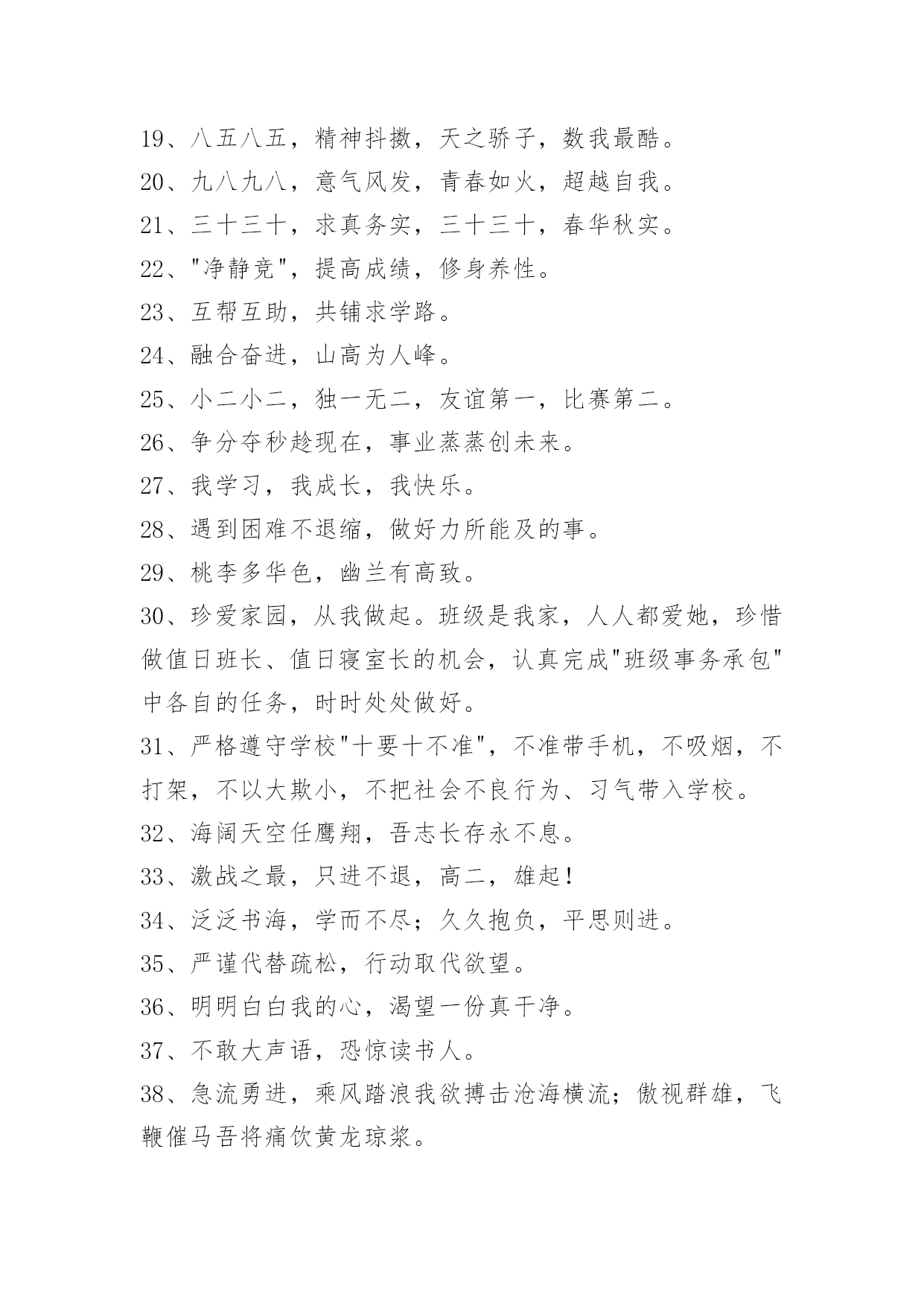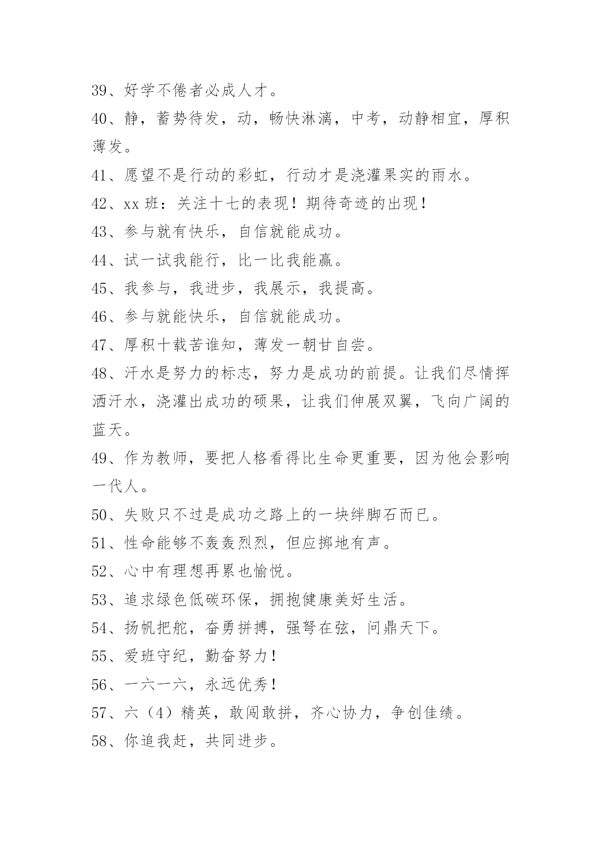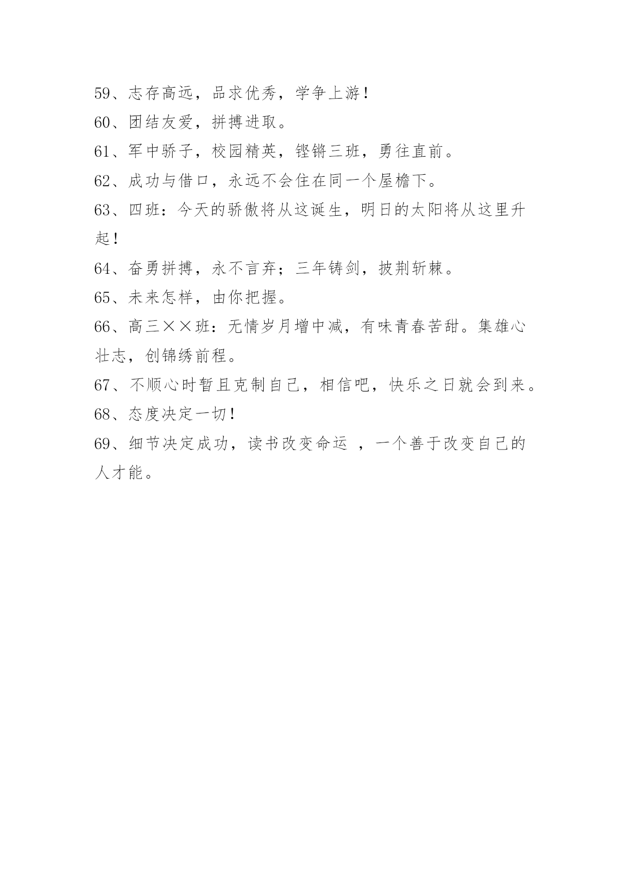 班级口号69条班级口号集锦69条英姿飒爽,穷冬散尽喜迎元旦佳节;志存高远,春意盎然更看男儿勤苦。下面是关于班级口号69条,欢迎大家分享。1、失败的尽头是成功,发奋的终点是辉煌。2、高目标,高要求,教学相长,拼搏方可成才。3、在学习中寻找快乐,在快乐中探索知识。4、学会审美,学会健体,学会生活,学会求知。5、不求尽善尽美,但求尽心尽力。6、生命在于运动,成功在于奋斗。7、进校园,想明天,振兴祖国我有责;坐教室,重今天,认真学习长本领。8、高三3班:挺起脊梁,创造辉煌。9、高三7班:成就梦想,永不言弃。10、高一8班:青春飞扬,拼搏自强。11、三年载卧薪尝胆欲酬壮志;一百天刻苦攻读誓闯雄关。12、青竹湖畔。有我四班,志存高远,快乐扬帆。13、青春似火,超越自我,龙腾十七,勇夺第一。14、初三十九、谁与争锋?横扫赛场、唯我称雄!15、十一精英,敢闯敢拼,花开不败,wecanfly!16、乘风破浪,气宇轩昂,二十有我,必创辉煌!17、二一二一,勇夺第一,唯我独尊,举世无双。18、展现自我,争创新高,奋发拼搏,勇于开拓。19、八五八五,精神抖擞,天之骄子,数我最酷。20、九八九八,意气风发,青春如火,超越自我。21、三十三十,求真务实,三十三十,春华秋实。22、"净静竞",提高成绩,修身养性。23、互帮互助,共铺求学路。24、融合奋进,山高为人峰。25、小二小二,独一无二,友谊第一,比赛第二。26、争分夺秒趁现在,事业蒸蒸创未来。27、我学习,我成长,我快乐。28、遇到困难不退缩,做好力所能及的事。29、桃李多华色,幽兰有高致。30、珍爱家园,从我做起。班级是我家,人人都爱她,珍惜做值日班长、值日寝室长的机会,认真完成"班级事务承包"中各自的任务,时时处处做好。31、严格遵守学校"十要十不准",不准带手机,不吸烟,不打架,不以大欺小,不把社会不良行为、习气带入学校。32、海阔天空任鹰翔,吾志长存永不息。33、激战之最,只进不退,高二,雄起!34、泛泛书海,学而不尽;久久抱负,平思则进。35、严谨代替疏松,行动取代欲望。36、明明白白我的心,渴望一份真干净。37、不敢大声语,恐惊读书人。38、急流勇进,乘风踏浪我欲搏击沧海横流;傲视群雄,飞鞭催马吾将痛饮黄龙琼浆。39、好学不倦者必成人才。40、静,蓄势待发,动,畅快淋漓,中考,动静相宜,厚积薄发。41、愿望不是行动的彩虹,行动才是浇灌果实的雨水。42、xx班:关注十七的表现!期待奇迹的出现!43、参与就有快乐,自信就能成功。44、试一试我能行,比一比我能赢。45、我参与,我进步,我展示,我提高。46、参与就能快乐,自信就能成功。47、厚积十载苦谁知,薄发一朝甘自尝。48、汗水是努力的标志,努力是成功的前提。让我们尽情挥洒汗水,浇灌出成功的硕果,让我们伸展双翼,飞向广阔的蓝天。49、作为教师,要把人格看得比生命更重要,因为他会影响一代人。50、失败只不过是成功之路上的一块绊脚石而已。51、性命能够不轰轰烈烈,但应掷地有声。52、心中有理想再累也愉悦。53、追求绿色低碳环保,拥抱健康美好生活。54、扬帆把舵,奋勇拼搏,强弩在弦,问鼎天下。55、爱班守纪,勤奋努力!56、一六一六,永远优秀!57、六(4)精英,敢闯敢拼,齐心协力,争创佳绩。58、你追我赶,共同进步。59、志存高远,品求优秀,学争上游!60、团结友爱,拼搏进取。61、军中骄子,校园精英,铿锵三班,勇往直前。62、成功与借口,永远不会住在同一个屋檐下。63、四班:今天的骄傲将从这诞生,明日的太阳将从这里升起!64、奋勇拼搏,永不言弃;三年铸剑,披荆斩棘。65、未来怎样,由你把握。66、高三××班:无情岁月增中减,有味青春苦甜。集雄心壮志,创锦绣前程。67、不顺心时暂且克制自己,相信吧,快乐之日就会到来。68、态度决定一切!69、细节决定成功,读书改变命运,一个善于改变自己的人才能。