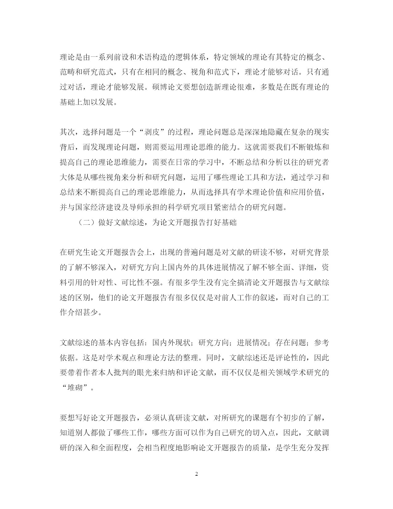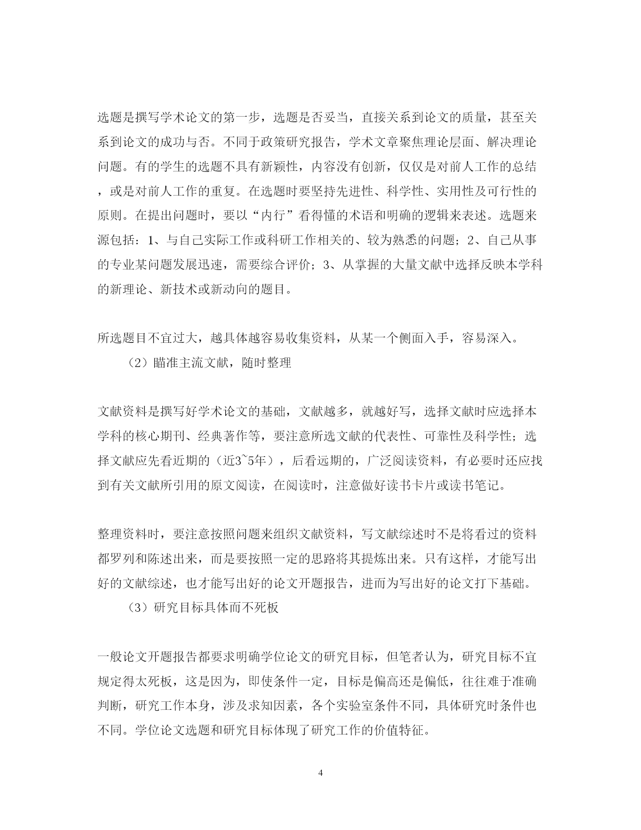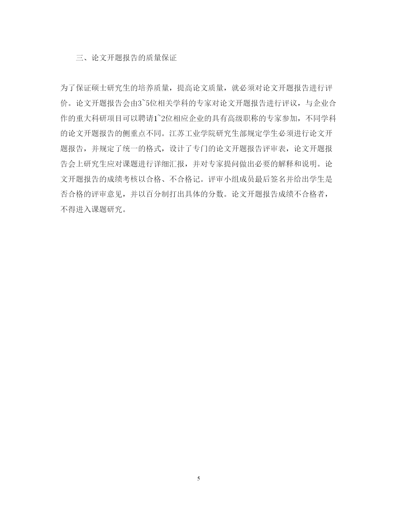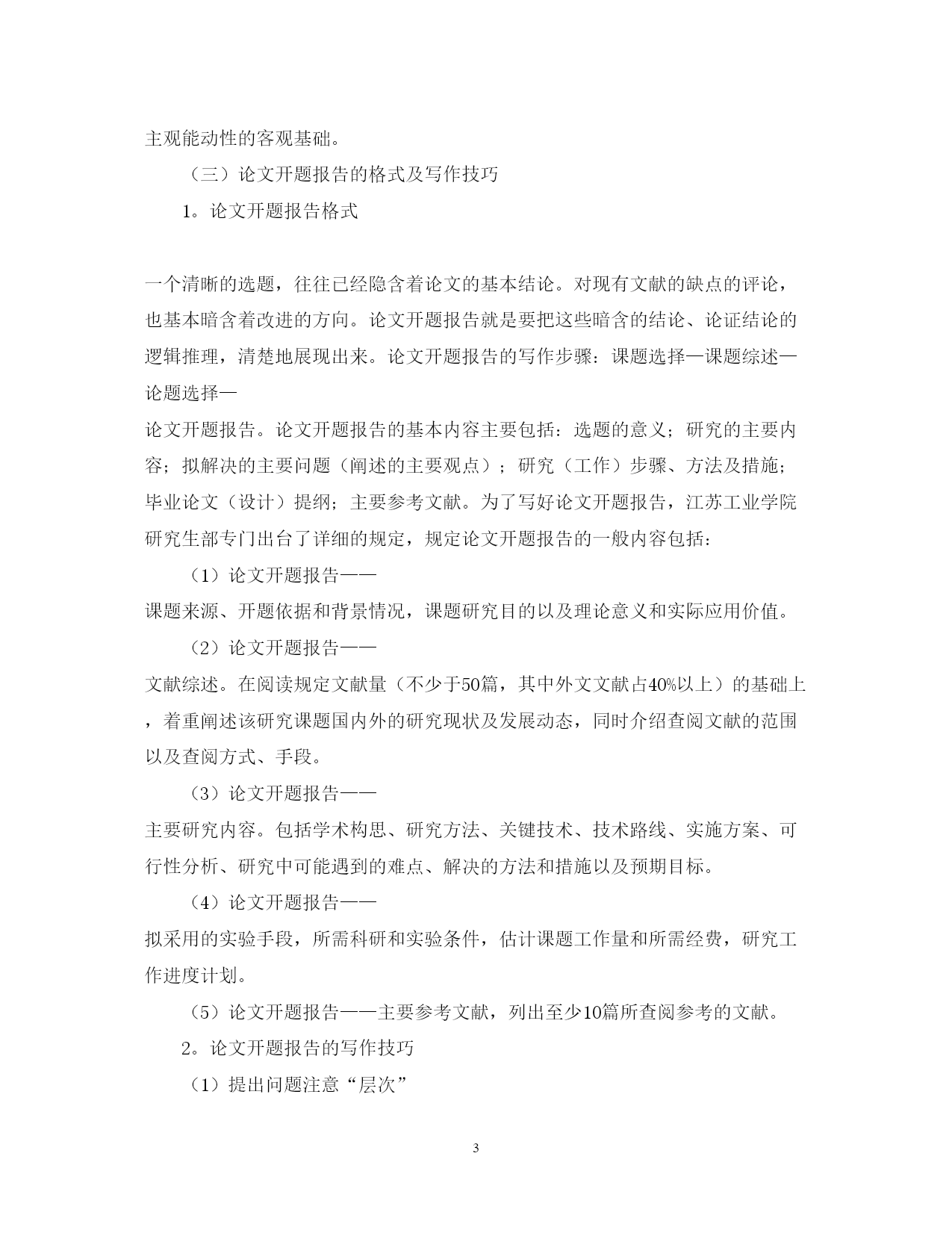 此资料由网络收集而来,如有侵权请告知上传者立即删除。资料共分享,我们负责传递知识。PAGEPAGE5有关于论文开题报告的格式一、论文开题报告的意义硕士论文开题报告是研究生在完成文献调研后写成的关于学位论文选题与如何实施的论述性报告。论文开题报告既是文献调研的聚焦点,又是学位论文研究工作展开的散射点,对研究工作起到定位作用。写论文开题报告的目的,是要请老师及专家们帮忙判断一下所研究的选题有没有价值,研究方法是否奏效,论证逻辑有没有明显缺陷。因此论文开题报告就要围绕研究的主要内容,拟解决的主要问题(或阐述的主要观点),研究步骤、方法及措施为主要内容。但笔者在工作实践中发现有很多学生往往在论文开题报告中花费大量笔墨叙述别人的研究成果,谈到自己的研究方法时,往往寥寥数语一笔带过。这样,不便于评审老师指导。二、如何写论文开题报告(一)论文开题报告的前提——通过理论思维选择课题在工作实践中,发现硕士研究生论文开题报告中存在的普遍问题是选题不合适。有的提出的问题太过“平庸”,有的选题范围太大,研究内容太多、太宽泛,提出的问题不切合硕士生的实际,实践操作起来难度较大。如有的学生提出的论文题目:“新型中性镍催化剂的研究及其催化合成聚乙烯、聚丙烯的研究”,此选题有意义,有创新,作者的研究思路也比较正确,但论文选题范围太大,研究内容对于一个硕士生来说明显偏多,无法按时完成。因此应重新确定研究内容,注重项目的可操作性。那么如何选择研究问题呢?这里要强调的是通过理论思维来发现研究问题。理论是由一系列前设和术语构造的逻辑体系,特定领域的理论有其特定的概念、范畴和研究范式,只有在相同的概念、视角和范式下,理论才能够对话。只有通过对话,理论才能够发展。硕博论文要想创造新理论很难,多数是在既有理论的基础上加以发展。其次,选择问题是一个“剥皮”的过程,理论问题总是深深地隐藏在复杂的现实背后,而发现理论问题,则需要运用理论思维的能力。这就需要我们不断锻炼和提高自己的理论思维能力,需要在日常的学习中,不断总结和分析以往的研究者大体是从哪些视角来分析和研究问题,运用了哪些理论工具和方法,通过学习和总结来不断提高自己的理论思维能力,从而选择具有学术理论价值和应用价值,并与国家经济建设及导师承担的科学研究项目紧密结合的研究问题。(二)做好文献综述,为论文开题报告打好基础在研究生论文开题报告会上,出现的普遍问题是对文献的研读不够,对研究背景的了解不够深入,对研究方向上国内外的具体进展情况了解不够全面、详细,资料引用的针对性、可比性不强。有很多学生没有完全搞清论文开题报告与文献综述的区别,他们的论文开题报告有很多仅仅是对前人工作的叙述,而对自己的工作介绍甚少。文献综述的基本内容包括:国内外现状;研究方向;进展情况;存在问题;参考依据。这是对学术观点和理论方法的整理。同时,文献综述还是评论性的,因此要带着作者本人批判的眼光来归纳和评论文献,而不仅仅是相关领域学术研究的“堆砌”。要想写好论文开题报告,必须认真研读文献,对所研究的课题有个初步的了解,知道别人都做了哪些工作,哪些方面可以作为自己研究的切入点,因此,文献调研的深入和全面程度,会相当程度地影响论文开题报告的质量,是学生充分发挥主观能动性的客观基础。(三)论文开题报告的格式及写作技巧1。论文开题报告格式一个清晰的选题,往往已经隐含着论文的基本结论。对现有文献的缺点的评论,也基本暗含着改进的方向。论文开题报告就是要把这些暗含的结论、论证结论的逻辑推理,清楚地展现出来。论文开题报告的写作步骤:课题选择—课题综述—论题选择—论文开题报告。论文开题报告的基本内容主要包括:选题的意义;研究的主要内容;拟解决的主要问题(阐述的主要观点);研究(工作)步骤、方法及措施;毕业论文(设计)提纲;主要参考文献。为了写好论文开题报告,江苏工业学院研究生部专门出台了详细的规定,规定论文开题报告的一般内容包括:(1)论文开题报告——课题来源、开题依据和背景情况,课题研究目的以及理论意义和实际应用价值。(2)论文开题报告——文献综述。在阅读规定文献量(不少于50篇,其中外文文献占40%以上)的基础上,着重阐述该研究课题国内外的研究现状及发展动态,同时介绍查阅文献的范围以及查阅方式、手段。(3)论文开题报告——主要研究内容。包括学术构思、研究方法、关键技术、技术路线、实施方案、可行性分析、研究中可能遇到的难点、解决的方法和措施以及预期目标。(4)论文开题报告——拟采用的实验手段,所需科研和实验条件,估计课题工作量和所需经费,研究工作进度计划。(5)论文开题报告——主要参考文献,列出至少10篇所查阅参考的文献。2。论文开题报告的写作技巧(1)提出问题注意“层次”选题是撰写学术论文的第