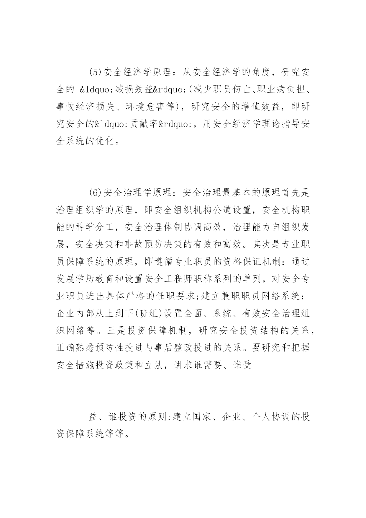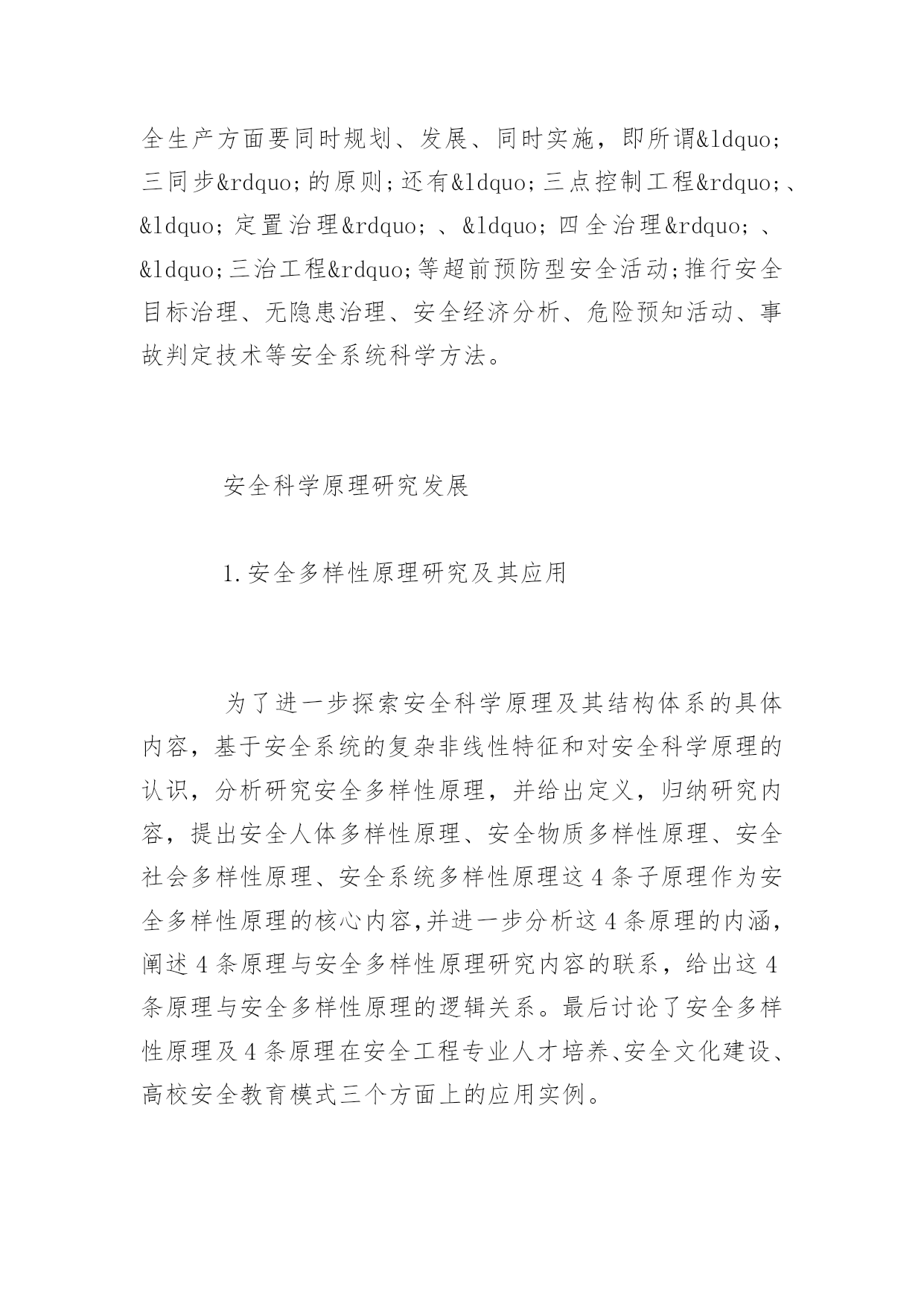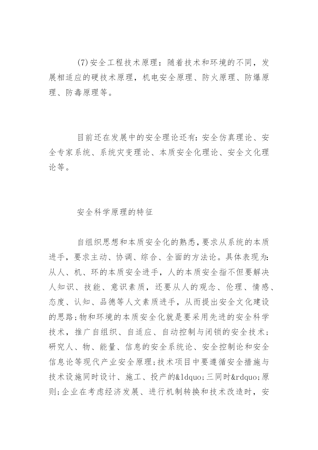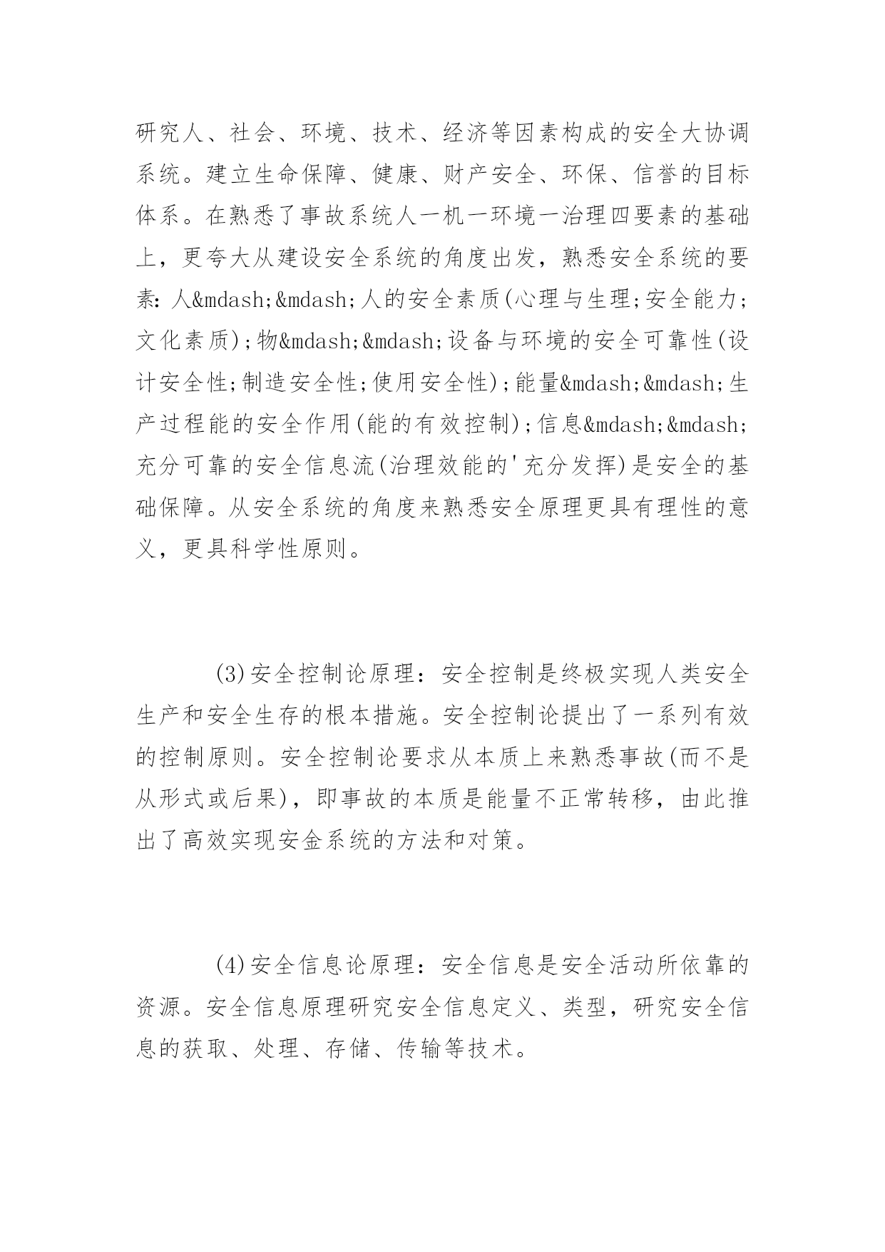 安全科学原理理论体系介绍安全科学原理理论体系介绍有很多的人都会遇到一些安全事故,所以了解安全科学原理是我们要做的事情。下面是百分网小编为你精心推荐的安全科学原理理论体系,希望对您有所帮助。安全科学原理理论体系(1)安全的哲学原理:从历史学和思维学的角度研究实现人类安全生产和安全生存的熟悉论和方法论。如有了这样的回纳:远古人类的安全熟悉论是宿命论的,方法论是被动承受型的;近代人类的安全熟悉进步到了经验的水平;现代随着产业社会的发展和技术的进步,人类的安全熟悉论进进了系统论阶段。从而在方法论上能够推行安全生产与安全生活的综合型对策,甚至能够超前预防。有了正确的安全哲学思想的指导,人类现代生产与生活的安全才能获得高水平的保障。(2)安全系统论原理:从安全系统的动态特性出发,研究人、社会、环境、技术、经济等因素构成的安全大协调系统。建立生命保障、健康、财产安全、环保、信誉的目标体系。在熟悉了事故系统人一机一环境一治理四要素的基础上,更夸大从建设安全系统的角度出发,熟悉安全系统的要素:人——人的安全素质(心理与生理;安全能力;文化素质);物——设备与环境的安全可靠性(设计安全性;制造安全性;使用安全性);能量——生产过程能的安全作用(能的有效控制);信息——充分可靠的安全信息流(治理效能的'充分发挥)是安全的基础保障。从安全系统的角度来熟悉安全原理更具有理性的意义,更具科学性原则。(3)安全控制论原理:安全控制是终极实现人类安全生产和安全生存的根本措施。安全控制论提出了一系列有效的控制原则。安全控制论要求从本质上来熟悉事故(而不是从形式或后果),即事故的本质是能量不正常转移,由此推出了高效实现安金系统的方法和对策。(4)安全信息论原理:安全信息是安全活动所依靠的资源。安全信息原理研究安全信息定义、类型,研究安全信息的获取、处理、存储、传输等技术。(5)安全经济学原理:从安全经济学的角度,研究安全的“减损效益”(减少职员伤亡、职业病负担、事故经济损失、环境危害等),研究安全的增值效益,即研究安全的“贡献率”,用安全经济学理论指导安全系统的优化。(6)安全治理学原理:安全治理最基本的原理首先是治理组织学的原理,即安全组织机构公道设置,安全机构职能的科学分工,安全治理体制协调高效,治理能力自组织发展,安全决策和事故预防决策的有效和高效。其次是专业职员保障系统的原理,即遵循专业职员的资格保证机制:通过发展学历教育和设置安全工程师职称系列的单列,对安全专业职员进出具体严格的任职要求;建立兼职职员网络系统:企业内部从上到下(班组)设置全面、系统、有效安全治理组织网络等。三是投资保障机制,研究安全投资结构的关系,正确熟悉预防性投进与事后整改投进的关系。要研究和把握安全措施投资政策和立法,讲求谁需要、谁受益、谁投资的原则;建立国家、企业、个人协调的投资保障系统等等。(7)安全工程技术原理:随着技术和环境的不同,发展相适应的硬技术原理,机电安全原理、防火原理、防爆原理、防毒原理等。目前还在发展中的安全理论还有:安全仿真理论、安全专家系统、系统灾变理论、本质安全化理论、安全文化理论等。安全科学原理的特征自组织思想和本质安全化的熟悉,要求从系统的本质进手,要求主动、协调、综合、全面的方法论。具体表现为:从人、机、环的本质安全进手,人的本质安全指不但要解决人知识、技能、意识素质,还要从人的观念、伦理、情感、态度、认知、品德等人文素质进手,从而提出安全文化建设的思路;物和环境的本质安全化就是要采用先进的安全科学技术,推广自组织、自适应、自动控制与闭锁的安全技术;研究人、物、能量、信息的安全系统论、安全控制论和安全信息论等现代产业安全原理;技术项目中要遵循安全措施与技术设施同时设计、施工、投产的“三同时”原则;企业在考虑经济发展、进行机制转换和技术改造时,安全生产方面要同时规划、发展、同时实施,即所谓“三同步”的原则;还有“三点控制工程”、“定置治理”、“四全治理”、“三治工程”等超前预防型安全活动;推行安全目标治理、无隐患治理、安全经济分析、危险预知活动、事故判定技术等安全系统科学方法。安全科学原理研究发展1.安全多样性原理研究及其应用为了进一步探索安全科学原理及其结构体系的具体内容,基于安全系统的复杂非线性特征和对安全科学原理的认识,分析研究安全多样性原理,并给出定义,归纳研究内容,提出安全人体多样性原理、安全物质多样性原理、安全社会多样性原