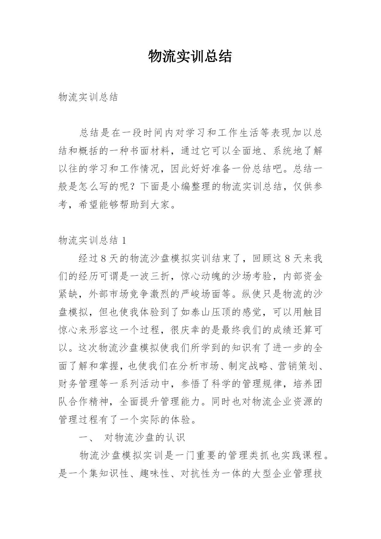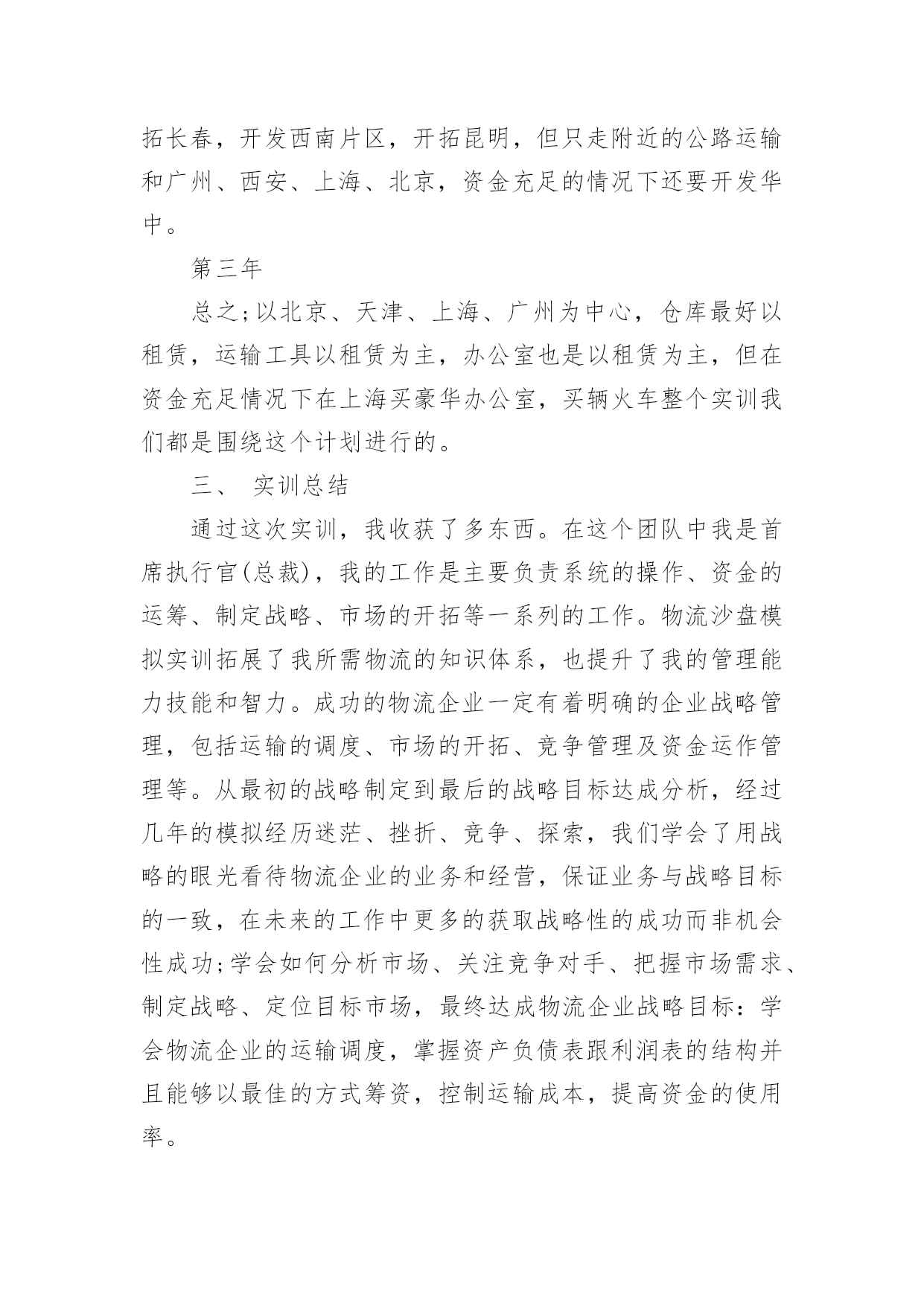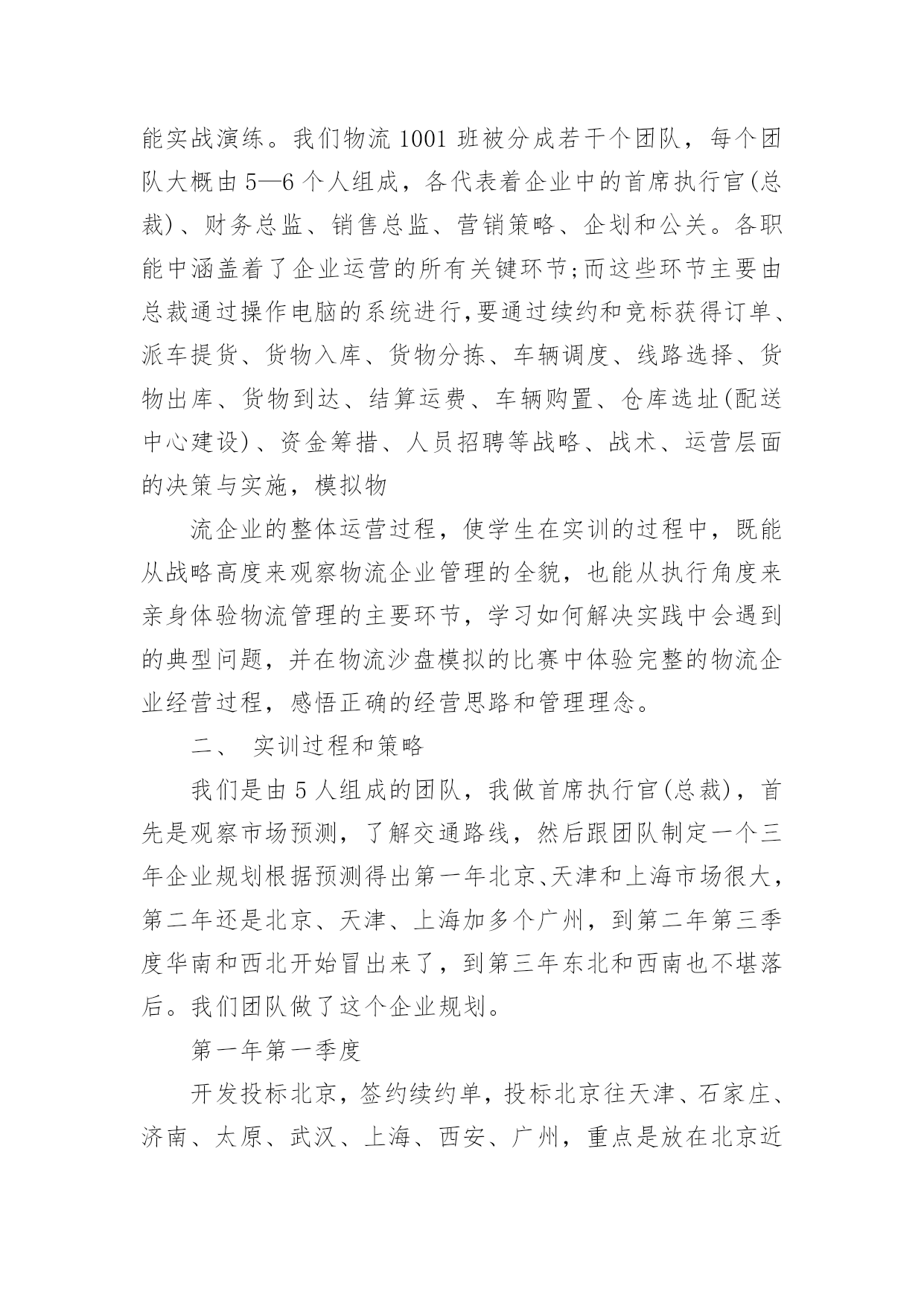 物流实训总结物流实训总结总结是在一段时间内对学习和工作生活等表现加以总结和概括的一种书面材料,通过它可以全面地、系统地了解以往的学习和工作情况,因此好好准备一份总结吧。总结一般是怎么写的呢?下面是小编整理的物流实训总结,仅供参考,希望能够帮助到大家。物流实训总结1经过8天的物流沙盘模拟实训结束了,回顾这8天来我们的经历可谓是一波三折,惊心动魄的沙场考验,内部资金紧缺,外部市场竞争激烈的严峻场面等。纵使只是物流的沙盘模拟,但也使我体验到了如泰山压顶的感觉,可以用触目惊心来形容这一个过程,很庆幸的是最终我们的成绩还算可以。这次物流沙盘模拟使我们所学到的知识有了进一步的全面了解和掌握,也使我们在分析市场、制定战略、营销策划、财务管理等一系列活动中,参悟了科学的管理规律,培养团队合作精神,全面提升管理能力。同时也对物流企业资源的管理过程有了一个实际的体验。一、对物流沙盘的认识物流沙盘模拟实训是一门重要的管理类抓也实践课程。是一个集知识性、趣味性、对抗性为一体的大型企业管理技能实战演练。我们物流1001班被分成若干个团队,每个团队大概由5—6个人组成,各代表着企业中的首席执行官(总裁)、财务总监、销售总监、营销策略、企划和公关。各职能中涵盖着了企业运营的所有关键环节;而这些环节主要由总裁通过操作电脑的系统进行,要通过续约和竞标获得订单、派车提货、货物入库、货物分拣、车辆调度、线路选择、货物出库、货物到达、结算运费、车辆购置、仓库选址(配送中心建设)、资金筹措、人员招聘等战略、战术、运营层面的决策与实施,模拟物流企业的整体运营过程,使学生在实训的过程中,既能从战略高度来观察物流企业管理的全貌,也能从执行角度来亲身体验物流管理的主要环节,学习如何解决实践中会遇到的典型问题,并在物流沙盘模拟的比赛中体验完整的物流企业经营过程,感悟正确的经营思路和管理理念。二、实训过程和策略我们是由5人组成的团队,我做首席执行官(总裁),首先是观察市场预测,了解交通路线,然后跟团队制定一个三年企业规划根据预测得出第一年北京、天津和上海市场很大,第二年还是北京、天津、上海加多个广州,到第二年第三季度华南和西北开始冒出来了,到第三年东北和西南也不堪落后。我们团队做了这个企业规划。第一年第一季度开发投标北京,签约续约单,投标北京往天津、石家庄、济南、太原、武汉、上海、西安、广州,重点是放在北京近城的公路运输和京广沿线铁路,但不要太大的投入,北京是个大市场争取拿下。第一年第二季度开发华北片区,开拓天津,不惜代价的把天津市场拿下,投入豪华办公室,五个中级经理,投标天津往济南、呼和浩特、太原、武汉、西安、北京、上海、石家庄、广州及续约单地点,远的.不通铁路的不去,近的续约单有的就投标,要不惜代价把天津市场拿下,天津的长途货物主要在北京中转,北京是一个及其重要交通枢纽。第一年第三、四季度开发华东片区,开拓上海,有力的投入,投标上海往武汉、西安、北京、天津、石家庄、广州、上海周边的杭州、南京、合肥、南昌。北京周边的天津、石家庄续约单不一定全要,但是一定要开发IS9000,因为第二年有很大货物而已认证IS9000。第二年第一、二季度开发华南片区,开拓广州,有力的投入,还是以上海为中心,投标广州往香港、澳门、南宁、上海、北京、西安、及上海旁边的杭州、南京、北京旁边的天津、石家庄。重点广州往香港、澳门。整个计划还是以北京、天津、上海、广州为中心。第二年第三、四季度第二年第三、四季度是个变动计划,第二年年末需要开拓IS9000和IS14000(这个要在第二年末的情况下决定的)开拓长春,开发西南片区,开拓昆明,但只走附近的公路运输和广州、西安、上海、北京,资金充足的情况下还要开发华中。第三年总之;以北京、天津、上海、广州为中心,仓库最好以租赁,运输工具以租赁为主,办公室也是以租赁为主,但在资金充足情况下在上海买豪华办公室,买辆火车整个实训我们都是围绕这个计划进行的。三、实训总结通过这次实训,我收获了多东西。在这个团队中我是首席执行官(总裁),我的工作是主要负责系统的操作、资金的运筹、制定战略、市场的开拓等一系列的工作。物流沙盘模拟实训拓展了我所需物流的知识体系,也提升了我的管理能力技能和智力。成功的物流企业一定有着明确的企业战略管理,包括运输的调度、市场的开拓、竞争管理及资金运作管理等。从最初的战略制定到最后的战略目标达成分析,经过几年的模拟经历迷茫、挫折、竞争、探索,我们学会了用战略的眼光看待物流企业的业务和经营,保证业务与战略目标的一致,在未来的工作中更多的获取战略性的成功而非机会性成功;学会如何分析市场、关注竞争对手、把握市场需求、制定战略、定位目标市场,最终达成物流企业战略目标:学会物流企业的运输调度,掌握资产负债表跟利润表的结构并且能够以最佳的方式筹资,控制运输成本,提高