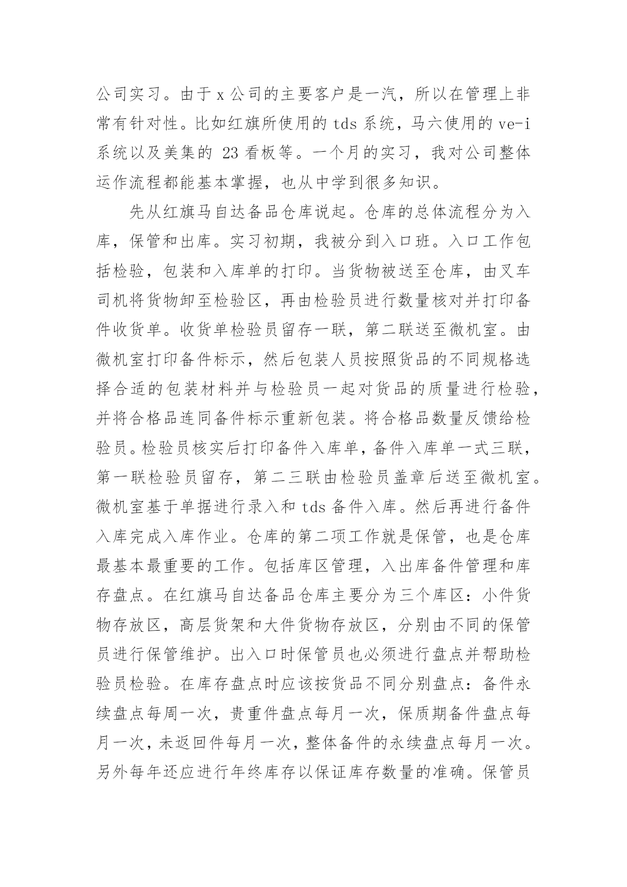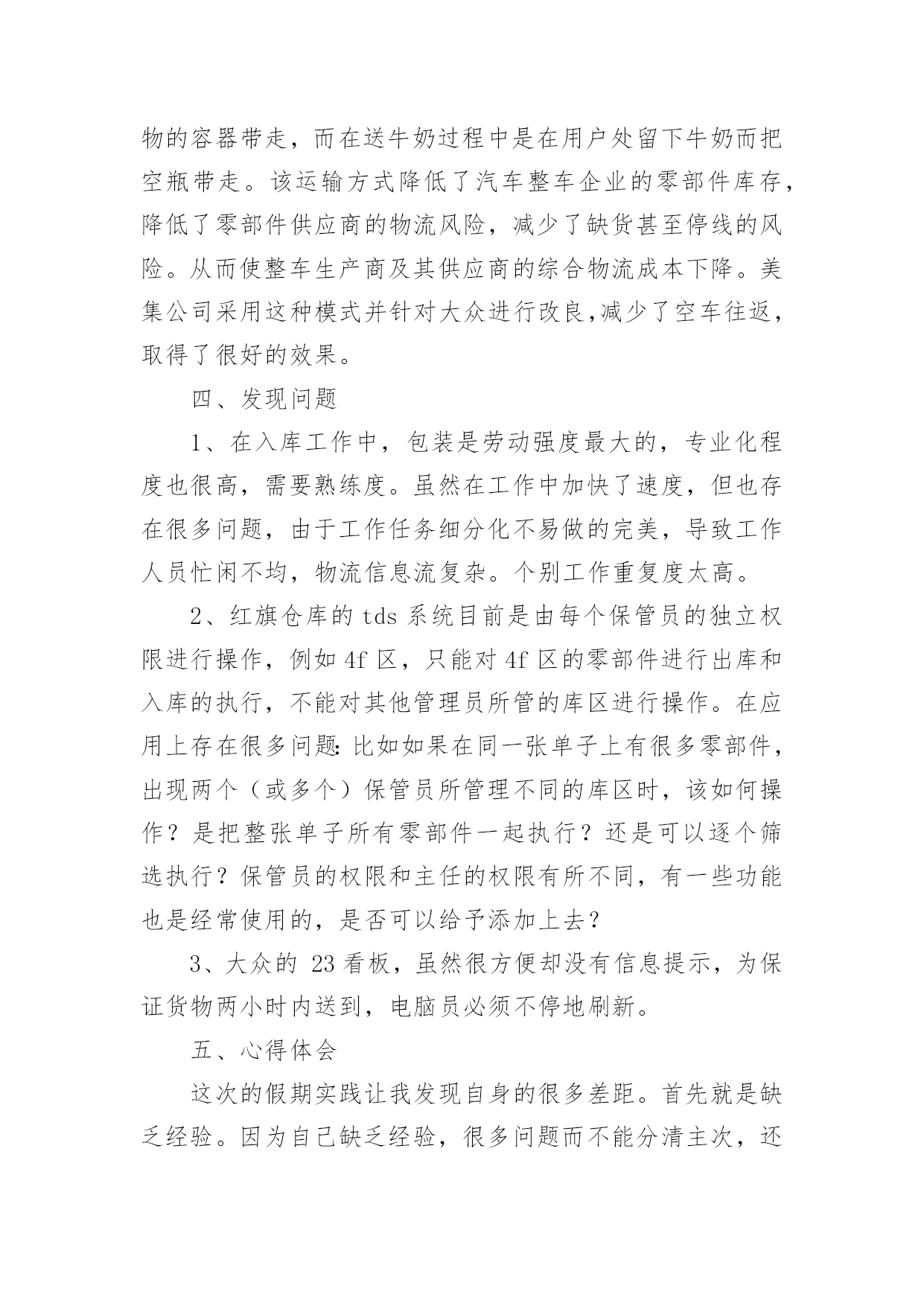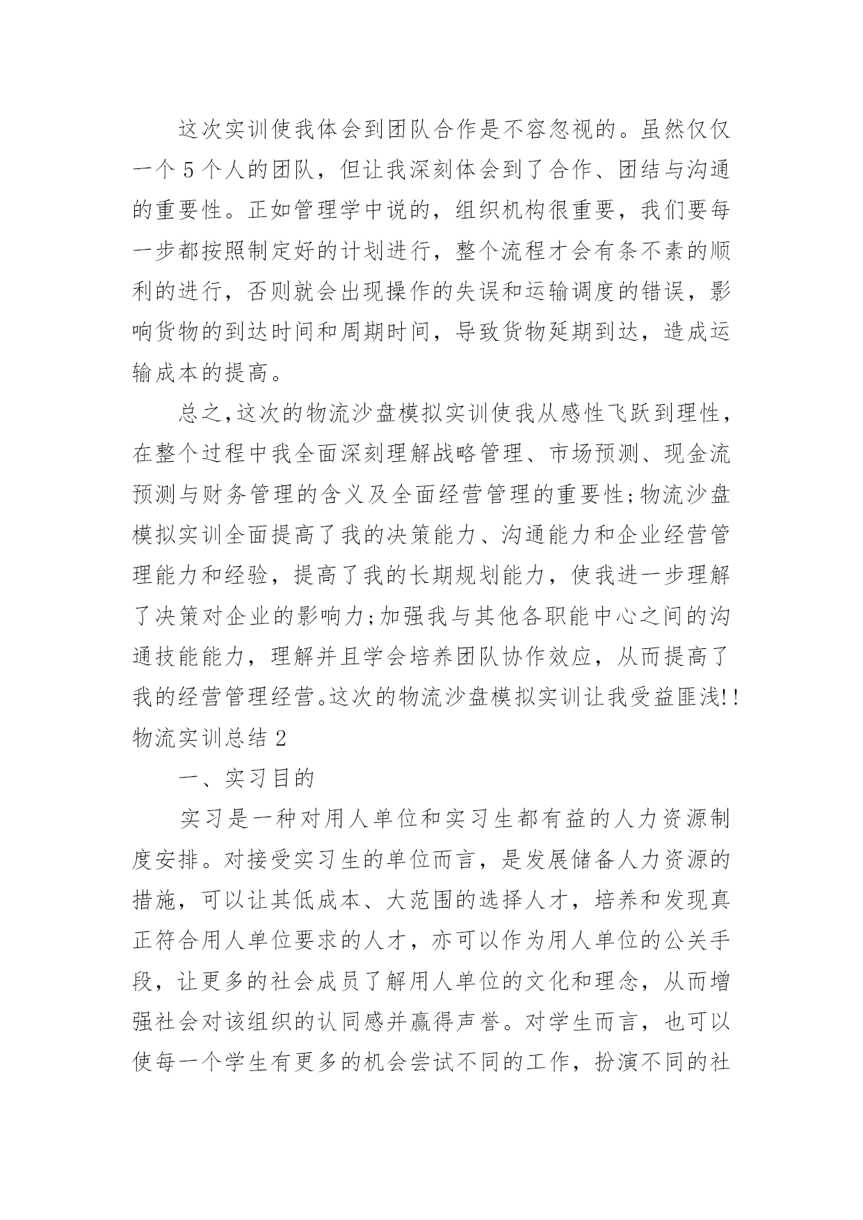 物流实训总结物流实训总结总结是在一段时间内对学习和工作生活等表现加以总结和概括的一种书面材料,通过它可以全面地、系统地了解以往的学习和工作情况,因此好好准备一份总结吧。总结一般是怎么写的呢?下面是小编整理的物流实训总结,仅供参考,希望能够帮助到大家。物流实训总结1经过8天的物流沙盘模拟实训结束了,回顾这8天来我们的经历可谓是一波三折,惊心动魄的沙场考验,内部资金紧缺,外部市场竞争激烈的严峻场面等。纵使只是物流的沙盘模拟,但也使我体验到了如泰山压顶的感觉,可以用触目惊心来形容这一个过程,很庆幸的是最终我们的成绩还算可以。这次物流沙盘模拟使我们所学到的知识有了进一步的全面了解和掌握,也使我们在分析市场、制定战略、营销策划、财务管理等一系列活动中,参悟了科学的管理规律,培养团队合作精神,全面提升管理能力。同时也对物流企业资源的管理过程有了一个实际的体验。一、对物流沙盘的认识物流沙盘模拟实训是一门重要的管理类抓也实践课程。是一个集知识性、趣味性、对抗性为一体的大型企业管理技能实战演练。我们物流1001班被分成若干个团队,每个团队大概由5—6个人组成,各代表着企业中的首席执行官(总裁)、财务总监、销售总监、营销策略、企划和公关。各职能中涵盖着了企业运营的所有关键环节;而这些环节主要由总裁通过操作电脑的系统进行,要通过续约和竞标获得订单、派车提货、货物入库、货物分拣、车辆调度、线路选择、货物出库、货物到达、结算运费、车辆购置、仓库选址(配送中心建设)、资金筹措、人员招聘等战略、战术、运营层面的决策与实施,模拟物流企业的整体运营过程,使学生在实训的过程中,既能从战略高度来观察物流企业管理的全貌,也能从执行角度来亲身体验物流管理的主要环节,学习如何解决实践中会遇到的典型问题,并在物流沙盘模拟的比赛中体验完整的物流企业经营过程,感悟正确的经营思路和管理理念。二、实训过程和策略我们是由5人组成的团队,我做首席执行官(总裁),首先是观察市场预测,了解交通路线,然后跟团队制定一个三年企业规划根据预测得出第一年北京、天津和上海市场很大,第二年还是北京、天津、上海加多个广州,到第二年第三季度华南和西北开始冒出来了,到第三年东北和西南也不堪落后。我们团队做了这个企业规划。第一年第一季度开发投标北京,签约续约单,投标北京往天津、石家庄、济南、太原、武汉、上海、西安、广州,重点是放在北京近城的公路运输和京广沿线铁路,但不要太大的投入,北京是个大市场争取拿下。第一年第二季度开发华北片区,开拓天津,不惜代价的把天津市场拿下,投入豪华办公室,五个中级经理,投标天津往济南、呼和浩特、太原、武汉、西安、北京、上海、石家庄、广州及续约单地点,远的.不通铁路的不去,近的续约单有的就投标,要不惜代价把天津市场拿下,天津的长途货物主要在北京中转,北京是一个及其重要交通枢纽。第一年第三、四季度开发华东片区,开拓上海,有力的投入,投标上海往武汉、西安、北京、天津、石家庄、广州、上海周边的杭州、南京、合肥、南昌。北京周边的天津、石家庄续约单不一定全要,但是一定要开发IS9000,因为第二年有很大货物而已认证IS9000。第二年第一、二季度开发华南片区,开拓广州,有力的投入,还是以上海为中心,投标广州往香港、澳门、南宁、上海、北京、西安、及上海旁边的杭州、南京、北京旁边的天津、石家庄。重点广州往香港、澳门。整个计划还是以北京、天津、上海、广州为中心。第二年第三、四季度第二年第三、四季度是个变动计划,第二年年末需要开拓IS9000和IS14000(这个要在第二年末的情况下决定的)开拓长春,开发西南片区,开拓昆明,但只走附近的公路运输和广州、西安、上海、北京,资金充足的情况下还要开发华中。第三年总之;以北京、天津、上海、广州为中心,仓库最好以租赁,运输工具以租赁为主,办公室也是以租赁为主,但在资金充足情况下在上海买豪华办公室,买辆火车整个实训我们都是围绕这个计划进行的。三、实训总结通过这次实训,我收获了多东西。在这个团队中我是首席执行官(总裁),我的工作是主要负责系统的操作、资金的运筹、制定战略、市场的开拓等一系列的工作。物流沙盘模拟实训拓展了我所需物流的知识体系,也提升了我的管理能力技能和智力。成功的物流企业一定有着明确的企业战略管理,包括运输的调度、市场的开拓、竞争管理及资金运作管理等。从最初的战略制定到最后的战略目标达成分析,经过几年的模拟经历迷茫、挫折、竞争、探索,我们学会了用战略的眼光看待物流企业的业务和经营,保证业务与战略目标的一致,在未来的工作中更多的获取战略性的成功而非机会性成功;学会如何分析市场、关注竞争对手、把握市场需求、制定战略、定位目标市场,最终达成物流企业战略目标:学会物流企业的运输调度,掌握资产负债表跟利润表的结构并且能够以最佳的方式筹资,控制运输成本,提高