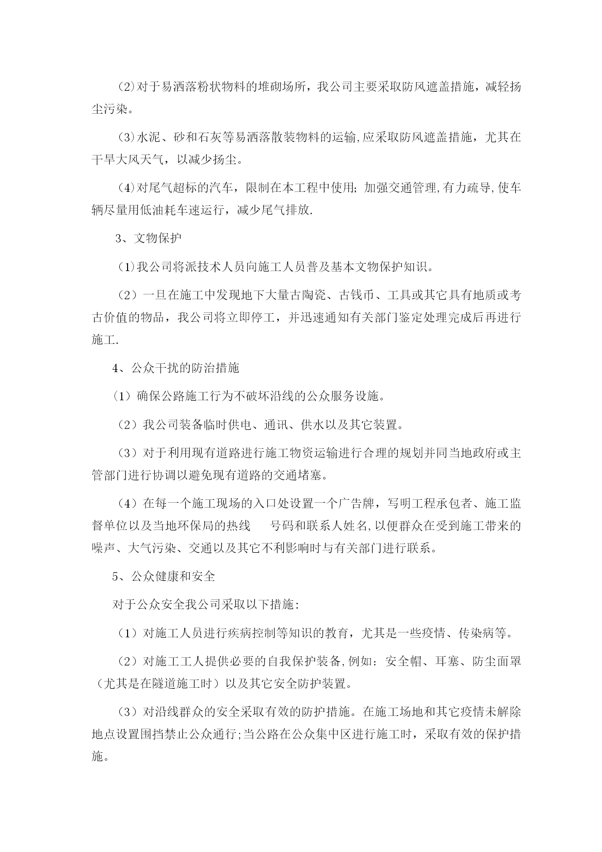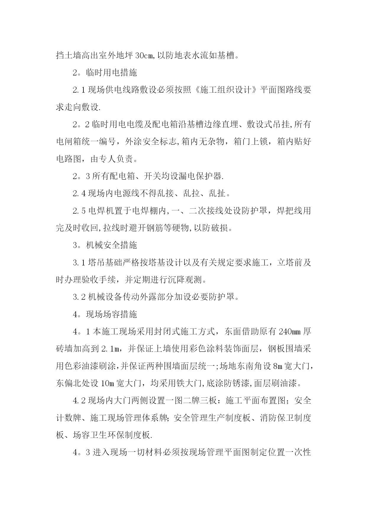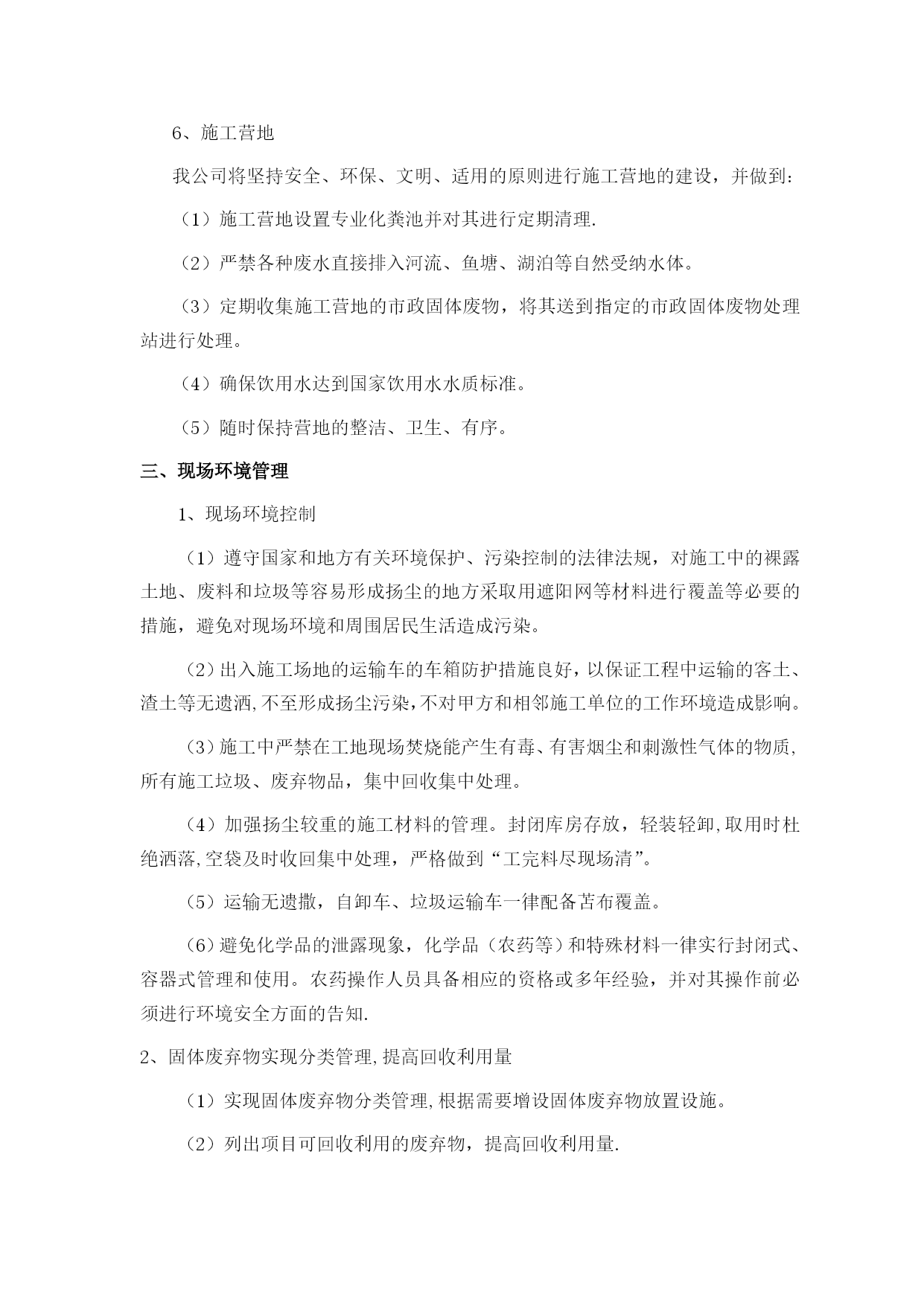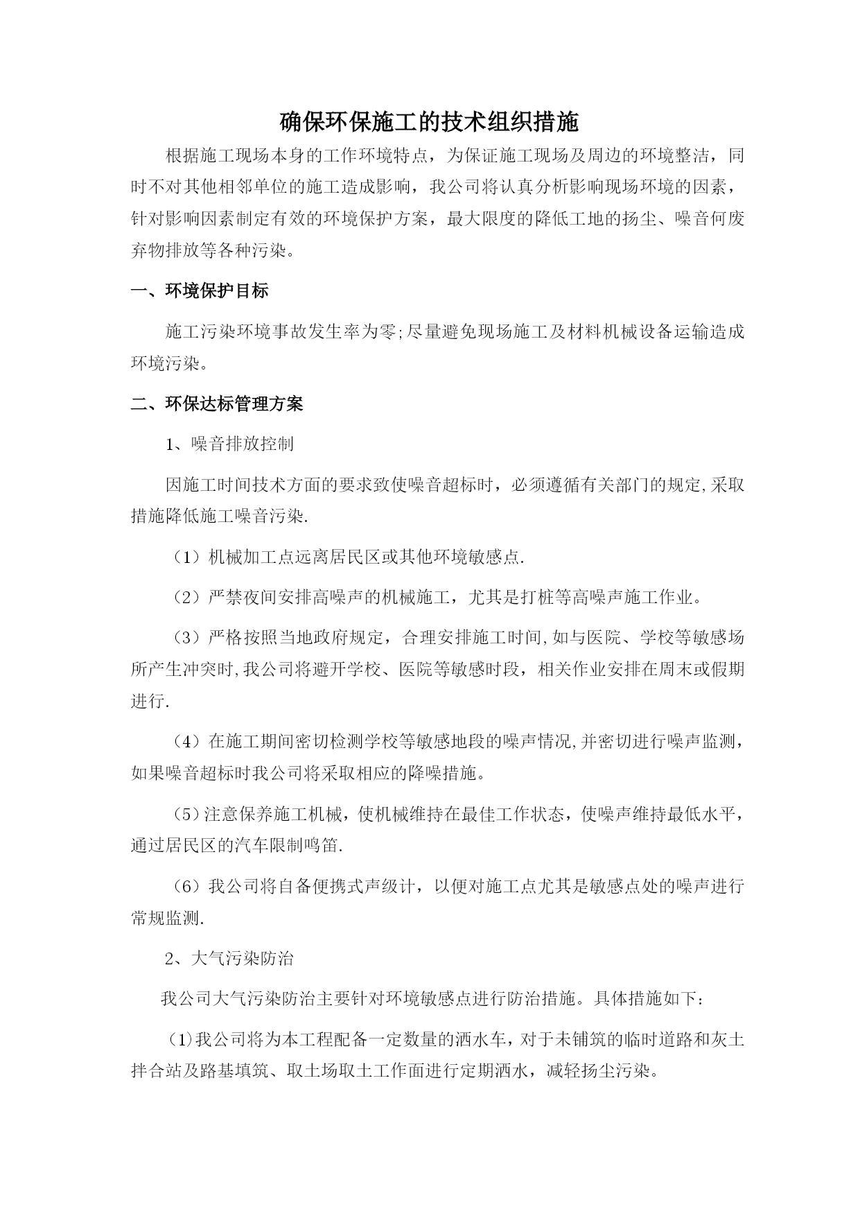 确保环保施工的技术组织措施【实用文档】doc文档可直接使用可编辑,欢迎下载确保环保施工的技术组织措施根据施工现场本身的工作环境特点,为保证施工现场及周边的环境整洁,同时不对其他相邻单位的施工造成影响,我公司将认真分析影响现场环境的因素,针对影响因素制定有效的环境保护方案,最大限度的降低工地的扬尘、噪音何废弃物排放等各种污染。一、环境保护目标施工污染环境事故发生率为零;尽量避免现场施工及材料机械设备运输造成环境污染。二、环保达标管理方案1、噪音排放控制因施工时间技术方面的要求致使噪音超标时,必须遵循有关部门的规定,采取措施降低施工噪音污染.机械加工点远离居民区或其他环境敏感点.严禁夜间安排高噪声的机械施工,尤其是打桩等高噪声施工作业。严格按照当地政府规定,合理安排施工时间,如与医院、学校等敏感场所产生冲突时,我公司将避开学校、医院等敏感时段,相关作业安排在周末或假期进行.在施工期间密切检测学校等敏感地段的噪声情况,并密切进行噪声监测,如果噪音超标时我公司将采取相应的降噪措施。注意保养施工机械,使机械维持在最佳工作状态,使噪声维持最低水平,通过居民区的汽车限制鸣笛.我公司将自备便携式声级计,以便对施工点尤其是敏感点处的噪声进行常规监测.2、大气污染防治我公司大气污染防治主要针对环境敏感点进行防治措施。具体措施如下:我公司将为本工程配备一定数量的洒水车,对于未铺筑的临时道路和灰土拌合站及路基填筑、取土场取土工作面进行定期洒水,减轻扬尘污染。对于易洒落粉状物料的堆砌场所,我公司主要采取防风遮盖措施,减轻扬尘污染。水泥、砂和石灰等易洒落散装物料的运输,应采取防风遮盖措施,尤其在干旱大风天气,以减少扬尘。对尾气超标的汽车,限制在本工程中使用;加强交通管理,有力疏导,使车辆尽量用低油耗车速运行,减少尾气排放.文物保护(1)我公司将派技术人员向施工人员普及基本文物保护知识。(2)一旦在施工中发现地下大量古陶瓷、古钱币、工具或其它具有地质或考古价值的物品,我公司将立即停工,并迅速通知有关部门鉴定处理完成后再进行施工.4、公众干扰的防治措施(1)确保公路施工行为不破坏沿线的公众服务设施。(2)我公司装备临时供电、通讯、供水以及其它装置。(3)对于利用现有道路进行施工物资运输进行合理的规划并同当地政府或主管部门进行协调以避免现有道路的交通堵塞。(4)在每一个施工现场的入口处设置一个广告牌,写明工程承包者、施工监督单位以及当地环保局的热线号码和联系人姓名,以便群众在受到施工带来的噪声、大气污染、交通以及其它不利影响时与有关部门进行联系。5、公众健康和安全对于公众安全我公司采取以下措施:对施工人员进行疾病控制等知识的教育,尤其是一些疫情、传染病等。对施工工人提供必要的自我保护装备,例如:安全帽、耳塞、防尘面罩(尤其是在隧道施工时)以及其它安全防护装置。对沿线群众的安全采取有效的防护措施。在施工场地和其它疫情未解除地点设置围挡禁止公众通行;当公路在公众集中区进行施工时,采取有效的保护措施。施工营地我公司将坚持安全、环保、文明、适用的原则进行施工营地的建设,并做到:施工营地设置专业化粪池并对其进行定期清理.严禁各种废水直接排入河流、鱼塘、湖泊等自然受纳水体。定期收集施工营地的市政固体废物,将其送到指定的市政固体废物处理站进行处理。确保饮用水达到国家饮用水水质标准。随时保持营地的整洁、卫生、有序。三、现场环境管理1、现场环境控制(1)遵守国家和地方有关环境保护、污染控制的法律法规,对施工中的裸露土地、废料和垃圾等容易形成扬尘的地方采取用遮阳网等材料进行覆盖等必要的措施,避免对现场环境和周围居民生活造成污染。(2)出入施工场地的运输车的车箱防护措施良好,以保证工程中运输的客土、渣土等无遗洒,不至形成扬尘污染,不对甲方和相邻施工单位的工作环境造成影响。(3)施工中严禁在工地现场焚烧能产生有毒、有害烟尘和刺激性气体的物质,所有施工垃圾、废弃物品,集中回收集中处理。(4)加强扬尘较重的施工材料的管理。封闭库房存放,轻装轻卸,取用时杜绝洒落,空袋及时收回集中处理,严格做到“工完料尽现场清”。(5)运输无遗撒,自卸车、垃圾运输车一律配备苫布覆盖。(6)避免化学品的泄露现象,化学品(农药等)和特殊材料一律实行封闭式、容器式管理和使用。农药操作人员具备相应的资格或多年经验,并对其操作前必须进行环境安全方面的告知.2、固体废弃物实现分类管理,提高回收利用量(1)实现固体废弃物分类管理,根据需要增设固体废弃物放置设施。(2)列出项目可回收利用的废弃物,提高回收利用量.(3)废弃物要及时收集并处理。四、节水节能措施1、节约水资源措施(1)施工用水由专业人员负责,落实责任到