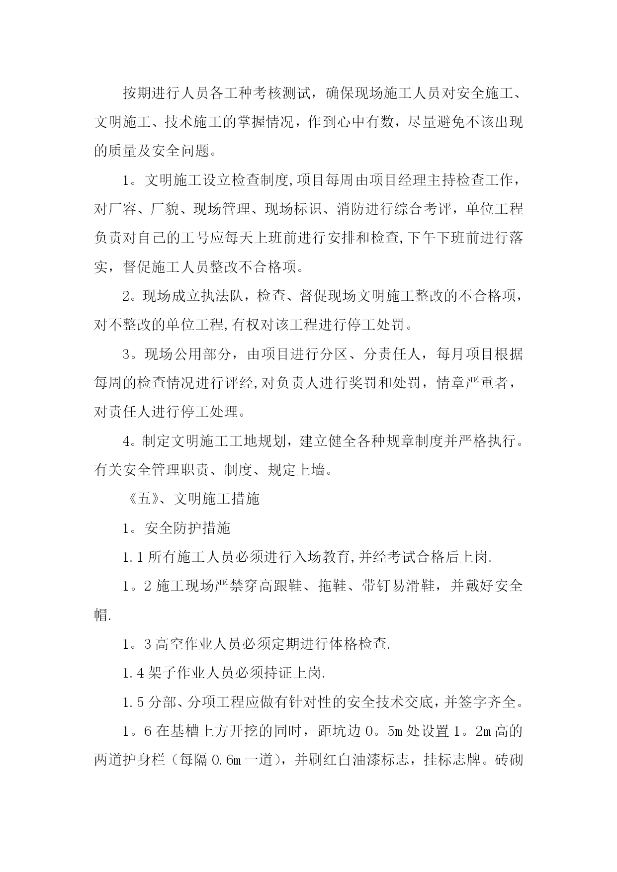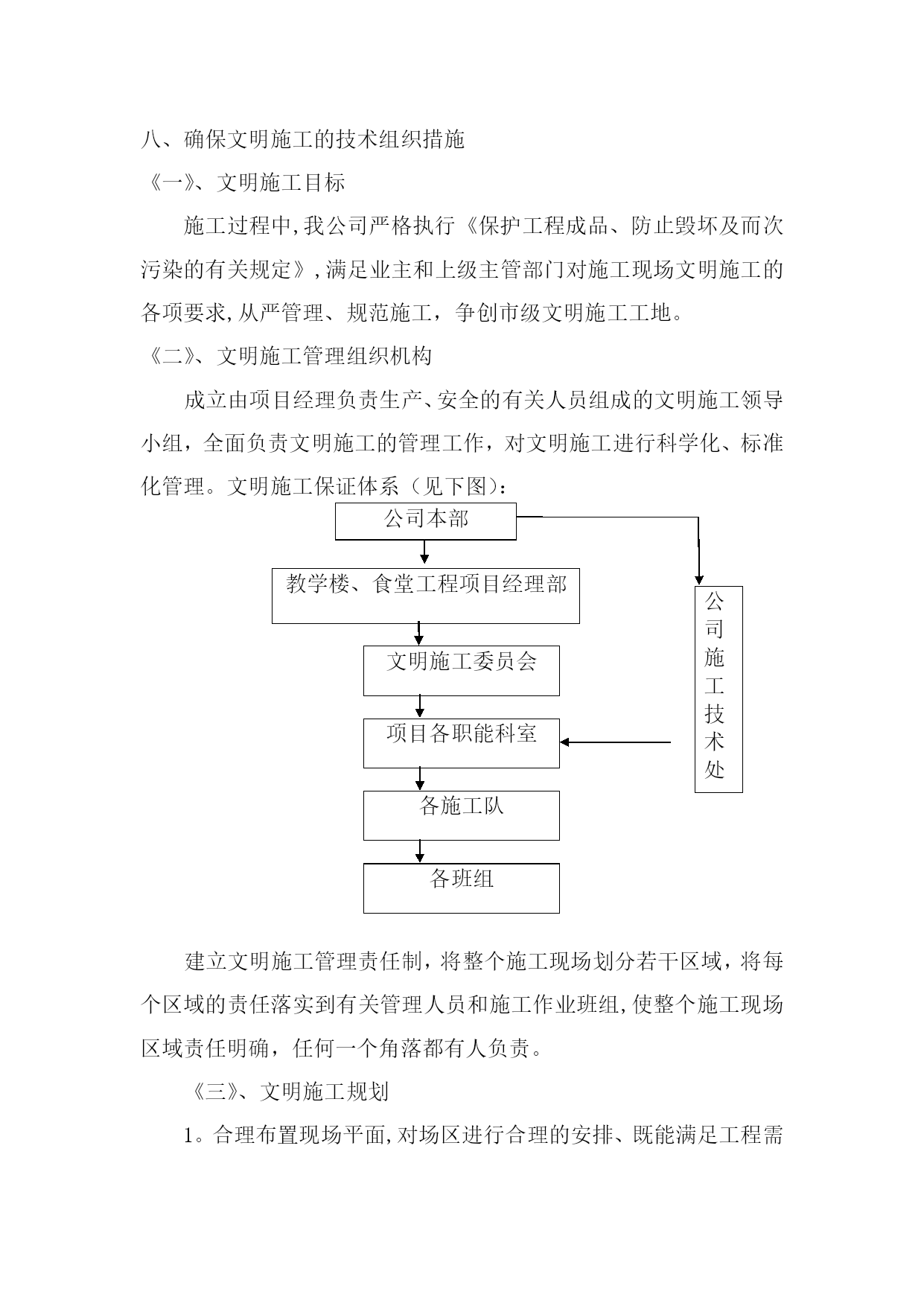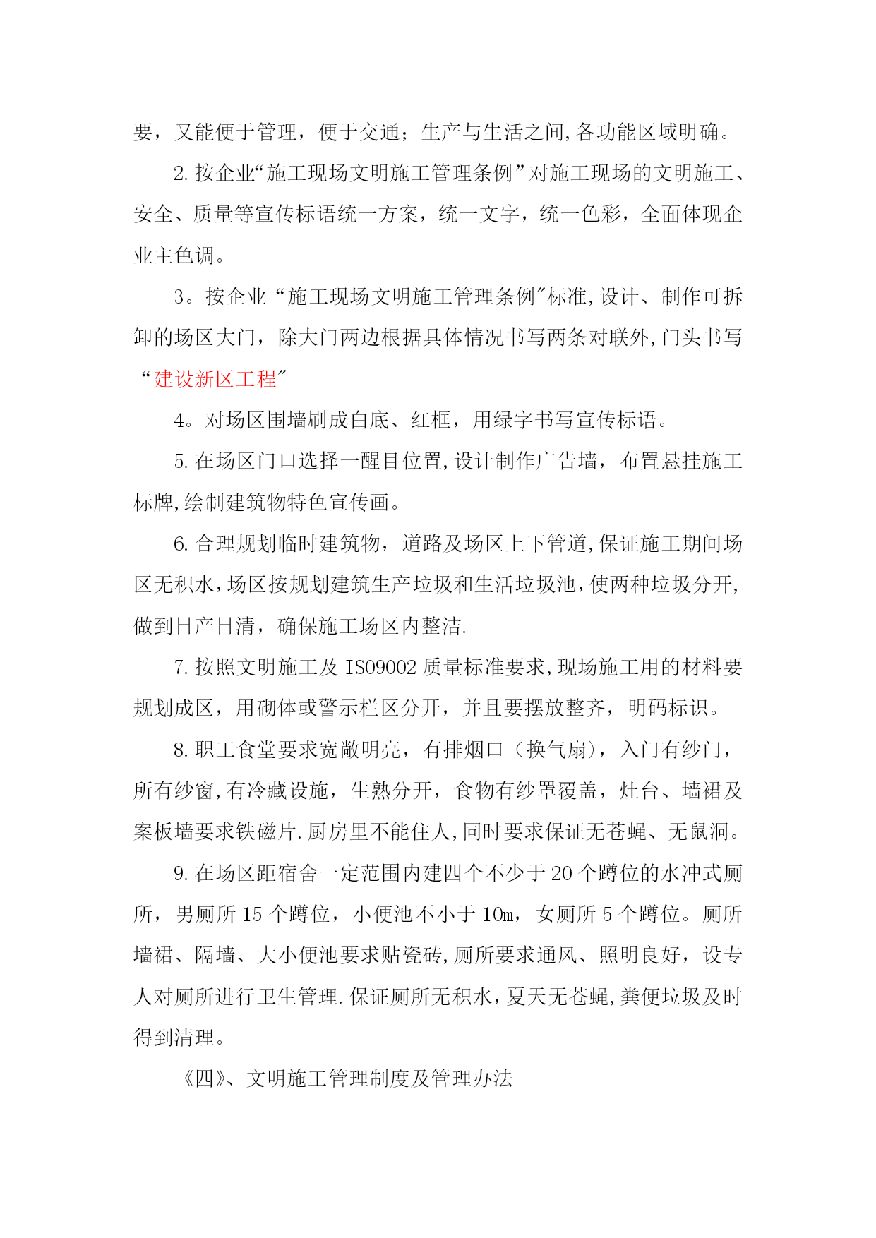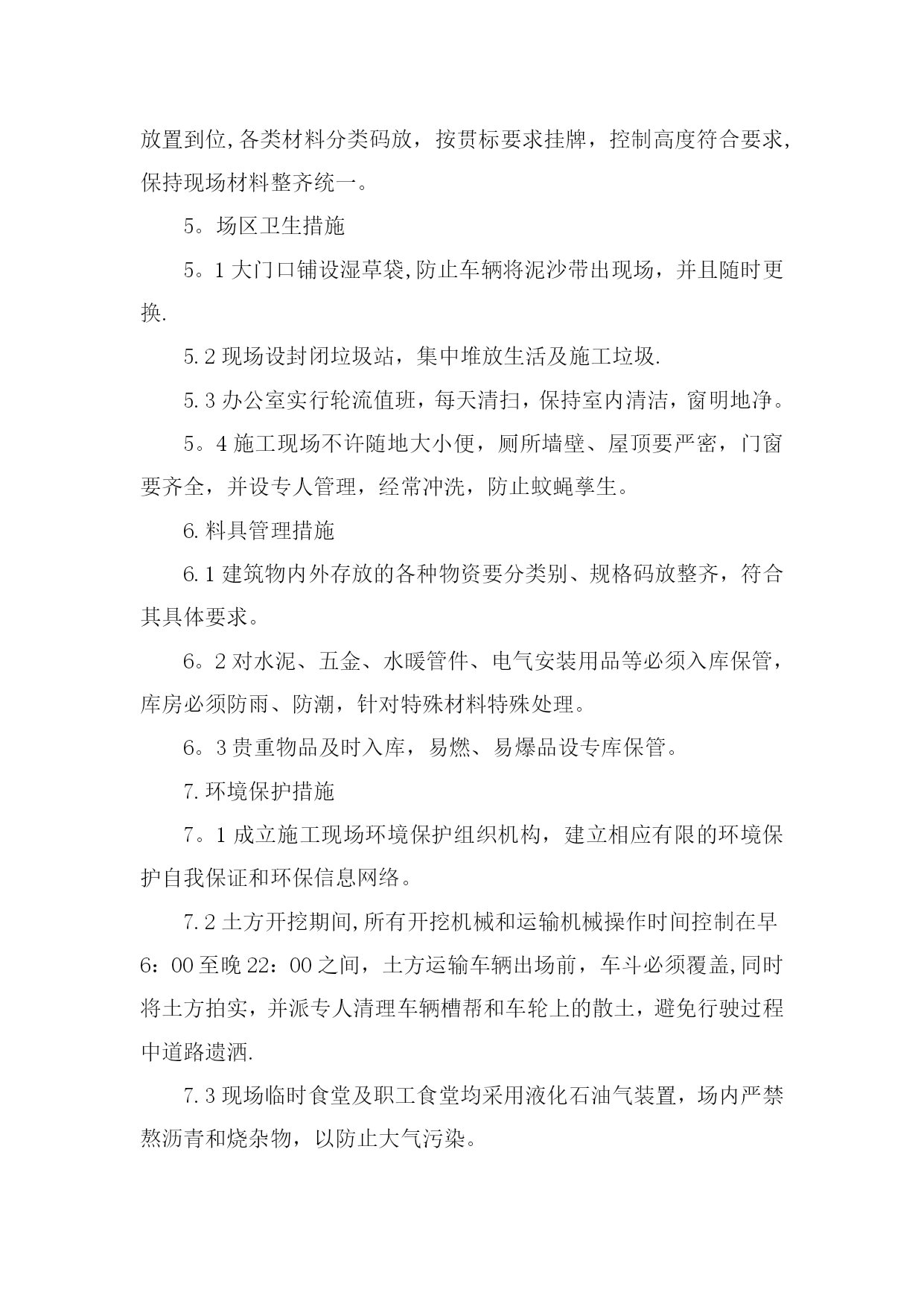 确保环保施工的技术组织措施【实用文档】doc文档可直接使用可编辑,欢迎下载确保环保施工的技术组织措施根据施工现场本身的工作环境特点,为保证施工现场及周边的环境整洁,同时不对其他相邻单位的施工造成影响,我公司将认真分析影响现场环境的因素,针对影响因素制定有效的环境保护方案,最大限度的降低工地的扬尘、噪音何废弃物排放等各种污染。一、环境保护目标施工污染环境事故发生率为零;尽量避免现场施工及材料机械设备运输造成环境污染。二、环保达标管理方案1、噪音排放控制因施工时间技术方面的要求致使噪音超标时,必须遵循有关部门的规定,采取措施降低施工噪音污染.机械加工点远离居民区或其他环境敏感点.严禁夜间安排高噪声的机械施工,尤其是打桩等高噪声施工作业。严格按照当地政府规定,合理安排施工时间,如与医院、学校等敏感场所产生冲突时,我公司将避开学校、医院等敏感时段,相关作业安排在周末或假期进行.在施工期间密切检测学校等敏感地段的噪声情况,并密切进行噪声监测,如果噪音超标时我公司将采取相应的降噪措施。注意保养施工机械,使机械维持在最佳工作状态,使噪声维持最低水平,通过居民区的汽车限制鸣笛.我公司将自备便携式声级计,以便对施工点尤其是敏感点处的噪声进行常规监测.2、大气污染防治我公司大气污染防治主要针对环境敏感点进行防治措施。具体措施如下:我公司将为本工程配备一定数量的洒水车,对于未铺筑的临时道路和灰土拌合站及路基填筑、取土场取土工作面进行定期洒水,减轻扬尘污染。对于易洒落粉状物料的堆砌场所,我公司主要采取防风遮盖措施,减轻扬尘污染。水泥、砂和石灰等易洒落散装物料的运输,应采取防风遮盖措施,尤其在干旱大风天气,以减少扬尘。对尾气超标的汽车,限制在本工程中使用;加强交通管理,有力疏导,使车辆尽量用低油耗车速运行,减少尾气排放.文物保护(1)我公司将派技术人员向施工人员普及基本文物保护知识。(2)一旦在施工中发现地下大量古陶瓷、古钱币、工具或其它具有地质或考古价值的物品,我公司将立即停工,并迅速通知有关部门鉴定处理完成后再进行施工.4、公众干扰的防治措施(1)确保公路施工行为不破坏沿线的公众服务设施。(2)我公司装备临时供电、通讯、供水以及其它装置。(3)对于利用现有道路进行施工物资运输进行合理的规划并同当地政府或主管部门进行协调以避免现有道路的交通堵塞。(4)在每一个施工现场的入口处设置一个广告牌,写明工程承包者、施工监督单位以及当地环保局的热线号码和联系人姓名,以便群众在受到施工带来的噪声、大气污染、交通以及其它不利影响时与有关部门进行联系。5、公众健康和安全对于公众安全我公司采取以下措施:对施工人员进行疾病控制等知识的教育,尤其是一些疫情、传染病等。对施工工人提供必要的自我保护装备,例如:安全帽、耳塞、防尘面罩(尤其是在隧道施工时)以及其它安全防护装置。对沿线群众的安全采取有效的防护措施。在施工场地和其它疫情未解除地点设置围挡禁止公众通行;当公路在公众集中区进行施工时,采取有效的保护措施。施工营地我公司将坚持安全、环保、文明、适用的原则进行施工营地的建设,并做到:施工营地设置专业化粪池并对其进行定期清理.严禁各种废水直接排入河流、鱼塘、湖泊等自然受纳水体。定期收集施工营地的市政固体废物,将其送到指定的市政固体废物处理站进行处理。确保饮用水达到国家饮用水水质标准。随时保持营地的整洁、卫生、有序。三、现场环境管理1、现场环境控制(1)遵守国家和地方有关环境保护、污染控制的法律法规,对施工中的裸露土地、废料和垃圾等容易形成扬尘的地方采取用遮阳网等材料进行覆盖等必要的措施,避免对现场环境和周围居民生活造成污染。(2)出入施工场地的运输车的车箱防护措施良好,以保证工程中运输的客土、渣土等无遗洒,不至形成扬尘污染,不对甲方和相邻施工单位的工作环境造成影响。(3)施工中严禁在工地现场焚烧能产生有毒、有害烟尘和刺激性气体的物质,所有施工垃圾、废弃物品,集中回收集中处理。(4)加强扬尘较重的施工材料的管理。封闭库房存放,轻装轻卸,取用时杜绝洒落,空袋及时收回集中处理,严格做到“工完料尽现场清”。(5)运输无遗撒,自卸车、垃圾运输车一律配备苫布覆盖。(6)避免化学品的泄露现象,化学品(农药等)和特殊材料一律实行封闭式、容器式管理和使用。农药操作人员具备相应的资格或多年经验,并对其操作前必须进行环境安全方面的告知.2、固体废弃物实现分类管理,提高回收利用量(1)实现固体废弃物分类管理,根据需要增设固体废弃物放置设施。(2)列出项目可回收利用的废弃物,提高回收利用量.(3)废弃物要及时收集并处理。四、节水节能措施1、节约水资源措施(1)施工用水由专业人员负责,落实责任到