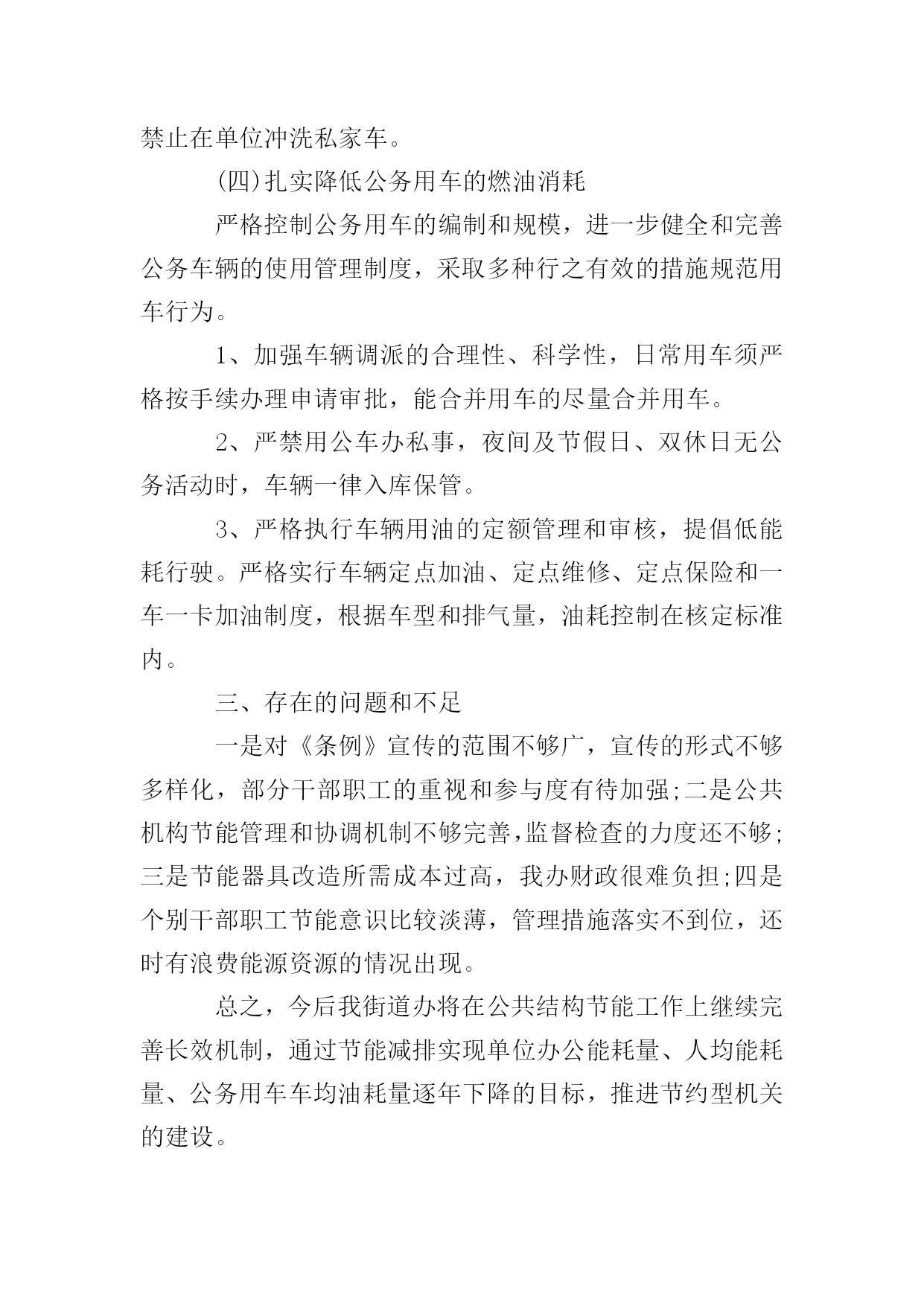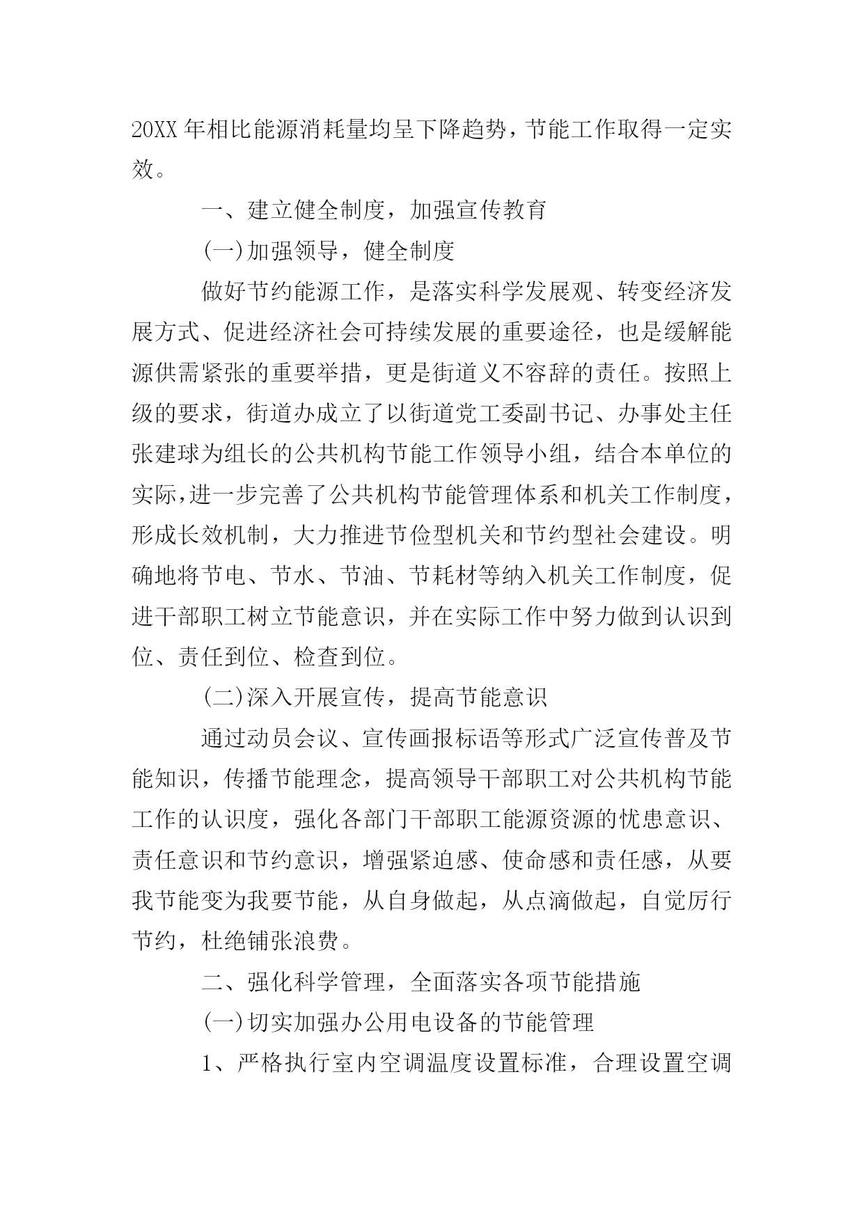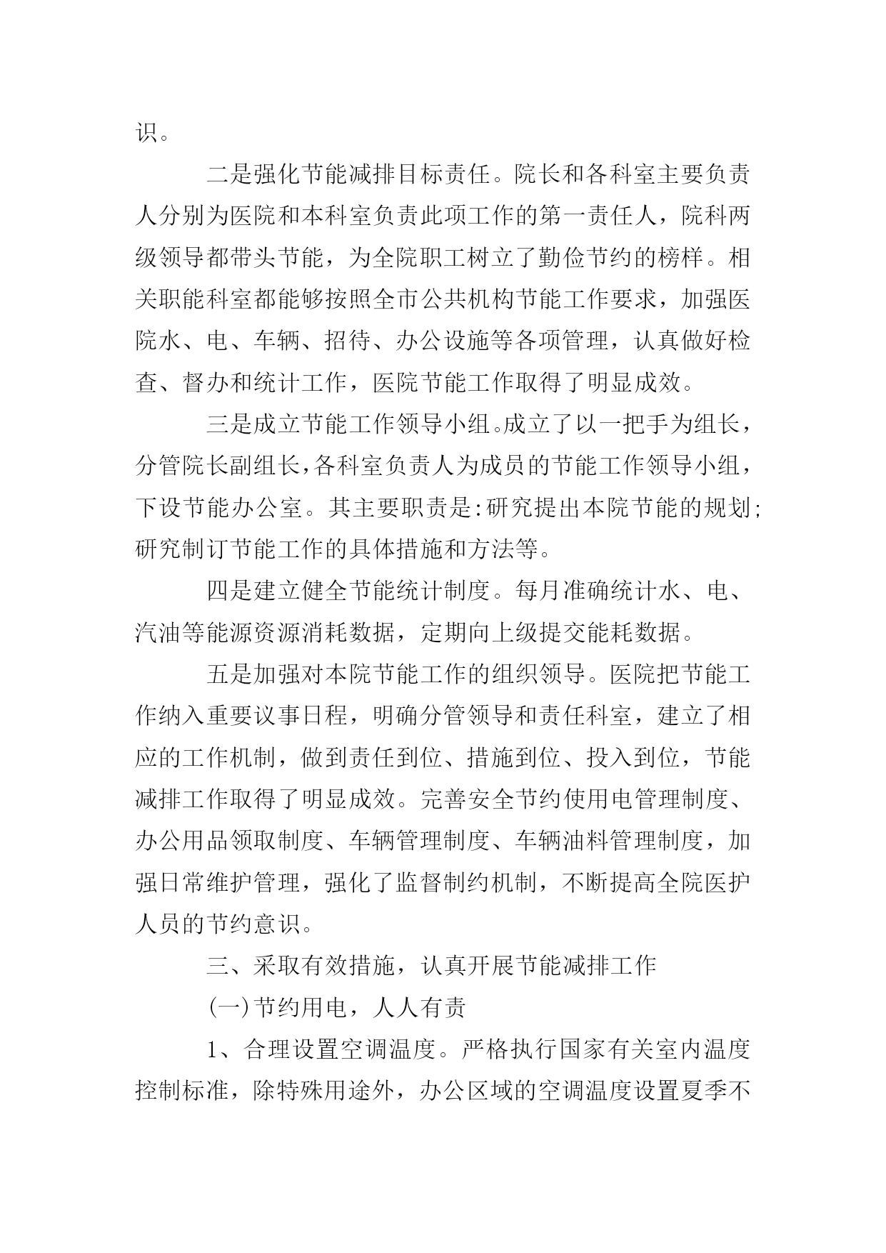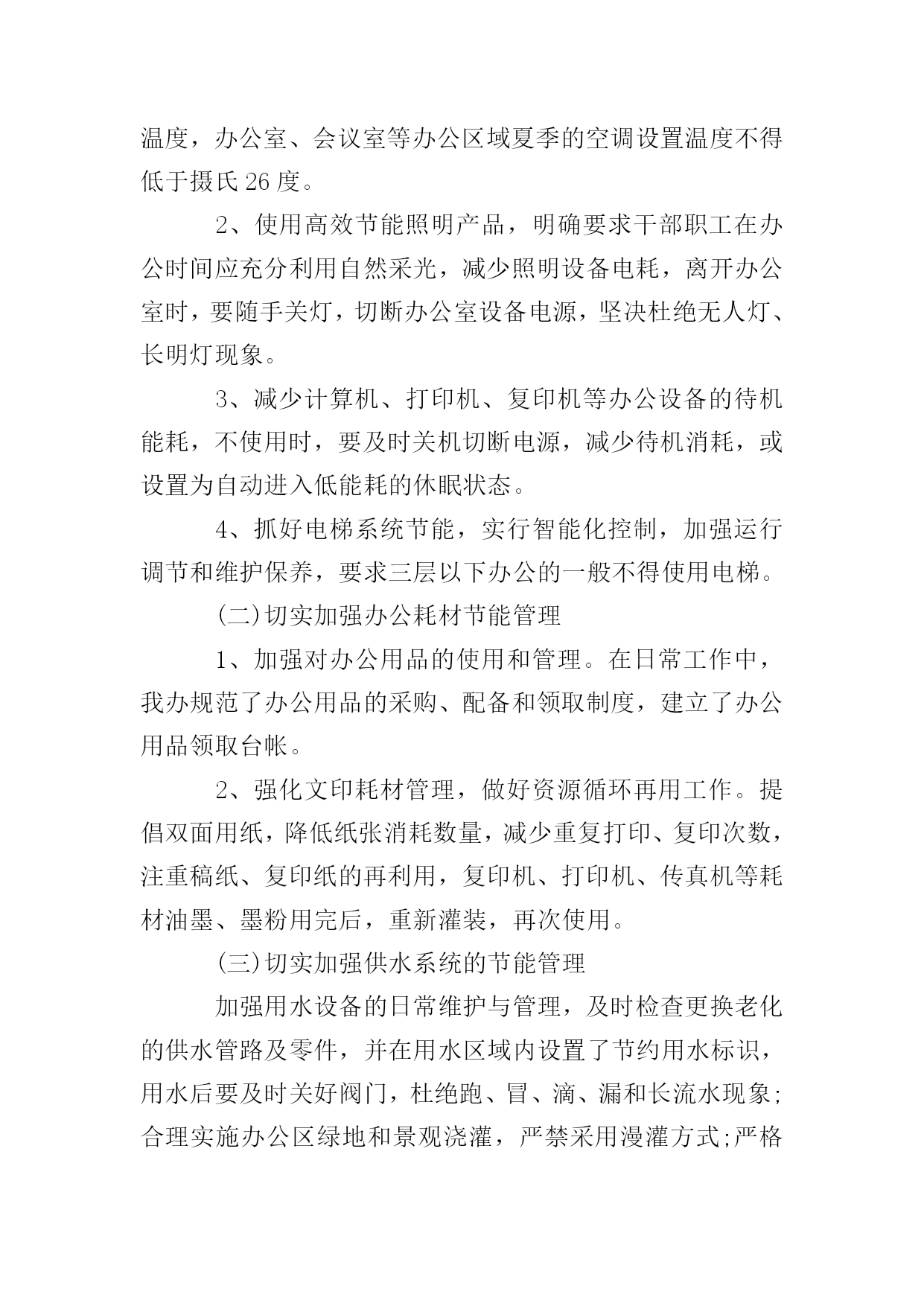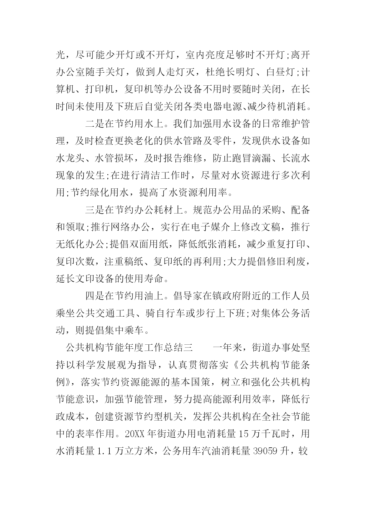 公共机构节能年度工作总结节能已经是当今世界的主题,做好节能工作,回馈大自然。下面是小编整理的公共机构节能年度工作总结,请阅读,上公文站,发现学习。公共机构节能年度工作总结一为了更好的贯彻落实《中华人民共和国节约能源法》、《公共机构节能条例》等法律法规精神,进一步推进我县公共机构节能工作和节约型公共机构示范单位建设,确保节能工作目标的顺利完成,以抓好节约水、电、汽车用油、汽车维修、办公耗材费用开支为工作重点,创新机制,加强管理,引导广大干部职工树立节约意识,发挥表率作用,自觉厉行节约,反对铺张浪费,现将我院公共节能工作总结如下:一、统一思想,提高认识,增强节能的责任感和自觉性我院从贯彻落实科学发展观,加快推进和谐、小康、文明城市建设的要求出发,充分认识节能减排工作的重要性。全院职工统一思想,提高认识,切实增强资源忧患意识、节约意识和责任意识,从节约一度电、节省一张纸等点滴事做起,逐步形成了人人节能、事事节能、处处节能的良好氛围。二、加强组织领导,确保节能减排目标的实现一是开展节能减排宣传教育。在一楼大厅电子显示屏上滚动播出节能宣传标语,在楼道开关、卫生间、水笼头等显著位置张贴节约提示性警示语等形式,大力宣传节能降耗,在医院形成了浓厚的宣传教育氛围,强化了职工节能降耗意识。二是强化节能减排目标责任。院长和各科室主要负责人分别为医院和本科室负责此项工作的第一责任人,院科两级领导都带头节能,为全院职工树立了勤俭节约的榜样。相关职能科室都能够按照全市公共机构节能工作要求,加强医院水、电、车辆、招待、办公设施等各项管理,认真做好检查、督办和统计工作,医院节能工作取得了明显成效。三是成立节能工作领导小组。成立了以一把手为组长,分管院长副组长,各科室负责人为成员的节能工作领导小组,下设节能办公室。其主要职责是:研究提出本院节能的规划;研究制订节能工作的具体措施和方法等。四是建立健全节能统计制度。每月准确统计水、电、汽油等能源资源消耗数据,定期向上级提交能耗数据。五是加强对本院节能工作的组织领导。医院把节能工作纳入重要议事日程,明确分管领导和责任科室,建立了相应的工作机制,做到责任到位、措施到位、投入到位,节能减排工作取得了明显成效。完善安全节约使用电管理制度、办公用品领取制度、车辆管理制度、车辆油料管理制度,加强日常维护管理,强化了监督制约机制,不断提高全院医护人员的节约意识。三、采取有效措施,认真开展节能减排工作(一)节约用电,人人有责1、合理设置空调温度。严格执行国家有关室内温度控制标准,除特殊用途外,办公区域的空调温度设置夏季不得低于26摄氏度,并做到无人时不开空调,非工作时间、节假日不开空调,离开前半小时关闭空调。提倡每天少开1小时空调,开空调时不开门窗,定期对空调进行节能清洗,提高空调能效。2、办公室、会议、诊室、病房等场所尽量采用自然光,尽可能少开灯或不开灯,室内亮度足够时不再开灯,离开办公室要随手关灯,做到人走灯灭,防止长明灯现象。3、优先采用环保、节能型电器和设备,逐步淘汰高能耗和低能效的设施、设备。减少计算机、打印机、复印机、饮水机等办公室设备的待机能耗。(二)节约用水,贵在点滴1、加强用水设备的日常维护管理,定期检查更换老化的供水管路。2、培养节水习惯,自来水龙头要随时用随时关,尽量减少自来水滴、漏现象,坚决杜绝长流水现象,在用水区域设置节约用水标识。3、采取定时送热水措施,每天两次专人负责给全院职工和患者供应开水,较好的节约了水资源。(三)节约使用办公耗材进一步节省办公支出,合理制定办公设备配备标准,严格控制办公设备采购,严格公务开支标准,减少不必要的公务支出。节约使用文印纸张、耗材,减少浪费;注重办公设备的保养与维护,减少维修支出;禁止用办公电话、电脑、复印机等办理私事,减少办公费用。(四)公务车辆节能严格执行车辆管理办法,提倡同一时间、同一方向用车科室拼车同乘,提高车辆使用效率。加强对全院车辆燃料、维修、保养费用支出的检查,阻塞漏洞,严格控制公车私用。一年来,医院节能减排工作在全院职工的共同努力下,取得了阶段性进展,但与上级的要求相比,还存在着一定的差距。为此在下一年的工作中将努力做到以下四个进一步:一是进一步加大宣传与动员力度,强化人人节约资源的意识、理念和习惯;二是进一步完善节能工作机制,推进节能工作向纵深发展;三是进一步加强日常管理环节,抓住节水、节电、节油、节财关键;四是进一步推广使用节能新技术、新设施。公共机构节能年度工作总结二今年来,我镇积极贯彻上级文件精神,落实节能减排各项措施,加强日常管理和检查监督,从制度上保证,从行动上落实,以节电、节水、节油、节材为重点,在镇机关内广泛开展了公共机构节能减排工作。现就