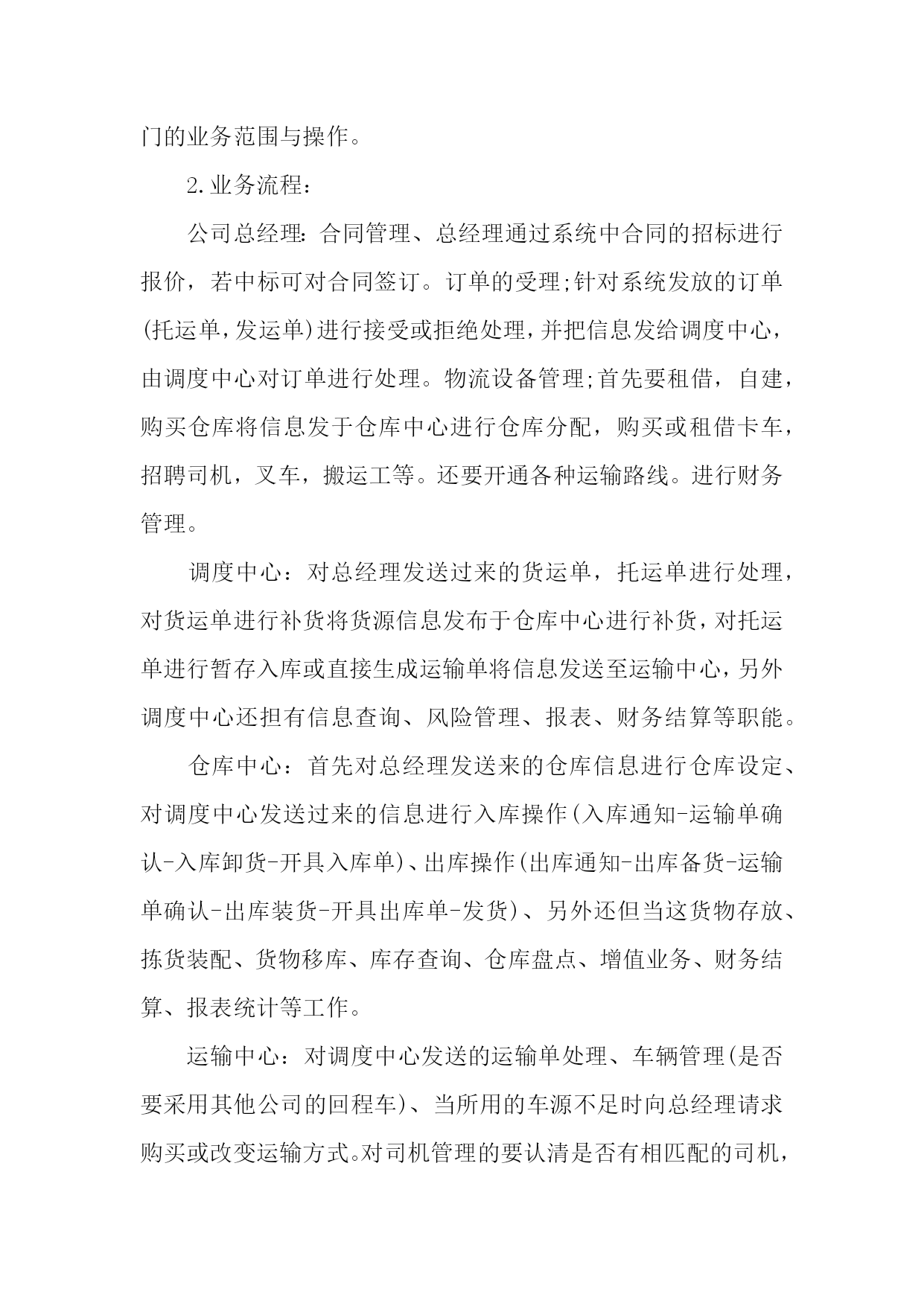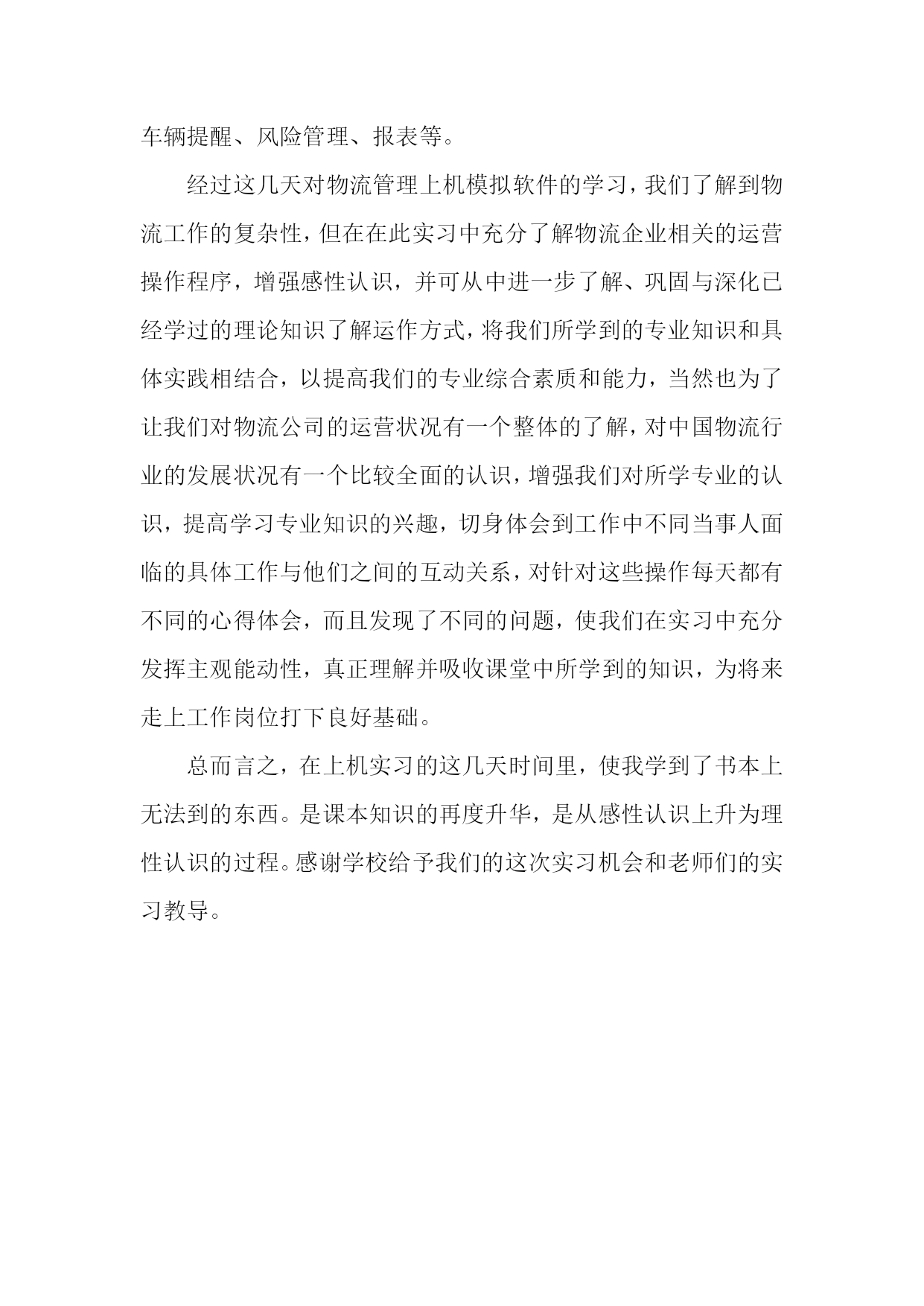 物流专业暑假实习报告为了更好的适应以后的学习和工作,在本学期末,由学校统一安排利用浙科物流管理软件进行实习。我们将所学到的专业知识和具体实践相结合,以提高我们的专业综合素质和能力,当然也为了让我们对物流公司的运营状况有一个整体的了解,物流的特点,主要设备和作业流程,运营管理,增强同学们对所学专业的认识,提高学习专业知识的兴趣,深化对所学知识的理解,以便即将迈入社会的我们能够更好的适应以后的学习和工作,为以后的学习和工作打下坚实的基础“物流”作为国民经济发展的动脉和基础产业,是一种新的生产力,是新的经济增长点。针对对这一物流形式学校利用浙科物流管理软件给我们一个更广泛的了解机会,软件中分公司总经理、调度中心、仓库中心、运输中心、四个角色来模拟现实的物流公司在一个模拟的市场环境中的实际操作。学生成立物流单位,各单位在同一市场下竞争来完成订单。通过路线优化、运输陪送、仓储规划、危险处理,加强实际业务操作能力。由教师控制和调整市场环境的各种因素来增加各物流公司操作难易度来增强学生实验兴趣,使学生增强市场应变能力,同时也使学生能更好的在实验的过程中与实际所学的物流知识相结合。1.系统基础知识了解:通过对机房里计算机中物流实训上机手册的阅读,基本了解上机模拟实训的步骤,流程,各个只能部门的业务范围与操作。2.业务流程:公司总经理:合同管理、总经理通过系统中合同的招标进行报价,若中标可对合同签订。订单的受理;针对系统发放的订单(托运单,发运单)进行接受或拒绝处理,并把信息发给调度中心,由调度中心对订单进行处理。物流设备管理;首先要租借,自建,购买仓库将信息发于仓库中心进行仓库分配,购买或租借卡车,招聘司机,叉车,搬运工等。还要开通各种运输路线。进行财务管理。调度中心:对总经理发送过来的货运单,托运单进行处理,对货运单进行补货将货源信息发布于仓库中心进行补货,对托运单进行暂存入库或直接生成运输单将信息发送至运输中心,另外调度中心还担有信息查询、风险管理、报表、财务结算等职能。仓库中心:首先对总经理发送来的仓库信息进行仓库设定、对调度中心发送过来的信息进行入库操作(入库通知-运输单确认-入库卸货-开具入库单)、出库操作(出库通知-出库备货-运输单确认-出库装货-开具出库单-发货)、另外还但当这货物存放、拣货装配、货物移库、库存查询、仓库盘点、增值业务、财务结算、报表统计等工作。运输中心:对调度中心发送的运输单处理、车辆管理(是否要采用其他公司的回程车)、当所用的车源不足时向总经理请求购买或改变运输方式。对司机管理的要认清是否有相匹配的司机,车辆提醒、风险管理、报表等。经过这几天对物流管理上机模拟软件的学习,我们了解到物流工作的复杂性,但在在此实习中充分了解物流企业相关的运营操作程序,增强感性认识,并可从中进一步了解、巩固与深化已经学过的理论知识了解运作方式,将我们所学到的专业知识和具体实践相结合,以提高我们的专业综合素质和能力,当然也为了让我们对物流公司的运营状况有一个整体的了解,对中国物流行业的发展状况有一个比较全面的认识,增强我们对所学专业的认识,提高学习专业知识的兴趣,切身体会到工作中不同当事人面临的具体工作与他们之间的互动关系,对针对这些操作每天都有不同的心得体会,而且发现了不同的问题,使我们在实习中充分发挥主观能动性,真正理解并吸收课堂中所学到的知识,为将来走上工作岗位打下良好基础。总而言之,在上机实习的这几天时间里,使我学到了书本上无法到的东西。是课本知识的再度升华,是从感性认识上升为理性认识的过程。感谢学校给予我们的这次实习机会和老师们的实习教导。