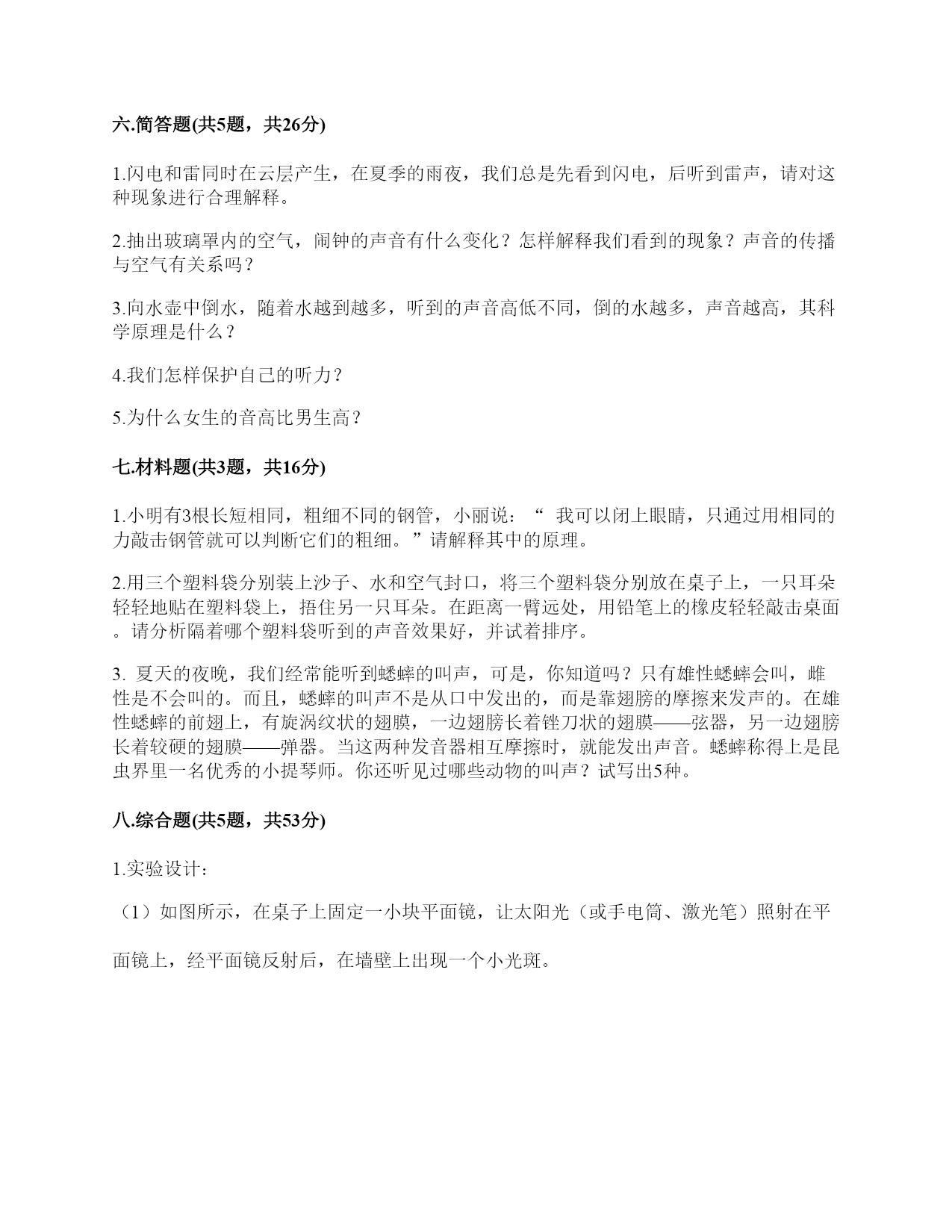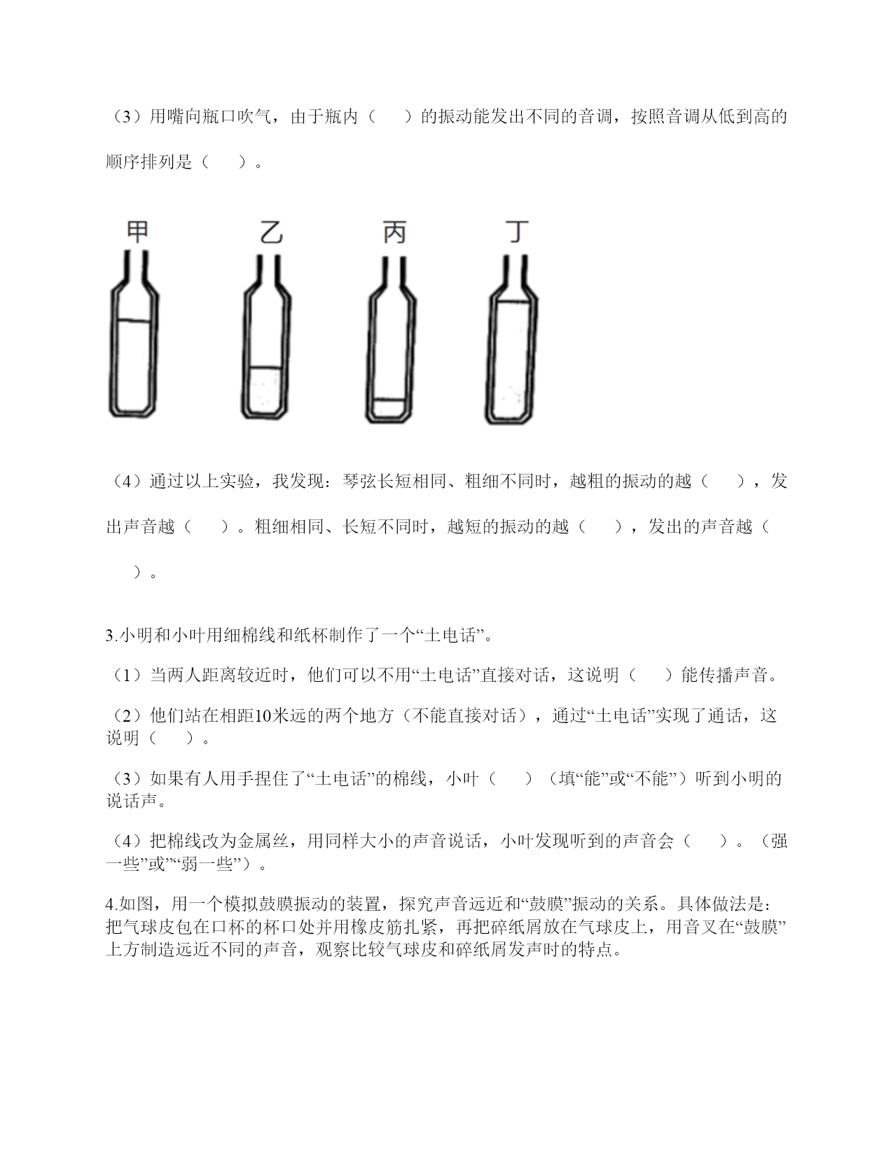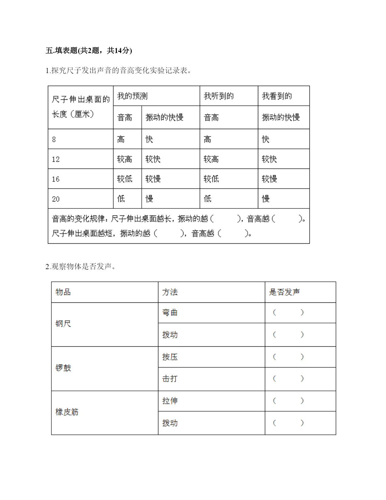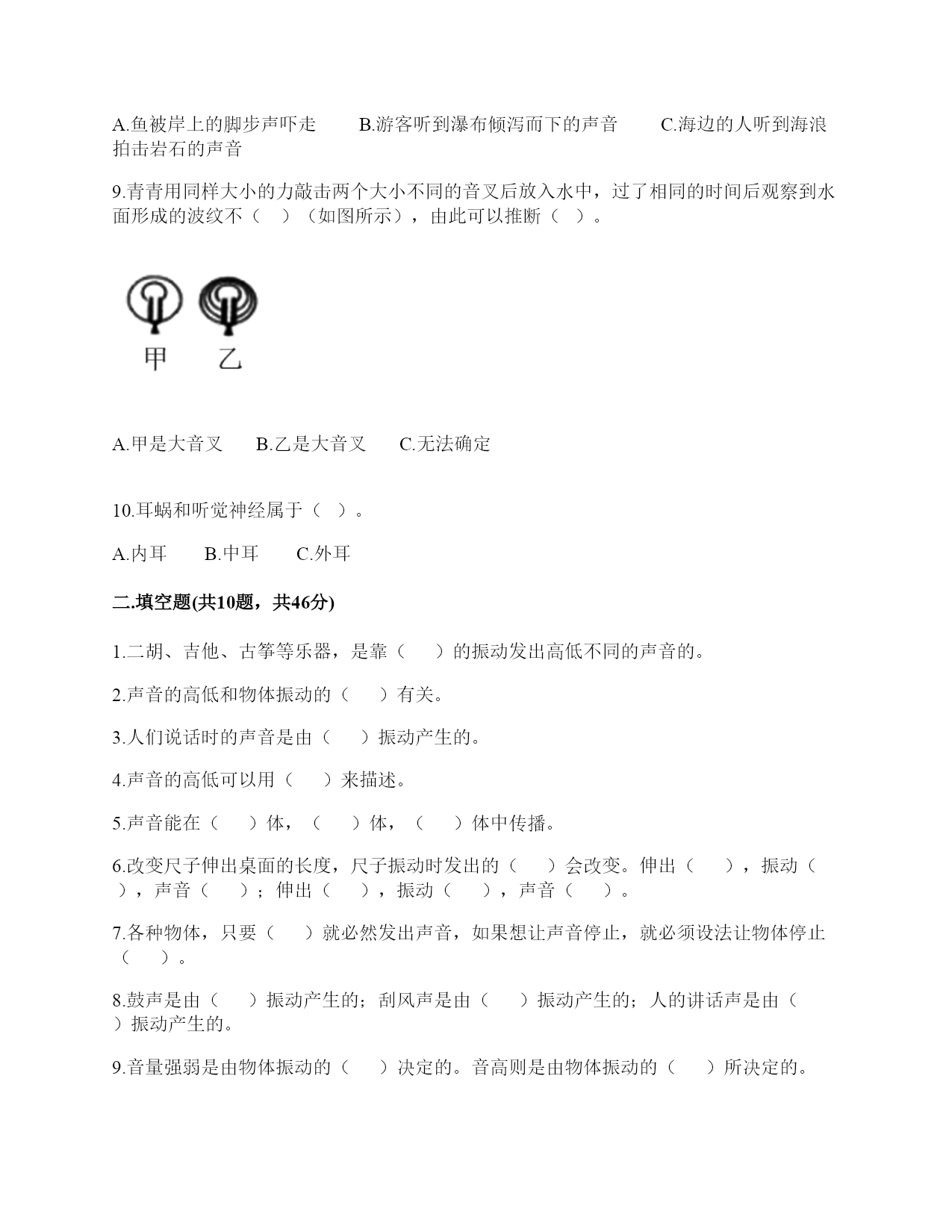 小学科学《声音》练习题一.选择题(共10题,共20分)1.敲击下面的杯子,能发出高音的是()。2.一般情况下,成年女子的声带比成年男子的短,振动速度快,这说明()。A.女子音高比男子高B.女子音高比男子低C.女子音量比男子高3.敲打音叉会发出声音,敲打停止了仍能听到一段余音,这是因为()。A.音叉停止振动后仍能发声B.声音传到人耳需要一段时间C.敲打停止后音叉继续振动了一段时间4.用击打过的音叉轻轻接触水面,水面会产生波纹,这说明音叉()了。A.变小B.变热C.振动5.吹奏笛子时,我们听到的声音主要是由()振动产生的。A.笛子本子B.笛子中的空气C.吹奏者的嘴唇6.下列关于声音说法正确的是()。A.声音可以在真空中传播B.声音可以在气体、液体和固体中向各个方向传播C.声音传播中遇到墙壁的阻挡就停止传播D.声音在水中比在空气中传播速度慢7.用橡皮筋自制简易古筝时,能听到较高声音的是()。A.琴弦调得紧一些B.弹得用力一些C.弹粗一些的琴弦8.下列现象中,说明声音能在液体中传播的是()。A.鱼被岸上的脚步声吓走B.游客听到瀑布倾泻而下的声音C.海边的人听到海浪拍击岩石的声音9.青青用同样大小的力敲击两个大小不同的音叉后放入水中,过了相同的时间后观察到水面形成的波纹不()(如图所示),由此可以推断()。A.甲是大音叉B.乙是大音叉C.无法确定10.耳蜗和听觉神经属于()。A.内耳B.中耳C.外耳二.填空题(共10题,共46分)1.二胡、吉他、古筝等乐器,是靠()的振动发出高低不同的声音的。2.声音的高低和物体振动的()有关。3.人们说话时的声音是由()振动产生的。4.声音的高低可以用()来描述。5.声音能在()体,()体,()体中传播。6.改变尺子伸出桌面的长度,尺子振动时发出的()会改变。伸出(),振动(),声音();伸出(),振动(),声音()。7.各种物体,只要()就必然发出声音,如果想让声音停止,就必须设法让物体停止()。8.鼓声是由()振动产生的;刮风声是由()振动产生的;人的讲话声是由()振动产生的。9.音量强弱是由物体振动的()决定的。音高则是由物体振动的()所决定的。10.用纸卷成一个“喇叭”,用这个纸喇叭听微弱的声音;拿掉纸喇叭,再听同样的声音。通过比较发现,用纸喇叭听到的声音比拿掉纸喇叭听到的声音更清楚,这说明纸喇叭有()的作用。这个模拟实验研究的是()的作用。三.判断题(共10题,共20分)1.物体振动的速度越快,发出的声音越强。()2.敲击过的音叉接触水面,水面出现许多波纹,说明声音以波的形式传播。()3.宇航员在月球上需要借助电子设备才能进行沟通,是因为他们穿的宇航服太厚了。()4.声音的传播与空气有关系。()5.橡皮筋没有发出声音,说明橡皮筋没有发生变化。()6.改变物体振动部分的长度,就可以改变物体振动发出的音量大小。()7.风声是自然界发出的声音。()8.喇叭发声时能弹起泡沫小球。()9.物体即使不振动,也能发出声音。()10.其他条件相同时,物体振动的越快,发出的声音越低。()四.连线题(共1题,共6分)1.下列声音主要是通过什么传播的?把它们起来。五.填表题(共2题,共14分)1.探究尺子发出声音的音高变化实验记录表。2.观察物体是否发声。六.简答题(共5题,共26分)1.闪电和雷同时在云层产生,在夏季的雨夜,我们总是先看到闪电,后听到雷声,请对这种现象进行合理解释。2.抽出玻璃罩内的空气,闹钟的声音有什么变化?怎样解释我们看到的现象?声音的传播与空气有关系吗?3.向水壶中倒水,随着水越到越多,听到的声音高低不同,倒的水越多,声音越高,其科学原理是什么?4.我们怎样保护自己的听力?5.为什么女生的音高比男生高?七.材料题(共3题,共16分)1.小明有3根长短相同,粗细不同的钢管,小丽说:“我可以闭上眼睛,只通过用相同的力敲击钢管就可以判断它们的粗细。”请解释其中的原理。2.用三个塑料袋分别装上沙子、水和空气封口,将三个塑料袋分别放在桌子上,一只耳朵轻轻地贴在塑料袋上,捂住另一只耳朵。在距离一臂远处,用铅笔上的橡皮轻轻敲击桌面。请分析隔着哪个塑料袋听到的声音效果好,并试着排序。3.夏天的夜晚,我们经常能听到蟋蟀的叫声,可是,你知道吗?只有雄性蟋蟀会叫,雌性是不会叫的。而且,蟋蟀的叫声不是从口中发出的,而是靠翅膀的摩擦来发声的。在雄性蟋蟀的前翅上,有旋涡纹状的翅膜,一边翅膀长着锉刀状的翅膜——弦器,另一边翅膀长着较硬的翅膜——弹器。当这两种发音器相互摩擦时,就能发出声音。蟋蟀称得上是昆虫界里一名优秀的小提琴师。你还听见过哪些动物的叫声?试写出5种。八.综合题(共5题,共