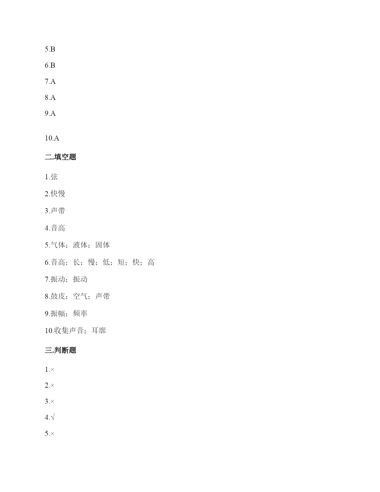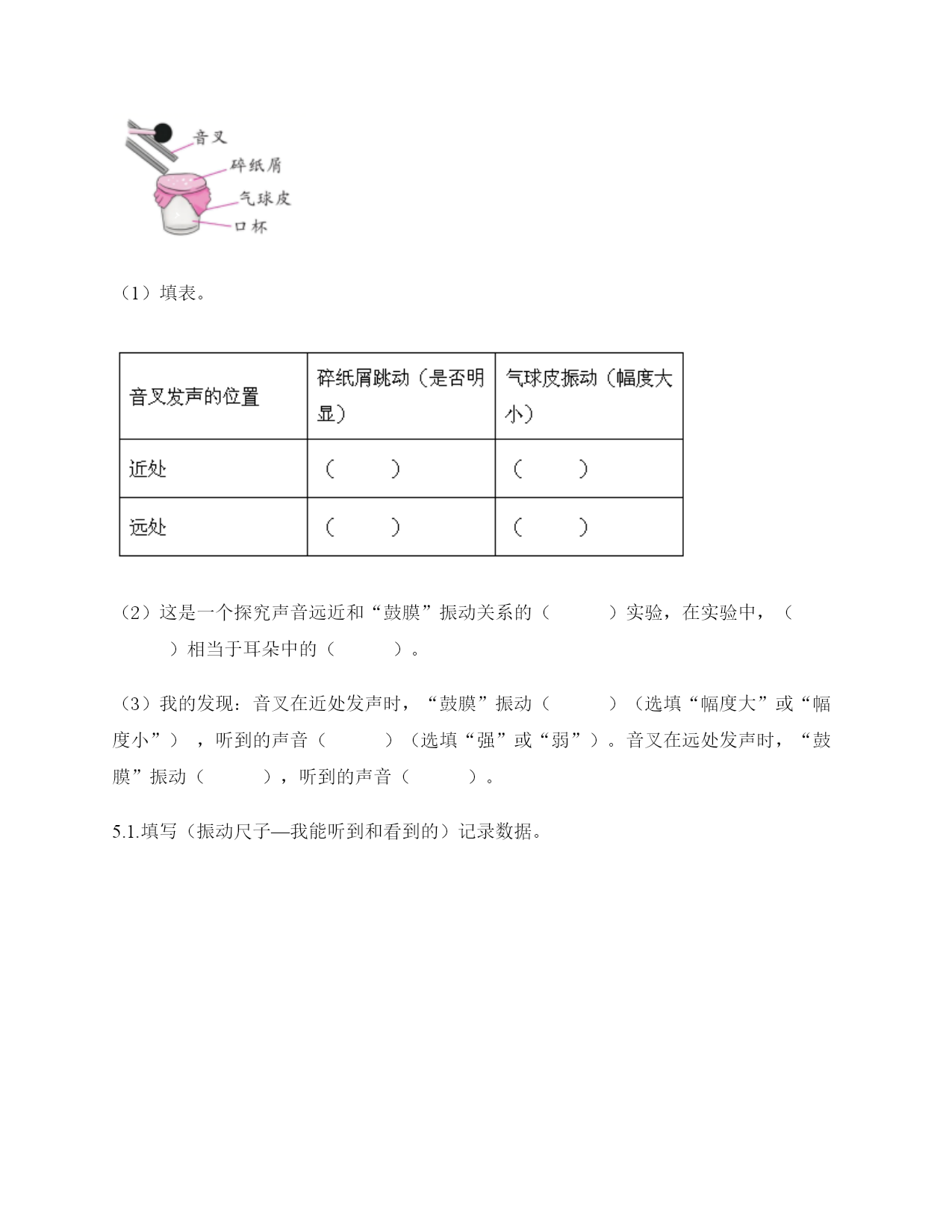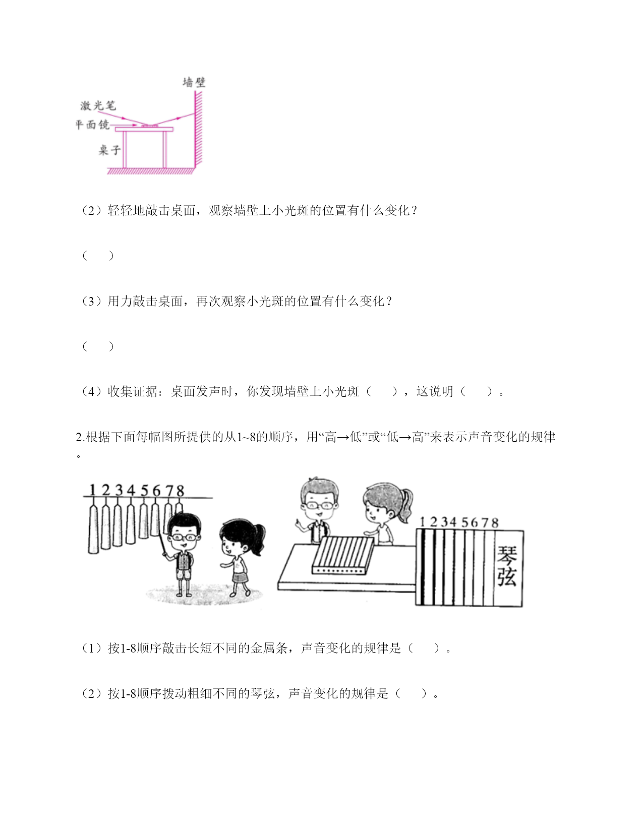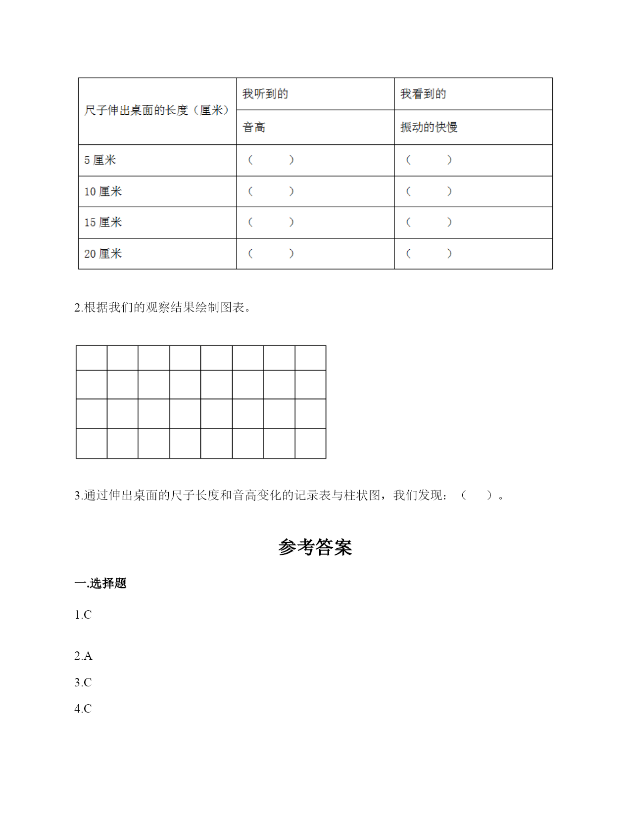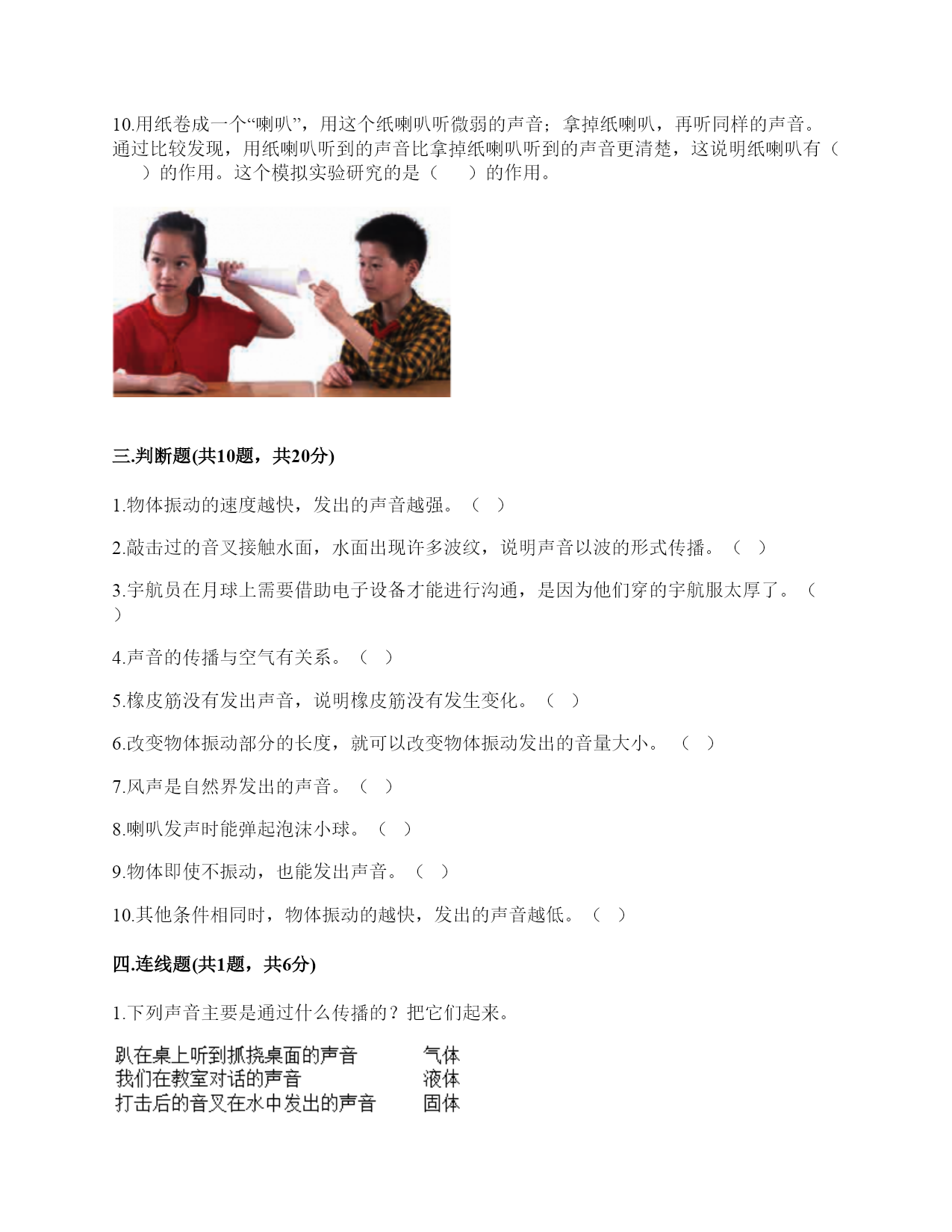 小学科学《声音》练习题一.选择题(共10题,共20分)1.敲击下面的杯子,能发出高音的是()。2.一般情况下,成年女子的声带比成年男子的短,振动速度快,这说明()。A.女子音高比男子高B.女子音高比男子低C.女子音量比男子高3.敲打音叉会发出声音,敲打停止了仍能听到一段余音,这是因为()。A.音叉停止振动后仍能发声B.声音传到人耳需要一段时间C.敲打停止后音叉继续振动了一段时间4.用击打过的音叉轻轻接触水面,水面会产生波纹,这说明音叉()了。A.变小B.变热C.振动5.吹奏笛子时,我们听到的声音主要是由()振动产生的。A.笛子本子B.笛子中的空气C.吹奏者的嘴唇6.下列关于声音说法正确的是()。A.声音可以在真空中传播B.声音可以在气体、液体和固体中向各个方向传播C.声音传播中遇到墙壁的阻挡就停止传播D.声音在水中比在空气中传播速度慢7.用橡皮筋自制简易古筝时,能听到较高声音的是()。A.琴弦调得紧一些B.弹得用力一些C.弹粗一些的琴弦8.下列现象中,说明声音能在液体中传播的是()。A.鱼被岸上的脚步声吓走B.游客听到瀑布倾泻而下的声音C.海边的人听到海浪拍击岩石的声音9.青青用同样大小的力敲击两个大小不同的音叉后放入水中,过了相同的时间后观察到水面形成的波纹不()(如图所示),由此可以推断()。A.甲是大音叉B.乙是大音叉C.无法确定10.耳蜗和听觉神经属于()。A.内耳B.中耳C.外耳二.填空题(共10题,共46分)1.二胡、吉他、古筝等乐器,是靠()的振动发出高低不同的声音的。2.声音的高低和物体振动的()有关。3.人们说话时的声音是由()振动产生的。4.声音的高低可以用()来描述。5.声音能在()体,()体,()体中传播。6.改变尺子伸出桌面的长度,尺子振动时发出的()会改变。伸出(),振动(),声音();伸出(),振动(),声音()。7.各种物体,只要()就必然发出声音,如果想让声音停止,就必须设法让物体停止()。8.鼓声是由()振动产生的;刮风声是由()振动产生的;人的讲话声是由()振动产生的。9.音量强弱是由物体振动的()决定的。音高则是由物体振动的()所决定的。10.用纸卷成一个“喇叭”,用这个纸喇叭听微弱的声音;拿掉纸喇叭,再听同样的声音。通过比较发现,用纸喇叭听到的声音比拿掉纸喇叭听到的声音更清楚,这说明纸喇叭有()的作用。这个模拟实验研究的是()的作用。三.判断题(共10题,共20分)1.物体振动的速度越快,发出的声音越强。()2.敲击过的音叉接触水面,水面出现许多波纹,说明声音以波的形式传播。()3.宇航员在月球上需要借助电子设备才能进行沟通,是因为他们穿的宇航服太厚了。()4.声音的传播与空气有关系。()5.橡皮筋没有发出声音,说明橡皮筋没有发生变化。()6.改变物体振动部分的长度,就可以改变物体振动发出的音量大小。()7.风声是自然界发出的声音。()8.喇叭发声时能弹起泡沫小球。()9.物体即使不振动,也能发出声音。()10.其他条件相同时,物体振动的越快,发出的声音越低。()四.连线题(共1题,共6分)1.下列声音主要是通过什么传播的?把它们起来。五.填表题(共2题,共14分)1.探究尺子发出声音的音高变化实验记录表。2.观察物体是否发声。六.简答题(共5题,共26分)1.闪电和雷同时在云层产生,在夏季的雨夜,我们总是先看到闪电,后听到雷声,请对这种现象进行合理解释。2.抽出玻璃罩内的空气,闹钟的声音有什么变化?怎样解释我们看到的现象?声音的传播与空气有关系吗?3.向水壶中倒水,随着水越到越多,听到的声音高低不同,倒的水越多,声音越高,其科学原理是什么?4.我们怎样保护自己的听力?5.为什么女生的音高比男生高?七.材料题(共3题,共16分)1.小明有3根长短相同,粗细不同的钢管,小丽说:“我可以闭上眼睛,只通过用相同的力敲击钢管就可以判断它们的粗细。”请解释其中的原理。2.用三个塑料袋分别装上沙子、水和空气封口,将三个塑料袋分别放在桌子上,一只耳朵轻轻地贴在塑料袋上,捂住另一只耳朵。在距离一臂远处,用铅笔上的橡皮轻轻敲击桌面。请分析隔着哪个塑料袋听到的声音效果好,并试着排序。3.夏天的夜晚,我们经常能听到蟋蟀的叫声,可是,你知道吗?只有雄性蟋蟀会叫,雌性是不会叫的。而且,蟋蟀的叫声不是从口中发出的,而是靠翅膀的摩擦来发声的。在雄性蟋蟀的前翅上,有旋涡纹状的翅膜,一边翅膀长着锉刀状的翅膜——弦器,另一边翅膀长着较硬的翅膜——弹器。当这两种发音器相互摩擦时,就能发出声音。蟋蟀称得上是昆虫界里一名优秀的小提琴师。你还听见过哪些动物的叫声?试写出5种。八.综合题(共5题,共