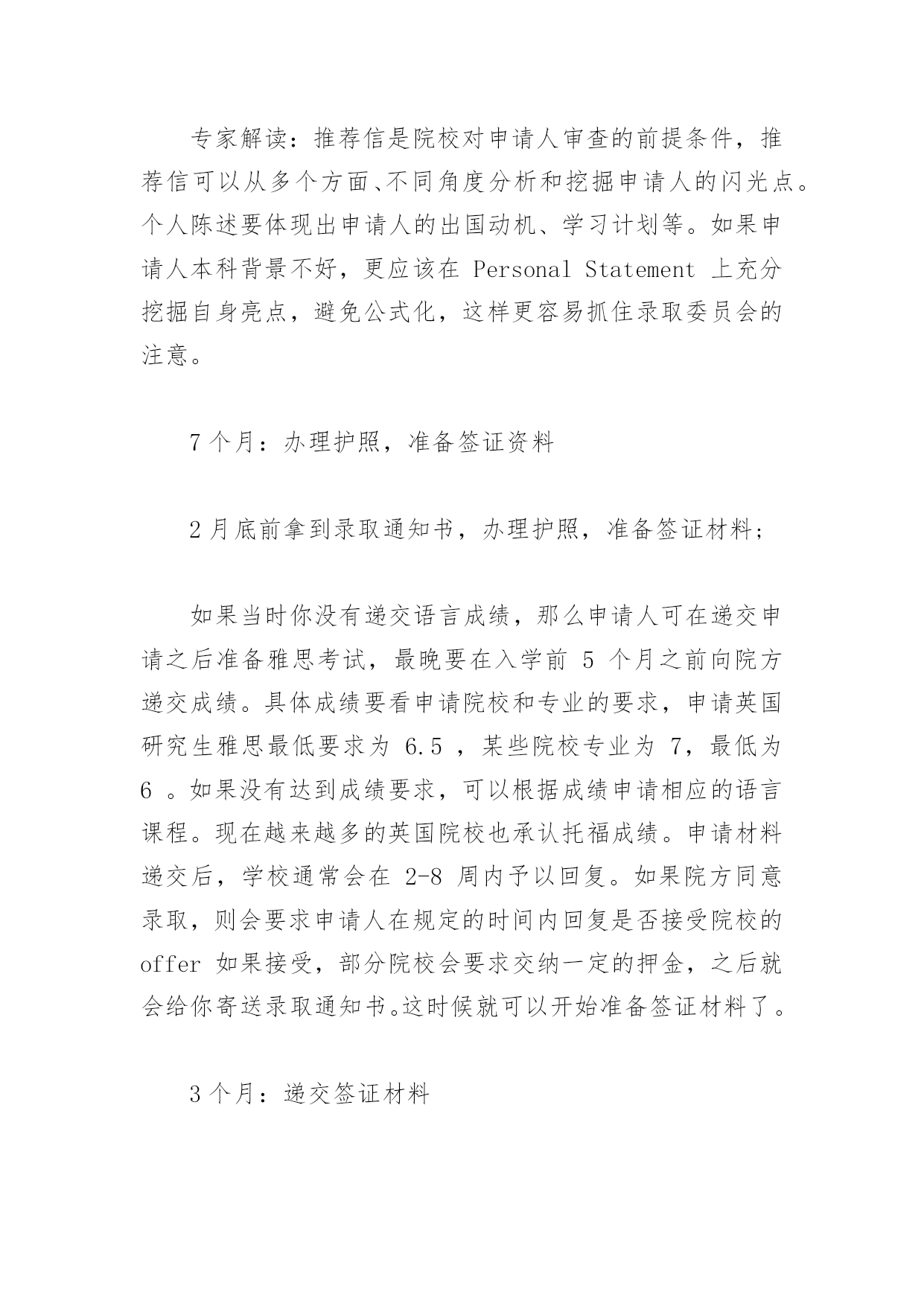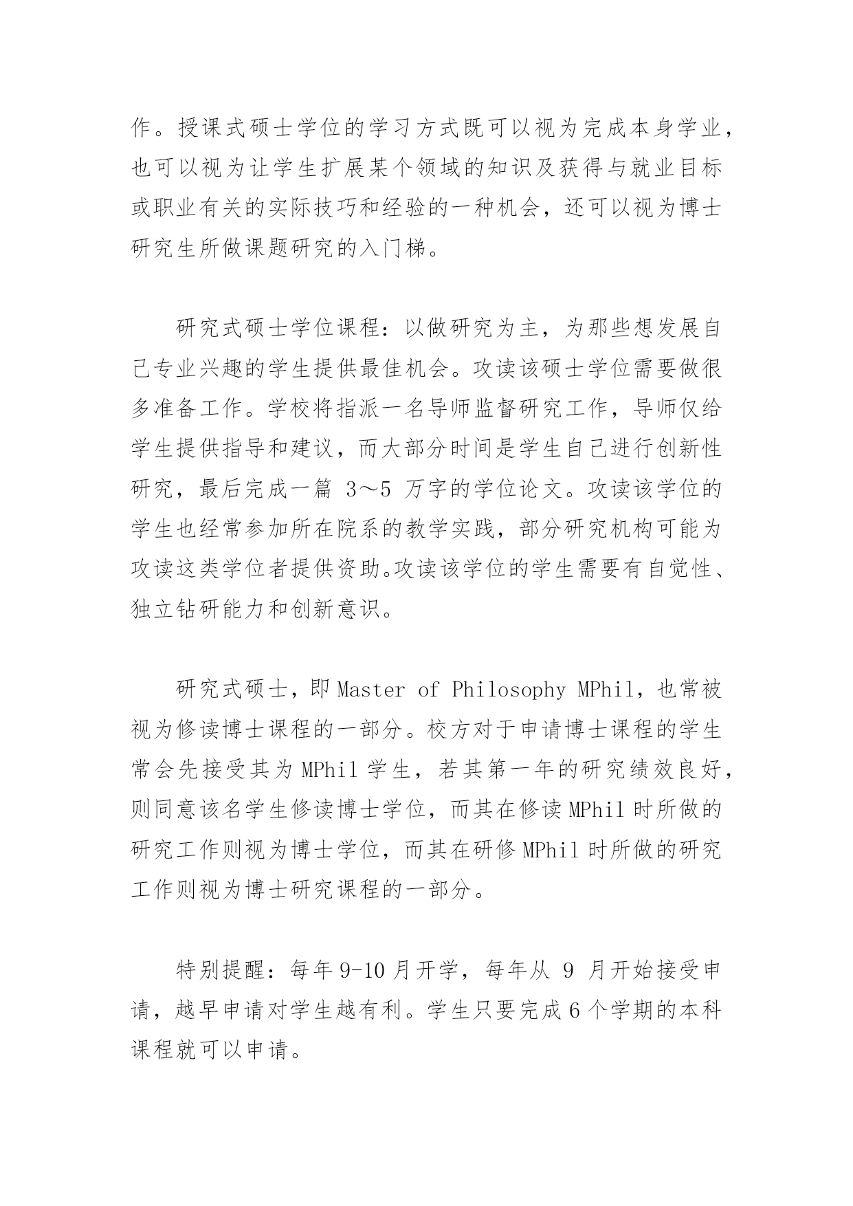 英国留学:英国研究生教育介绍英国留学:英国研究生教育介绍 英国的研究生教育,素以标准严、质量高著称,专业类别多、学制短尤其是授课式硕士,其社会发展安定、福利好,因此,每年都有众多世界各地的学子到英国求学,其中最受欢迎的是攻读授课式硕士学位。12个月:选择硕士学位课程在英国,硕士学位常被称为“高级学位”。其学制普遍是1~2年,其特点就是“强度高”。英国大致有两种类型的硕士学位:授课式和研究式。授课式硕士学位学制一般为1年,即我们常说的出国留学攻读一年制硕士。研究式硕士学位学制一般为2年以上。授课式硕士学位课程:以教学为主,多为实用性专业。一般分为三个学期。第一、二学期以授课为主,第三学期撰写学位论文。授课方式是大课、专题报告和辅导课等形式。授课式硕士学位课程的学习强度大,包括听课、大量阅读、做试验、写书面作业及完成学位论文。评估方式采用考试、连续性评估或两者兼用;少数高校可能会要求口试,其中学位论文是评估的主要内容。授课式教学方法对于学生获得某个学科的详细知识非常有益,这些知识可以直接用于实际工作。授课式硕士学位的学习方式既可以视为完成本身学业,也可以视为让学生扩展某个领域的知识及获得与就业目标或职业有关的实际技巧和经验的一种机会,还可以视为博士研究生所做课题研究的入门梯。研究式硕士学位课程:以做研究为主,为那些想发展自己专业兴趣的学生提供最佳机会。攻读该硕士学位需要做很多准备工作。学校将指派一名导师监督研究工作,导师仅给学生提供指导和建议,而大部分时间是学生自己进行创新性研究,最后完成一篇3~5万字的学位论文。攻读该学位的学生也经常参加所在院系的教学实践,部分研究机构可能为攻读这类学位者提供资助。攻读该学位的学生需要有自觉性、独立钻研能力和创新意识。研究式硕士,即MasterofPhilosophyMPhil,也常被视为修读博士课程的一部分。校方对于申请博士课程的学生常会先接受其为MPhil学生,若其第一年的研究绩效良好,则同意该名学生修读博士学位,而其在修读MPhil时所做的研究工作则视为博士学位,而其在研修MPhil时所做的研究工作则视为博士研究课程的一部分。特别提醒:每年9-10月开学,每年从9月开始接受申请,越早申请对学生越有利。学生只要完成6个学期的本科课程就可以申请。10个月:11月底以前准备好申请材料9月至10月是递交申请的最佳时间。尽早准备可以做到有条不紊,尽量避免申请高峰期,以免忙中出错。英国最新实施的计点积分制政策使英国院校对申请材料真实性的要求有所提高,所以申请人需要充分的时间准备自己的申请材料。大多数申请人为初次申请,面对复杂繁多的申请材料难免会有所疏漏,所以尽量给自己多一点时间去准备。1、彩色两寸护照照片四张和学校申请费部分学校要求2、毕业证书、学位证书公证书或中英文对照的学校证明3、大四在读学生提供在读证明公证书和两封推荐信4、学业成绩单、公证书、个人陈述和推荐人信息5、申请人在校期间获得的.奖励及相关资格证书和实习证明6、托福或者雅思成绩的复印件如果没有,可后期补交专家解读:推荐信是院校对申请人审查的前提条件,推荐信可以从多个方面、不同角度分析和挖掘申请人的闪光点。个人陈述要体现出申请人的出国动机、学习计划等。如果申请人本科背景不好,更应该在PersonalStatement上充分挖掘自身亮点,避免公式化,这样更容易抓住录取委员会的注意。7个月:办理护照,准备签证资料2月底前拿到录取通知书,办理护照,准备签证材料;如果当时你没有递交语言成绩,那么申请人可在递交申请之后准备雅思考试,最晚要在入学前5个月之前向院方递交成绩。具体成绩要看申请院校和专业的要求,申请英国研究生雅思最低要求为6.5,某些院校专业为7,最低为6。如果没有达到成绩要求,可以根据成绩申请相应的语言课程。现在越来越多的英国院校也承认托福成绩。申请材料递交后,学校通常会在2-8周内予以回复。如果院方同意录取,则会要求申请人在规定的时间内回复是否接受院校的offer如果接受,部分院校会要求交纳一定的押金,之后就会给你寄送录取通知书。这时候就可以开始准备签证材料了。3个月:递交签证材料每年的7-8月交签证材料;赴英留学的学生签证一般需要以下资料:1.签证申请表和签证费,护照原件最后一页要用中文签名2.三张彩色2寸照片,学历学位证书以及成绩单3.语言成绩单和硕士录取通知书4.担保资金和存款证明专家解读:递交资料的时候,需要一套完整的原件和一套完整的复印件。原件尽量一次递交进去,后补的原件有时容易丢失;英国签证一般不需要面试除非遇到特殊情况,比如怀疑申请者有移民倾向等,只需要提交资料,而且递交资料的时候,工作人员都是中国人,因此不用紧张。一般在一至两个月内就能获得审批,9月到10月你就可以踏上英国,开始留