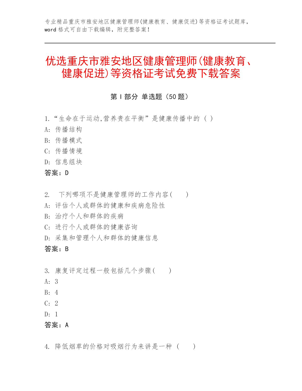 优选重庆市雅安地区健康管理师(健康教育、健康促进)等资格证考试免费下载答案.docx
