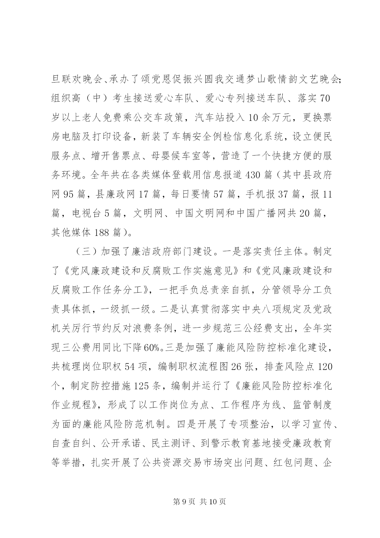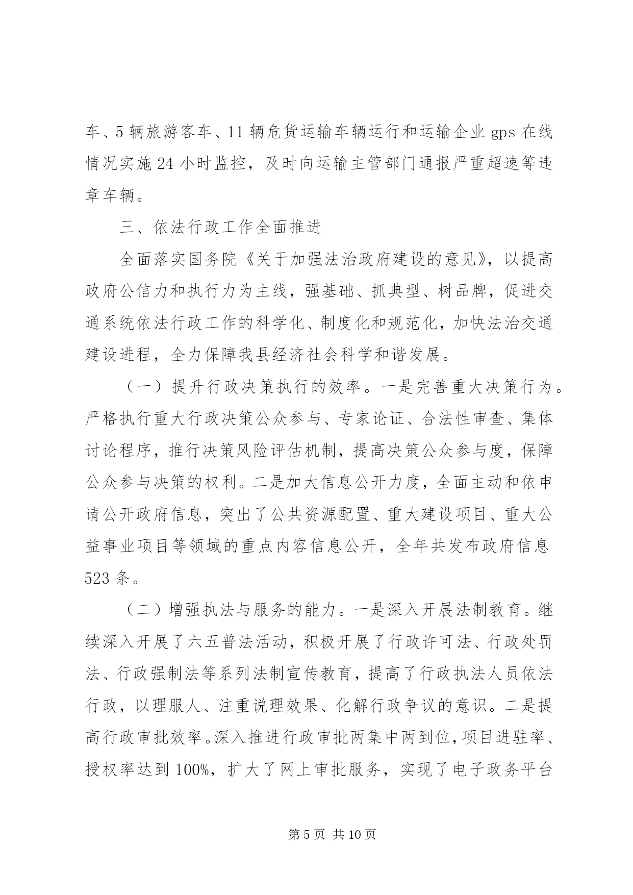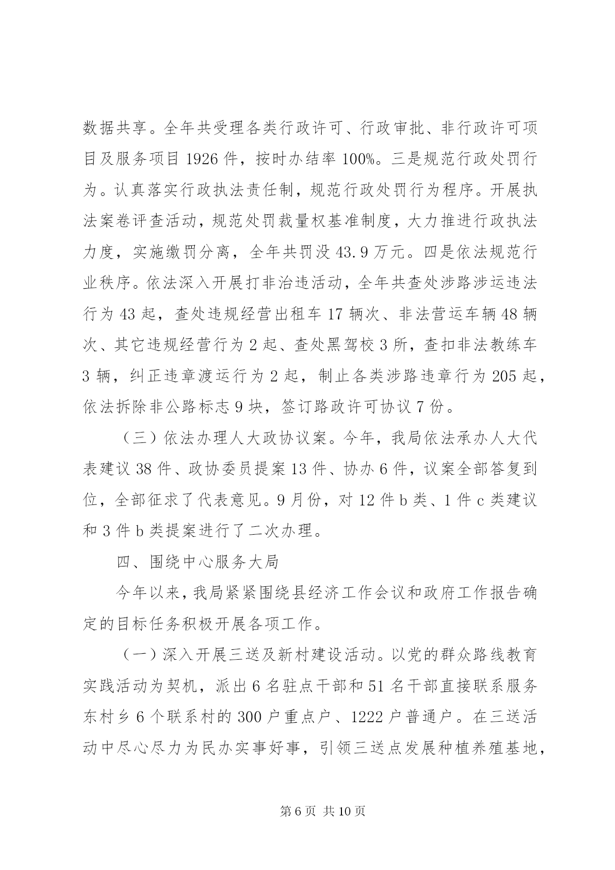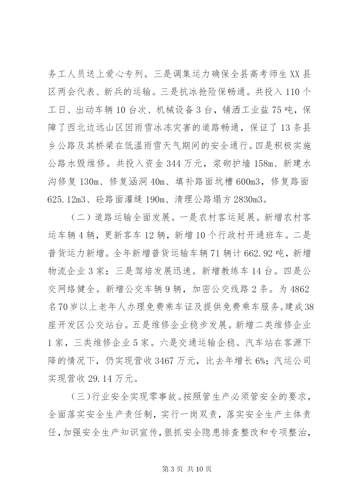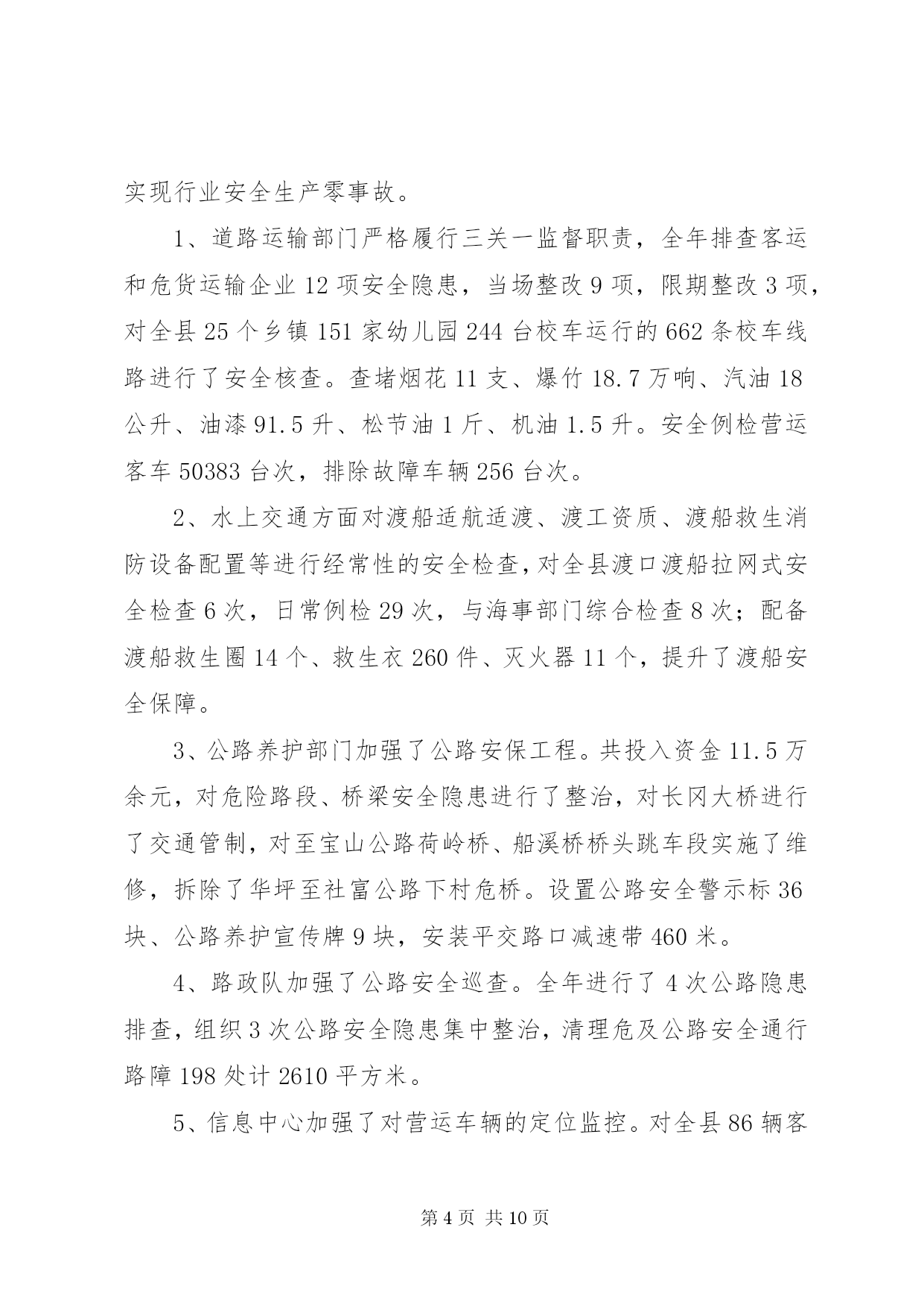 第PAGE\*Arabic\*MERGEFORMAT10页共NUMPAGES\*MERGEFORMAT10页专业化交通设施方案2014年是苏区振兴和山区扶贫政策、编报交通运输建设项目的关键之年,也是我县交通运输工作负重前行的攻坚之年。在县委、县政府和上级交通运输部门的正确领导以及社会各界人士的关心支持下,我局以推进交通基础设施建设为重点,强化行业监管,围绕中心不断改善交通民生,各项工作有序推进。一、交通基础设施建设持续发展2014年,我局围绕苏区振兴发展和新一轮扶贫开发,突出抓拉动力强的交通项目建设这一重点,展开了新一轮的交通基础设施建设,全年完成交通固定资产投资1.88亿元,与去年完成投资基本持平。共建设县道5.8公里、乡村道5.43公里、通组公路硬化240公里,通土坯房集中安置点、新村建设点、农业产业基地公路35公里,市政道路5.322公里,旅游公路10.76公里以及改造一批农村公路危桥。(一)认真编制规划争取交通项目。完成了《等原中央苏区公路水路交通运输发展规划》以及《县自然村通水泥路建设规划》的编制工作,为争取农村公路等交通基础设施建设项目打下了结实的基础。(二)扎实推进交通基础设施建设。2014年,我局坚持项目交办领办、每周调度、项目公开公示制度,扎实推进项目建设。1、县重点工程。。2、国省道改造。。3、县乡道改造。。4、交通应急工程。。5、交通扶贫项目。。6、危桥改造项目。。7、通组公路项目。完成改造并经验收合格220公里路基,完成172公里路面铺设。8、客运站场建设项目。一是完成了新汽车客运站项目可行性报告,政府已划拨建站用地,并与投资开发商进行了意向接触。二是对高兴、古龙岗等2个农村公路综合服务站进行了整修,同时根据设计方案与高兴镇人民政府协调增征土地扩建。已完成高兴服务站可研并上报,待省运管局组织专家评审。二、交通运输行业监管全面强化按照管行业必须管行风的要求,我局依法加强行业管理,整顿行业市场秩序,保持了交通运输市场平稳有序。(一)交通运输保障有力。全年完成客运量499.4万人、客运周转量41326万人公里,与去年同期相比7.6%、12.7%,货运量682.8万吨、货运周转量48350万吨公里,分别较去年增长了12.1%、7.9%。一是共投放客运车辆184辆、公交车35辆,机动运力12辆,圆满完成了2014年59.2万人次的春运旅客运输任务。二是组织爱心专列接送车42辆发班124个班次,将各乡镇务工人员送上爱心专列。三是调集运力确保全县高考师生XX县区两会代表、新兵的运输。三是抗冰抢险保畅通。共投入110个工日、出动车辆10台次、机械设备3台,铺洒工业盐75吨,保障了西北边远山区因雨雪冰冻灾害的道路畅通,保证了13条县乡公路及其桥梁在低温雨雪天气期间的安全通行。四是积极实施公路水毁维修。共投入资金344万元,浆砌护墙158m、新建水沟修复130m、修复涵洞40m、填补路面坑槽600m3,修复路面625.12m3、砼路面灌缝190m、清理公路塌方2830m3。(二)道路运输全面发展。一是农村客运延展。新增农村客运车辆4辆,更新客车12辆,新增10个行政村开通班车。二是普货运力新增。全年新增普货运输车辆71辆计662.92吨,新增物流企业3家;三是驾培发展迅速。新增教练车14台。四是公交网络健全。新增公交车辆9辆,加密公交线路2条。为4862名70岁以上老年人办理免费乘车证及提供免费乘车服务。建成38座开发区公交站台。五是维修企业稳步发展。新增二类维修企业1家,三类维修企业5家。六是交通运输企稳。汽车站在客源下降的情况下,仍实现营收3467万元,比去年增长6%;汽运公司实现营收29.14万元。(三)行业安全实现零事故。按照管生产必须管安全的要求,全面落实安全生产责任制,实行一岗双责,落实安全生产主体责任,加强安全生产知识宣传,狠抓安全隐患排查整改和专项整治,实现行业安全生产零事故。1、道路运输部门严格履行三关一监督职责,全年排查客运和危货运输企业12项安全隐患,当场整改9项,限期整改3项,对全县25个乡镇151家幼儿园244台校车运行的662条校车线路进行了安全核查。查堵烟花11支、爆竹18.7万响、汽油18公升、油漆91.5升、松节油1斤、机油1.5升。安全例检营运客车50383台次,排除故障车辆256台次。2、水上交通方面对渡船适航适渡、渡工资质、渡船救生消防设备配置等进行经常性的安全检查,对全县渡口渡船拉网式安全检查6次,日常例检29次,与海事部门综合检查8次;配备渡船救生圈14个、救生衣260件、灭火器11个,提升了渡船安全保障。3、公路养护部门加强了公路安保工程。共投入资金11.5万余元,对危险路段、桥梁安全隐患进行了整治,对长冈大桥进行了交通管制,对至宝山公路荷岭桥、船溪桥