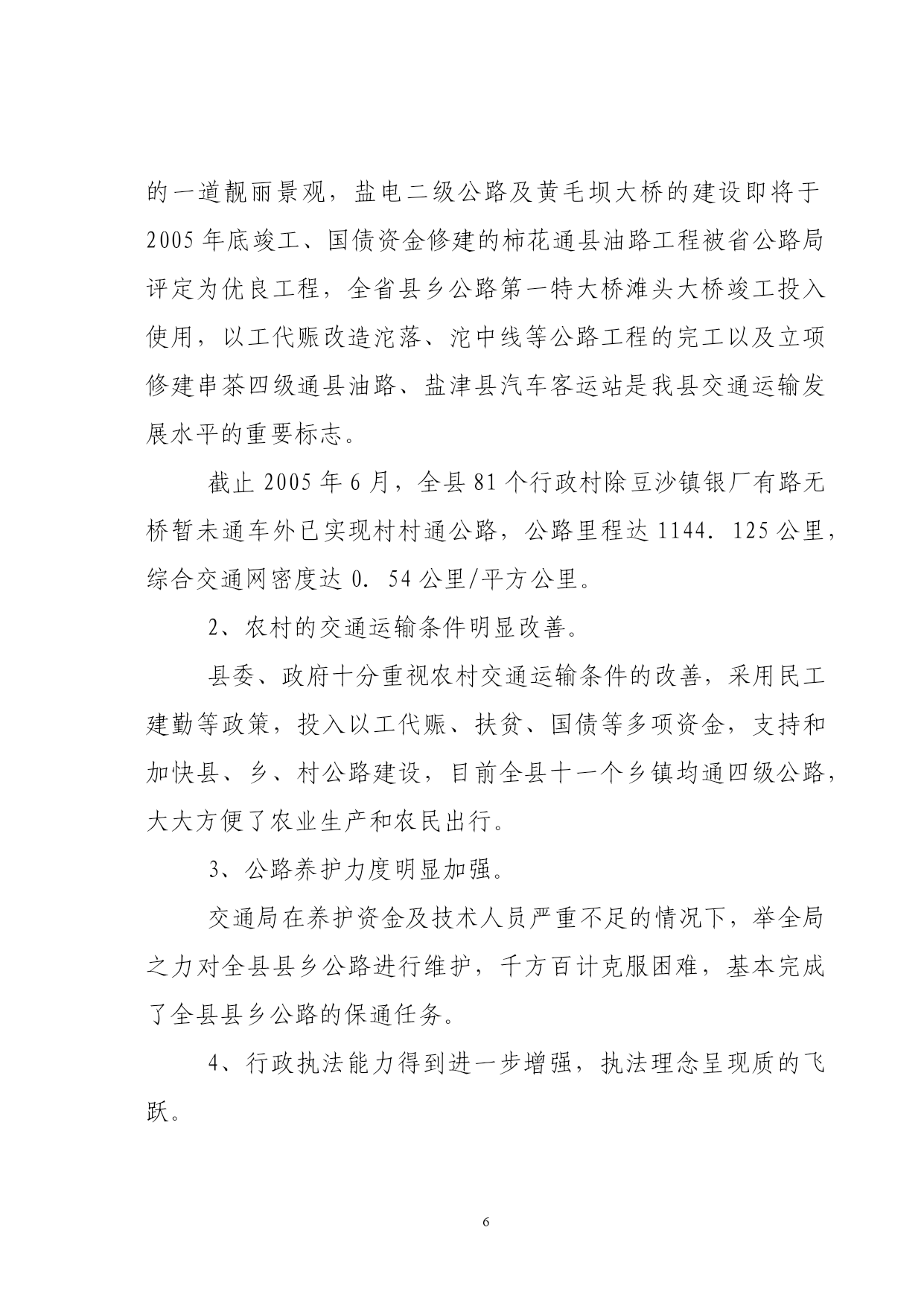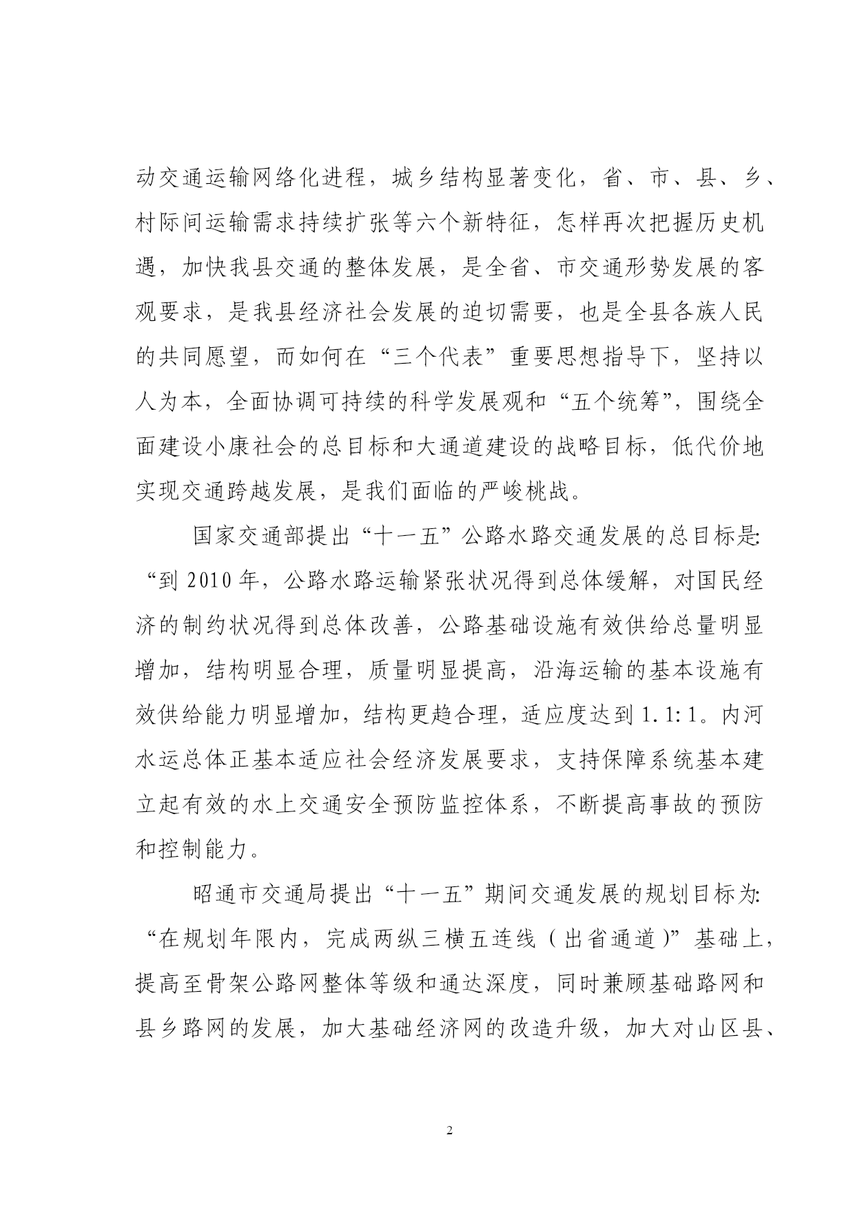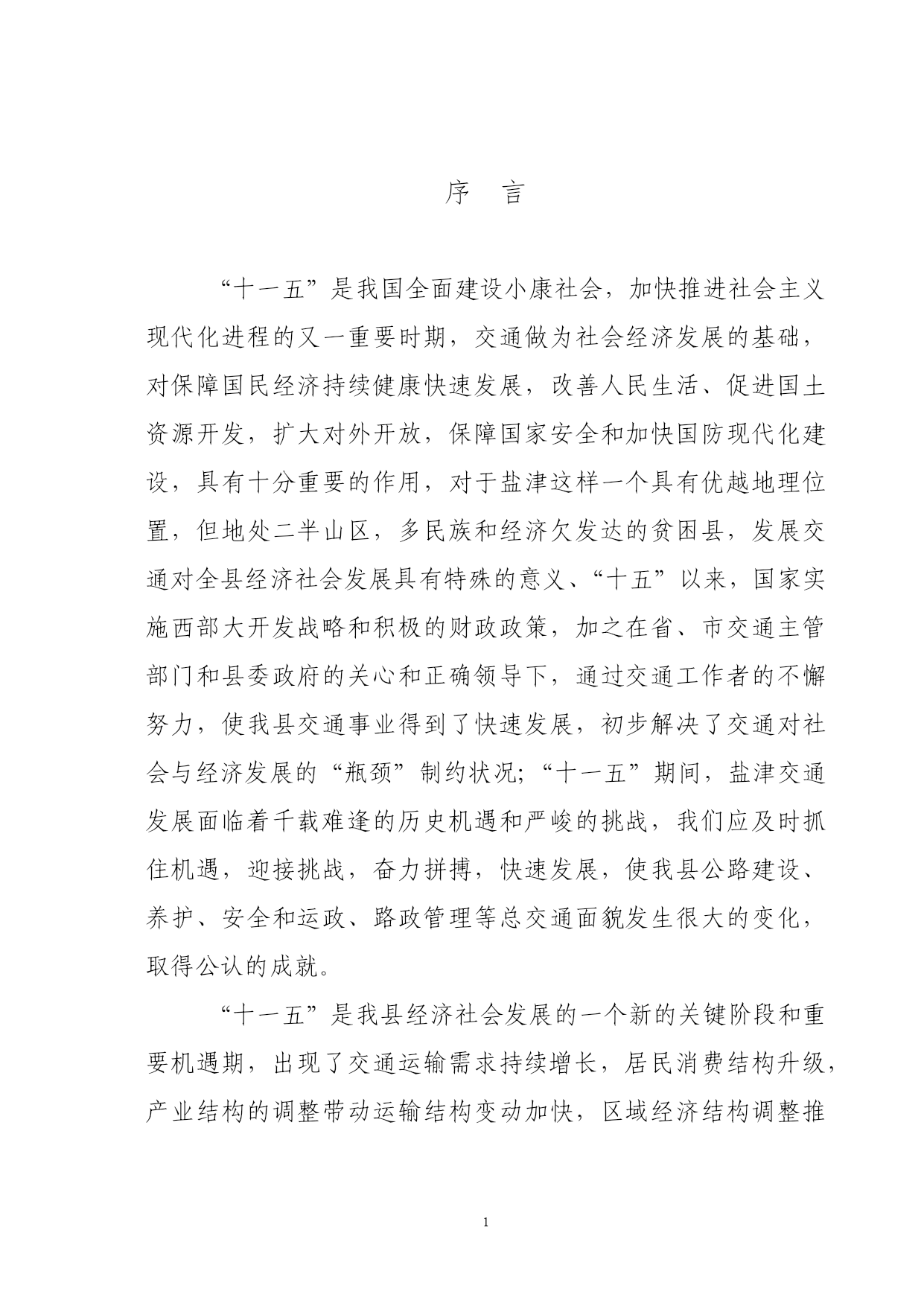 PAGEPAGE46盐津县交通“十一五”发展规划盐津县交通局二00五年七月盐津县交通“十一五”发展规划编制单位:盐津县交通局审稿人:任光双(盐津县交通局局长)参加人员:刘元波(县交通局副局长)周刚群(县交通运政管理所书记)徐鸿(县交通局县乡公路管理段段长)李松(县交通局路政大队副大队长)李建瓴(县交通局地方海事处处长)撰写:余勇(县交通局计划股股长)核稿人:陈恒(县交通局办公室主任)校对:胡远彬(县交通局公务员)目录序言……………………………………………………1第一章基础与展望“十五”回顾………………………………………4一、规划指标执行情况………………………………4二、措施及经验………………………………………7三、存在问题…………………………………………9第二章“十一五”期间我县交通所面临的机遇与挑战一、机遇………………………………………………11二、挑战………………………………………………13第三章“十一五”交通规划编制的编制原则和指导思想、一、指导思想…………………………………………16二、基本原则…………………………………………17三、本规划编制原则…………………………………18第四章“十一五”交通规划布置的目标、思路和原则一、项目所在地社会经济和交通发展的地理位置和自然条件……………………………………………………………20二、社会经济发展概况………………………………22三、公路网现状及评价………………………………23四、规划目标……………………………………251、规划布局的原则、思路……………………252、规划的具体方法……………………………253、主要线路、层次……………………………264、总体目标……………………………………275、具体目标……………………………………286、全县客、货运站场布局……………………29第五章“十一五”交通规划具体方案(项目支撑表)一、建设项目计划………………………………38二、公路养护规划方案…………………………38三、公路路政管理规划实施方案………………40四、海事水上安全管理规划实施方案…………42五、运政管理工作目标…………………………43第六章:保障措施………………………………44一、交通政策法规保障…………………………44二、前期工作保障………………………………45三、资金保障……………………………………45四、人才保障……………………………………46序言“十一五”是我国全面建设小康社会,加快推进社会主义现代化进程的又一重要时期,交通做为社会经济发展的基础,对保障国民经济持续健康快速发展,改善人民生活、促进国土资源开发,扩大对外开放,保障国家安全和加快国防现代化建设,具有十分重要的作用,对于盐津这样一个具有优越地理位置,但地处二半山区,多民族和经济欠发达的贫困县,发展交通对全县经济社会发展具有特殊的意义、“十五”以来,国家实施西部大开发战略和积极的财政政策,加之在省、市交通主管部门和县委政府的关心和正确领导下,通过交通工作者的不懈努力,使我县交通事业得到了快速发展,初步解决了交通对社会与经济发展的“瓶颈”制约状况;“十一五”期间,盐津交通发展面临着千载难逢的历史机遇和严峻的挑战,我们应及时抓住机遇,迎接挑战,奋力拼搏,快速发展,使我县公路建设、养护、安全和运政、路政管理等总交通面貌发生很大的变化,取得公认的成就。“十一五”是我县经济社会发展的一个新的关键阶段和重要机遇期,出现了交通运输需求持续增长,居民消费结构升级,产业结构的调整带动运输结构变动加快,区域经济结构调整推动交通运输网络化进程,城乡结构显著变化,省、市、县、乡、村际间运输需求持续扩张等六个新特征,怎样再次把握历史机遇,加快我县交通的整体发展,是全省、市交通形势发展的客观要求,是我县经济社会发展的迫切需要,也是全县各族人民的共同愿望,而如何在“三个代表”重要思想指导下,坚持以人为本,全面协调可持续的科学发展观和“五个统筹”,围绕全面建设小康社会的总目标和大通道建设的战略目标,低代价地实现交通跨越发展,是我们面临的严峻桃战。国家交通部提出“十一五”公路水路交通发展的总目标是:“到2010年,公路水路运输紧张状况得到总体缓解,对国民经济的制约状况得到总体改善,公路基础设施有效供给总量明显增加,结构明显合理,质量明显提高,沿海运输的基本设施有效供给能力明显增加,结构更趋合理,适应度达到1.1:1。内河水运总体正基本适应社会经济发展要求,支持保障系统基本建立起有效的水上交通安全预防监控体系,不断提高事故的预防和控制能力。昭通市交通局提出“十一五”期间交通发展的