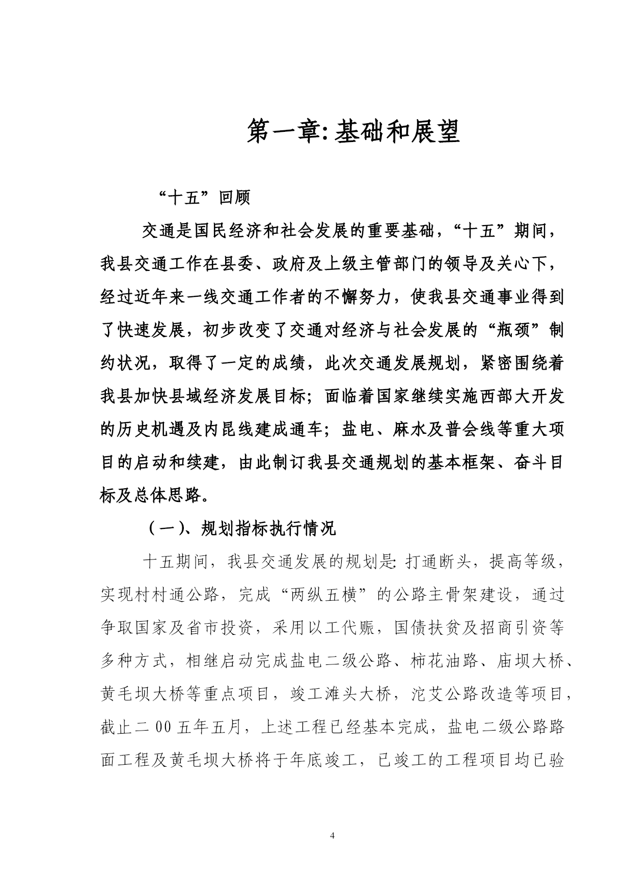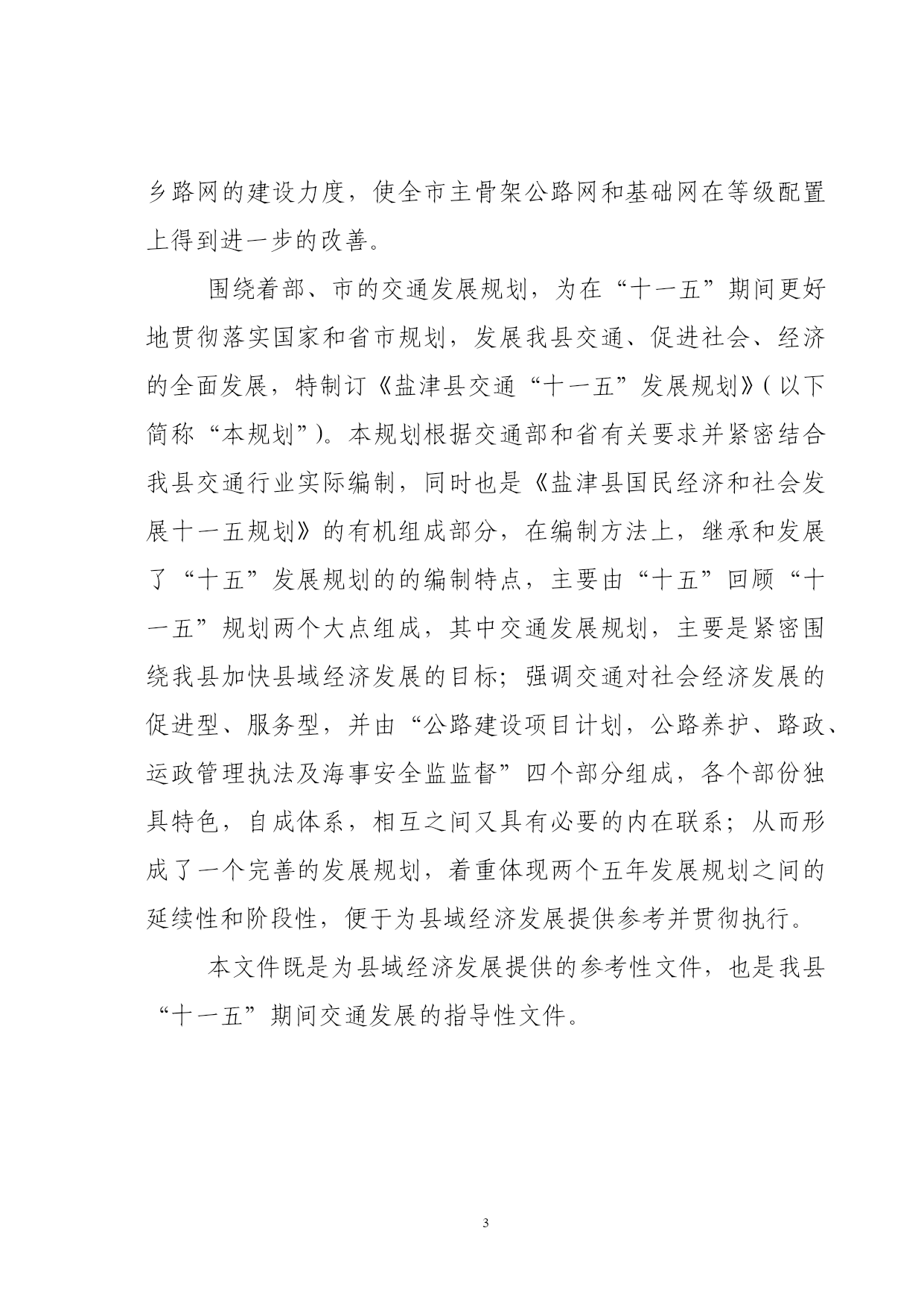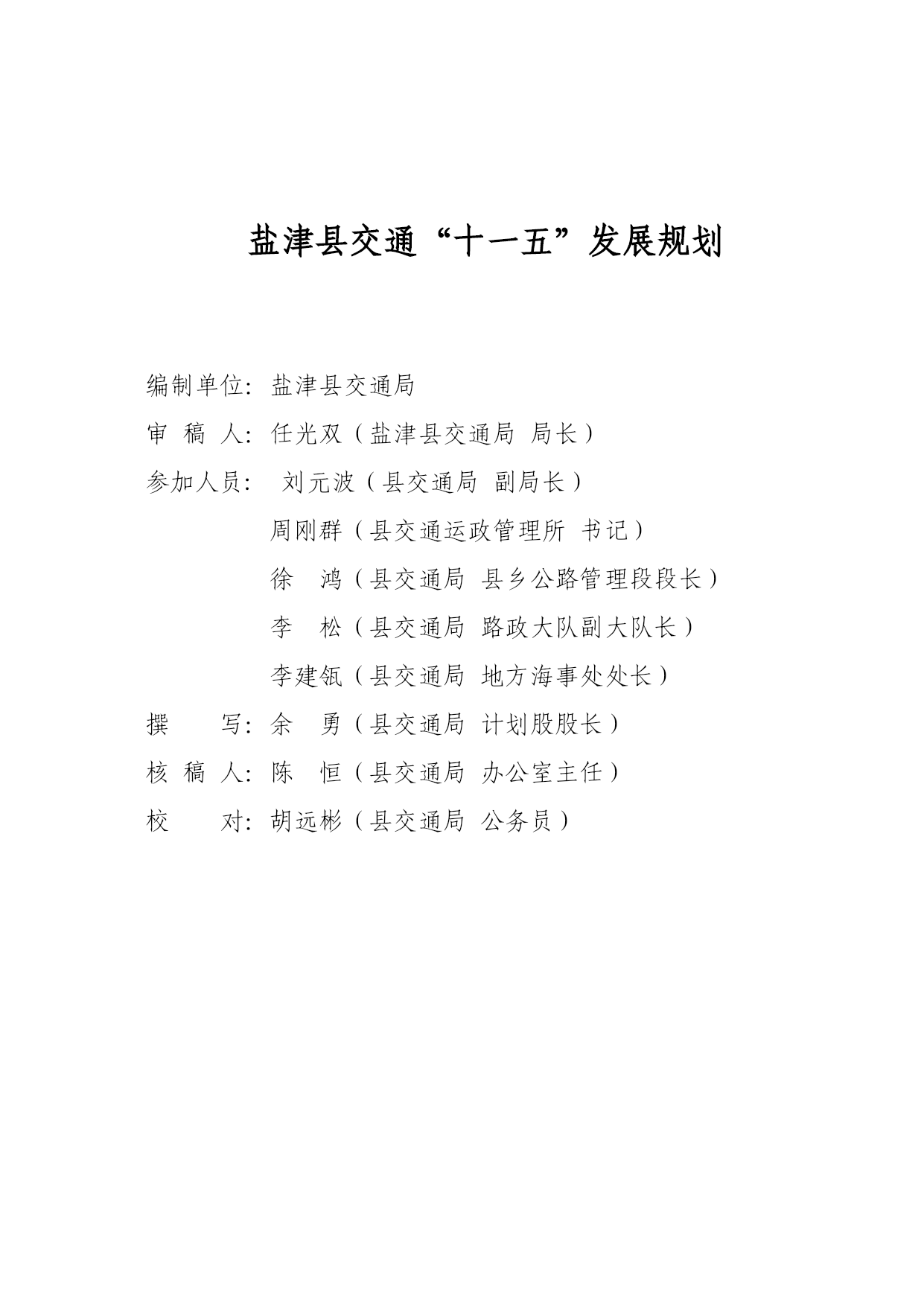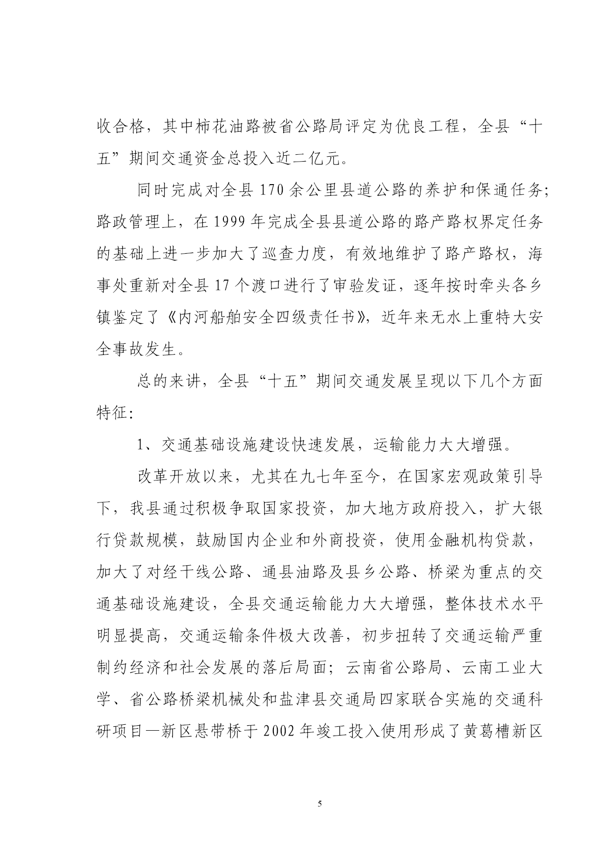 PAGEPAGE46盐津县交通“十一五”发展规划盐津县交通局二00五年七月盐津县交通“十一五”发展规划编制单位:盐津县交通局审稿人:任光双(盐津县交通局局长)参加人员:刘元波(县交通局副局长)周刚群(县交通运政管理所书记)徐鸿(县交通局县乡公路管理段段长)李松(县交通局路政大队副大队长)李建瓴(县交通局地方海事处处长)撰写:余勇(县交通局计划股股长)核稿人:陈恒(县交通局办公室主任)校对:胡远彬(县交通局公务员)目录序言……………………………………………………1第一章基础与展望“十五”回顾………………………………………4一、规划指标执行情况………………………………4二、措施及经验………………………………………7三、存在问题…………………………………………9第二章“十一五”期间我县交通所面临的机遇与挑战一、机遇………………………………………………11二、挑战………………………………………………13第三章“十一五”交通规划编制的编制原则和指导思想、一、指导思想…………………………………………16二、基本原则…………………………………………17三、本规划编制原则…………………………………18第四章“十一五”交通规划布置的目标、思路和原则一、项目所在地社会经济和交通发展的地理位置和自然条件……………………………………………………………20二、社会经济发展概况………………………………22三、公路网现状及评价………………………………23四、规划目标……………………………………251、规划布局的原则、思路……………………252、规划的具体方法……………………………253、主要线路、层次……………………………264、总体目标……………………………………275、具体目标……………………………………286、全县客、货运站场布局……………………29第五章“十一五”交通规划具体方案(项目支撑表)一、建设项目计划………………………………38二、公路养护规划方案…………………………38三、公路路政管理规划实施方案………………40四、海事水上安全管理规划实施方案…………42五、运政管理工作目标…………………………43第六章:保障措施………………………………44一、交通政策法规保障…………………………44二、前期工作保障………………………………45三、资金保障……………………………………45四、人才保障……………………………………46序言“十一五”是我国全面建设小康社会,加快推进社会主义现代化进程的又一重要时期,交通做为社会经济发展的基础,对保障国民经济持续健康快速发展,改善人民生活、促进国土资源开发,扩大对外开放,保障国家安全和加快国防现代化建设,具有十分重要的作用,对于盐津这样一个具有优越地理位置,但地处二半山区,多民族和经济欠发达的贫困县,发展交通对全县经济社会发展具有特殊的意义、“十五”以来,国家实施西部大开发战略和积极的财政政策,加之在省、市交通主管部门和县委政府的关心和正确领导下,通过交通工作者的不懈努力,使我县交通事业得到了快速发展,初步解决了交通对社会与经济发展的“瓶颈”制约状况;“十一五”期间,盐津交通发展面临着千载难逢的历史机遇和严峻的挑战,我们应及时抓住机遇,迎接挑战,奋力拼搏,快速发展,使我县公路建设、养护、安全和运政、路政管理等总交通面貌发生很大的变化,取得公认的成就。“十一五”是我县经济社会发展的一个新的关键阶段和重要机遇期,出现了交通运输需求持续增长,居民消费结构升级,产业结构的调整带动运输结构变动加快,区域经济结构调整推动交通运输网络化进程,城乡结构显著变化,省、市、县、乡、村际间运输需求持续扩张等六个新特征,怎样再次把握历史机遇,加快我县交通的整体发展,是全省、市交通形势发展的客观要求,是我县经济社会发展的迫切需要,也是全县各族人民的共同愿望,而如何在“三个代表”重要思想指导下,坚持以人为本,全面协调可持续的科学发展观和“五个统筹”,围绕全面建设小康社会的总目标和大通道建设的战略目标,低代价地实现交通跨越发展,是我们面临的严峻桃战。国家交通部提出“十一五”公路水路交通发展的总目标是:“到2010年,公路水路运输紧张状况得到总体缓解,对国民经济的制约状况得到总体改善,公路基础设施有效供给总量明显增加,结构明显合理,质量明显提高,沿海运输的基本设施有效供给能力明显增加,结构更趋合理,适应度达到1.1:1。内河水运总体正基本适应社会经济发展要求,支持保障系统基本建立起有效的水上交通安全预防监控体系,不断提高事故的预防和控制能力。昭通市交通局提出“十一五”期间交通发展的