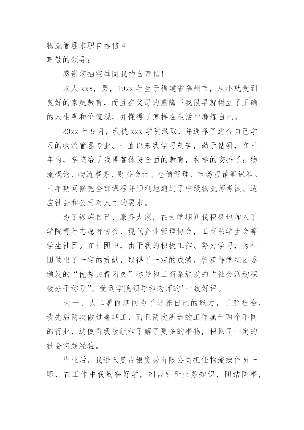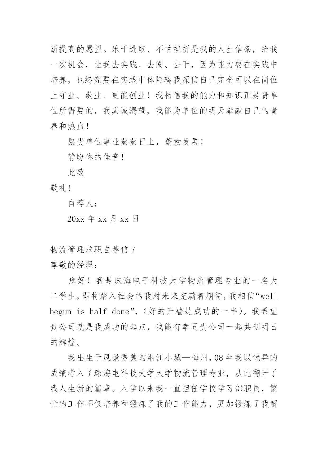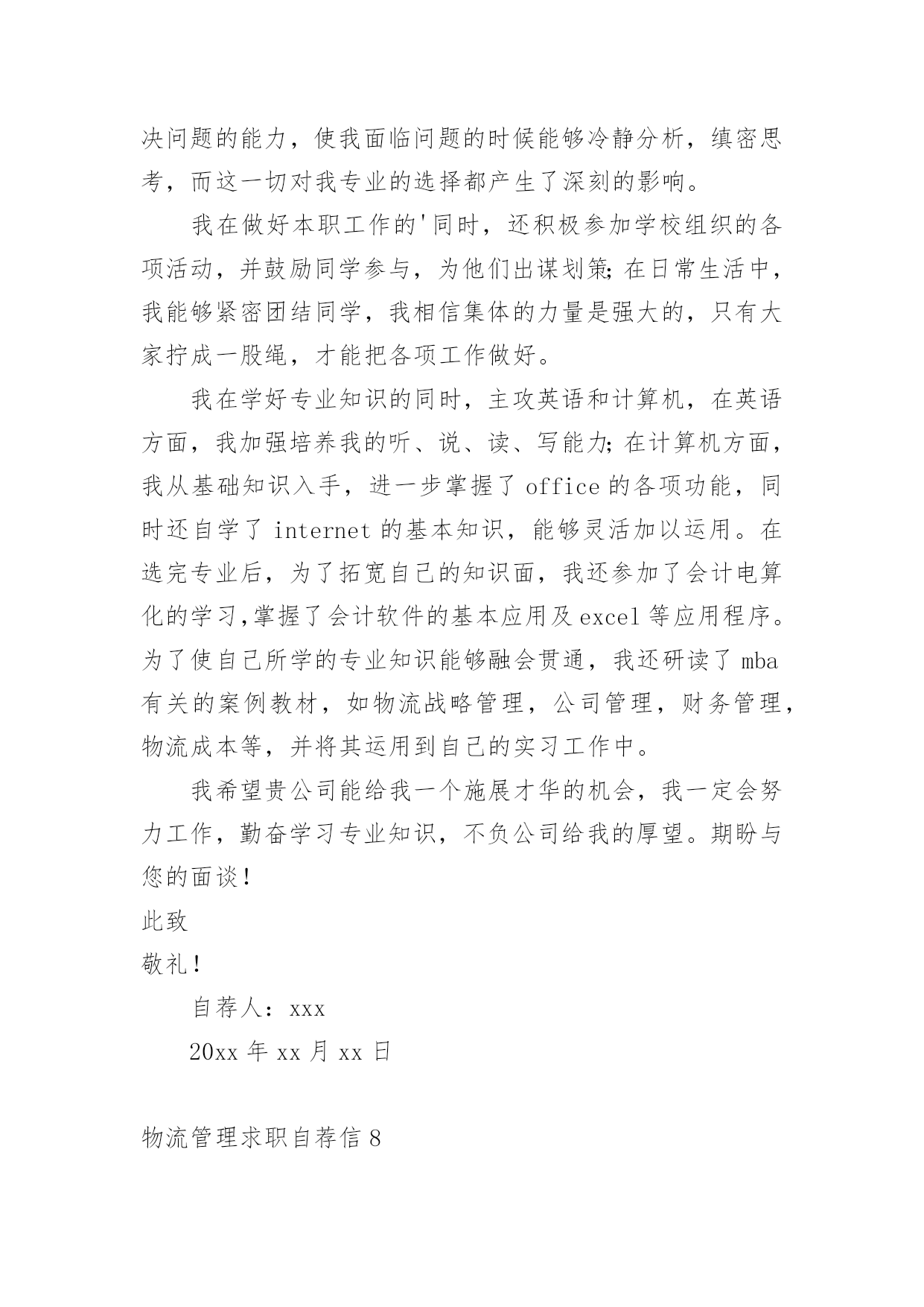 物流管理求职自荐信在当今社会中,我很多时候都不得不用到自荐信,我们在写自荐信的时候要注意理由要充分、合理。那么问题来了,自荐信应该怎么写?以下是小编精心整理的物流管理求职自荐信,欢迎阅读,希望大家能够喜欢。物流管理求职自荐信1尊敬的公司领导:非常感谢您在百忙之中阅读我的自荐信。自从我考入了Xx学院物流管理系以来,这里成了我锻炼成长的沃土,为了早日从一个不喑世事的中学生蜕变成一名全面发展、素质优良的大学生,我积极的投入到学习和生活中,得益于良好的校风,师友的严格教益及个人努力下,我具备了扎实的`专业基础知识、系统的掌握了《现代物流管理基础》、《物流配送中心规划与设计》、《供应链管理》《经济法》《商品学》等一系列有关的理论;可初步从事物流管理业务;进行物流系统调查分析;评价与选择物流技术方案和进行物流信息系统分析;熟悉涉外工作常用礼仪;具有一定的语言表达能力。同时,我利用课余时间广泛地涉猎了大量的书籍,不但充实了自己,也培养了自己多方面的技能,更重要的是,严谨的学风和端正的学习态度,塑造了我自律、自信,朴实、创新的性格特点。不仅如此,我还积极地参加各种社会活动,抓住每一个机会,20xx年夏又积极参加并圆满完成了暑期社会调查及实践任务,我始终相信只有在各种条件下锻炼自己,才能使自己有坚强的毅力和迎接各种挑战的信心,这些都是我在未来的工作岗位上建功立业的基础。此外,我在校期间担负班长,物流管理协会秘书长,院学生会学习部干事等工作,并以优异的成绩取得了党校毕业证书,且荣幸的获得“优秀标兵”“优秀社团负责人”“十大文明大学生”“院三等奖学金”“院三好学生”“优秀班干部”等多项荣誉。两年来,在校园内外,我学到了很多课堂上学不到的东西,开阔了眼界,丰富了知识,也使自我日趋成熟。我的大学生涯即将结束,等待我的将是新一轮的机遇和挑战,作为一名即将毕业的学生,我懂得的东西还太少,但我将继续努力学习并尽快适应新的环境,尽我最大的能力,用我的智慧、意志和勇气为实现贵公司的奋斗目标,与同事精诚合作,为贵单位的发展尽自己的绵薄之力。收笔之际,郑重地提一个小小的要求:无论您是否选择我,尊敬的领导,希望您能够接受我诚恳的谢意!物流管理求职自荐信2尊敬的领导:您好!感谢您在百忙之中翻阅我的自荐信,不胜感激!我是XX学院工商管理系物流管理专业的一名毕业生。四年的系统学习,我掌握了扎实的专业知识,更重要的是掌握了一种良好的学习方法,使我可以以最快的速度接受最新的知识和信息,并运用到实践当中。通过对专业的学习,我深刻认识到:管理注重的是思维方式和解决问题的能力,并不在于理论知识的量的堆砌与其牢固程度的把握,而在于是否养成一种良好的思考问题、解决问题的习惯,所以我一直刻意培养自己在这方面的能力,平时广泛阅读了营销、广告、生产管理、沟通艺术、顾客服务等方面的书籍。诚实、乐于助人是一个人应有的品质,勤奋务实是一个人的立足之本。本着这两条原则我取得了朋友与同学的信任,并在他们心目中树立了一个成熟稳重的形象。然而,我知道我做的仍然不够,经历、经验对我来说依旧是缺乏的,但我一直留心观察身边的一事一物,在这个过程当中,我学到了很多做人的`道理和处事的方法。当然,要学会为人处事必须走到社会中去,工作---是得到社会认可的必由之路,为了这一刻我一直在默默地准备着,我相信以我充足的准备我一定能在这芸芸众生中立足并成才!我坚信:“没有比脚更长的路,没有比人更高的山”,有艰辛的付出才会有丰盛的回报。我相信自己的知识和能力可以为贵单位的工作做出一份贡献。此致敬礼!自荐人:XXXXXXX年XX月XX日物流管理求职自荐信3感谢您在百忙之中驻留片刻来审阅我的自荐材料和个人简历,为一位满腔热情的大学生开启一扇希望之门,给我一个迈向成功的机会。我是一名应届毕业生。值此择业之际,我怀着一颗赤诚的.心真诚地向您推荐自己。十几年的寒窗苦读,铸就了我的学识与自信。大学三年里,我时刻按照“学高为师,身正为范”的标准去锻炼及发展自我。在思想上,我要求上进,积极向中国共产党靠近。在学习上,我刻苦努力,圆满完成了学习开设的各项课程;期间通过了大学英语三级考试,能熟练操作Word等办公软件。“万丈高楼平地起”,所以我对物流管理专业知识和物流操作技能尤为重视为以后的工作打下坚实基础。实习阶段,在工作实习中,我要求自己做到了“五心”——多留心﹑能虚心﹑要细心﹑具匠心﹑勤操心﹑,我的付出受到了公司领导和同事的赞赏。在学习课余,我还通过书刊网络等媒介涉取各方面的知识,不断扩充知识面。对从事物流管理和操作工作必须掌握的相关知识有了相当程度的理解和掌握,相信有能力胜任工作。千里马因伯乐而驰骋,我需要您的赏识和认可!此致敬礼!物流管理求职自荐信4尊敬的领导:感谢您抽空垂阅我的自荐信!本人xxx,男,19xx年生于福建省福州市,从小